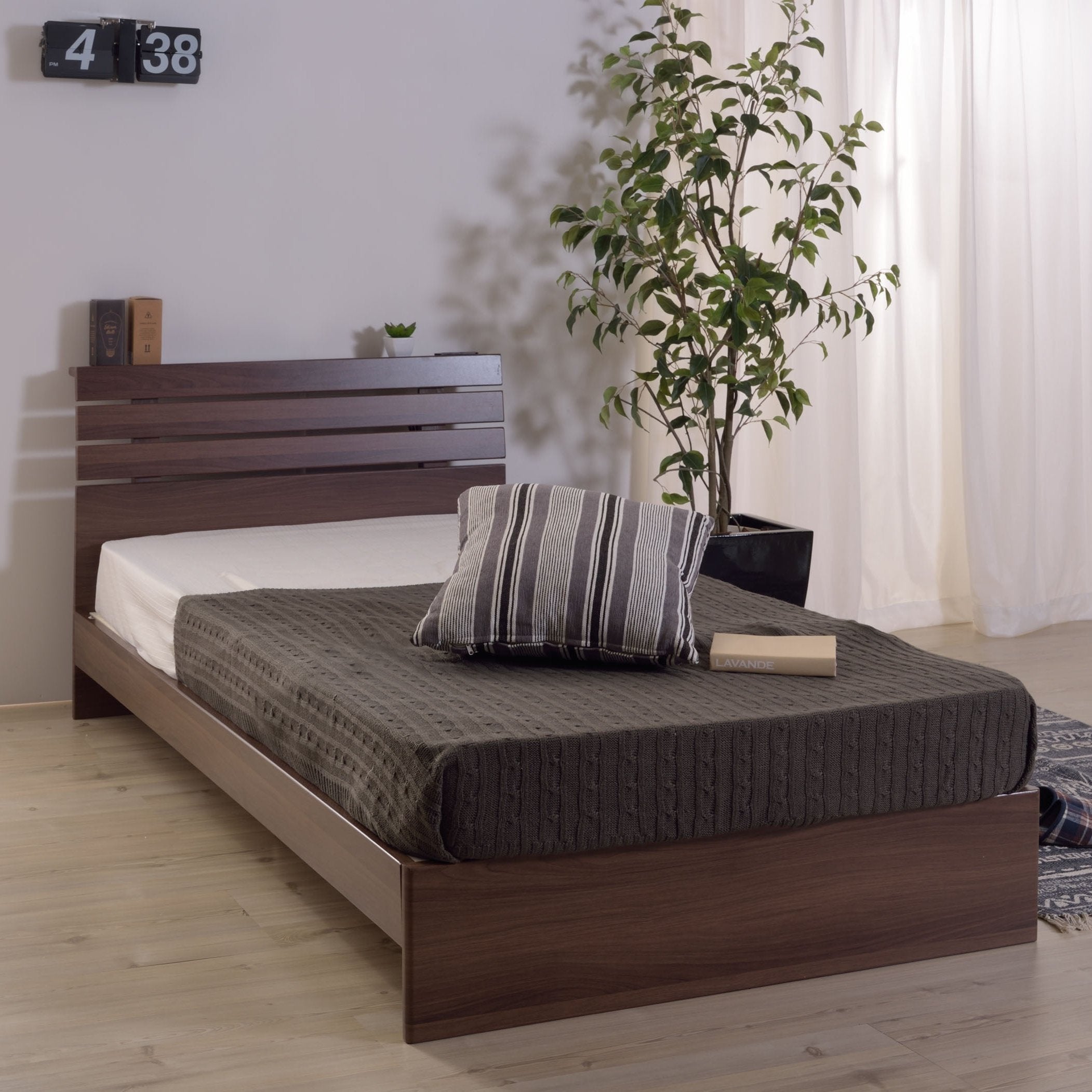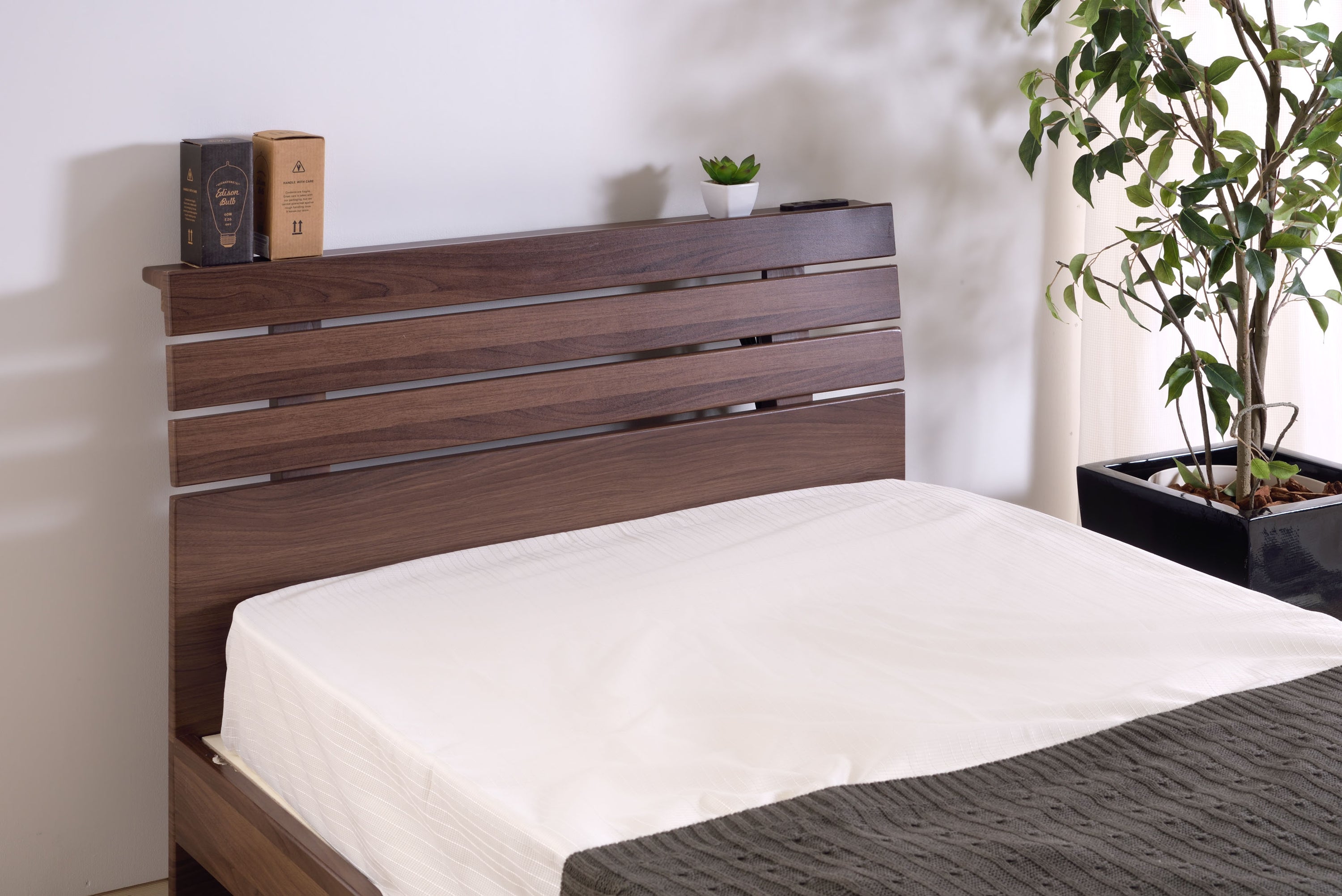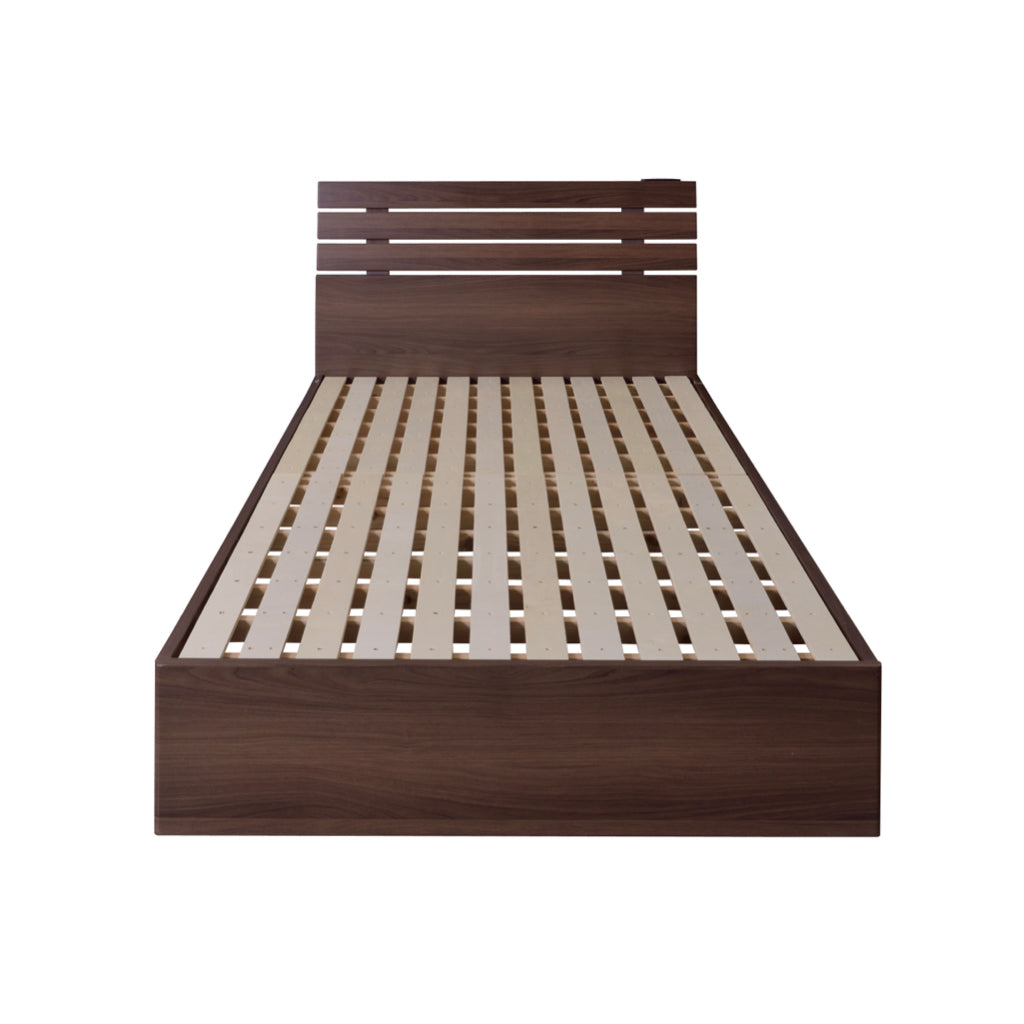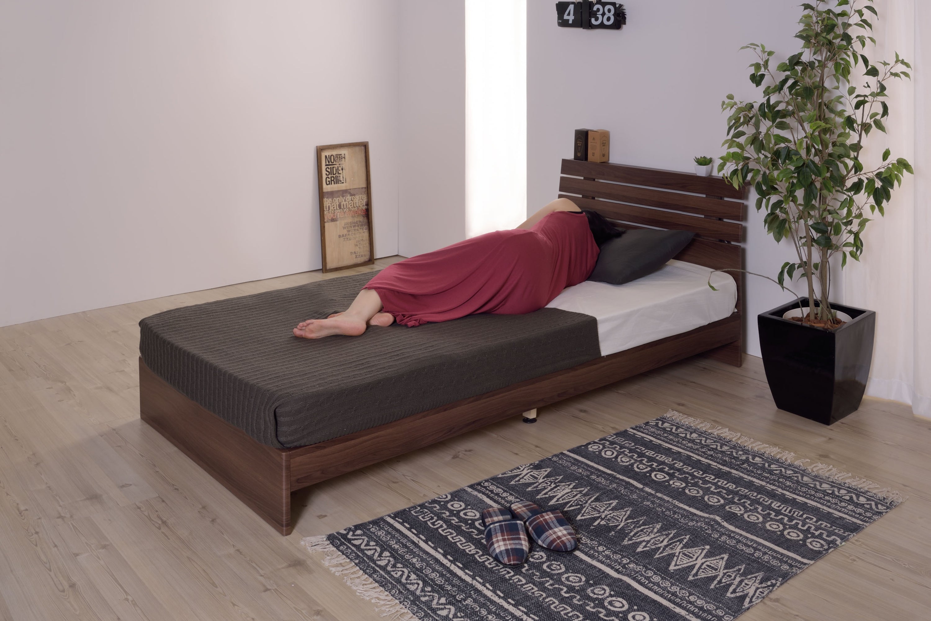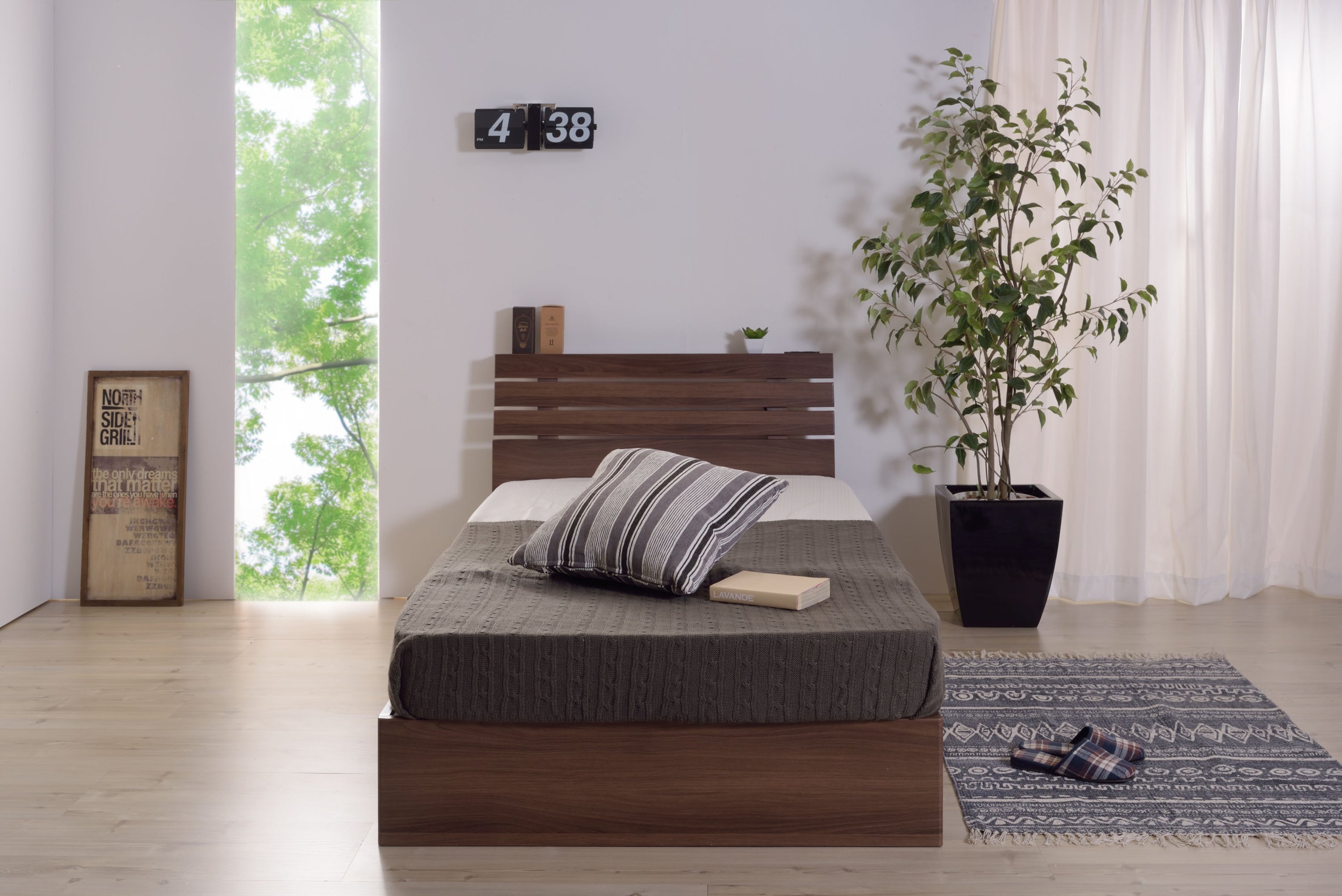 圧迫感を与えない。すのこ状のヘッドボード 板状ではなく、すのこ状のヘッドボードを採用することで、お部屋に置いたときの圧迫感を軽減。 スッキリとした印象に。スライドコンセント2口付きなので、スマートフォンの充電などに便利です。 通気性抜群。すのこを使用した床板 床板にはすのこを使用しているので、通気性抜群。湿気がこもりにくく、カビが生えにくい仕様です。 ベッド下の高さは12cm。薄い収納ボックスや靴箱が入る高さなので、たまにしか使わないものはベッド下へ収納も可能。