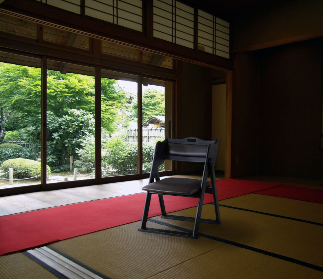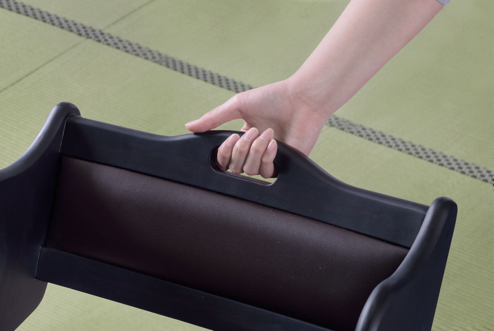 低い座面で年配の方も座りやすい設計です。また、大きな取手は握りやすく、折りたたみや移動に便利です。畳にキズがつきにくい太い脚で、和室の使用にピッタリです。