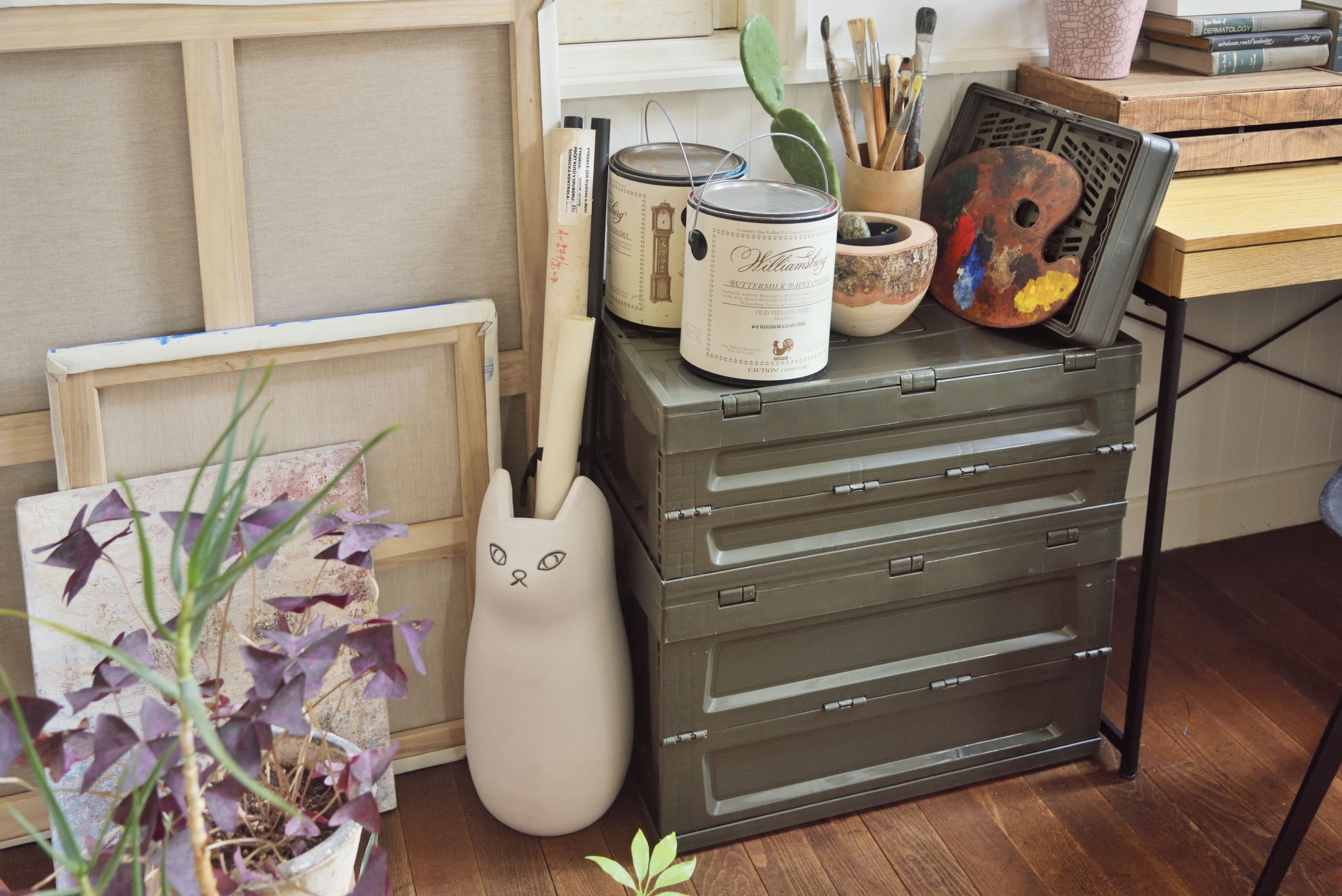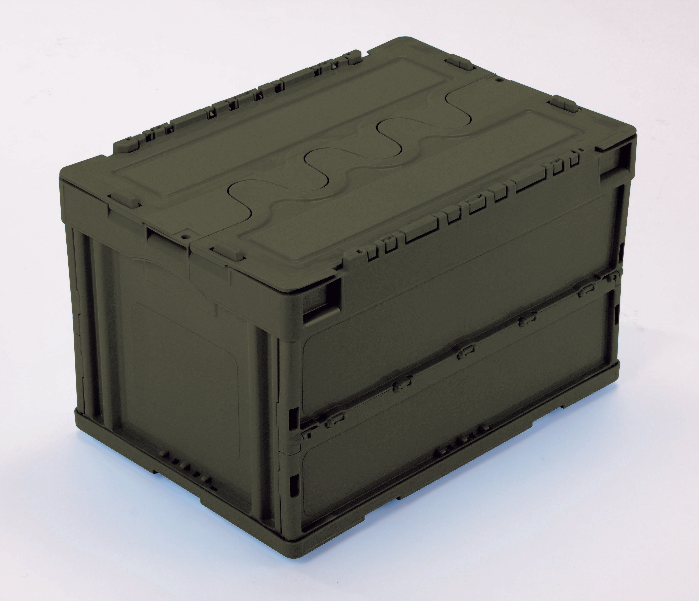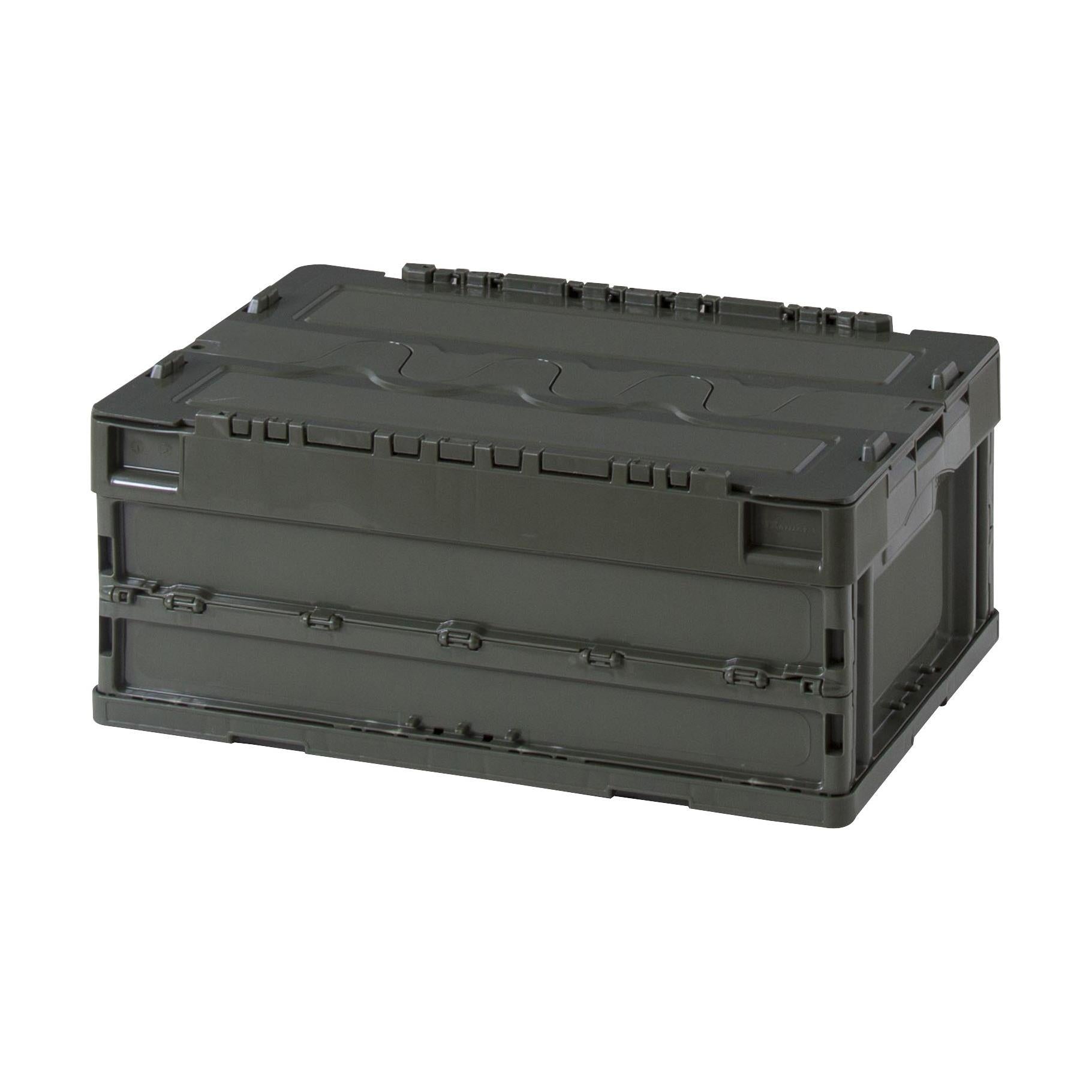 たっぷり収納できて強度も十分なオリーブドラブカラーのコンテナー 車の中、ベッド下、クローゼットなど様々な場所で大活躍です。 未使用時には折りたため、更にスタッキングもできるので、場所をとりません。
