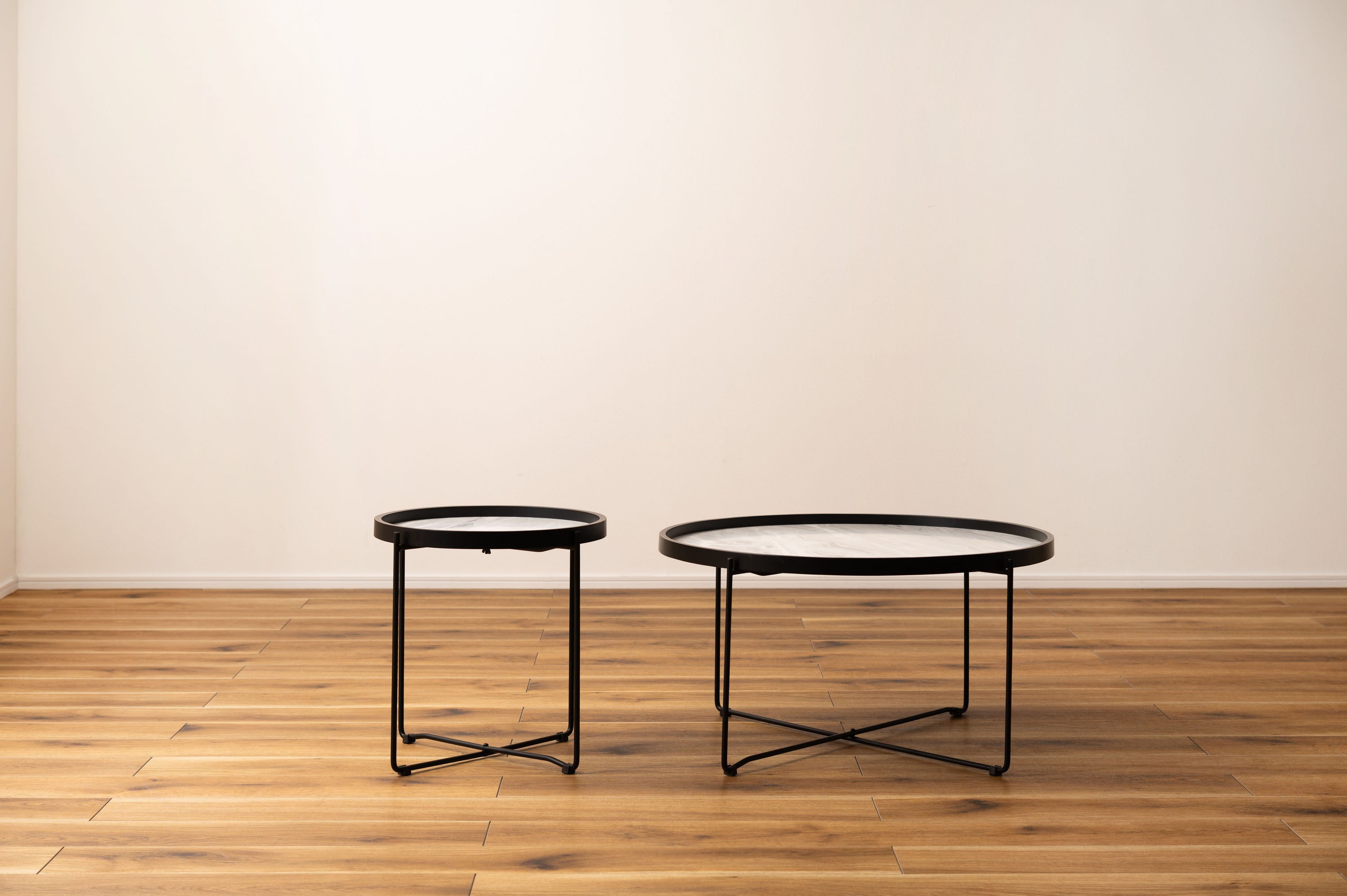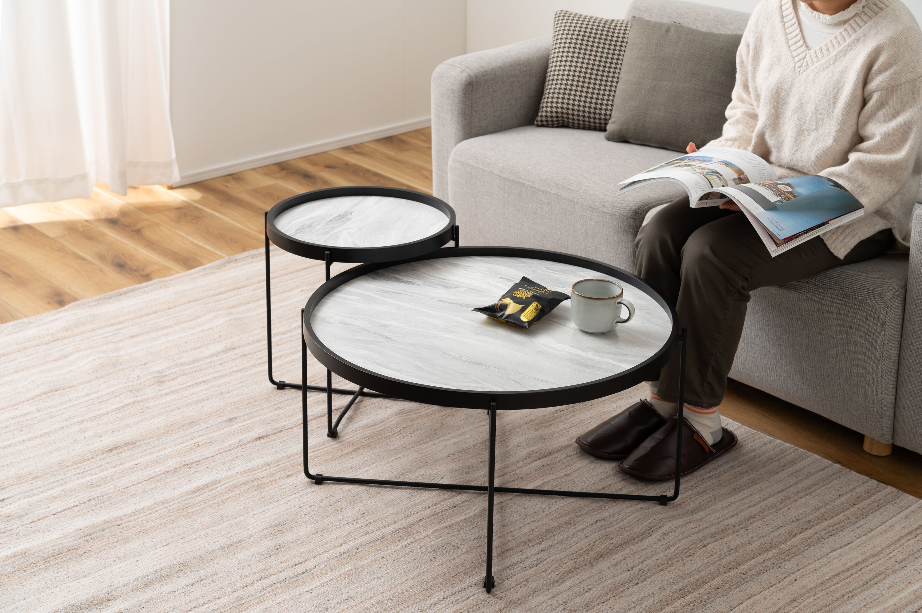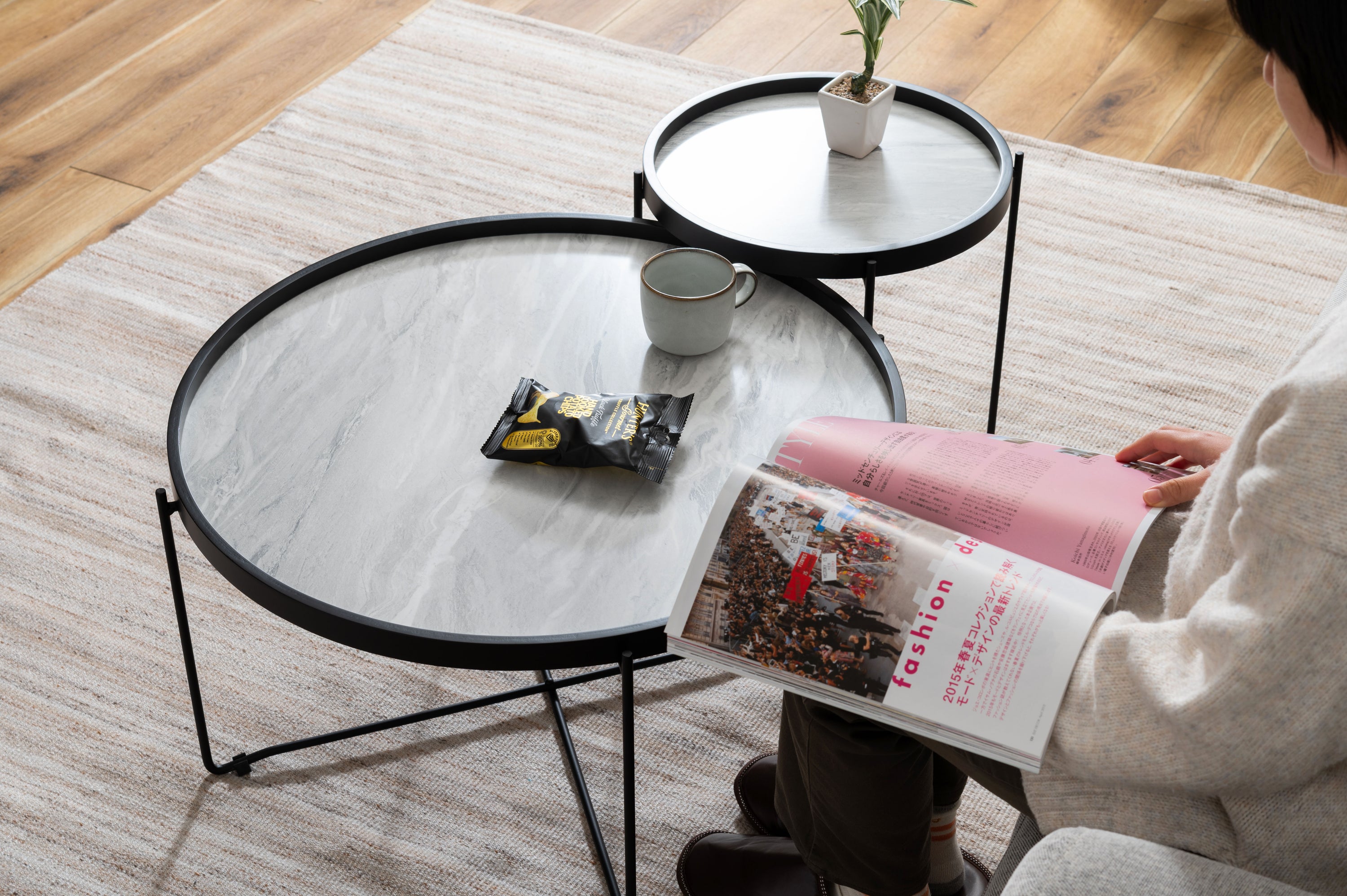 天板が取り外しできるトレーテーブルに新色が登場。 ミラー天板は外して壁掛けミラーに、木目調と大理石調の天板は外してトレーとして使用できます。 SサイズとLサイズ一緒に使用することも可能で、様々なシーンで活躍します。