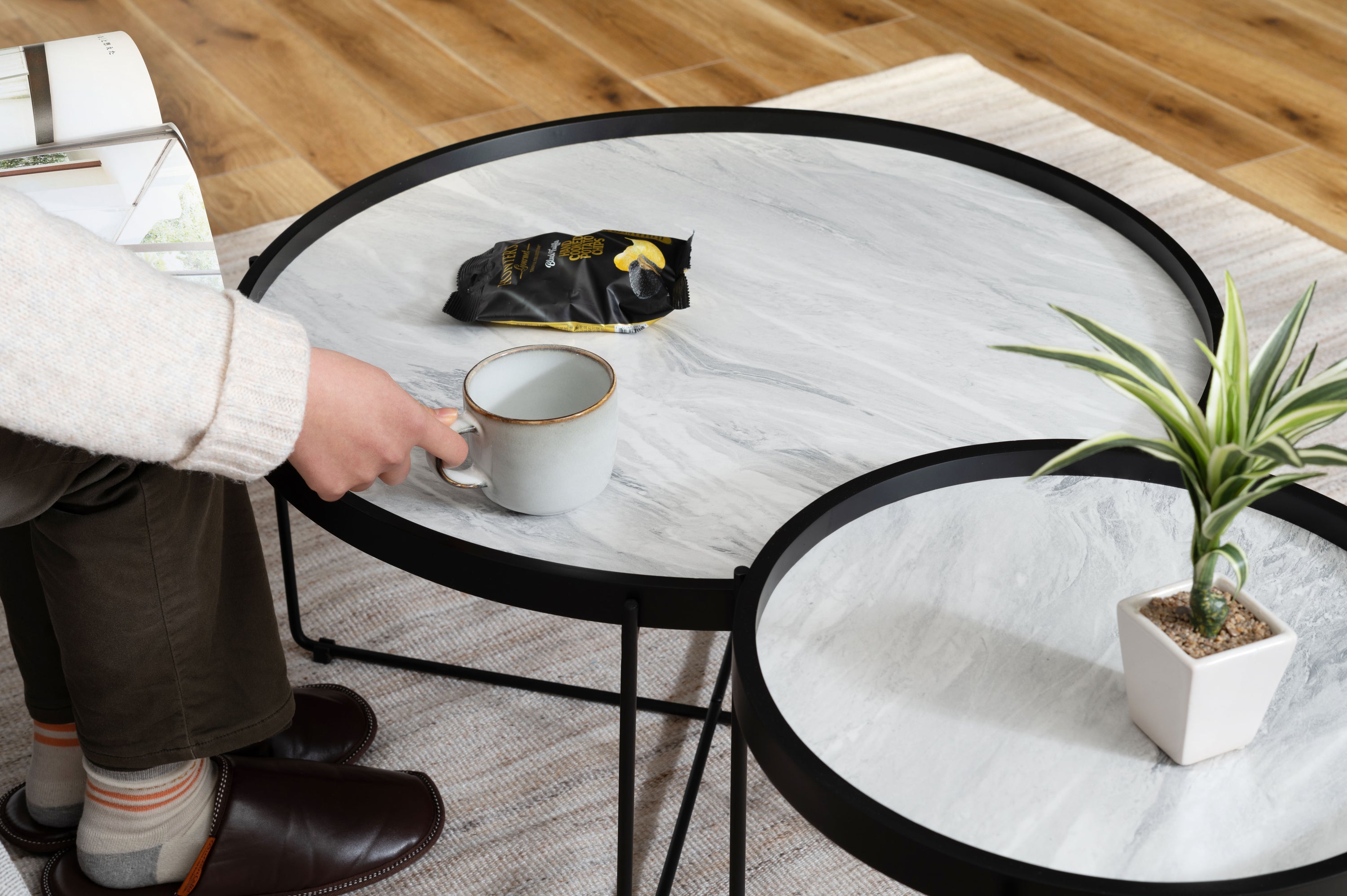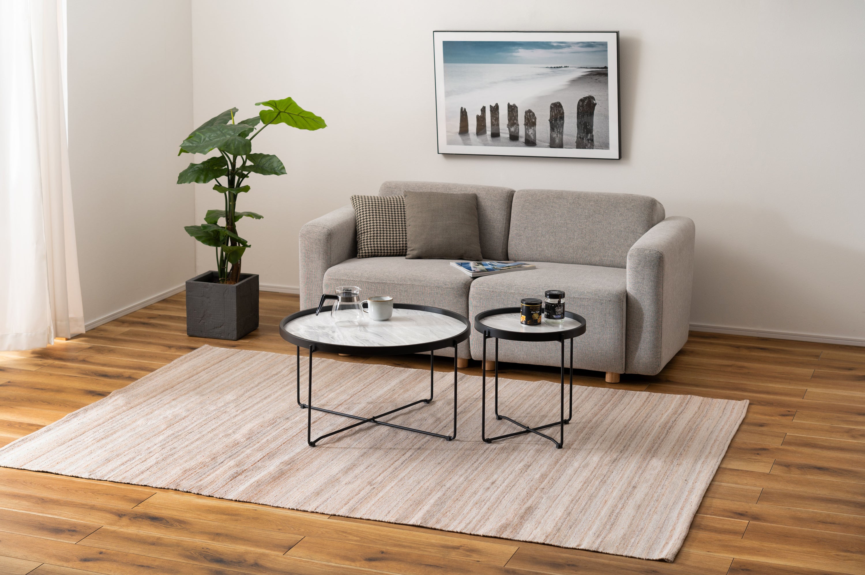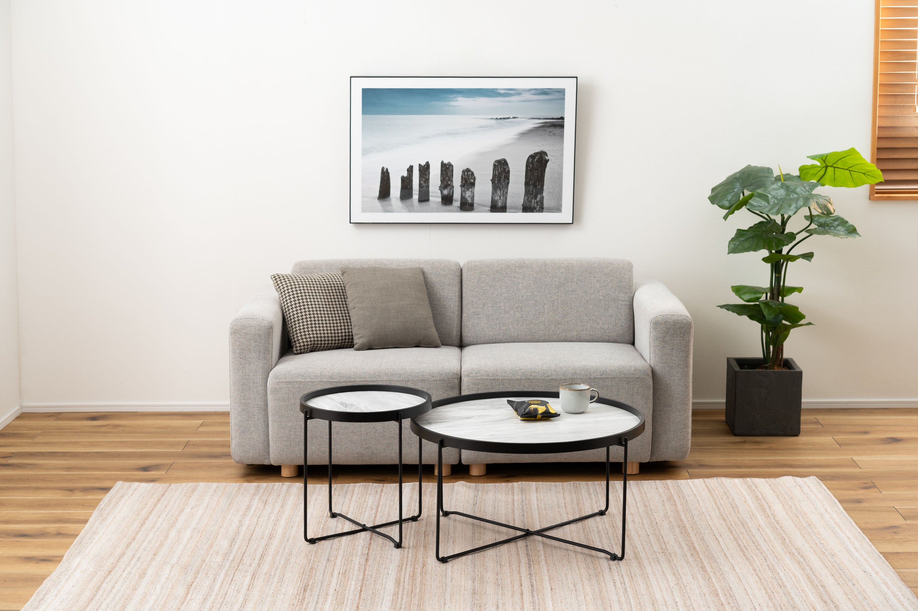 天板が取り外しできるトレーテーブルに新色が登場。 ミラー天板は外して壁掛けミラーに、木目調と大理石調の天板は外してトレーとして使用できます。 SサイズとLサイズ一緒に使用することも可能で、様々なシーンで活躍します。