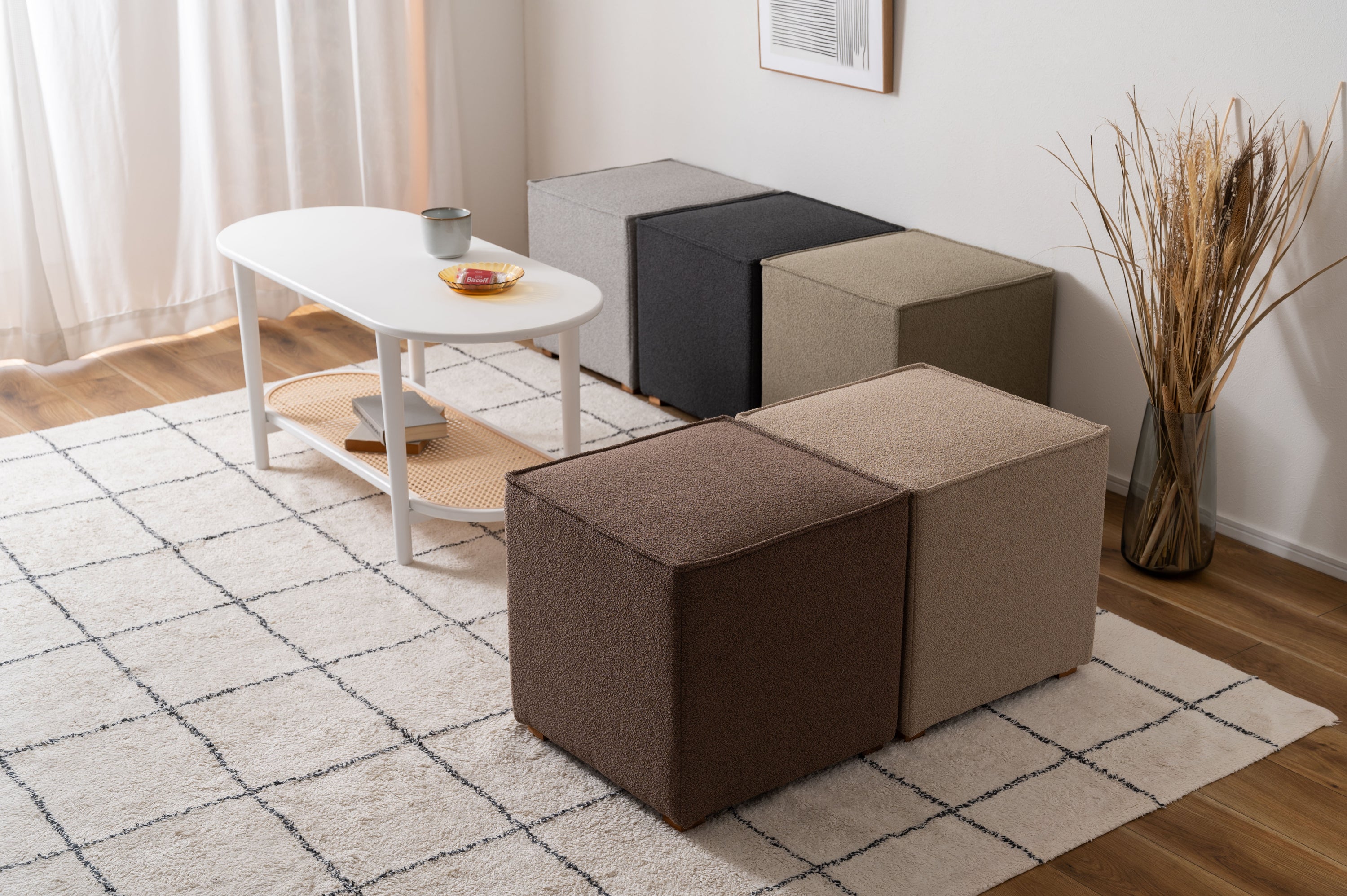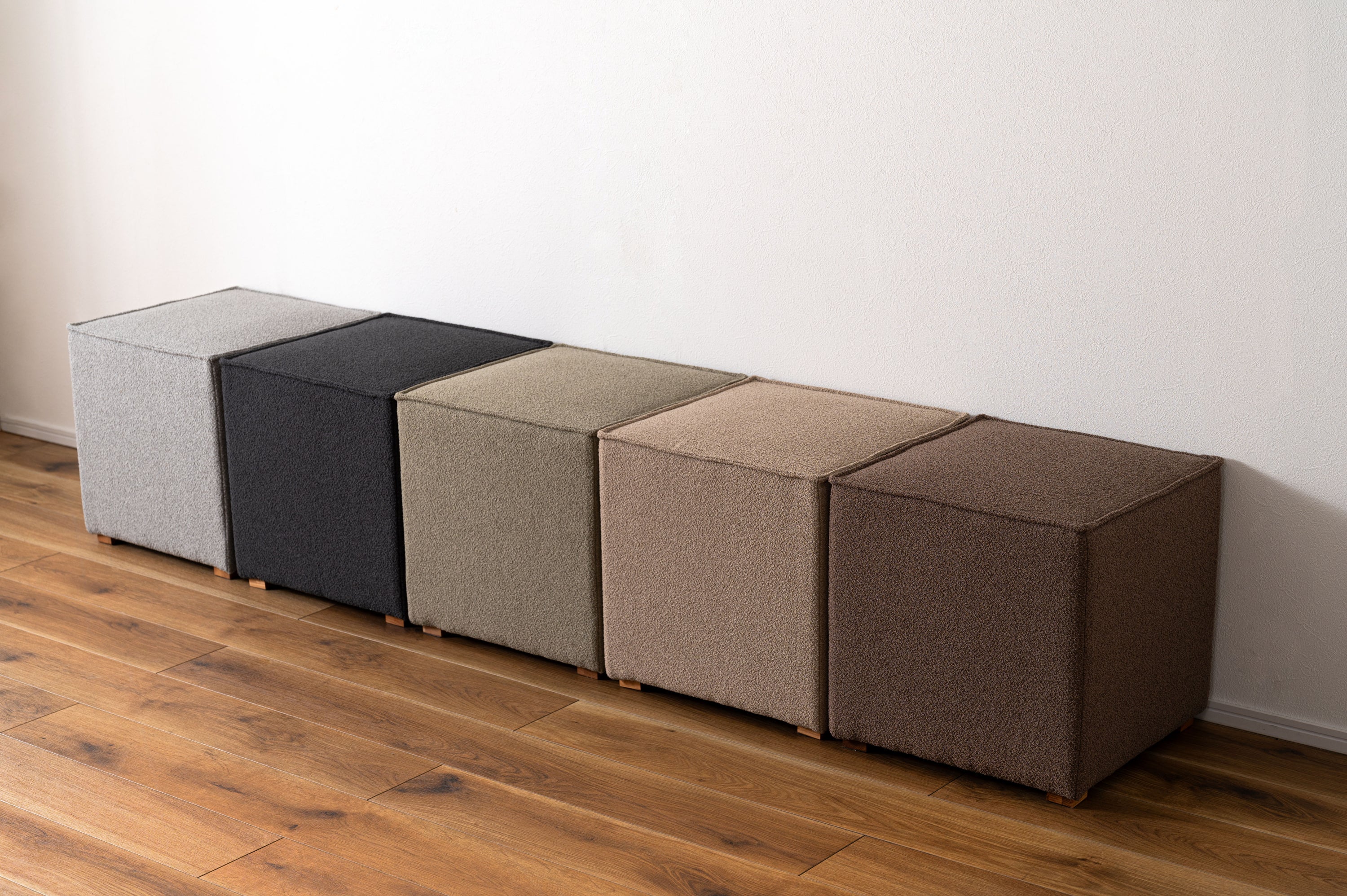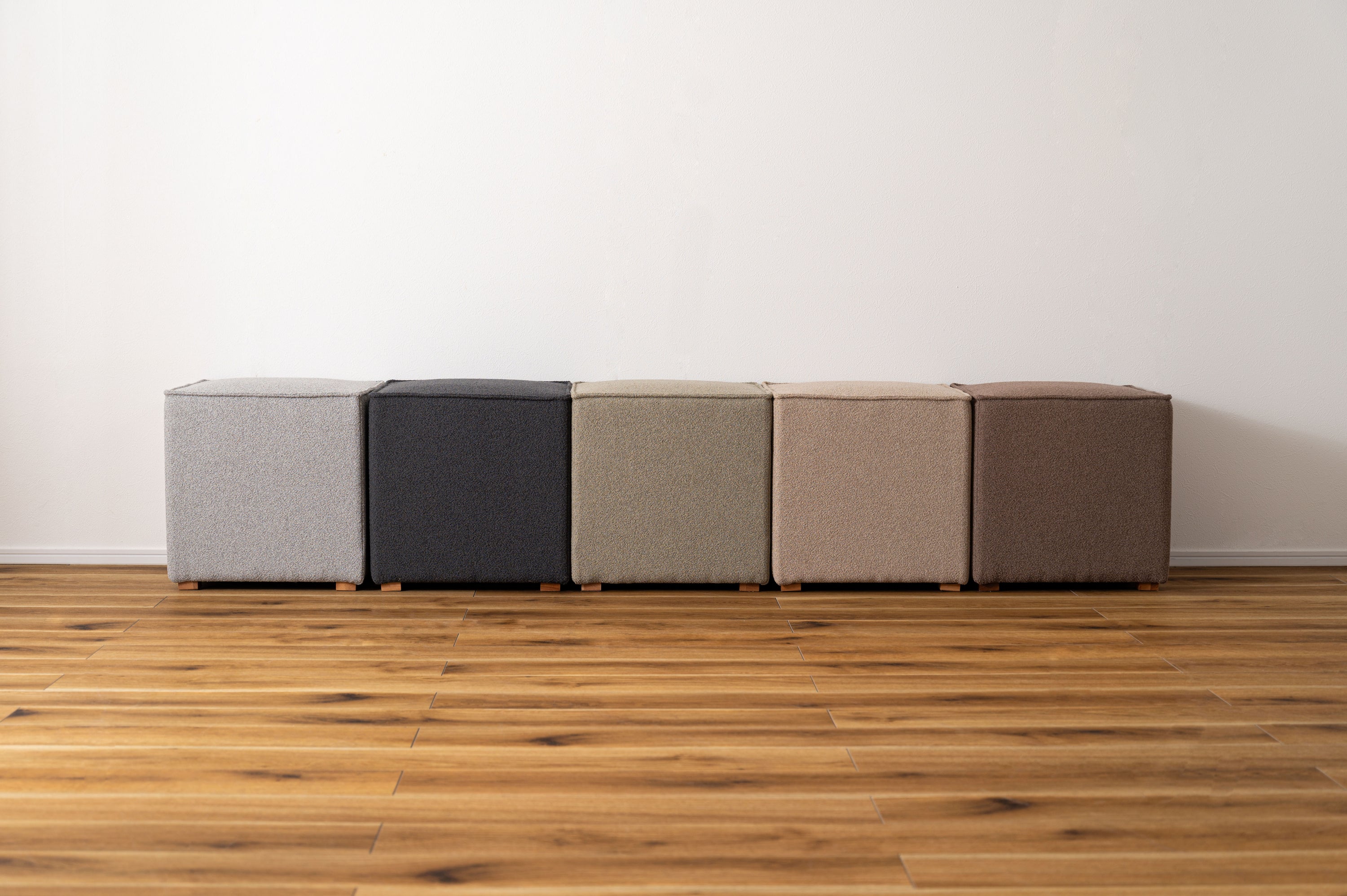 ころんとしたキューブ型のフォルムとシンプルなカラーリングが特徴的なスツール キューブ型のフォルムで可愛らしさもありながら、シンプルなニュアンスカラーにする事で様々なインテリアとの相性も良いアイテム。 スツールとしてはもちろん、オットマンとしてやピッタリ並べて複数台でのご使用もお勧めです。 クッション性のある座面 オットマンとしても 複数並べての使用も