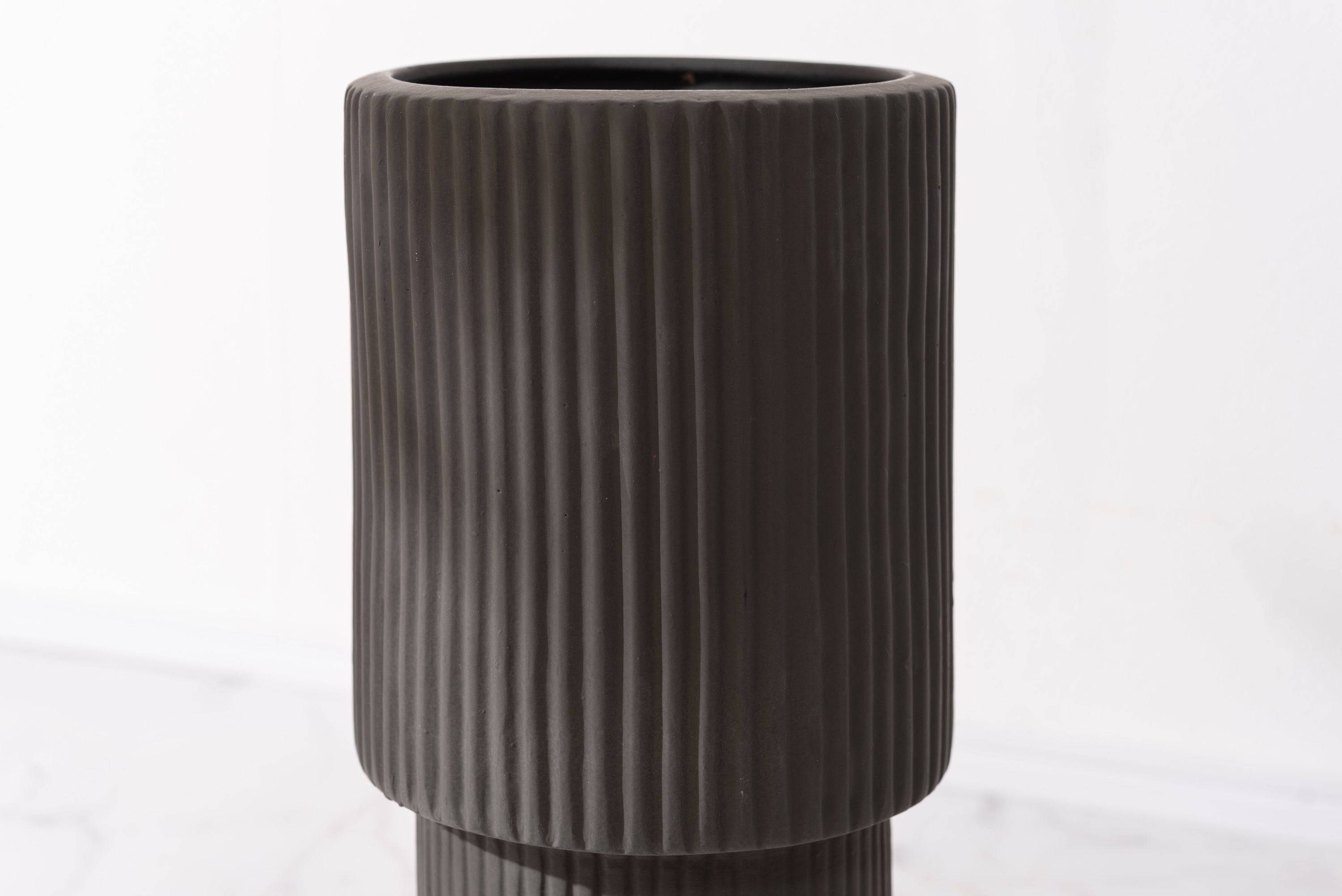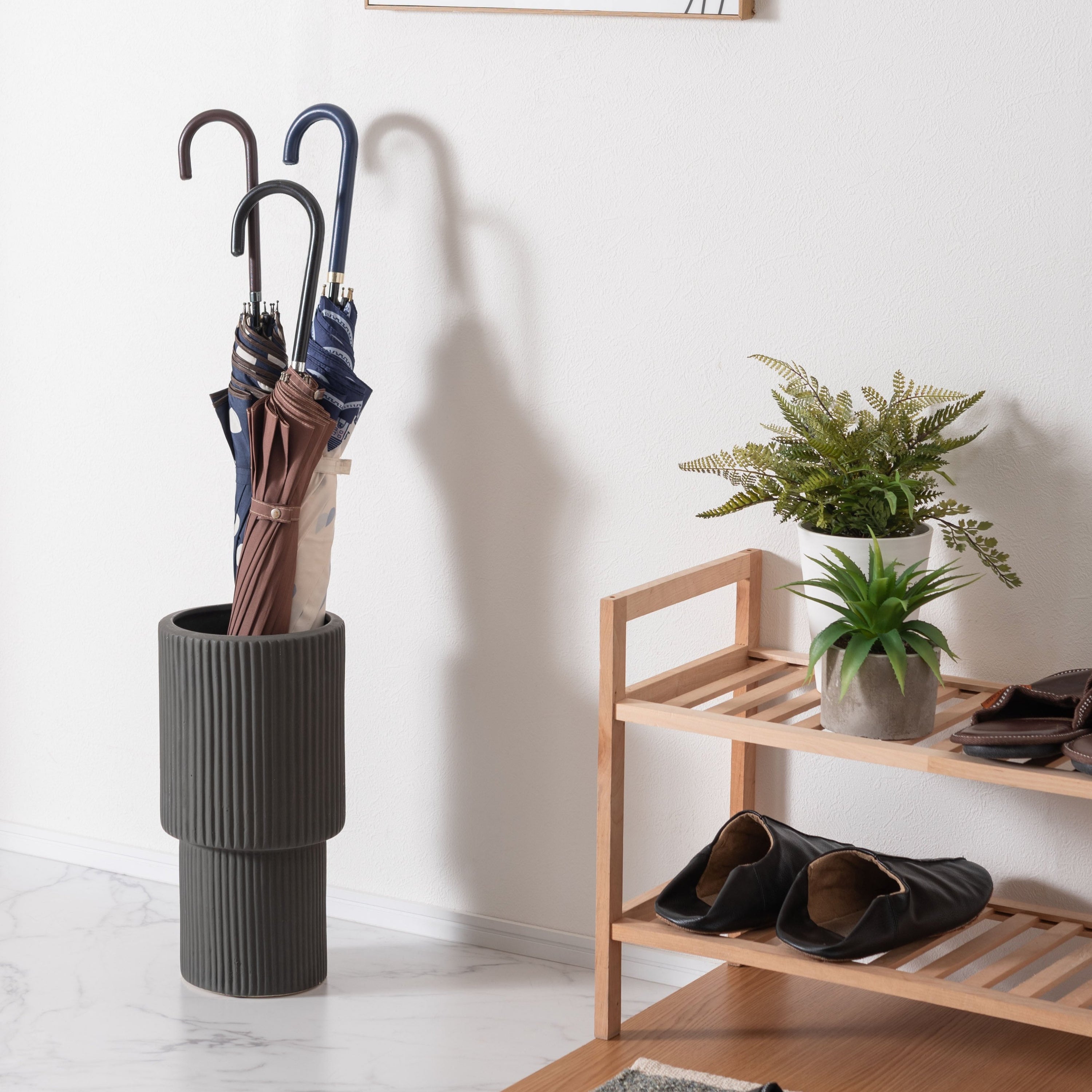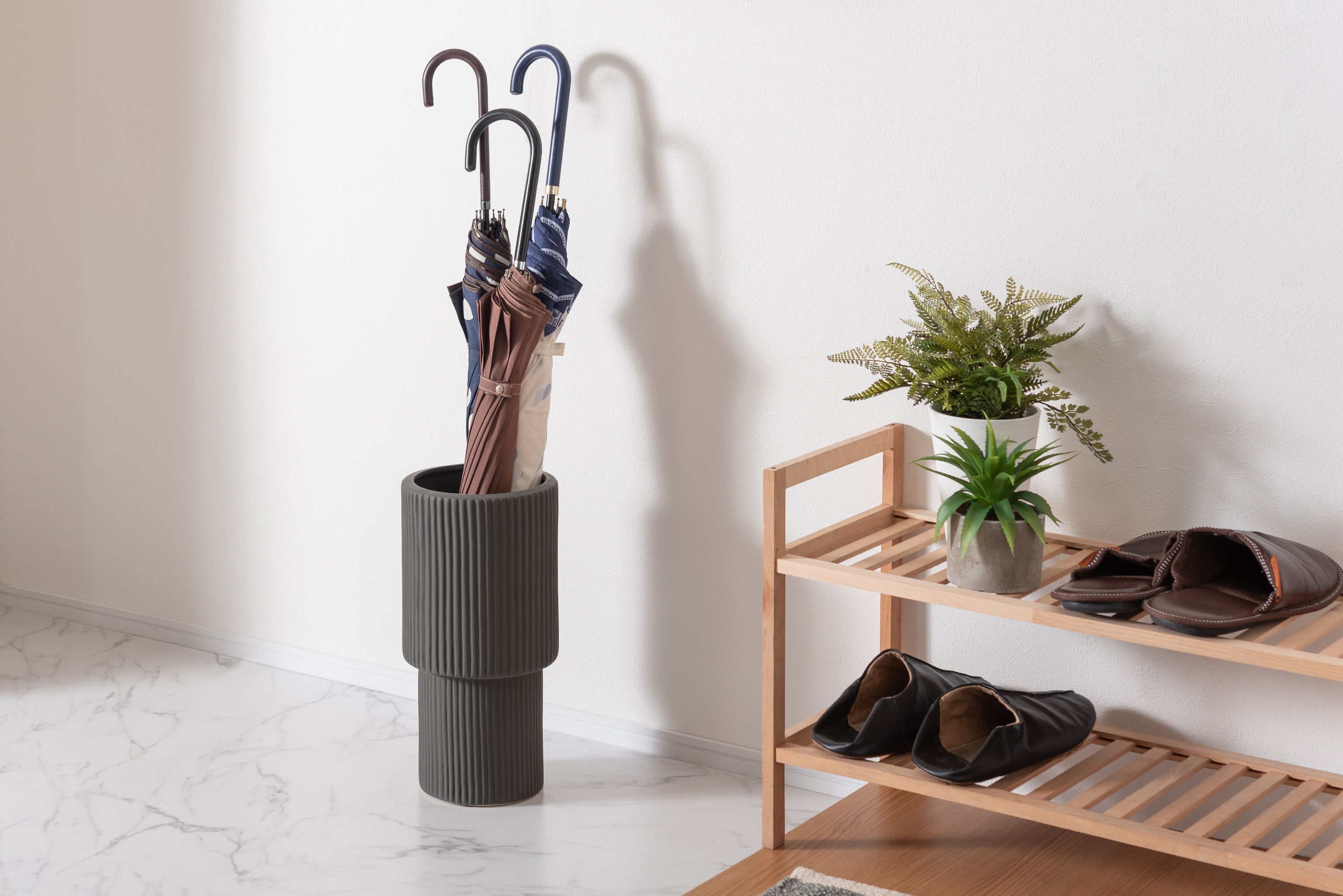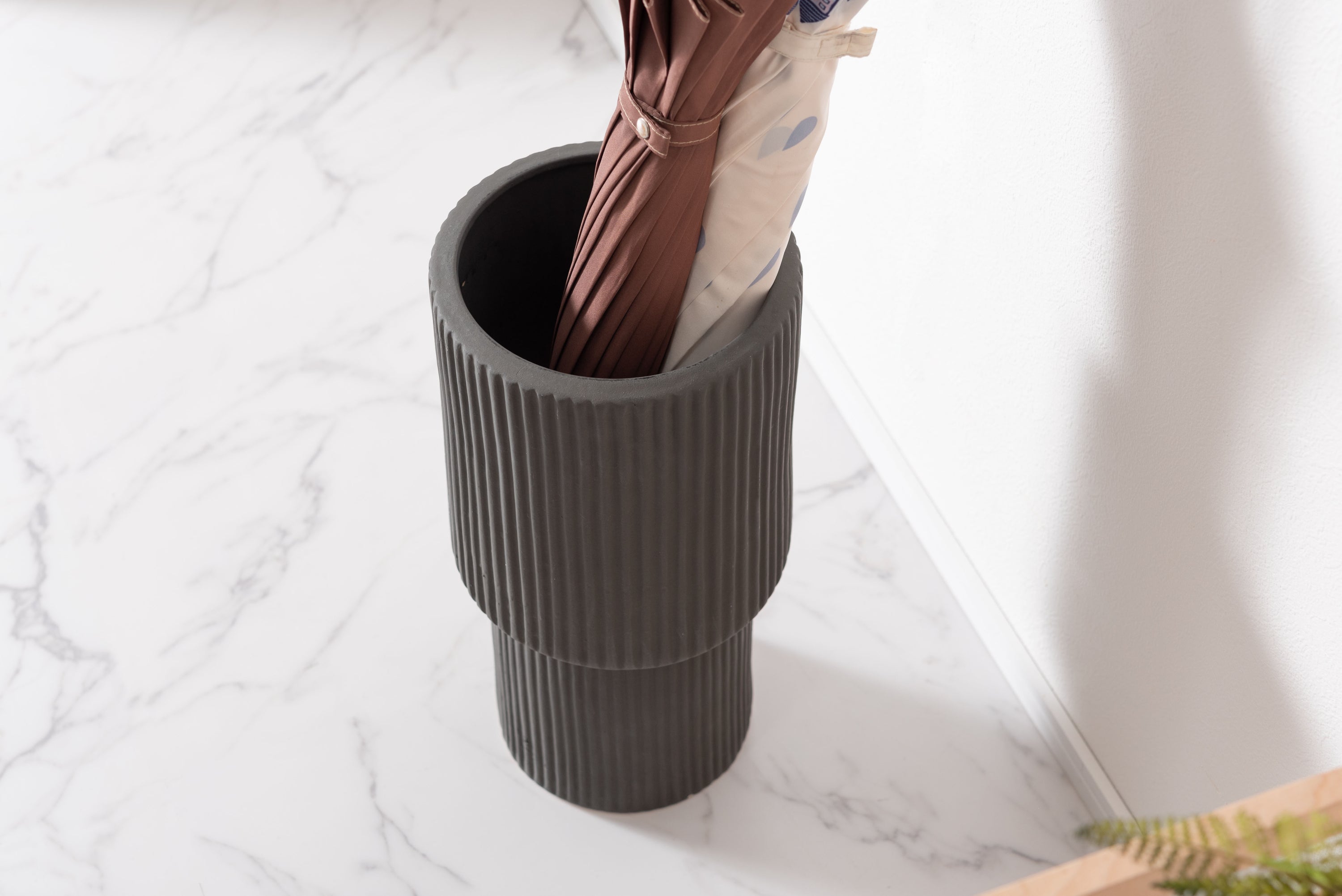 角の丸い形状が特徴的でマットな質感が上品な傘立てです。玄関だけでなくインテリアやオブジェとしても活躍します。コーデュロイのような模様が質感を強調させワンランク上の空間を演出します。凹凸のある縦状の影が美しさを際立たせるデザインです。