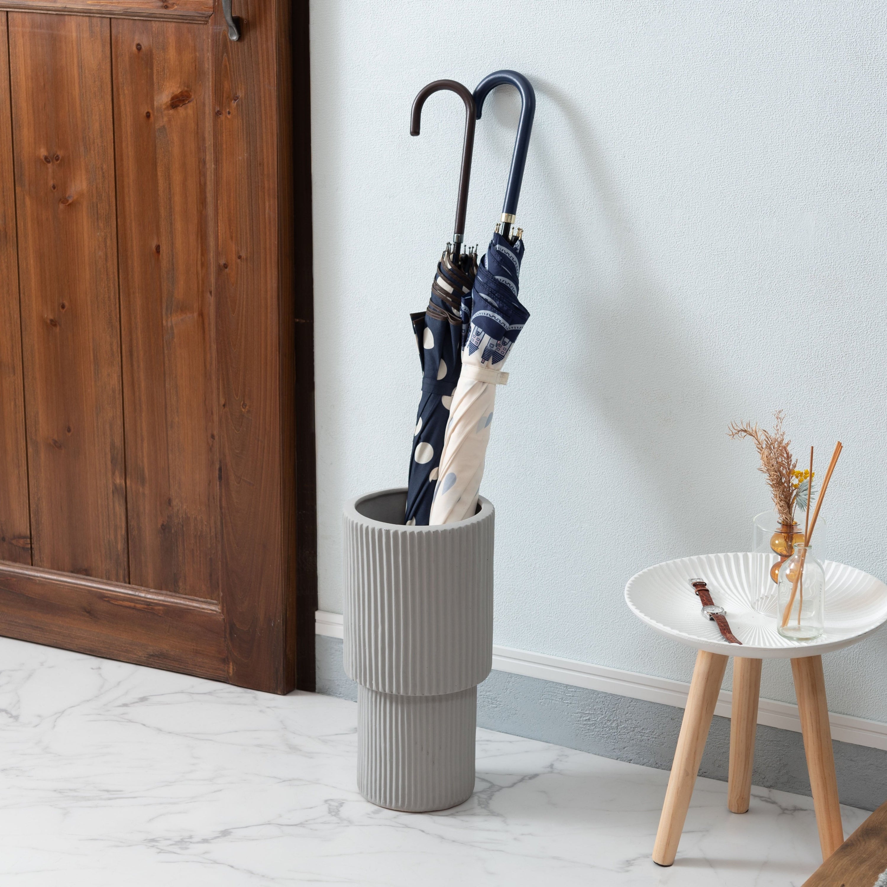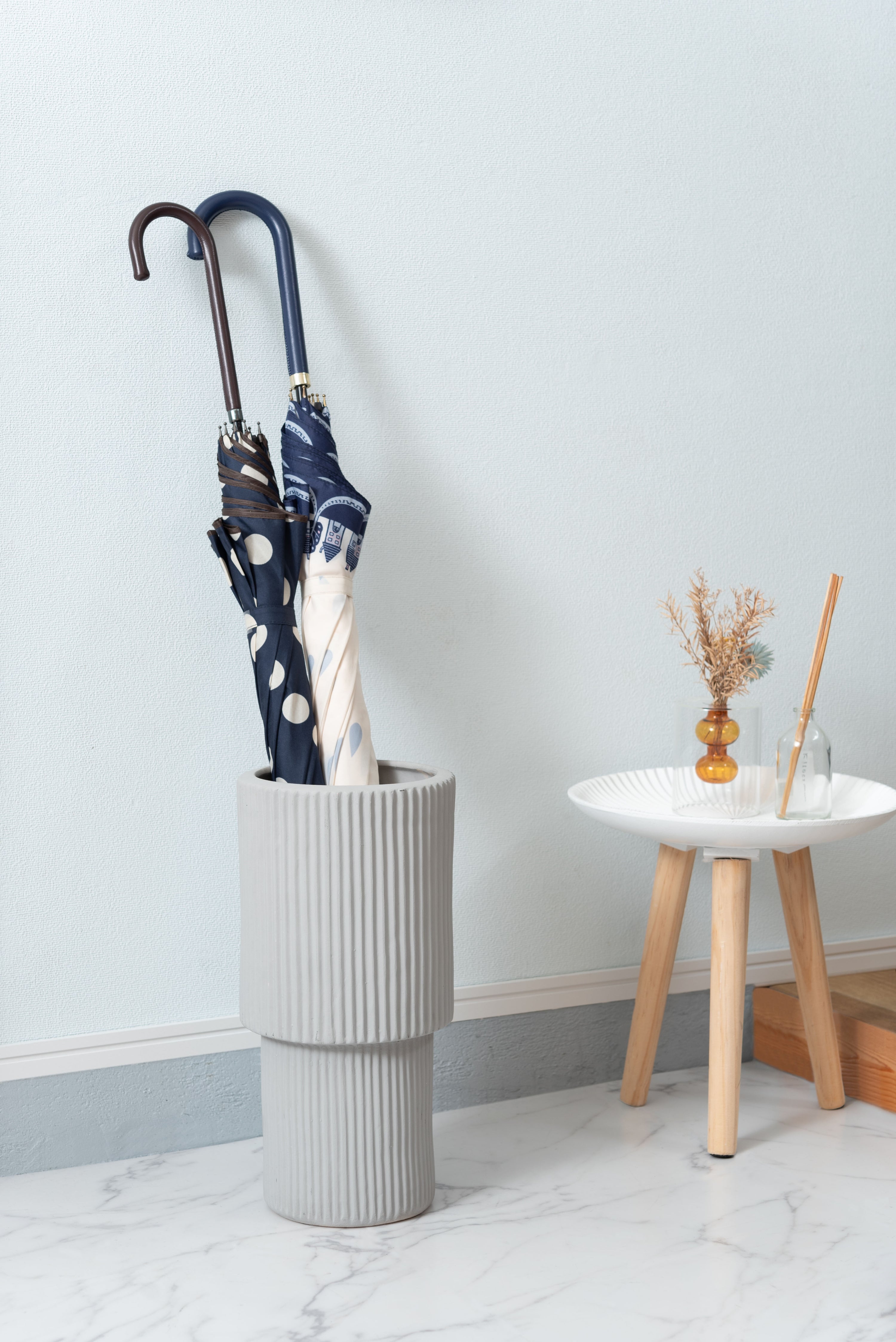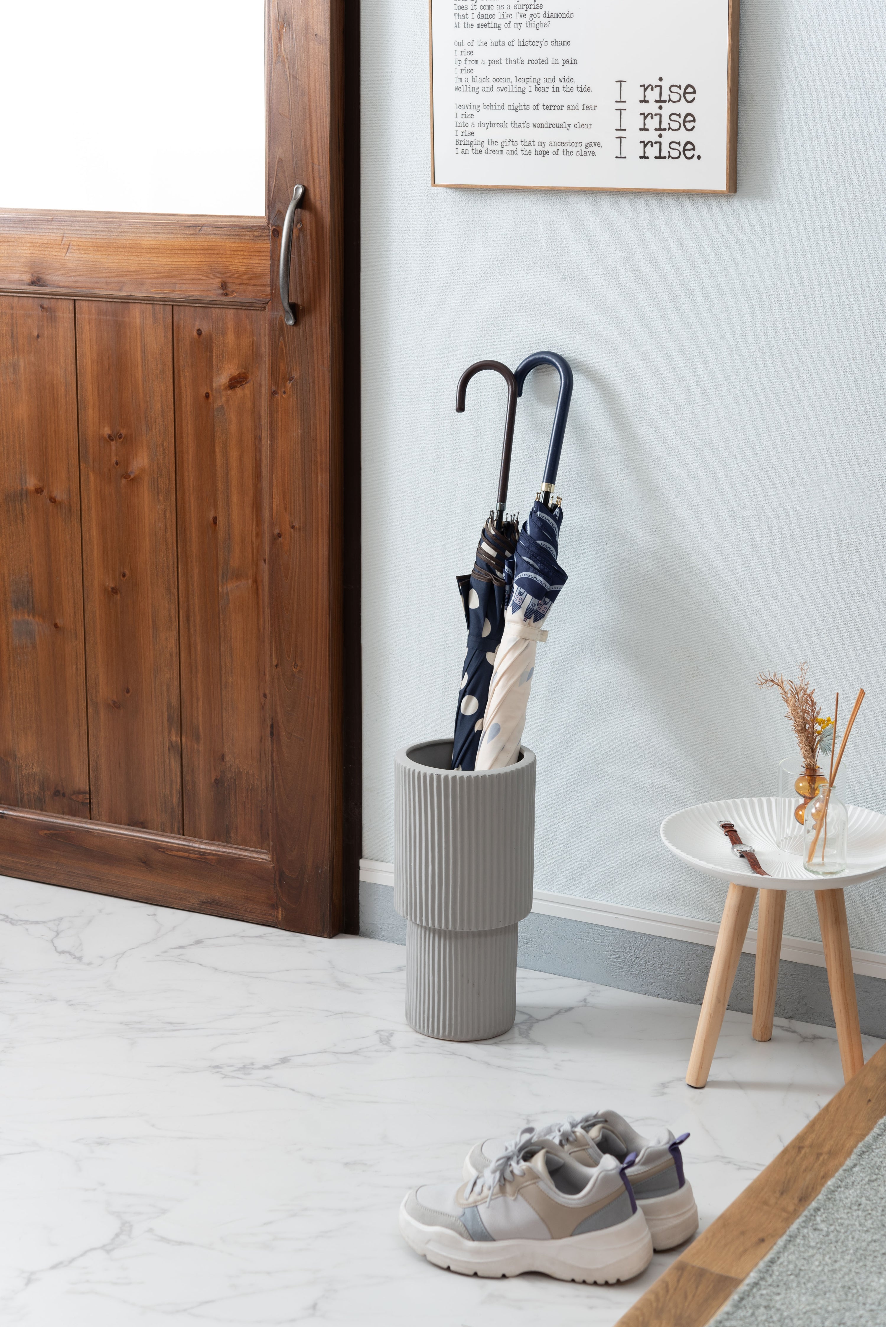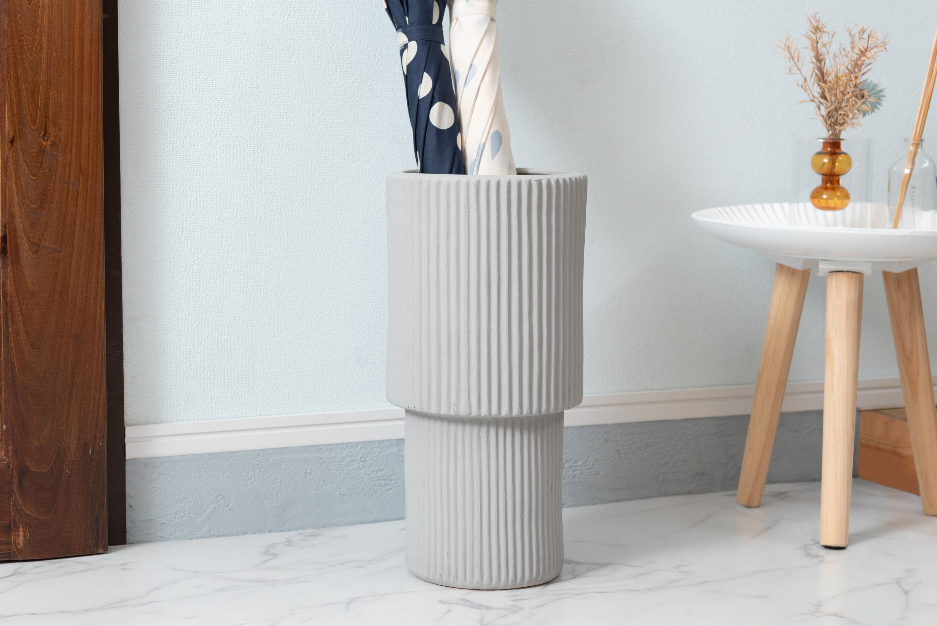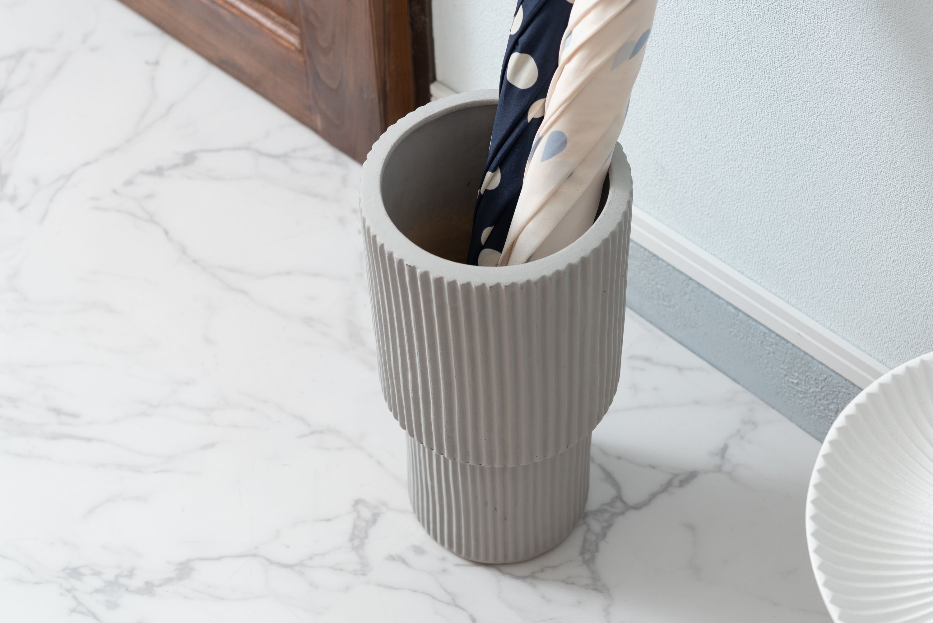 角の丸い形状が特徴的でマットな質感が上品な傘立てです。玄関だけでなくインテリアやオブジェとしても活躍します。コーデュロイのような模様が質感を強調させワンランク上の空間を演出します。凹凸のある縦状の影が美しさを際立たせるデザインです。