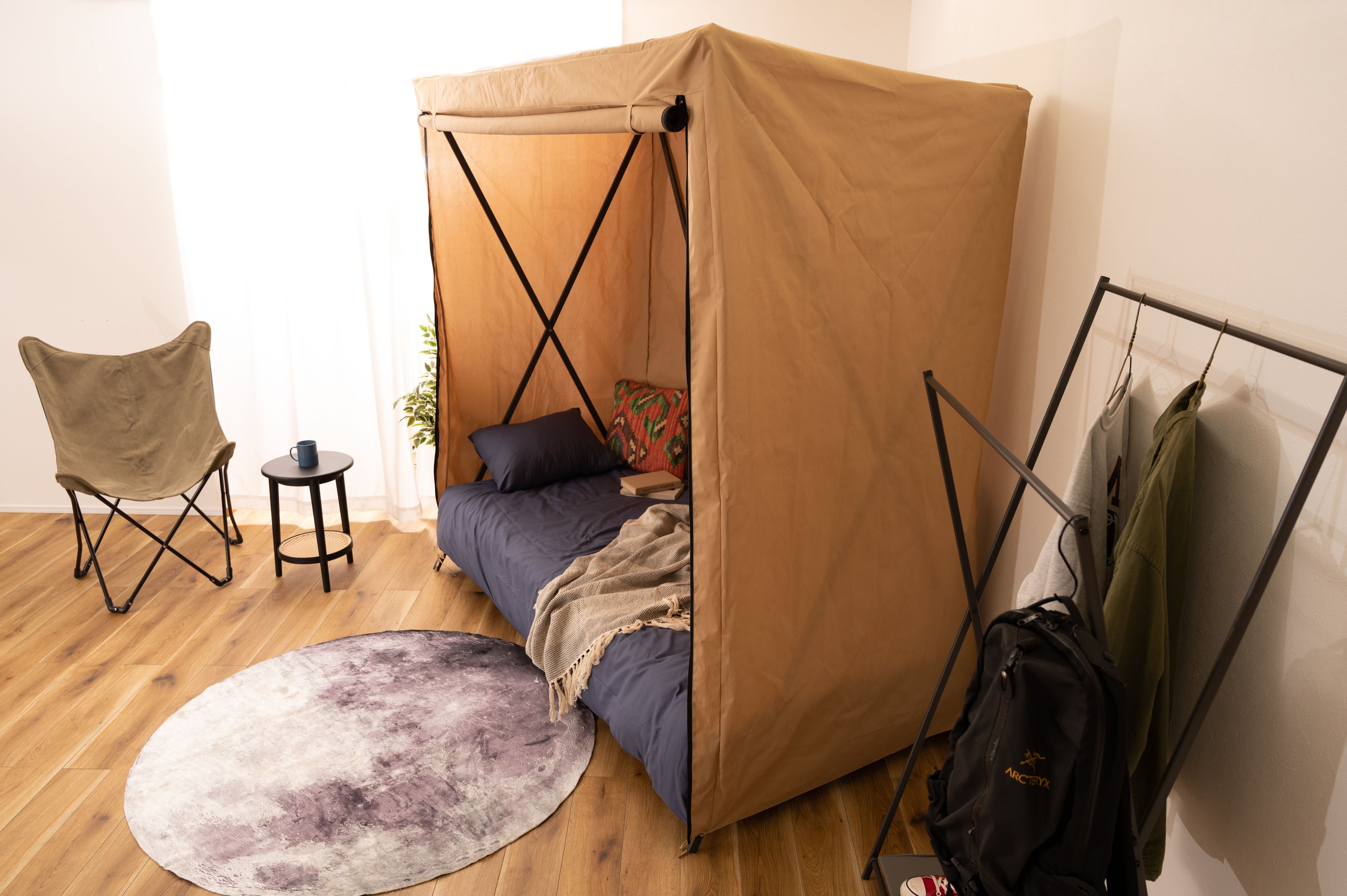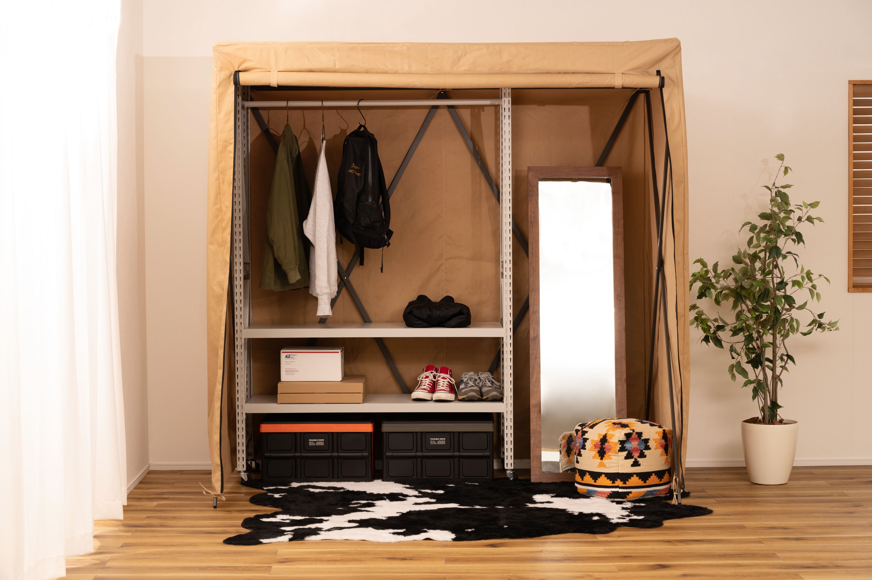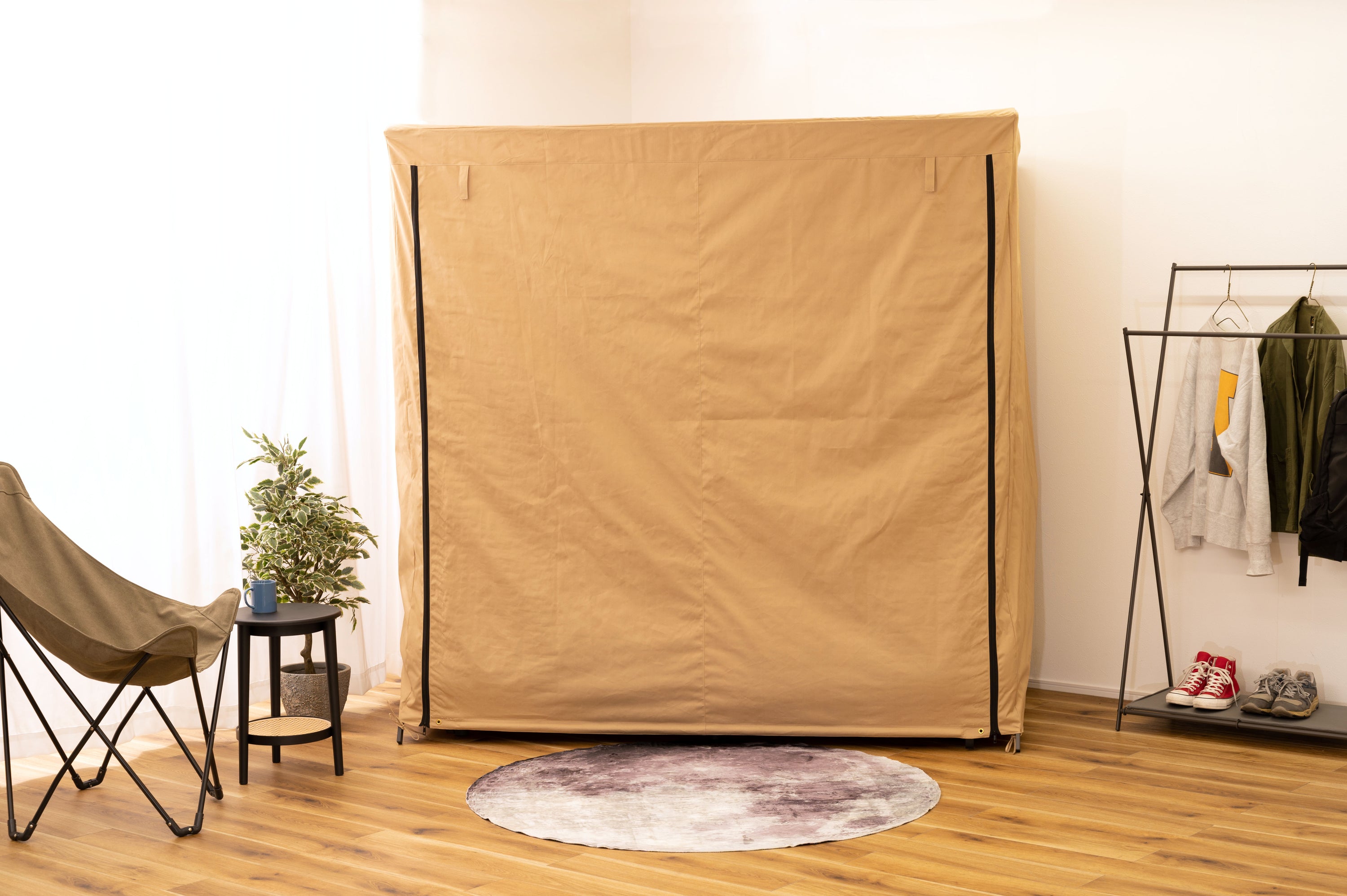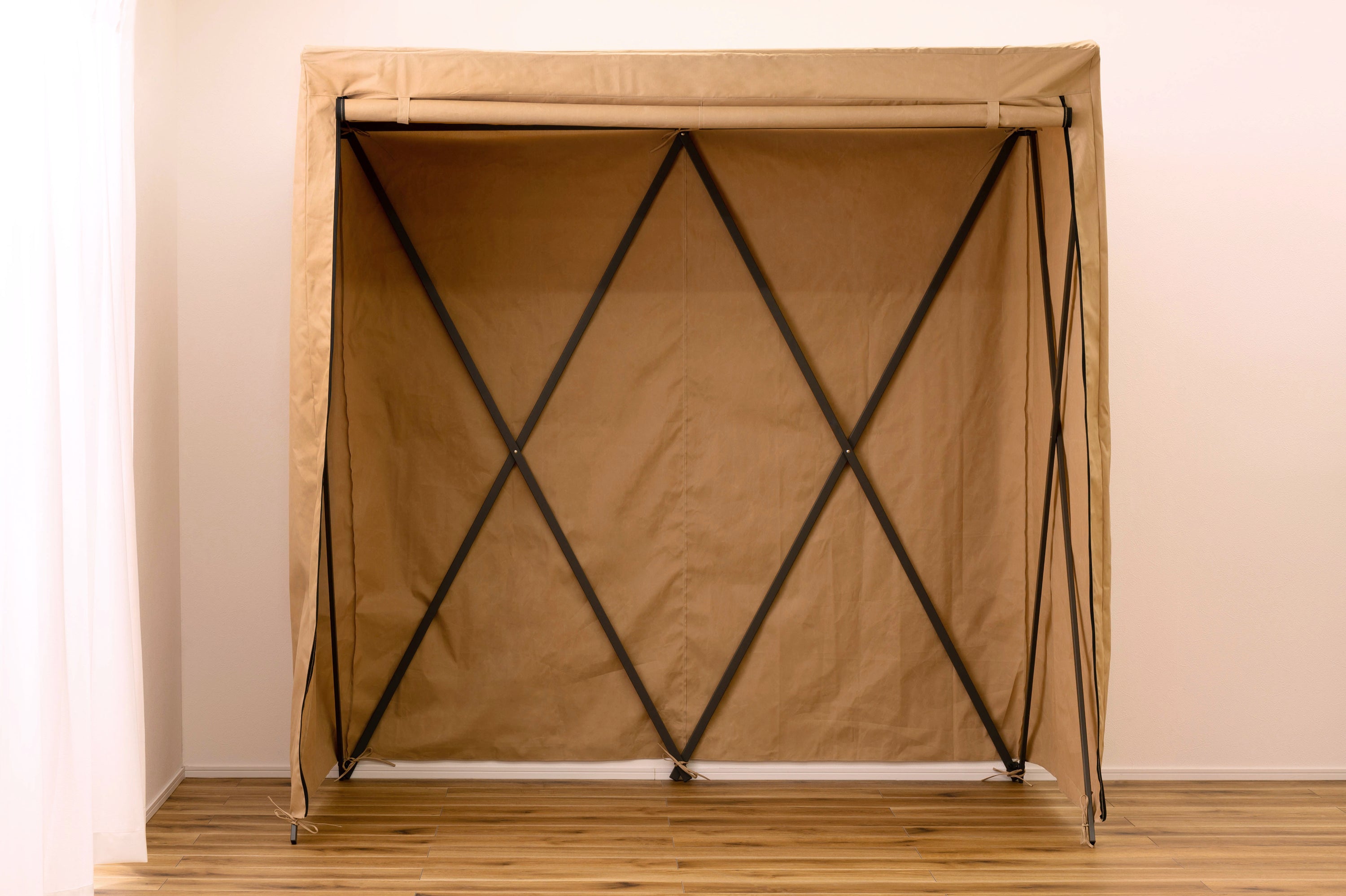 ガレージ、クローゼットや室内に広げて自分だけのプライベート空間として使えるルームテント。使い方によって様々なシーンで活躍してくれるアイテム。簡易ガレージとして自転車や脚立、工具類を収納するスペースに。リビングに設置してデスクやランプを入れて、作業に集中したい時のおこもりスペースとして。ルームテントでベッドを囲い小物でディスプレイをすれば、個性的で落ち着いたベッドルームに。ルームテントの中に収納ラックを置けばクローゼットに早変わり。お店の中に設置して、販売スペースとしてこだわりの商品やおすすめ商品をディスプレイするのにも。折りたためばコンパクトになるので持ち運びにも便利。前面カバーの先端にハトメ・ベルトが付いているので、ロープを通してタープを張る事も出来ます。