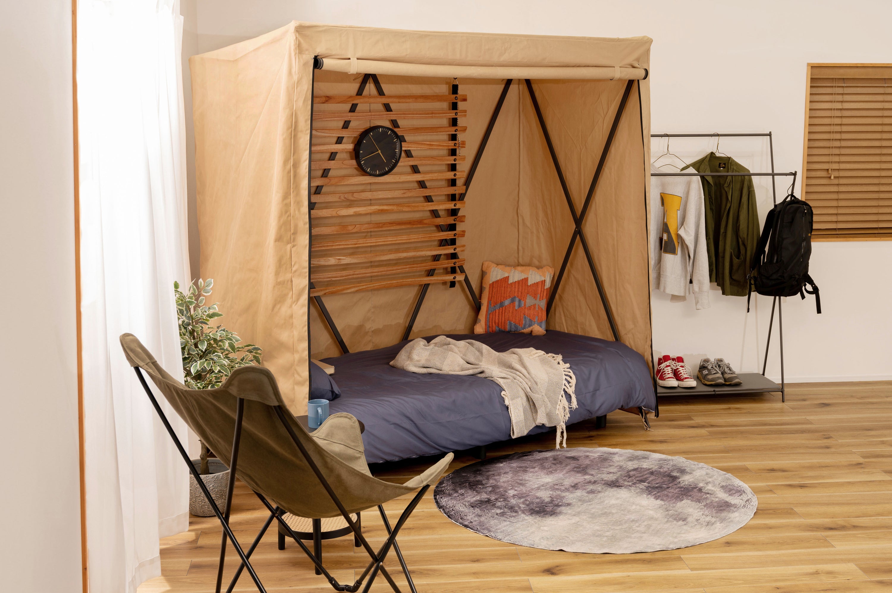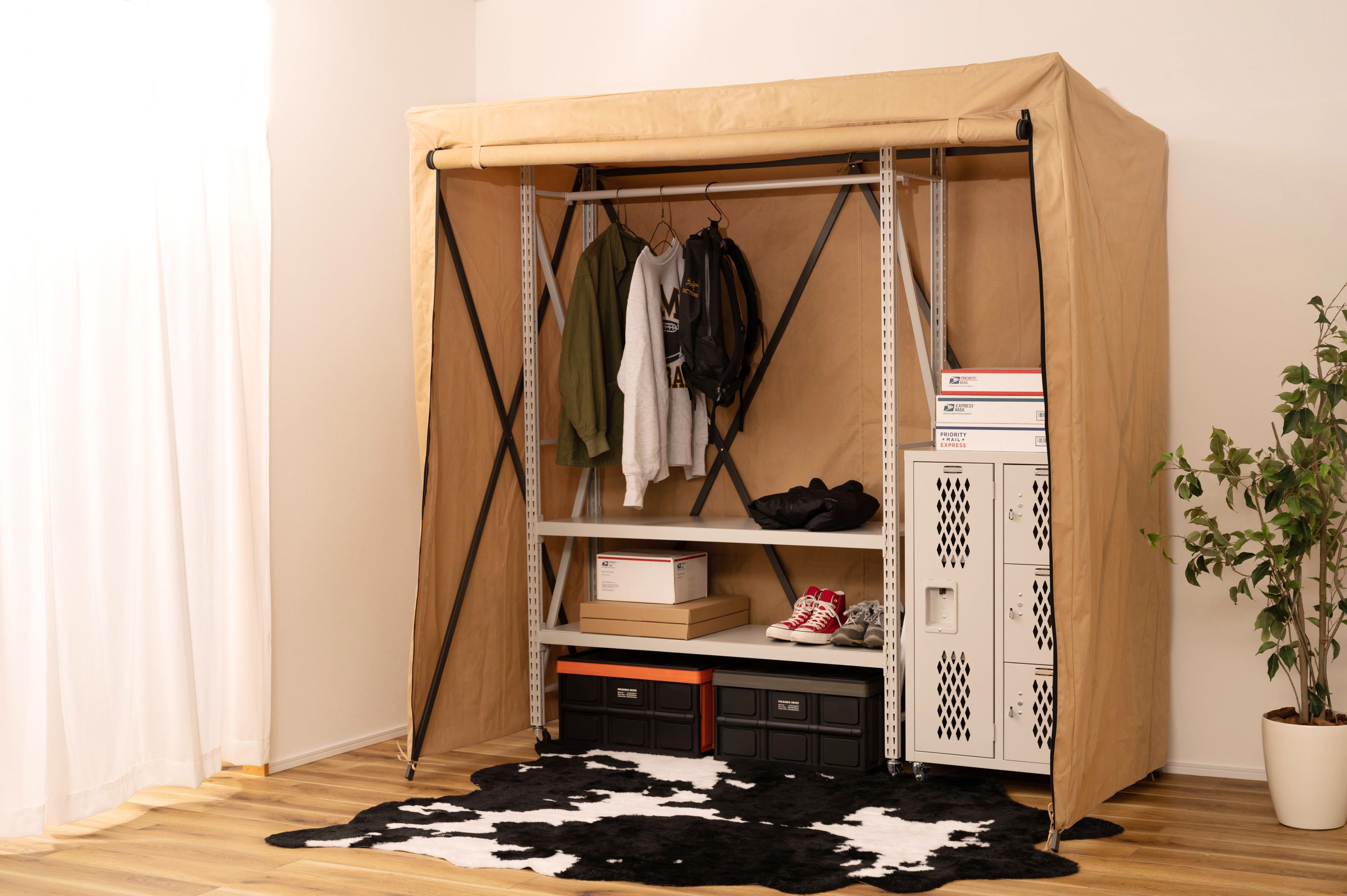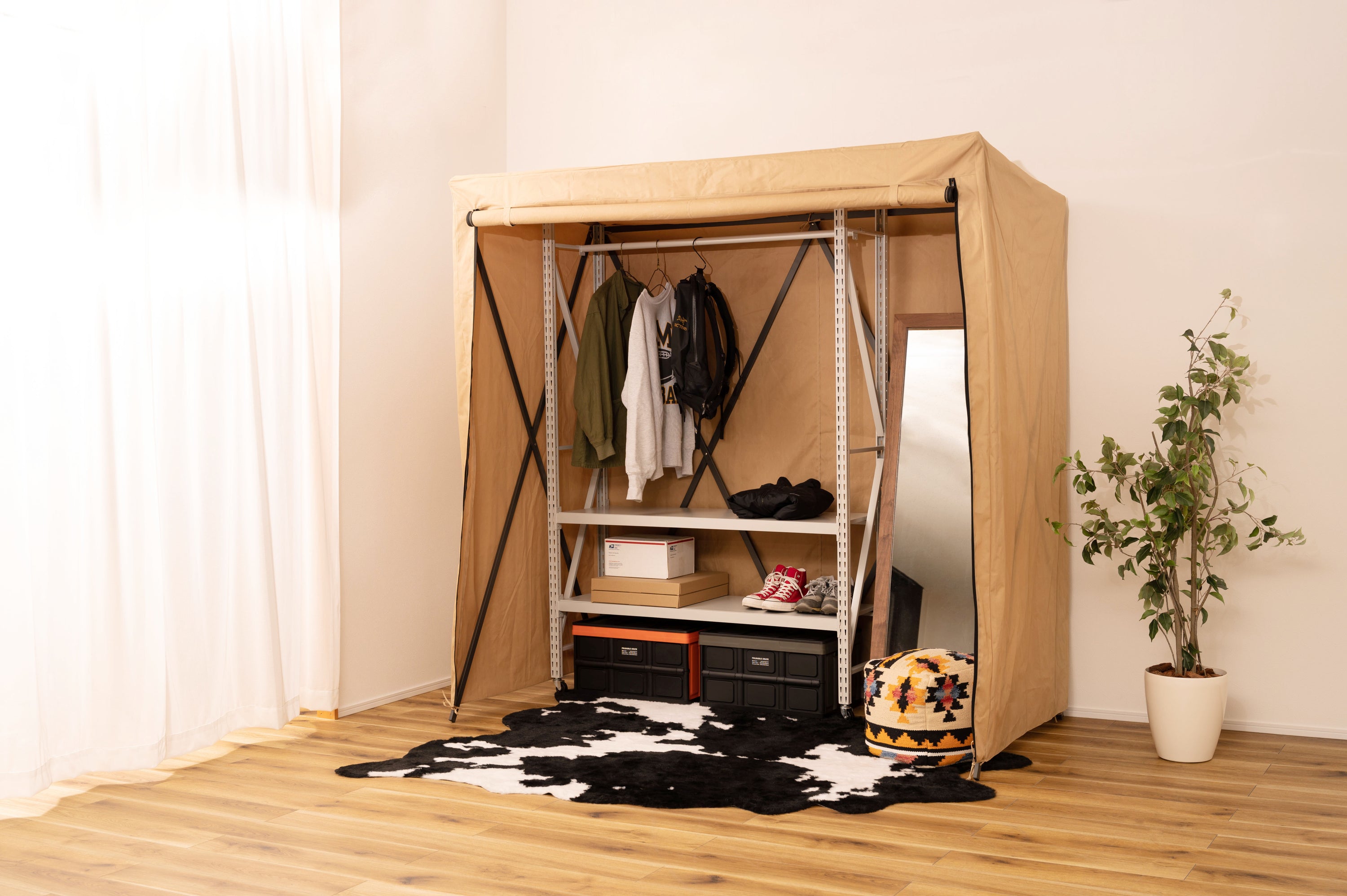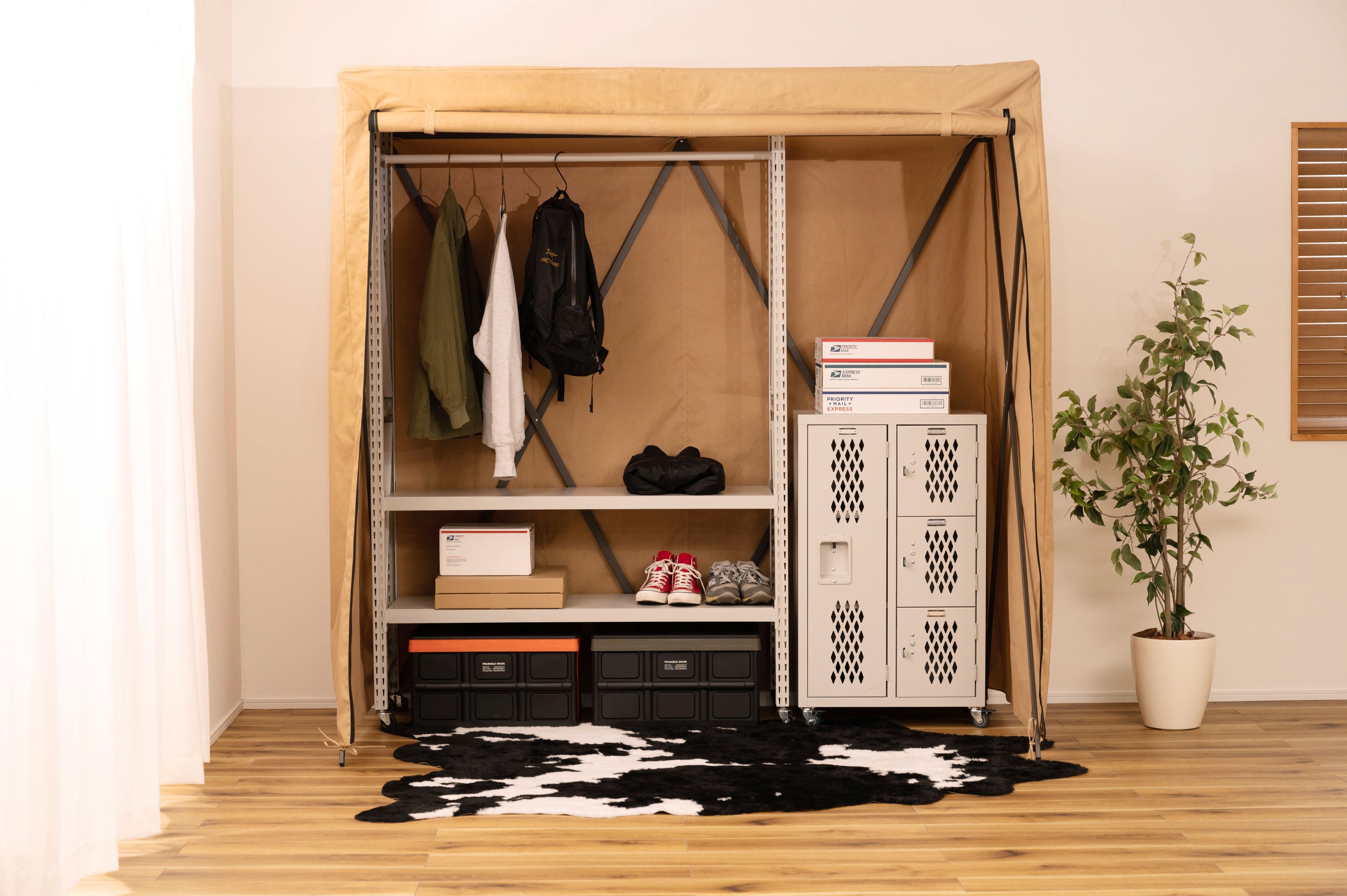 ガレージ、クローゼットや室内に広げて自分だけのプライベート空間として使えるルームテント。使い方によって様々なシーンで活躍してくれるアイテム。簡易ガレージとして自転車や脚立、工具類を収納するスペースに。リビングに設置してデスクやランプを入れて、作業に集中したい時のおこもりスペースとして。ルームテントでベッドを囲い小物でディスプレイをすれば、個性的で落ち着いたベッドルームに。ルームテントの中に収納ラックを置けばクローゼットに早変わり。お店の中に設置して、販売スペースとしてこだわりの商品やおすすめ商品をディスプレイするのにも。折りたためばコンパクトになるので持ち運びにも便利。前面カバーの先端にハトメ・ベルトが付いているので、ロープを通してタープを張る事も出来ます。