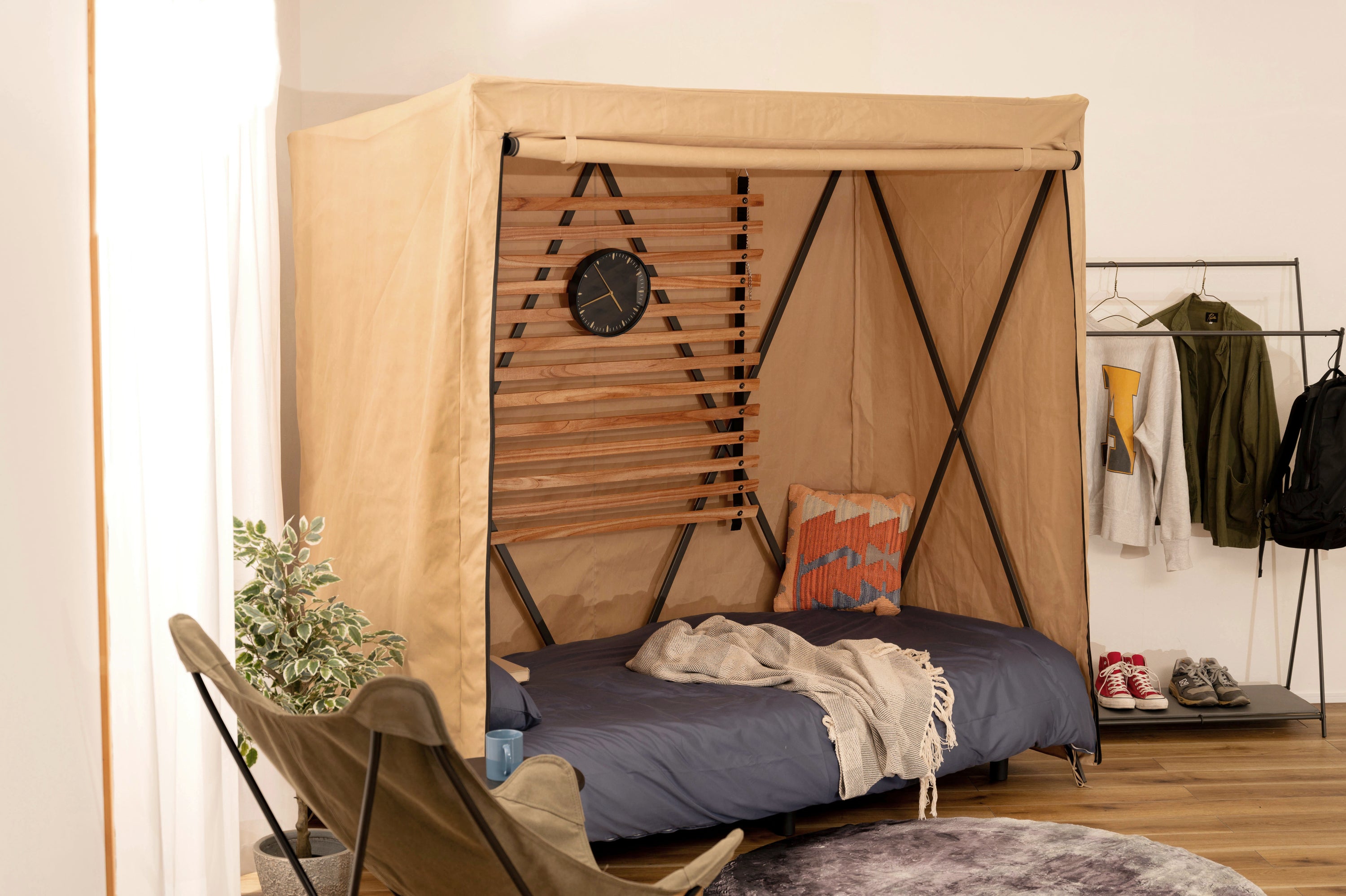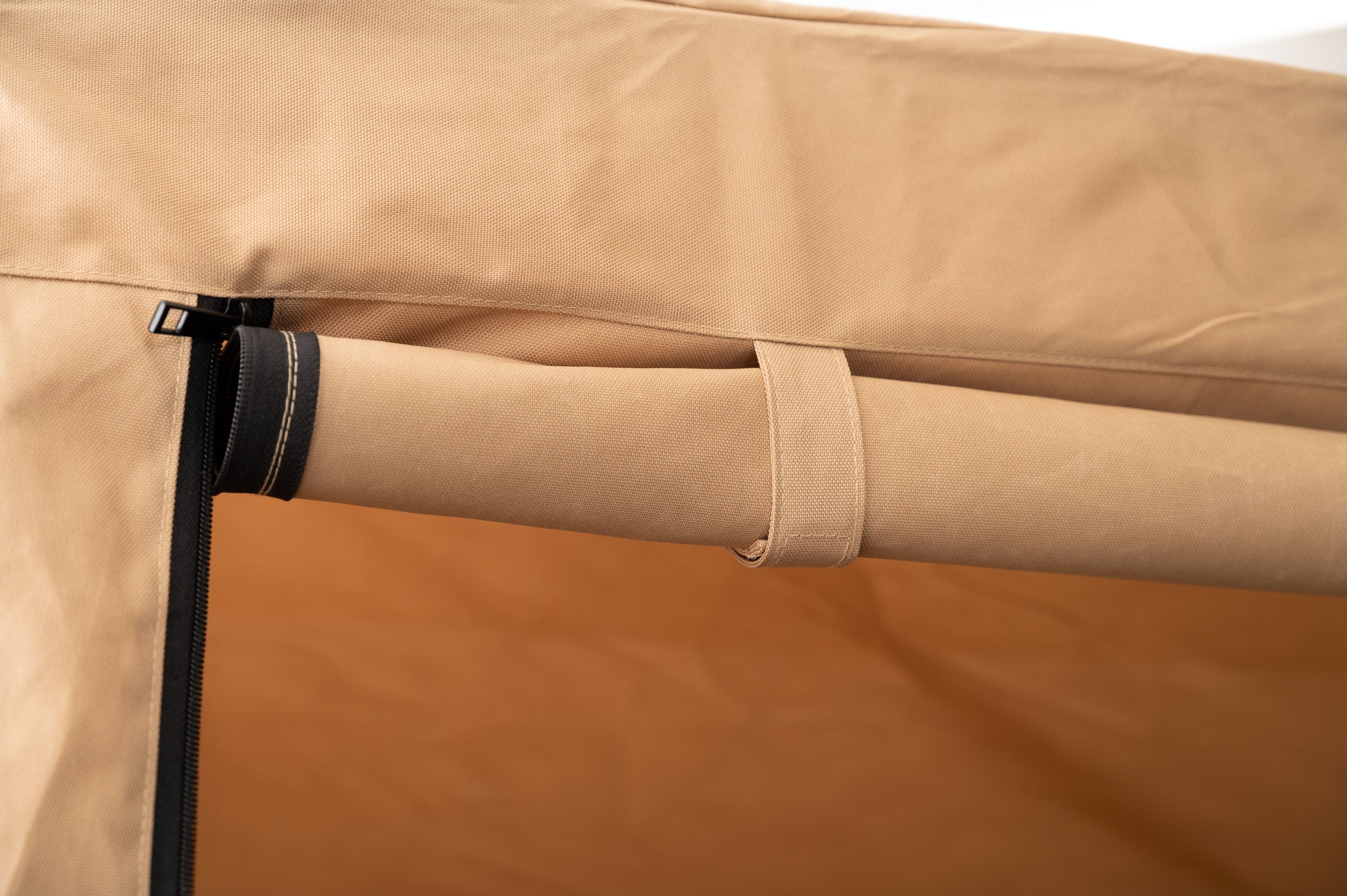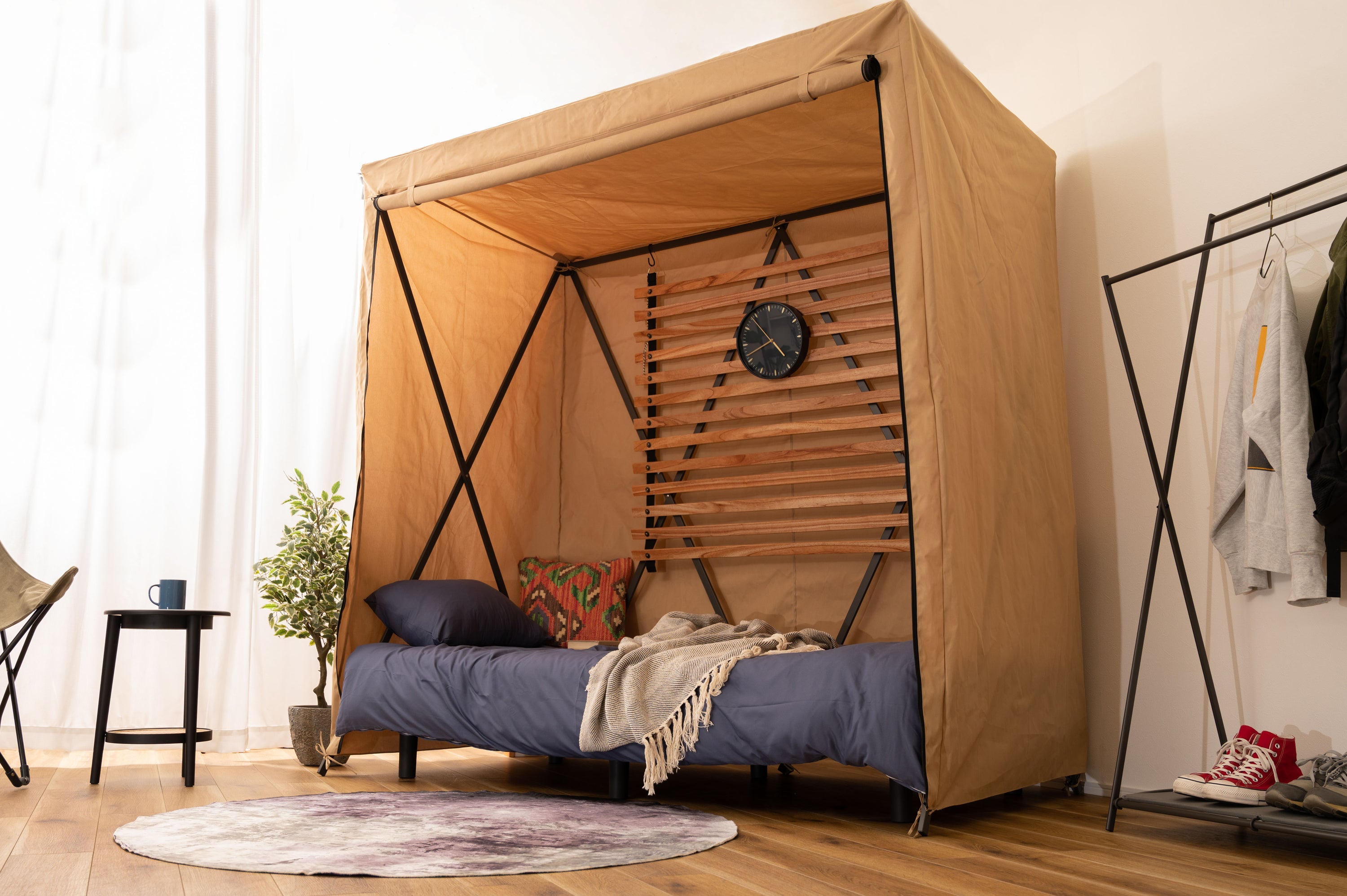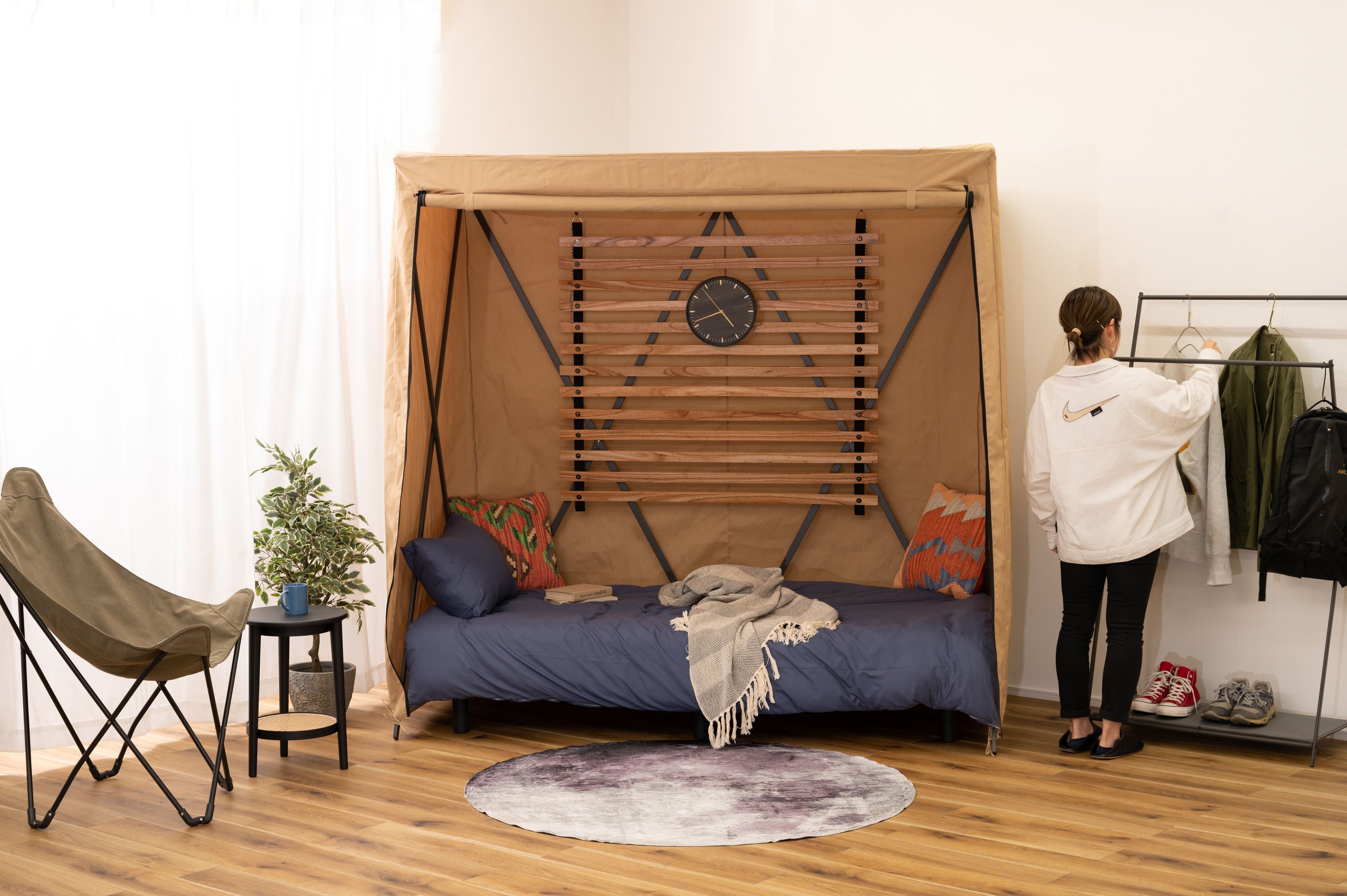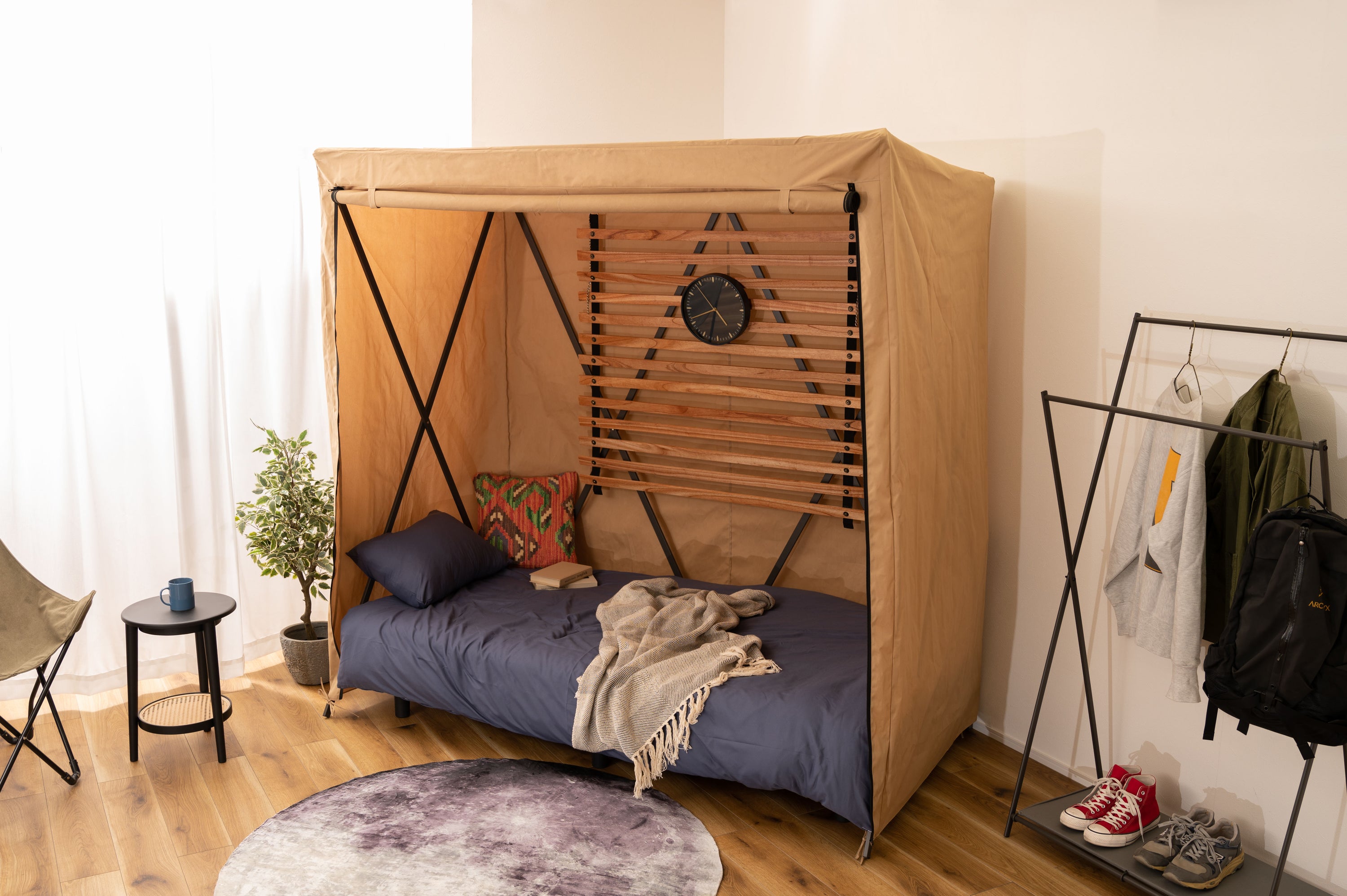 ガレージ、クローゼットや室内に広げて自分だけのプライベート空間として使えるルームテント。使い方によって様々なシーンで活躍してくれるアイテム。簡易ガレージとして自転車や脚立、工具類を収納するスペースに。リビングに設置してデスクやランプを入れて、作業に集中したい時のおこもりスペースとして。ルームテントでベッドを囲い小物でディスプレイをすれば、個性的で落ち着いたベッドルームに。ルームテントの中に収納ラックを置けばクローゼットに早変わり。お店の中に設置して、販売スペースとしてこだわりの商品やおすすめ商品をディスプレイするのにも。折りたためばコンパクトになるので持ち運びにも便利。前面カバーの先端にハトメ・ベルトが付いているので、ロープを通してタープを張る事も出来ます。