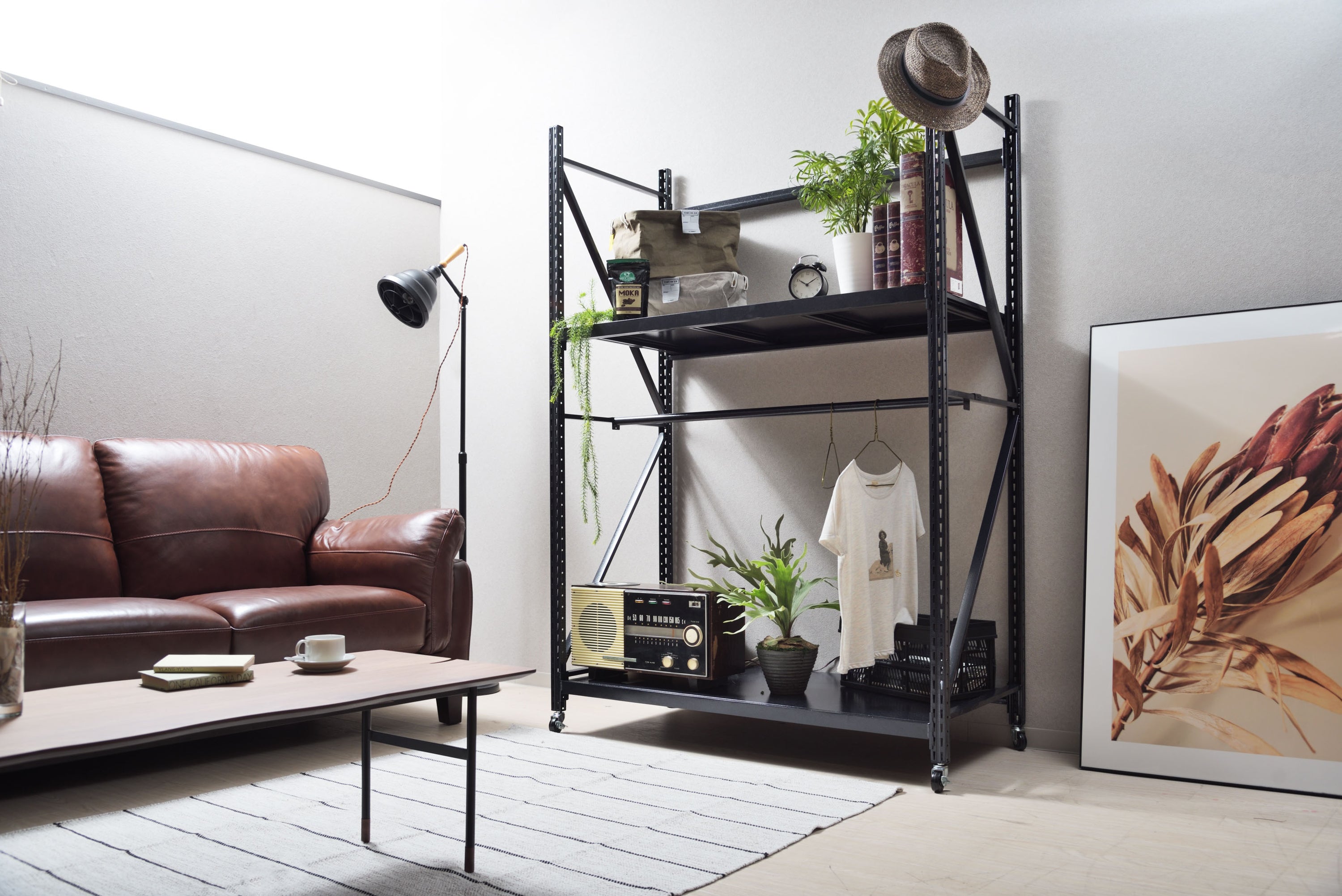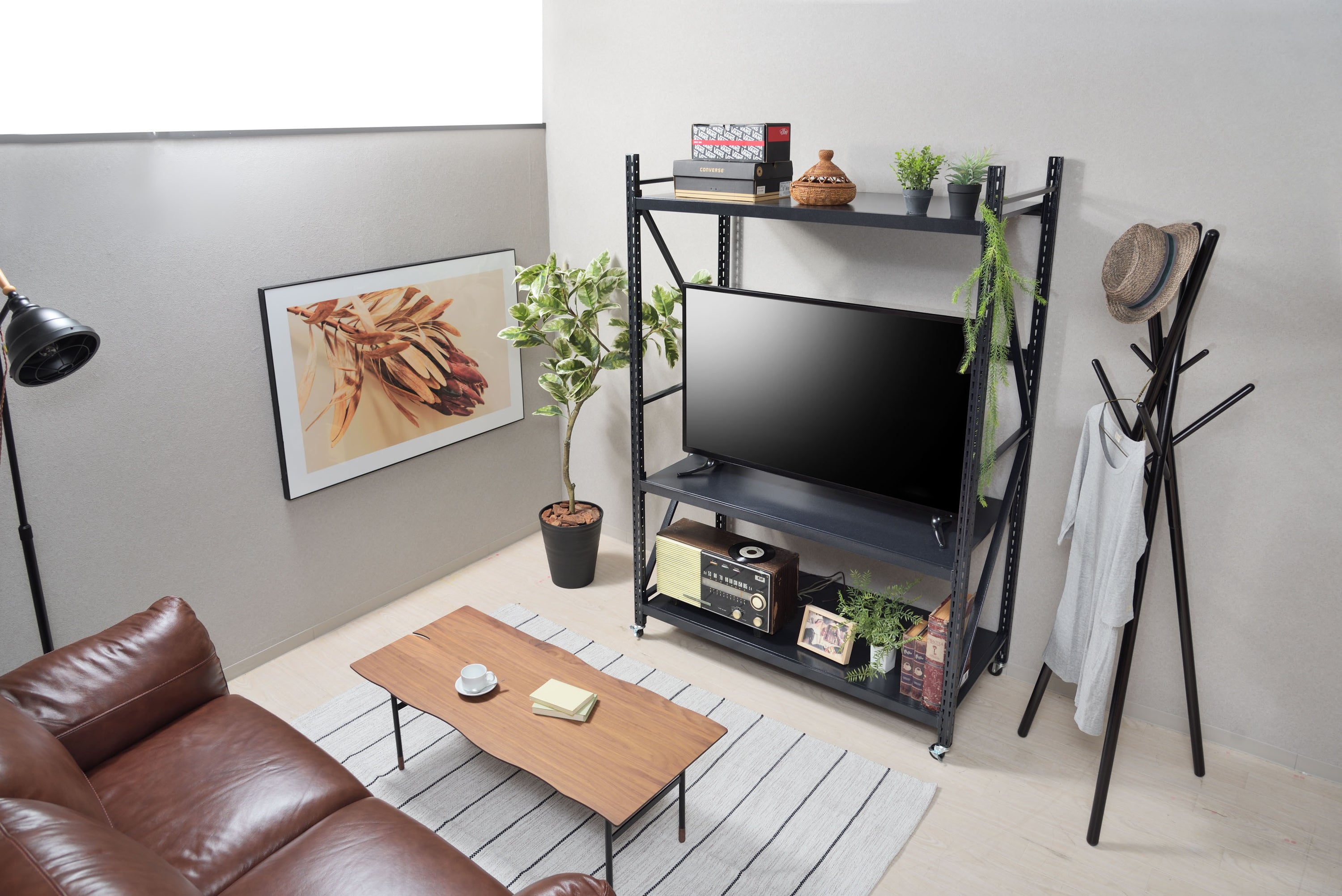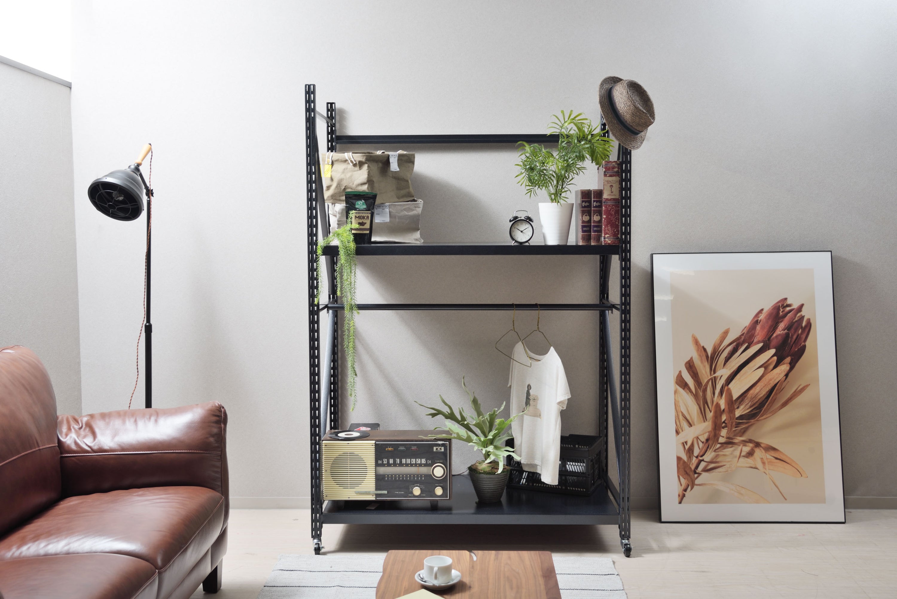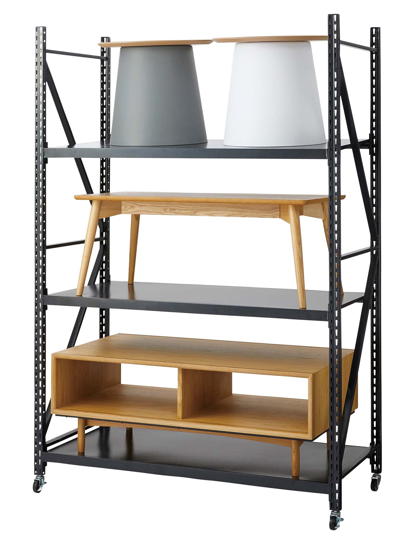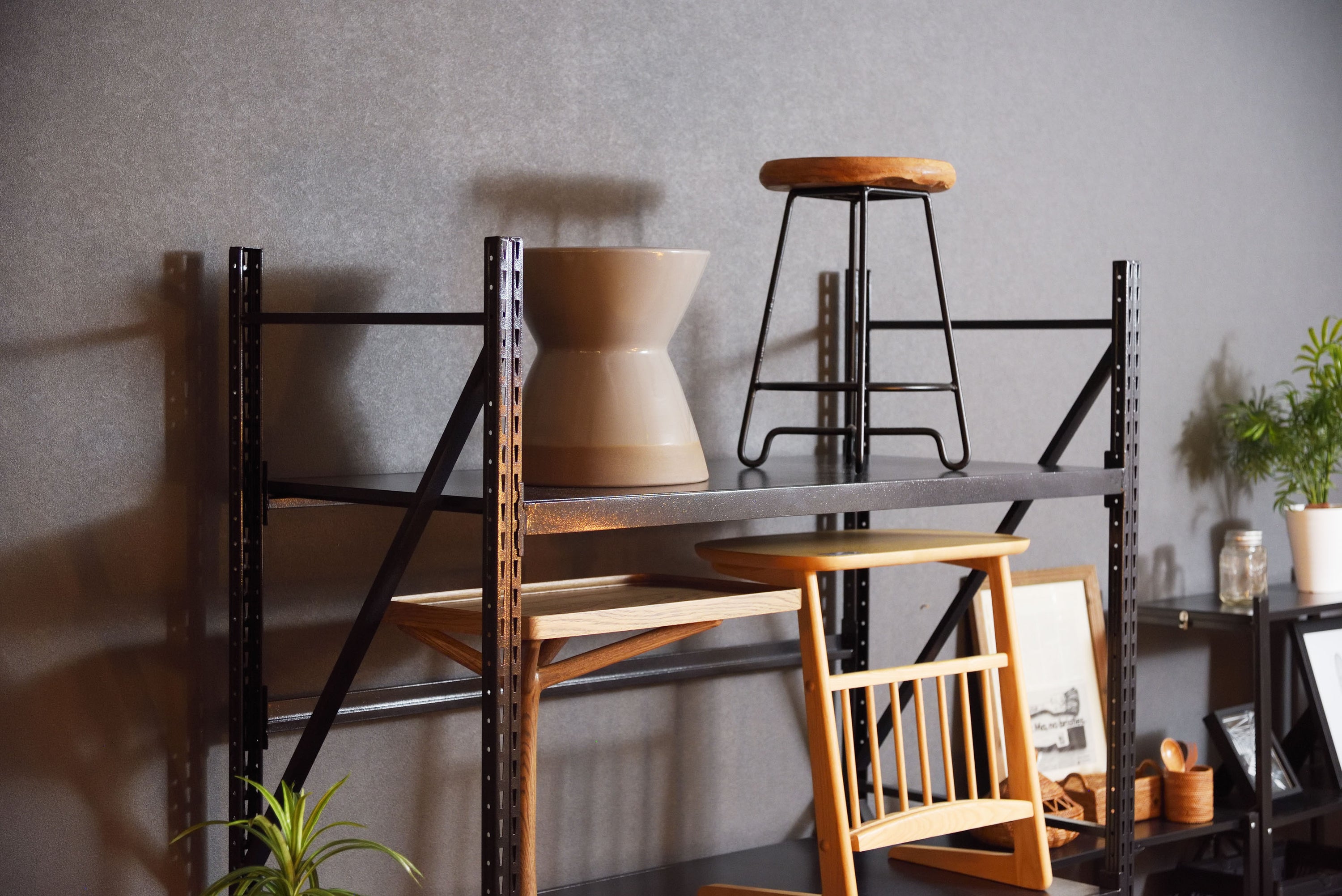 ボルトレスラックの奥行60cmタイプから新色のアイボリーが登場。無骨さを取り入れたシンプルなデザインは使用シーンを選ばず、店舗のディスプレイ用什器はもちろん、収納付きTVラックとしてなど、あらゆる場面でお使いいただけます。従来のボルトレスラック(DIS-683/684)が奥行40.5cmだったのに対し、DIS-685タイプは奥行60cmまで拡大。イスなどの幅の広い物でも余裕をもって配置できるようになったので、家具や雑貨を扱うお店の陳列棚としても活躍。