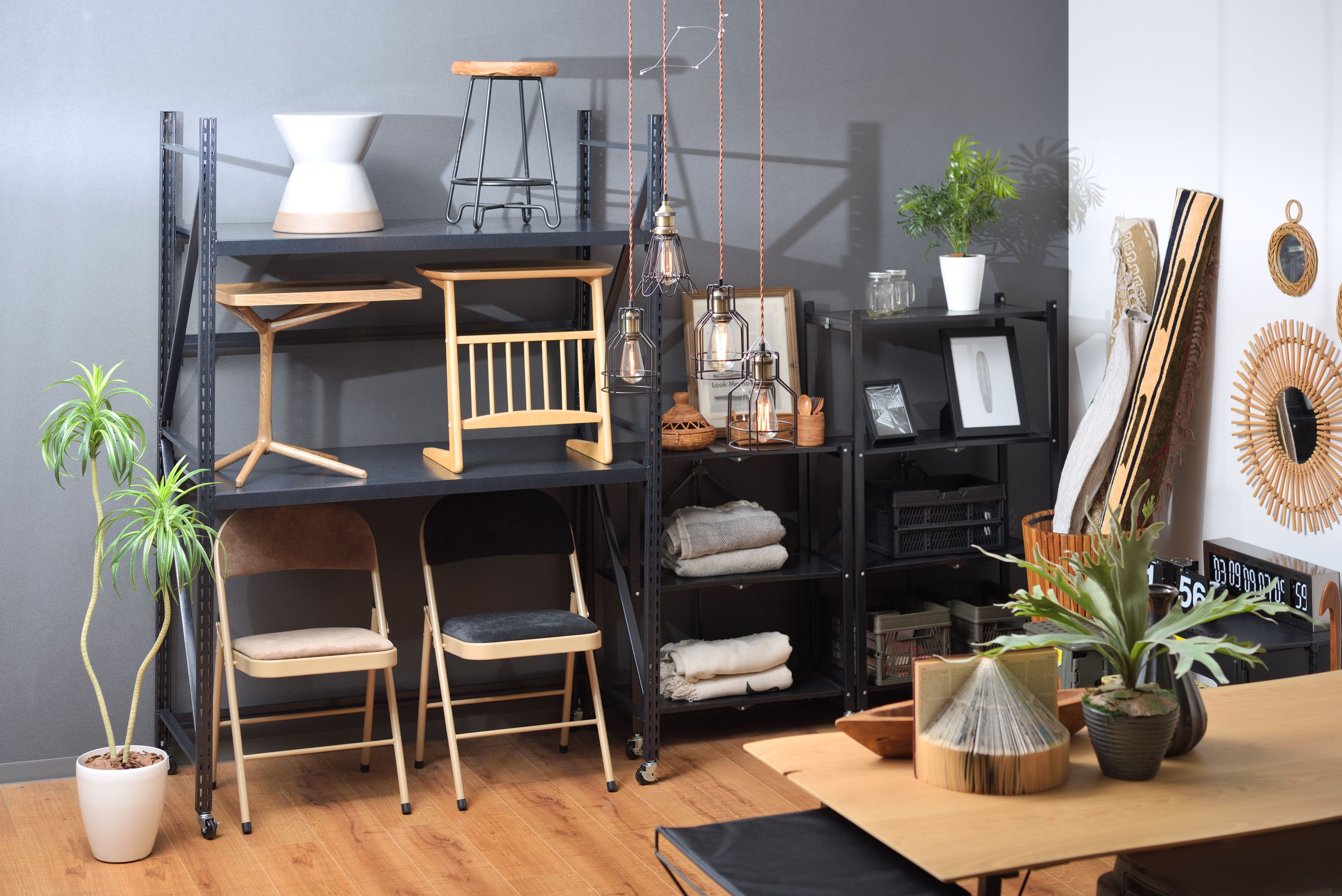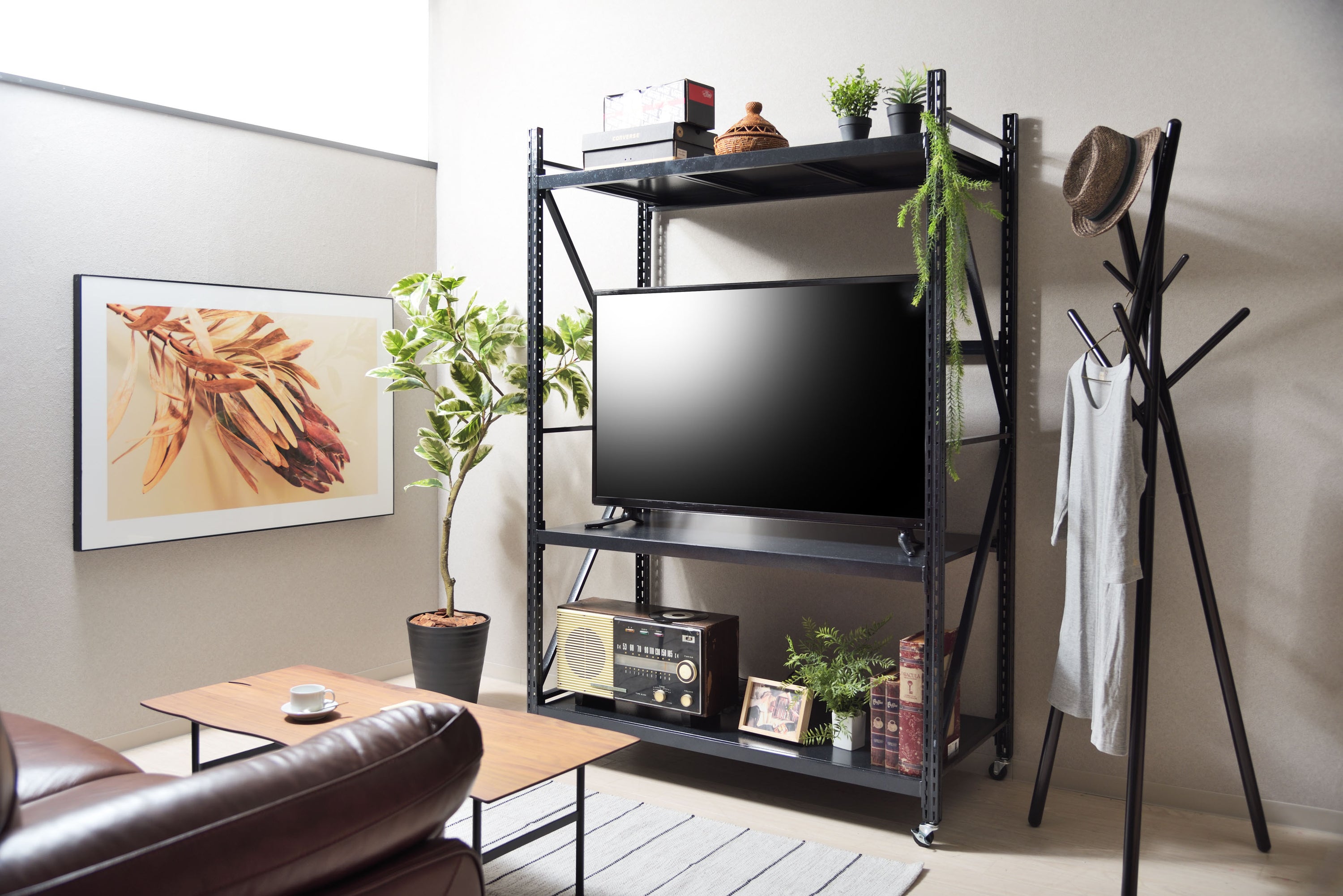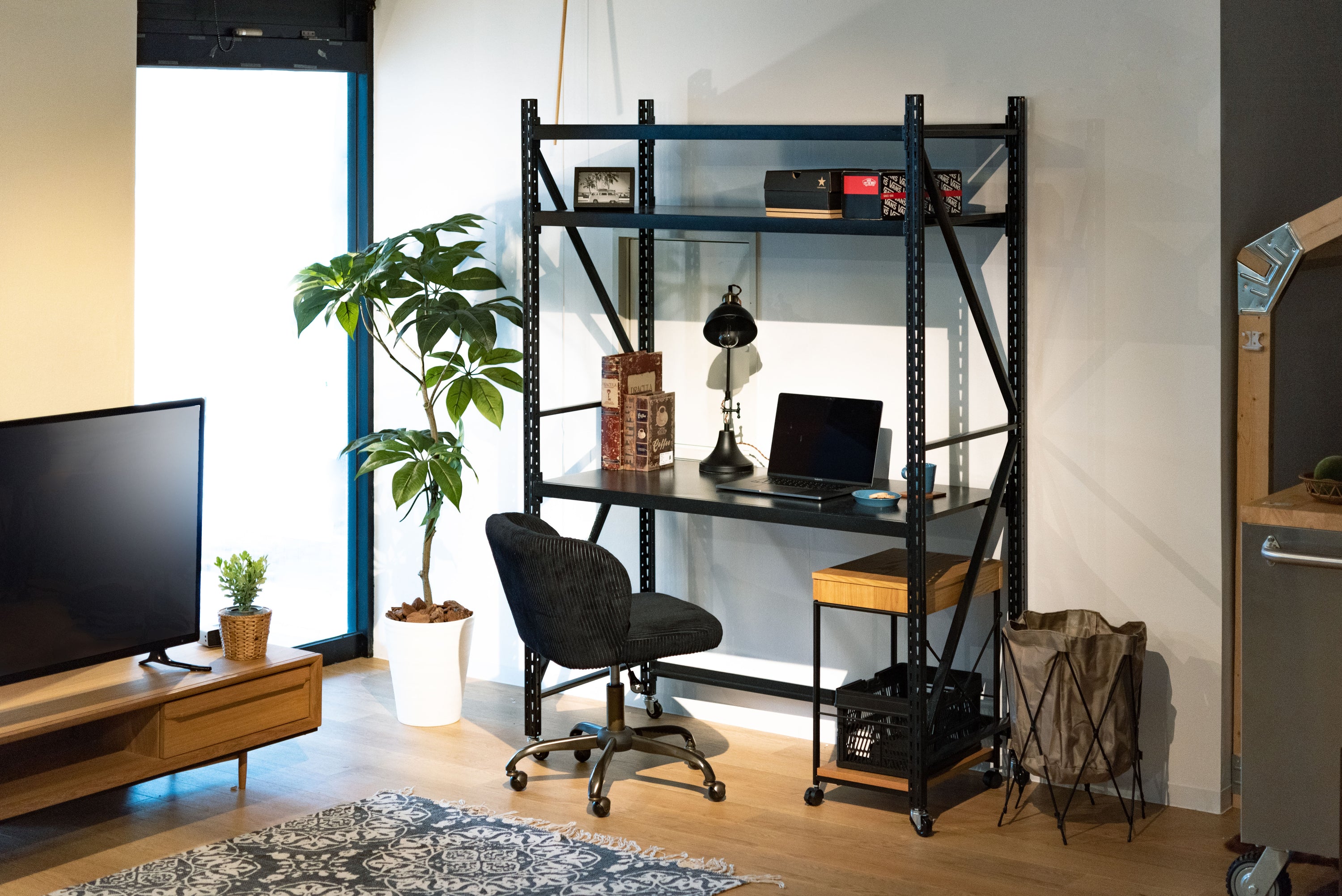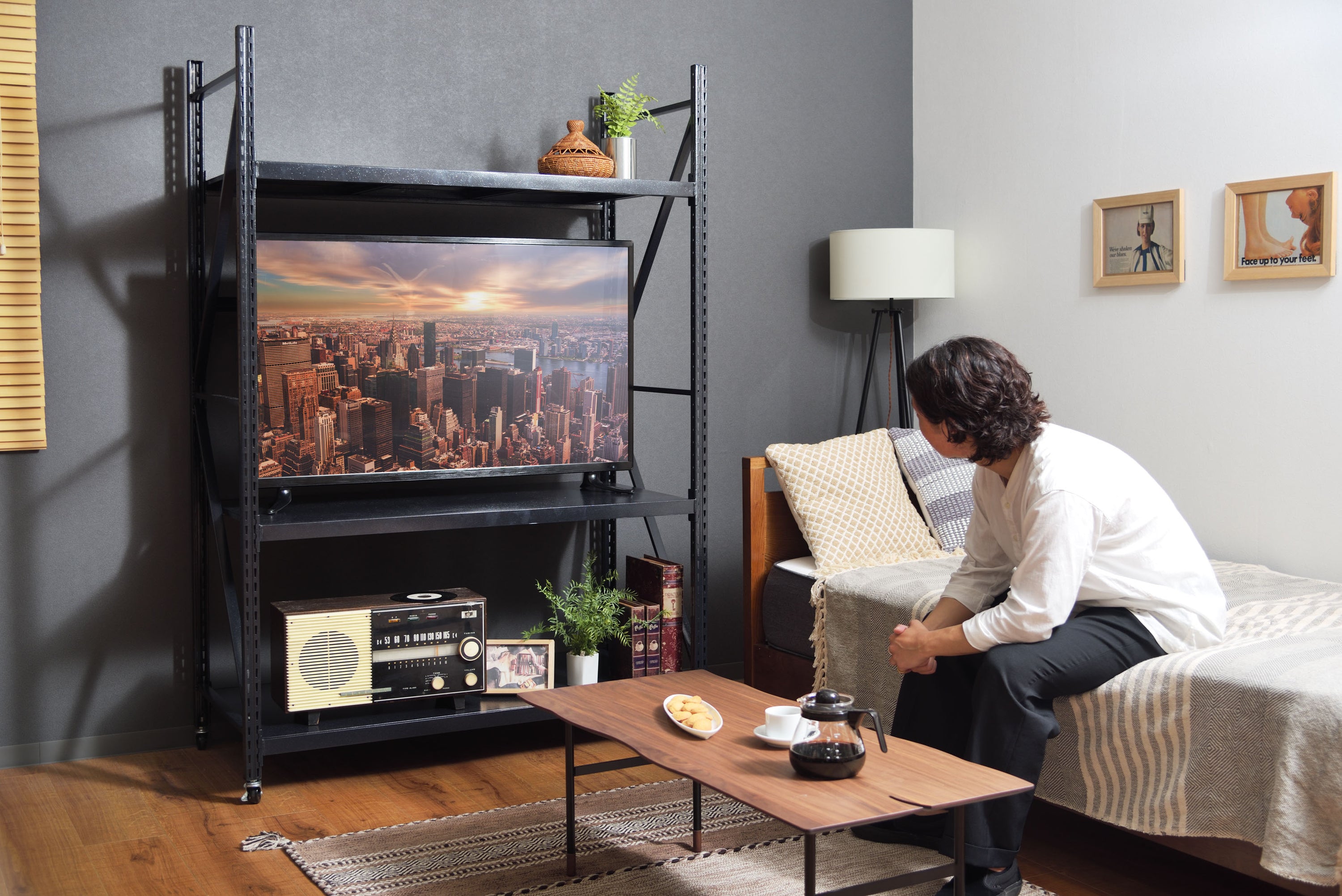 ボルトレスラックの奥行60cmタイプから新色のアイボリーが登場。無骨さを取り入れたシンプルなデザインは使用シーンを選ばず、店舗のディスプレイ用什器はもちろん、収納付きTVラックとしてなど、あらゆる場面でお使いいただけます。従来のボルトレスラック(DIS-683/684)が奥行40.5cmだったのに対し、DIS-685タイプは奥行60cmまで拡大。イスなどの幅の広い物でも余裕をもって配置できるようになったので、家具や雑貨を扱うお店の陳列棚としても活躍。