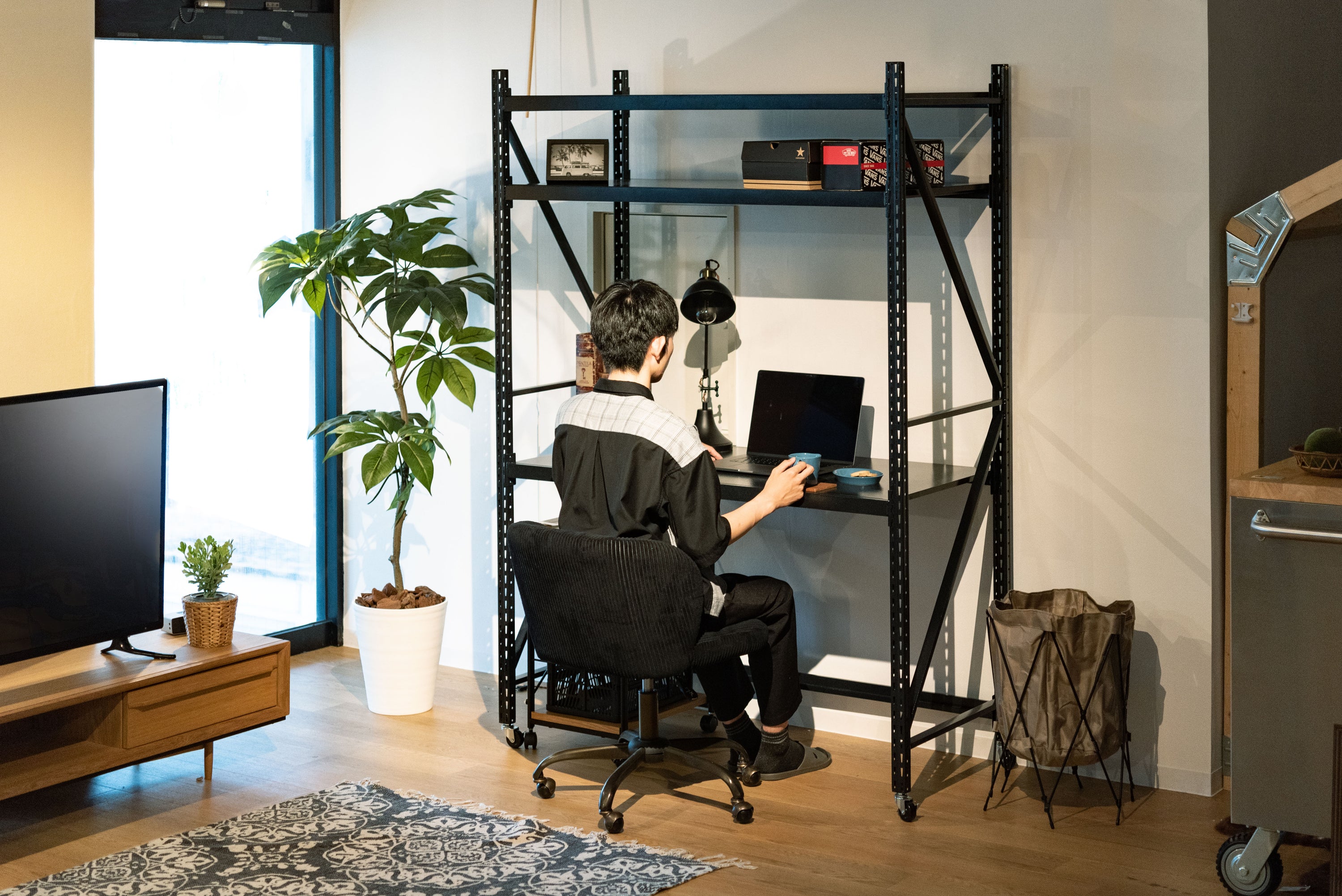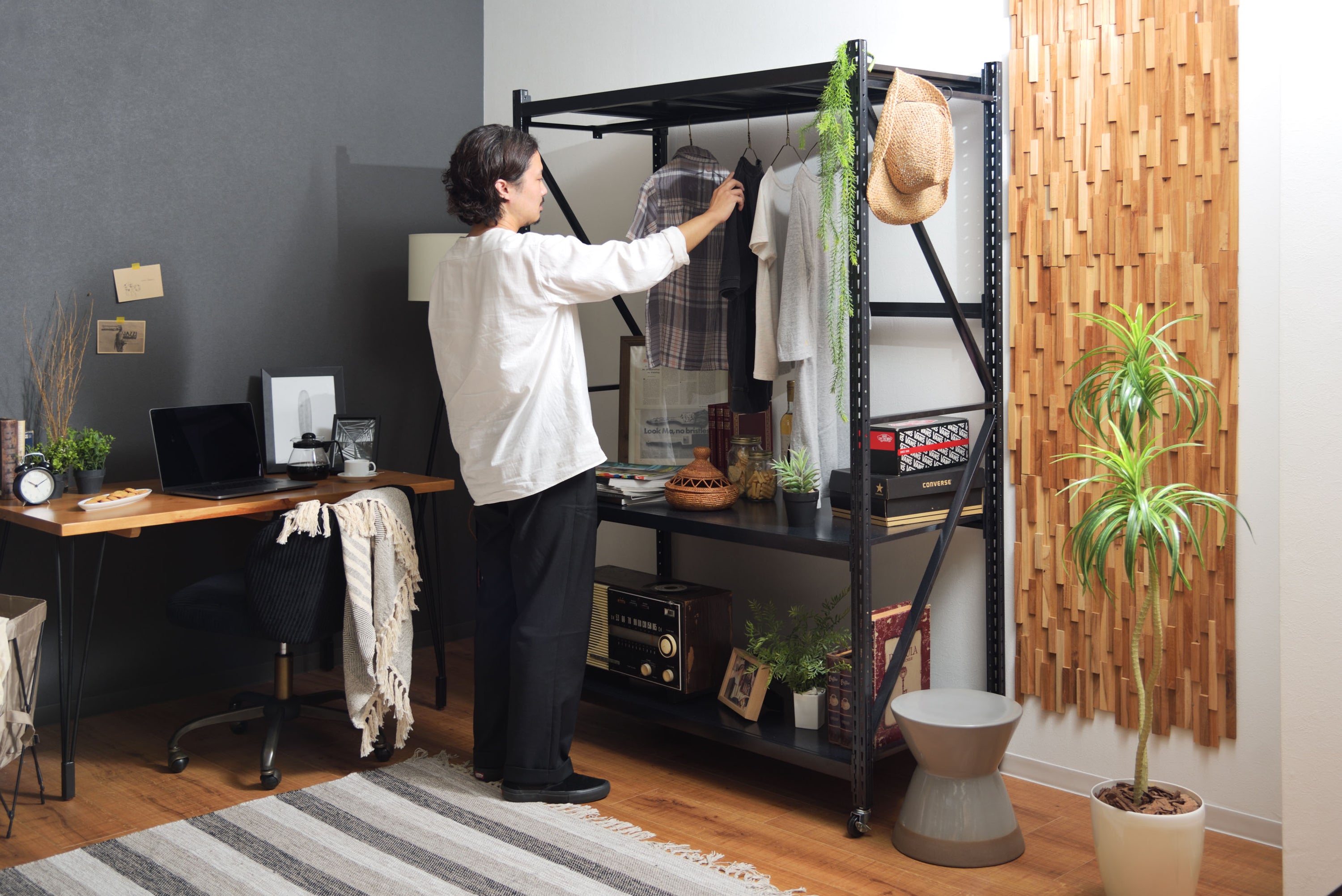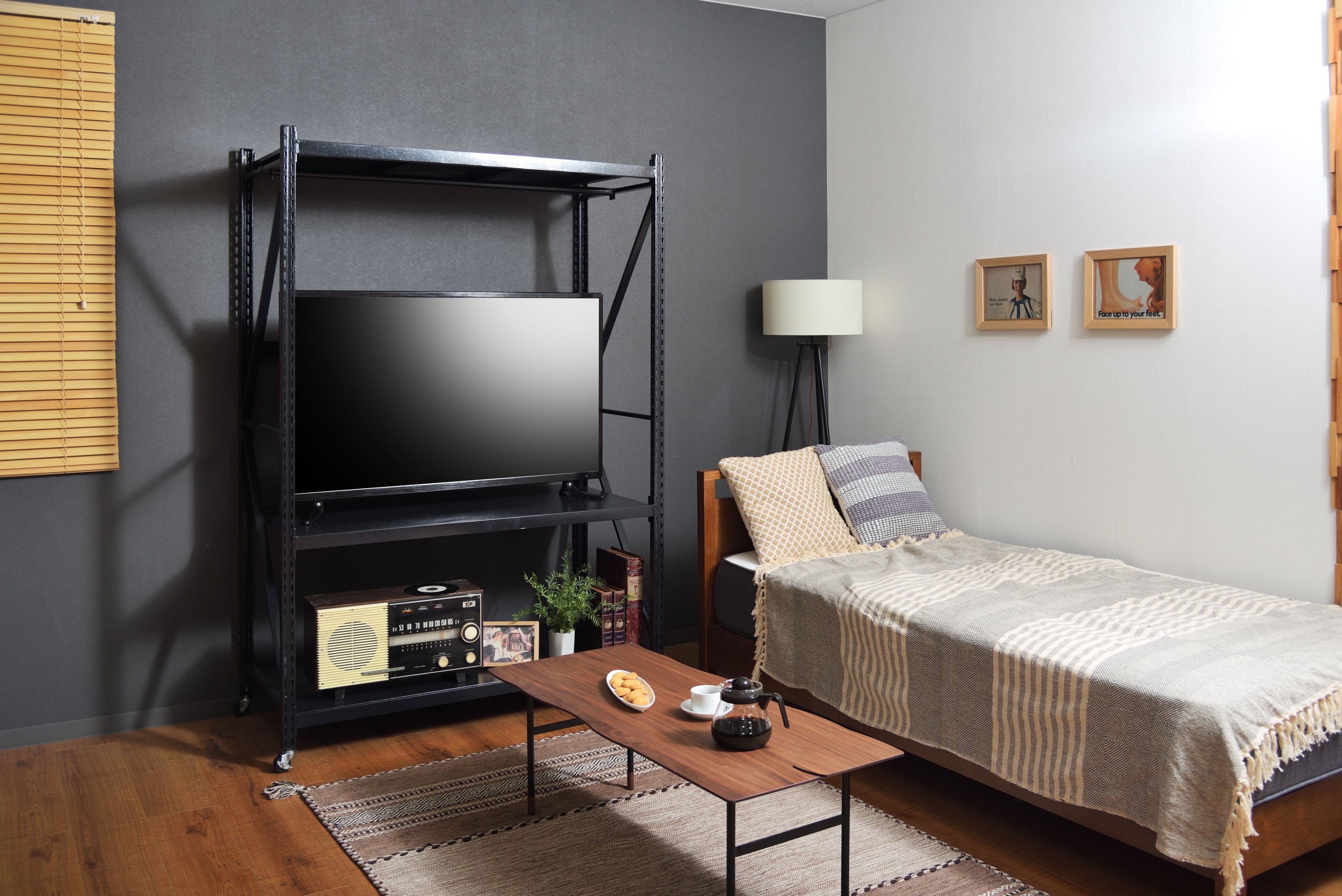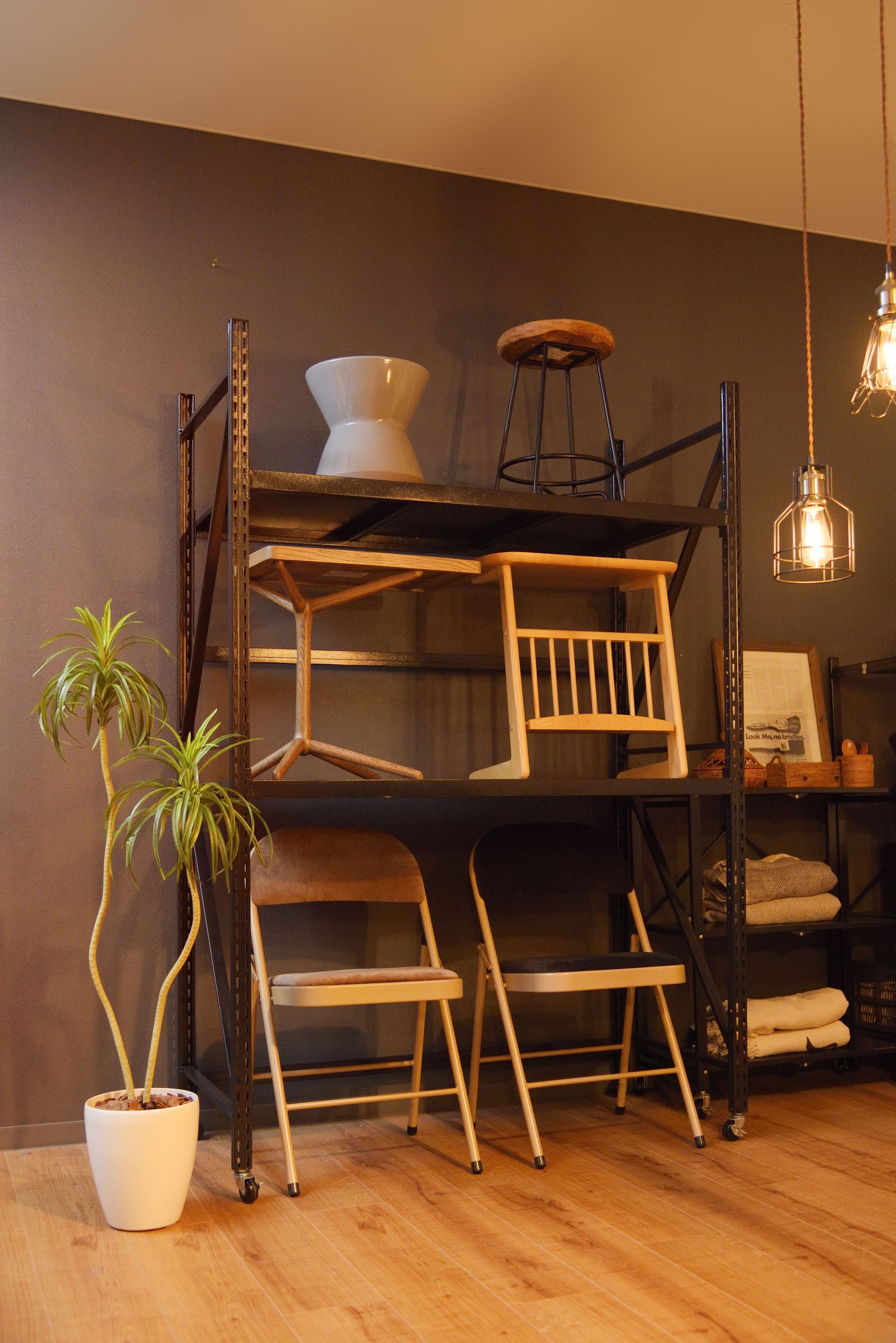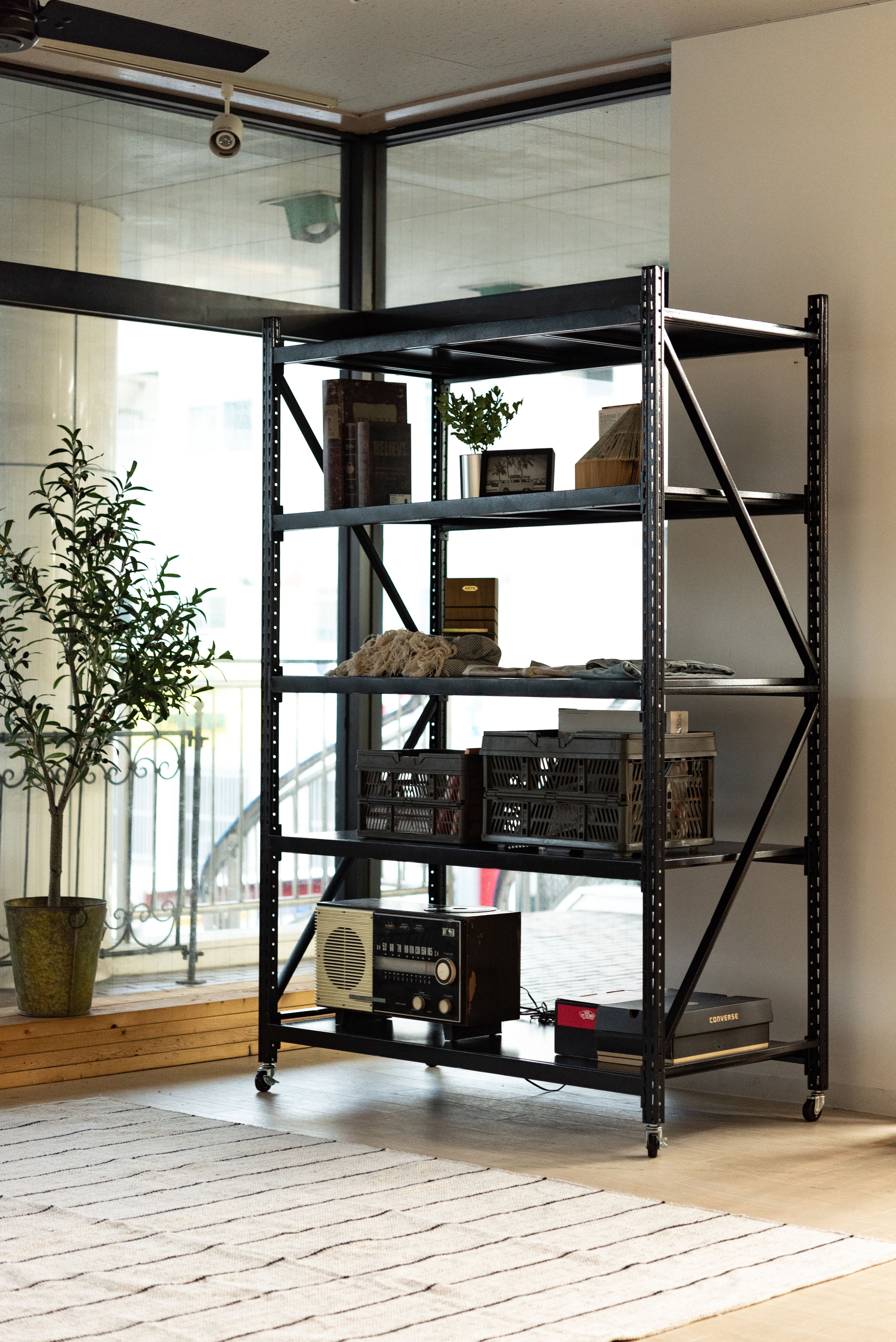 ボルトレスラックの奥行60cmタイプから新色のアイボリーが登場。無骨さを取り入れたシンプルなデザインは使用シーンを選ばず、店舗のディスプレイ用什器はもちろん、収納付きTVラックとしてなど、あらゆる場面でお使いいただけます。従来のボルトレスラック(DIS-683/684)が奥行40.5cmだったのに対し、DIS-685タイプは奥行60cmまで拡大。イスなどの幅の広い物でも余裕をもって配置できるようになったので、家具や雑貨を扱うお店の陳列棚としても活躍。