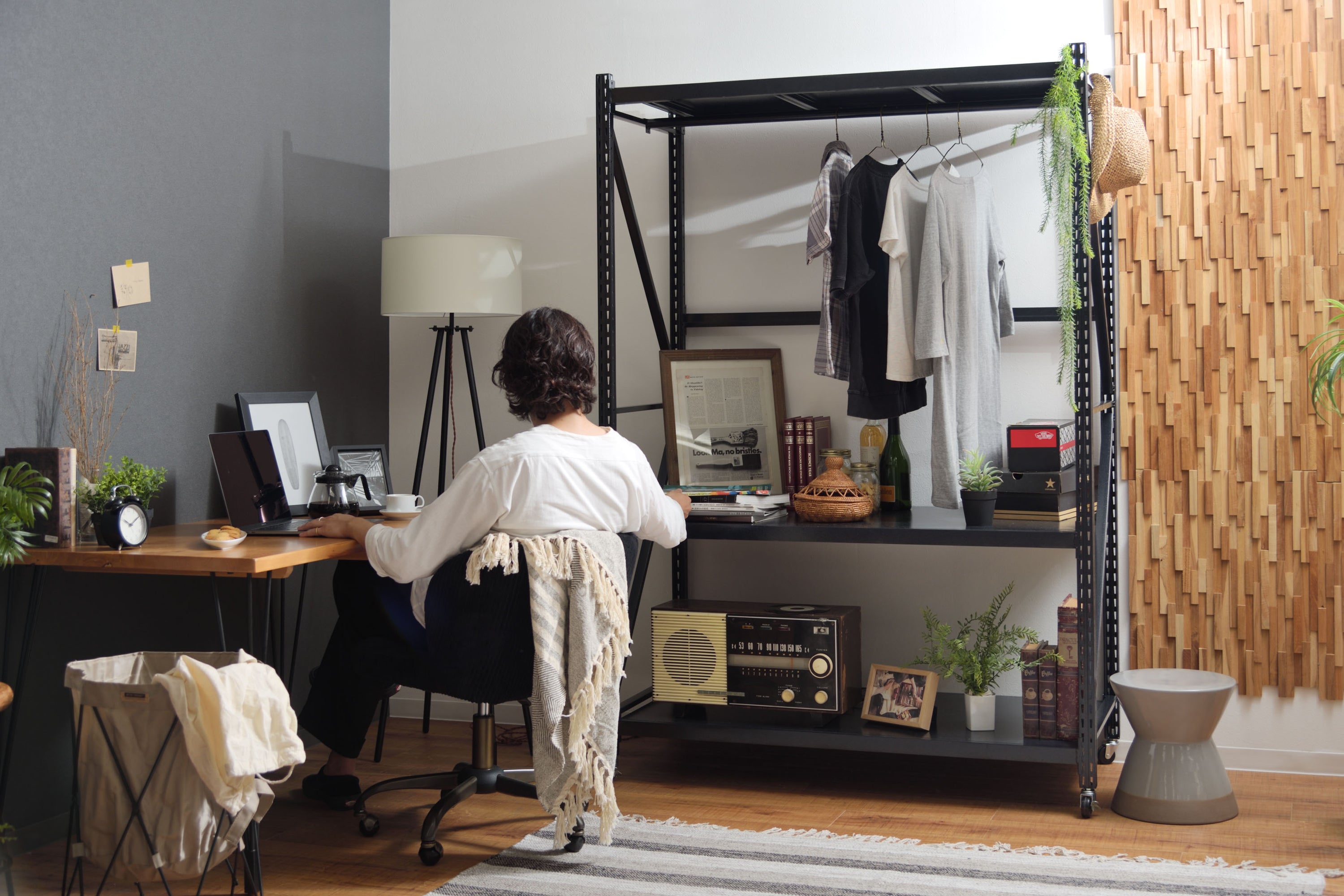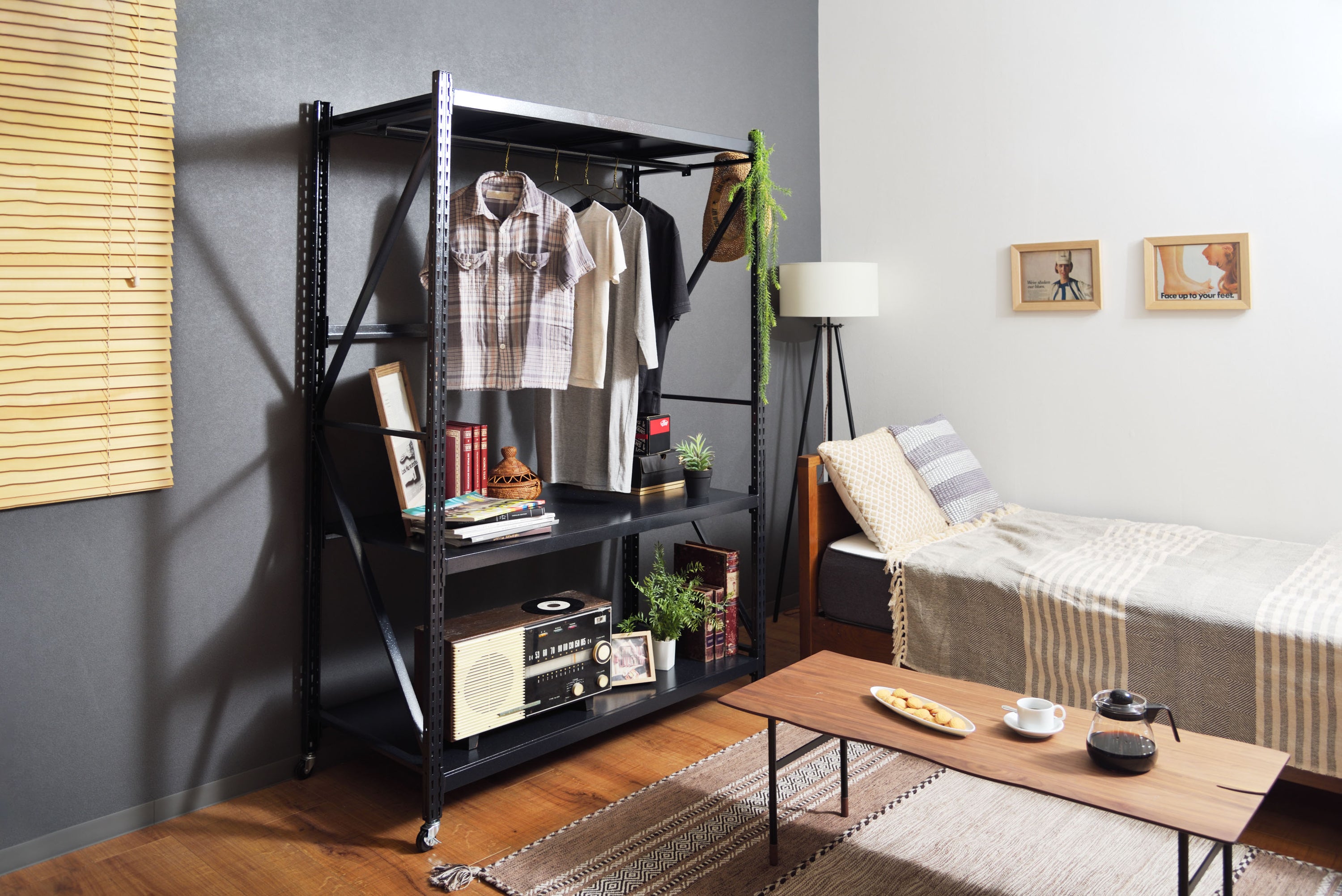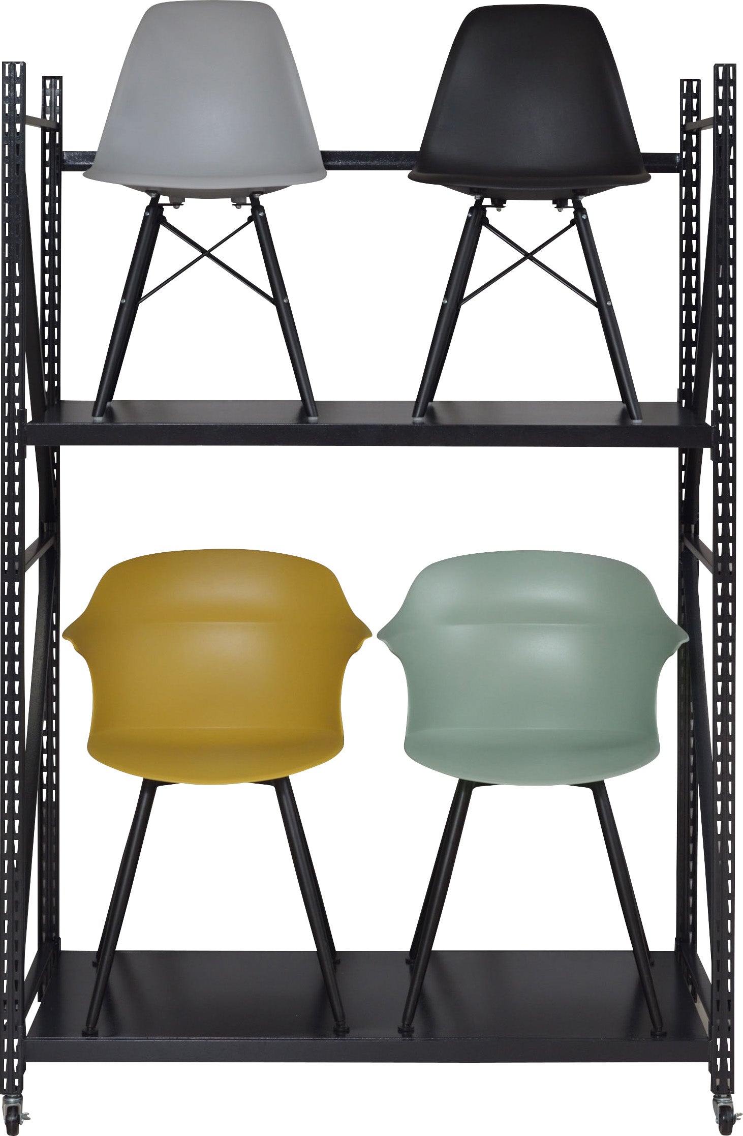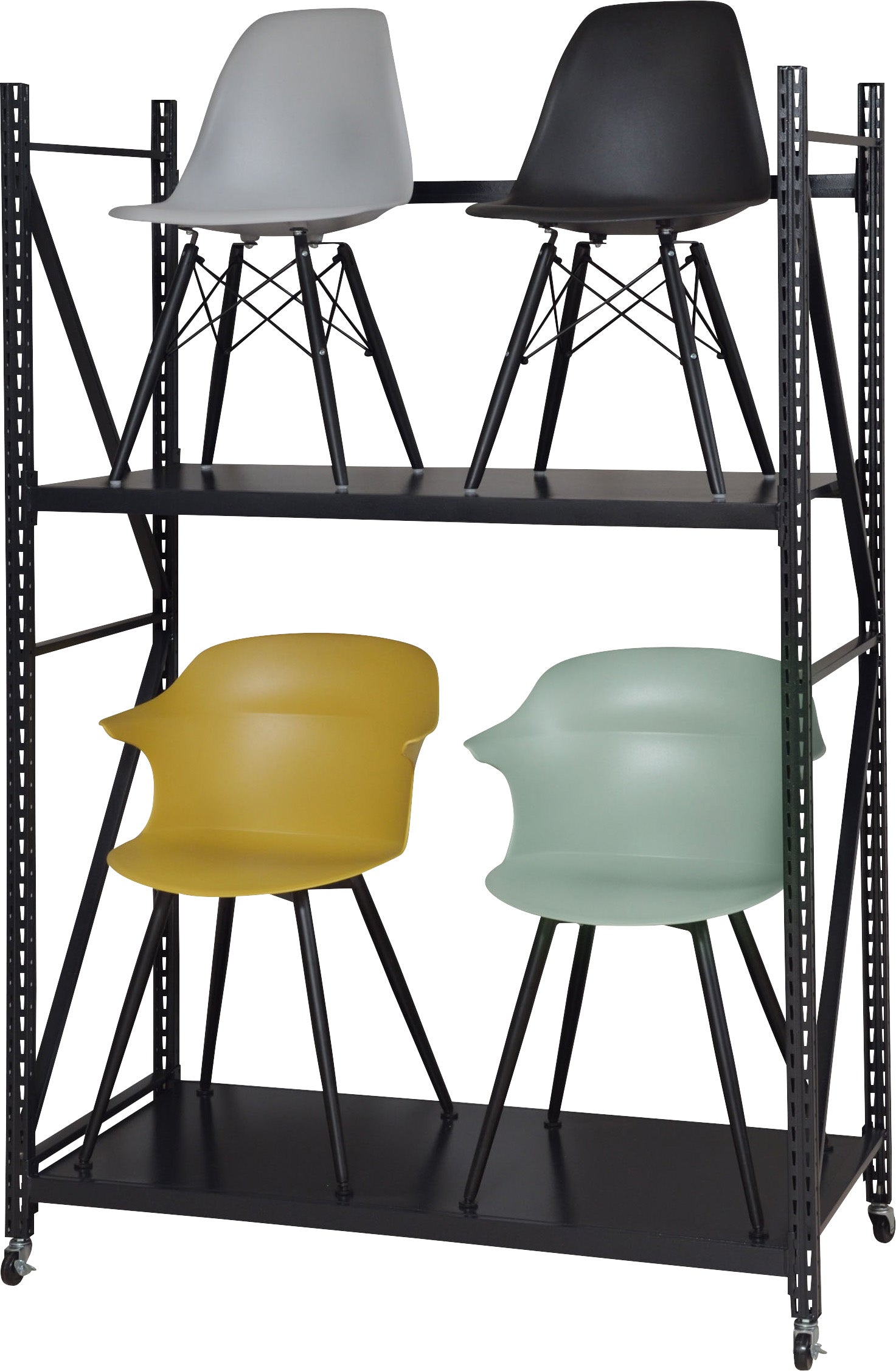 ボルトレスラックの奥行60cmタイプから新色のアイボリーが登場。無骨さを取り入れたシンプルなデザインは使用シーンを選ばず、店舗のディスプレイ用什器はもちろん、収納付きTVラックとしてなど、あらゆる場面でお使いいただけます。従来のボルトレスラック(DIS-683/684)が奥行40.5cmだったのに対し、DIS-685タイプは奥行60cmまで拡大。イスなどの幅の広い物でも余裕をもって配置できるようになったので、家具や雑貨を扱うお店の陳列棚としても活躍。