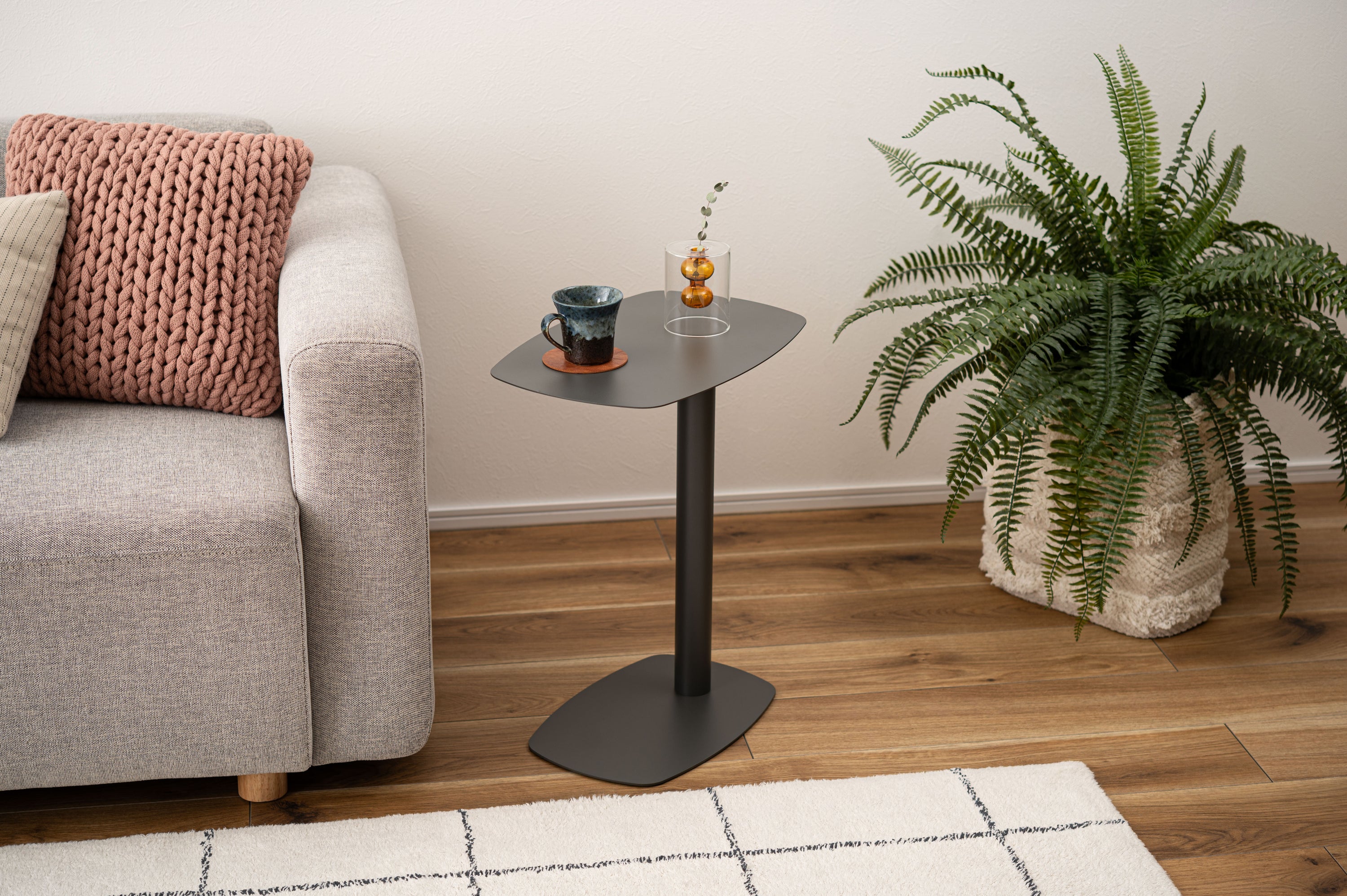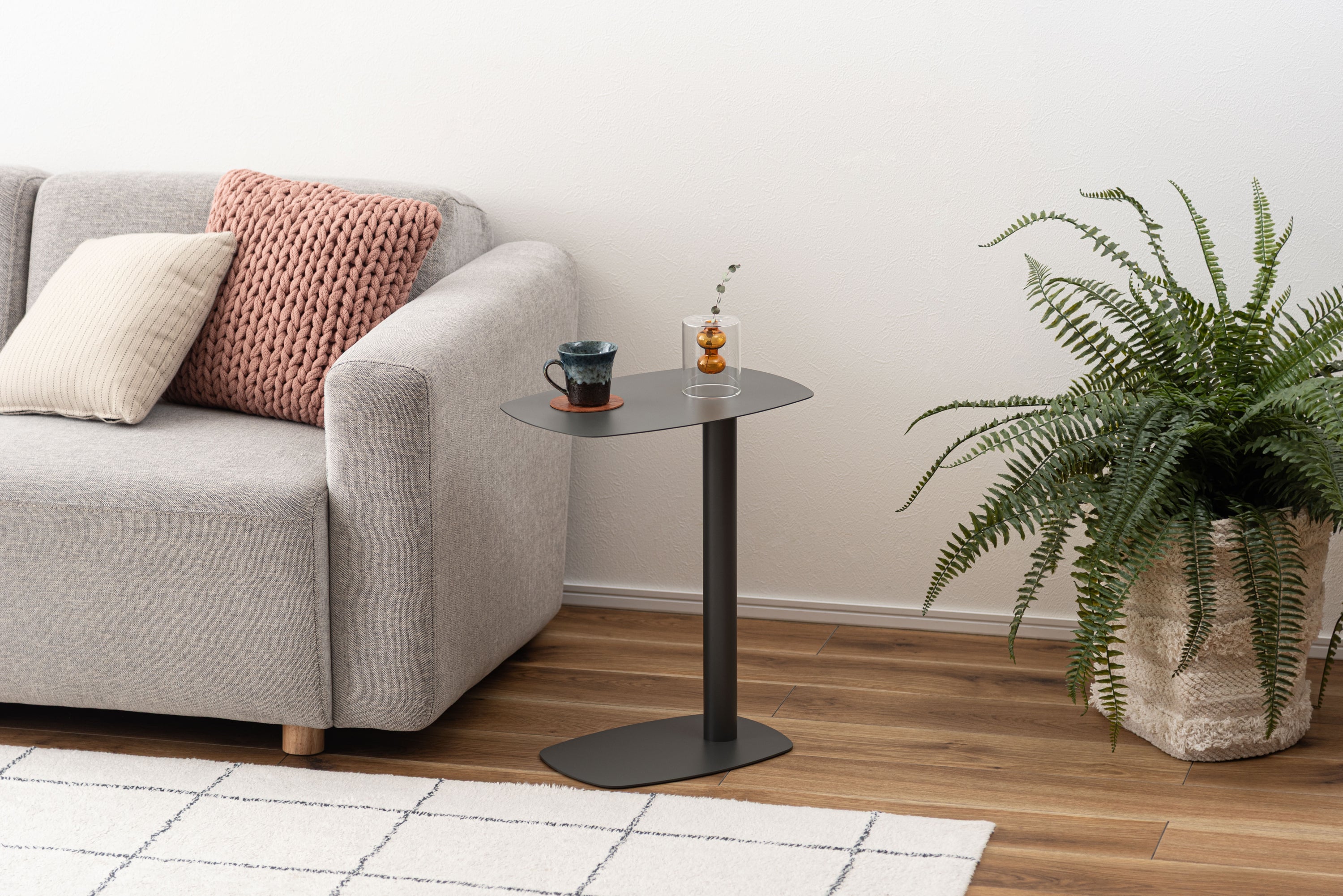 スタイリッシュな印象を与えるマットな質感。アシンメトリーなデザインが美しいサイドテーブル。幅28cmとスリムな設計のため、場所を取らず様々な場所で活躍。無駄のないシンプルなデザインが、モダンでスタイリッシュな印象を与えてくれます。さらりとしたマットな質感と特徴的なカラーリングが目を引き空間を華やかに。すっきりと魅せる一本脚デザイン。平らな台座なので、ソファやベッド下の狭いスペースに差し込んで使用可能。光沢を抑えたさらりとしたマットな質感。汚れてしまっても簡単に拭き取ることができ清潔な状態を保てます。脚裏にはフェルトが付いており床へのダメージを抑えてくれます。