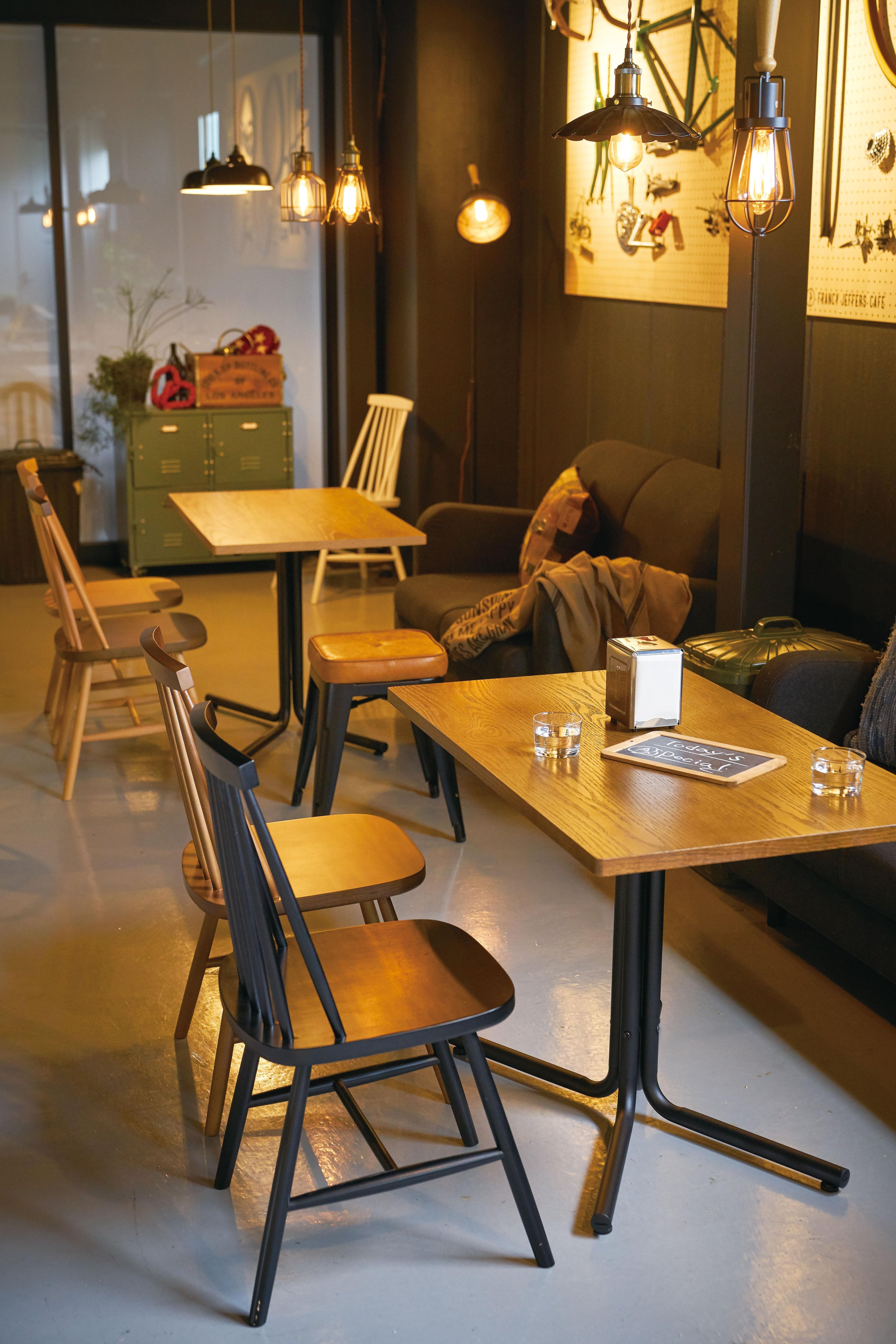 シンプルなデザインのカフェテーブル 間取りに合わせて選べる形3タイプに、テイストに合わせて選べる2カラーを用意。 十字脚を使用し、スッキリとした印象に。椅子への座りやすさもポイントです。