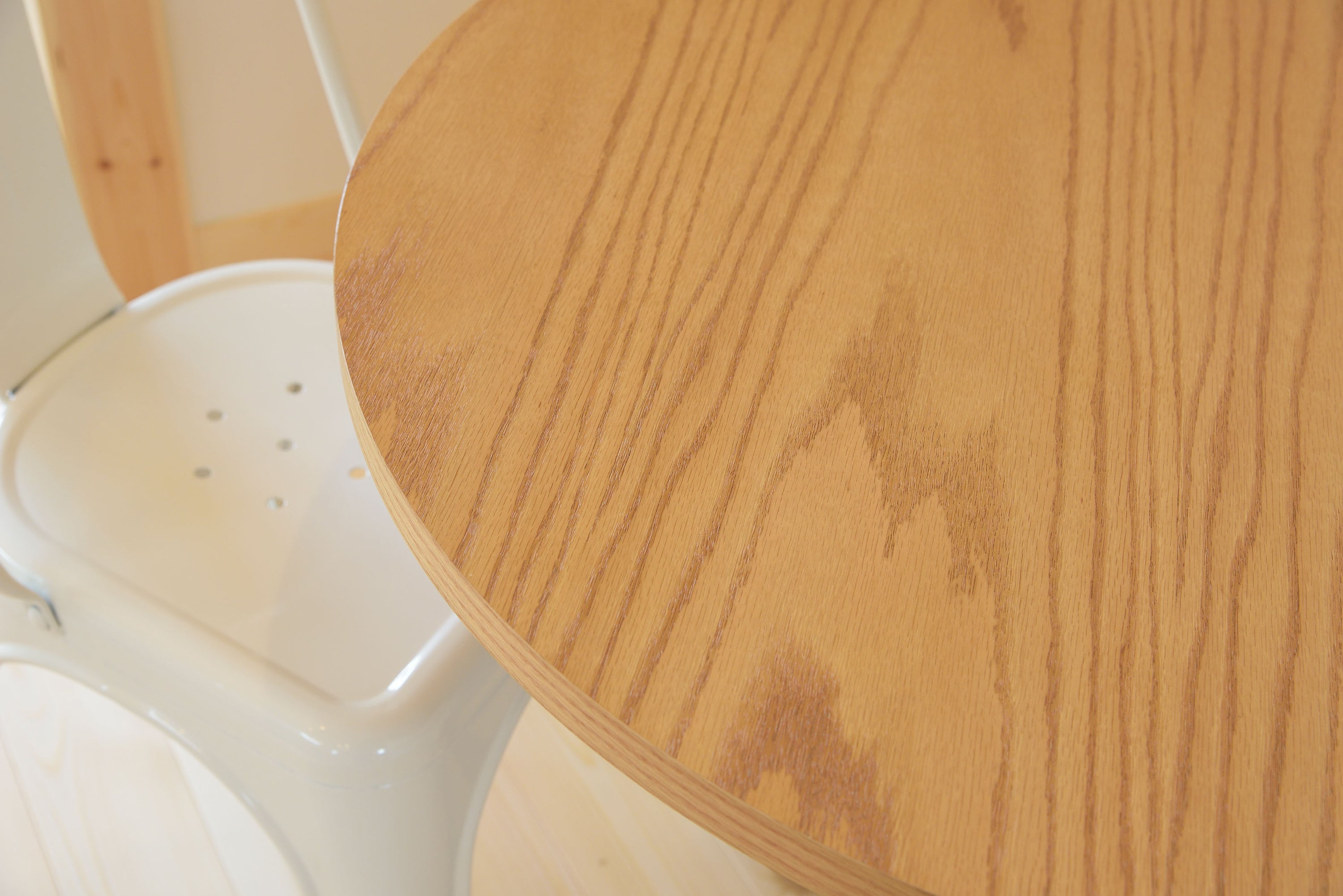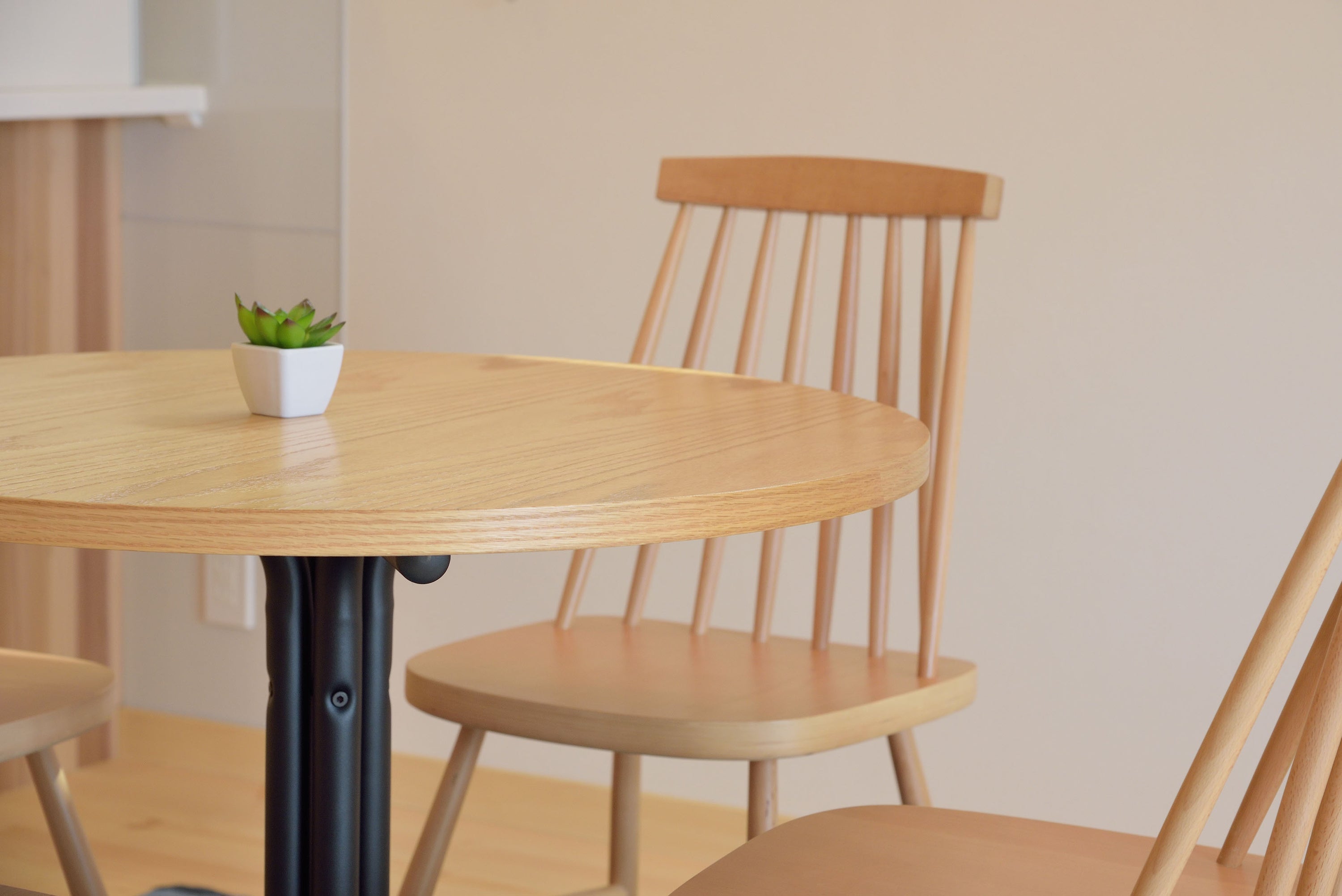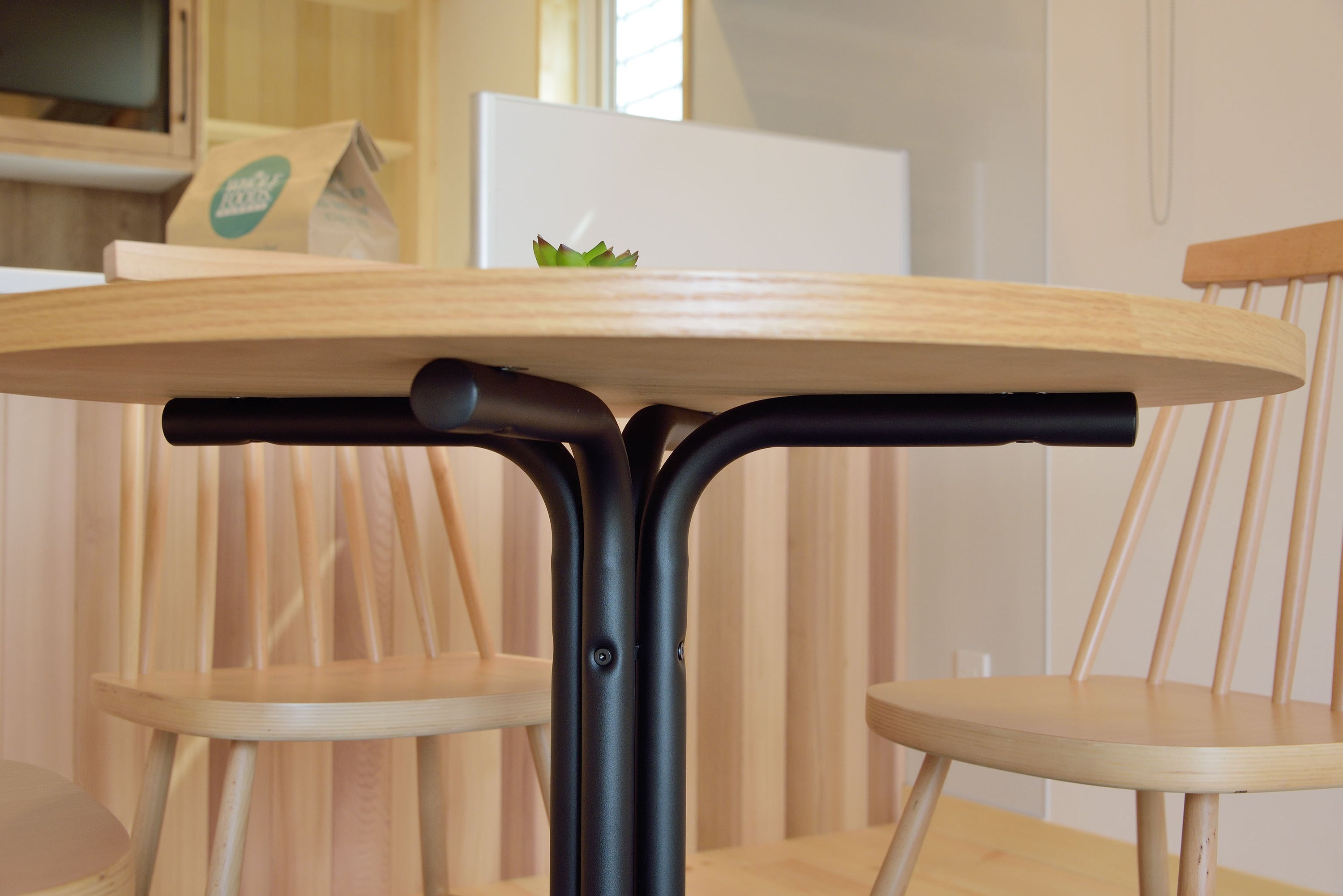 シンプルなデザインのカフェテーブル 間取りに合わせて選べる形3タイプに、テイストに合わせて選べる2カラーを用意。 十字脚を使用し、スッキリとした印象に。椅子への座りやすさもポイントです。