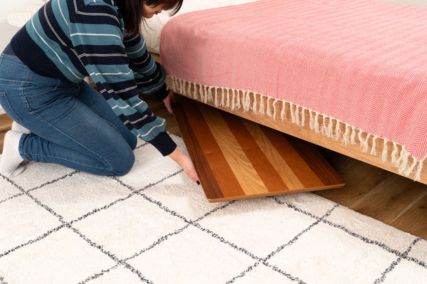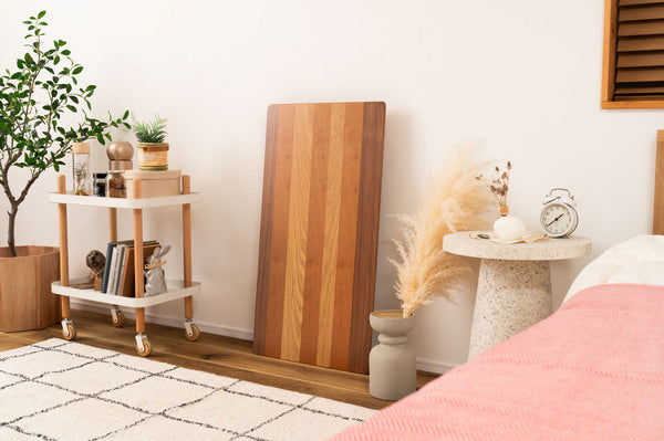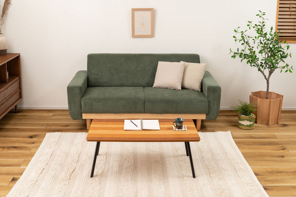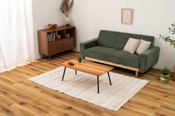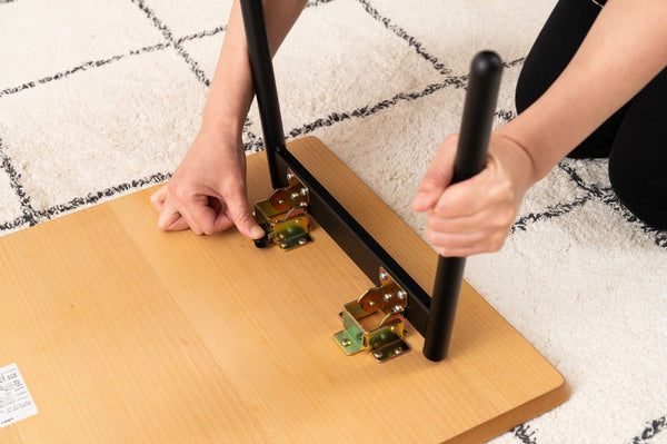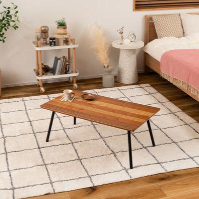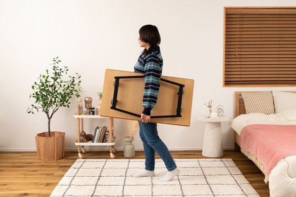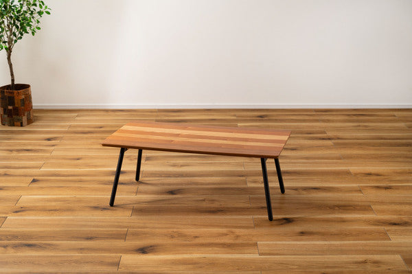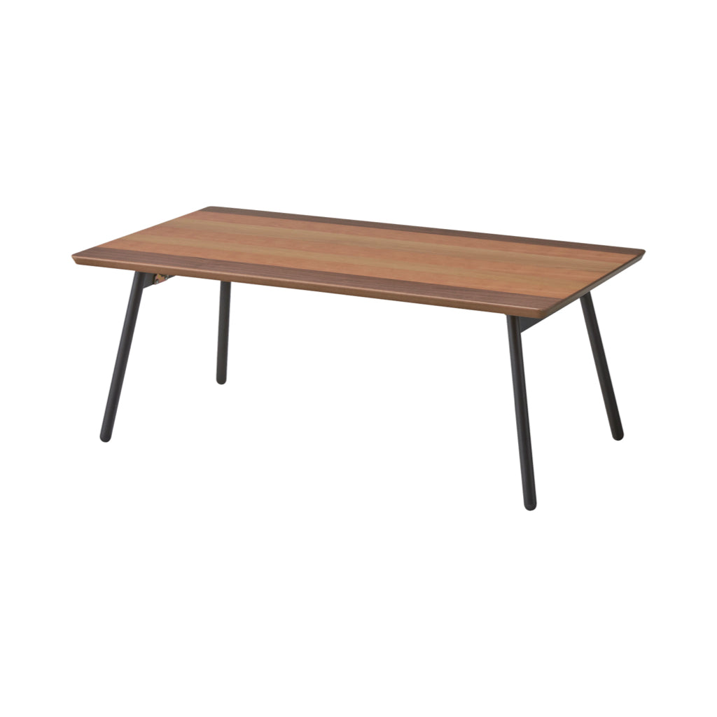 天板に天然木(突板)のウォルナット、オーク、チェリーを使用した、グラデーションが美しいフォールディングテーブル。幅90×奥行48cmサイズなので、2人掛けソファに調度良いサイズ感。フォールディング(折りたたみ脚)タイプなので、使わない時はソファの下やクローゼットの中などに収納できる薄さ。脚を折りたたむ時は、金具についているストッパーフックを上から押し込み、脚を内側へ折りたたむだけの簡単仕様。スチール脚はツヤを抑えた落ち着いた仕上がり。脚先には保護キャップ付き。