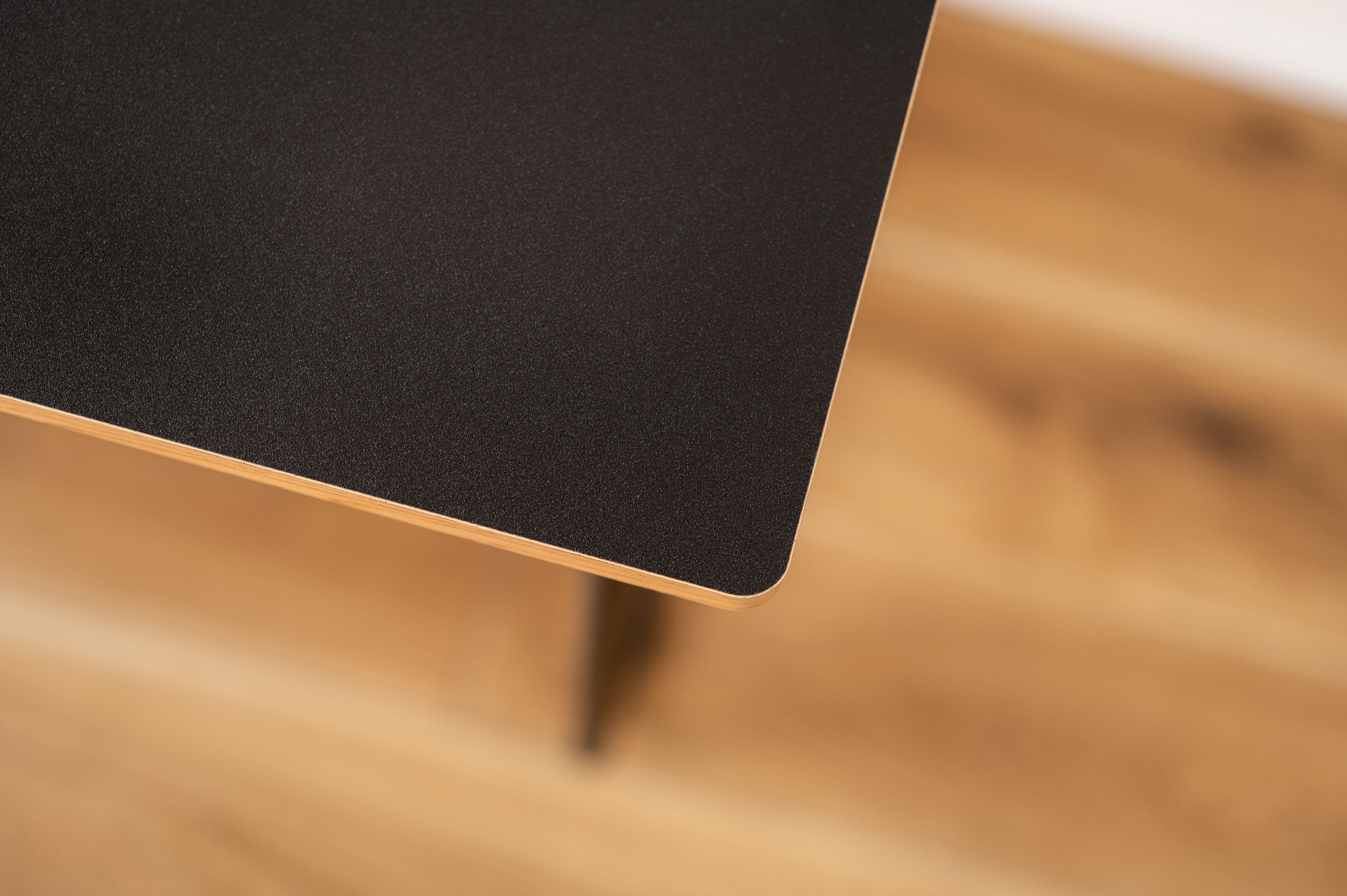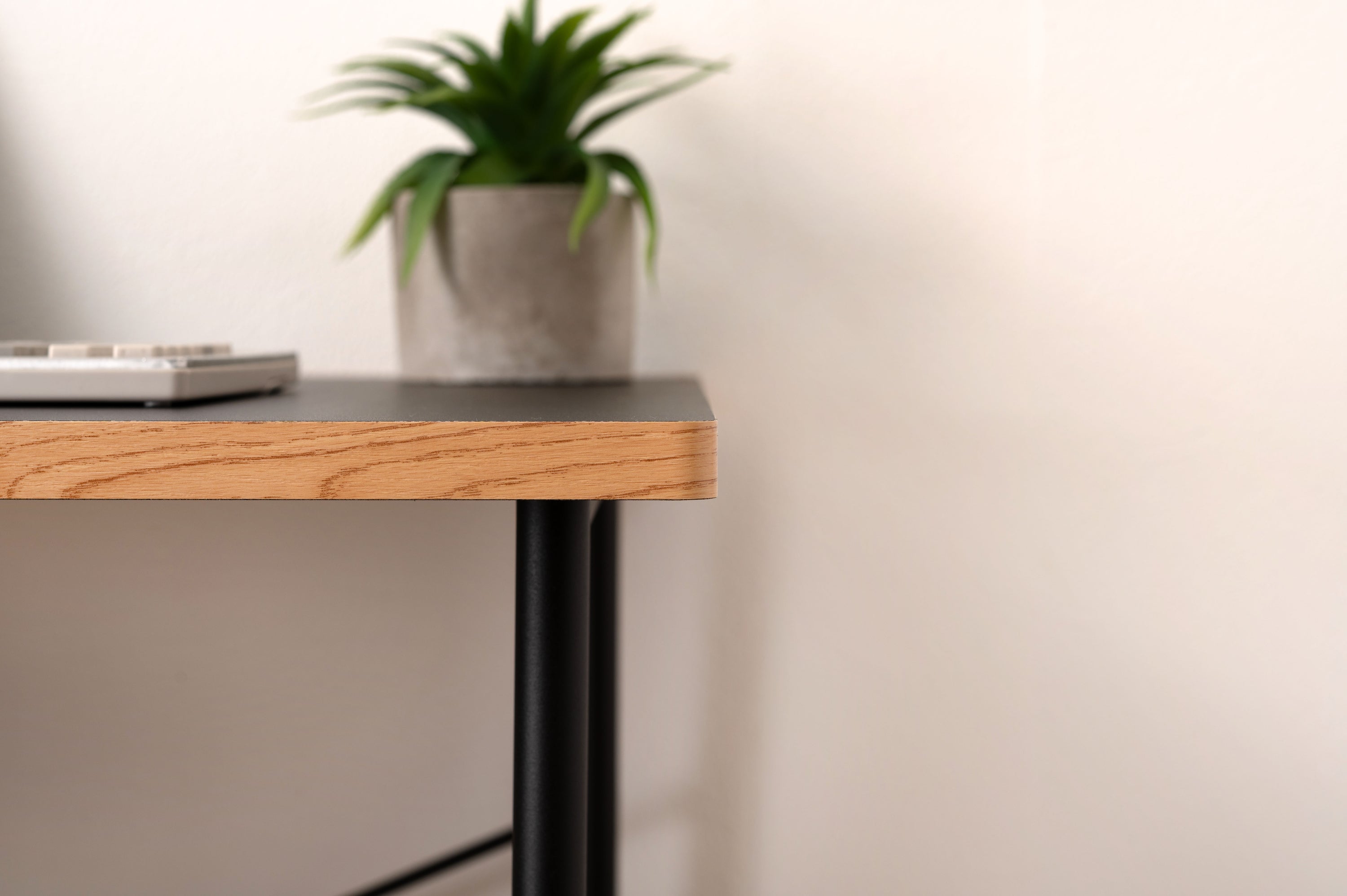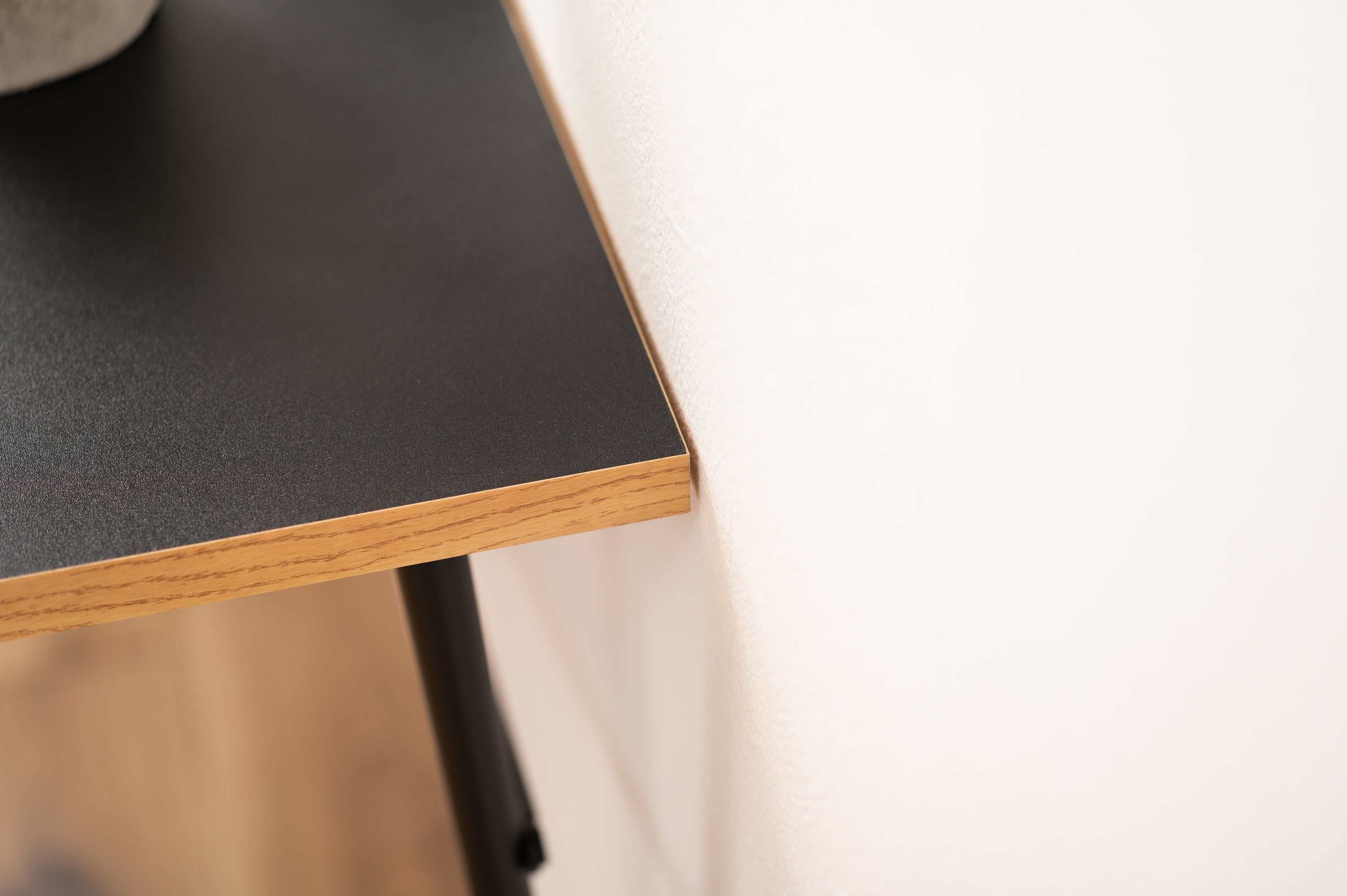 シンプルでコンパクトなワークデスク。 作業でもデスクワークでも機能や強度を持たせつつ余計なものは取り除いた極限までシンプルなデザインのデスク。 天板表面はPVCシートでお手入れも簡単。 天板のエッジ部分はあえて木目調に仕上げ、コントラストの効いたデザインに。 天板前部の角に曲線を掛けた、丸みを帯びた柔らかい仕上がり。 背面側のエッジは直角に設計されているので、壁にぴったりとフィット。