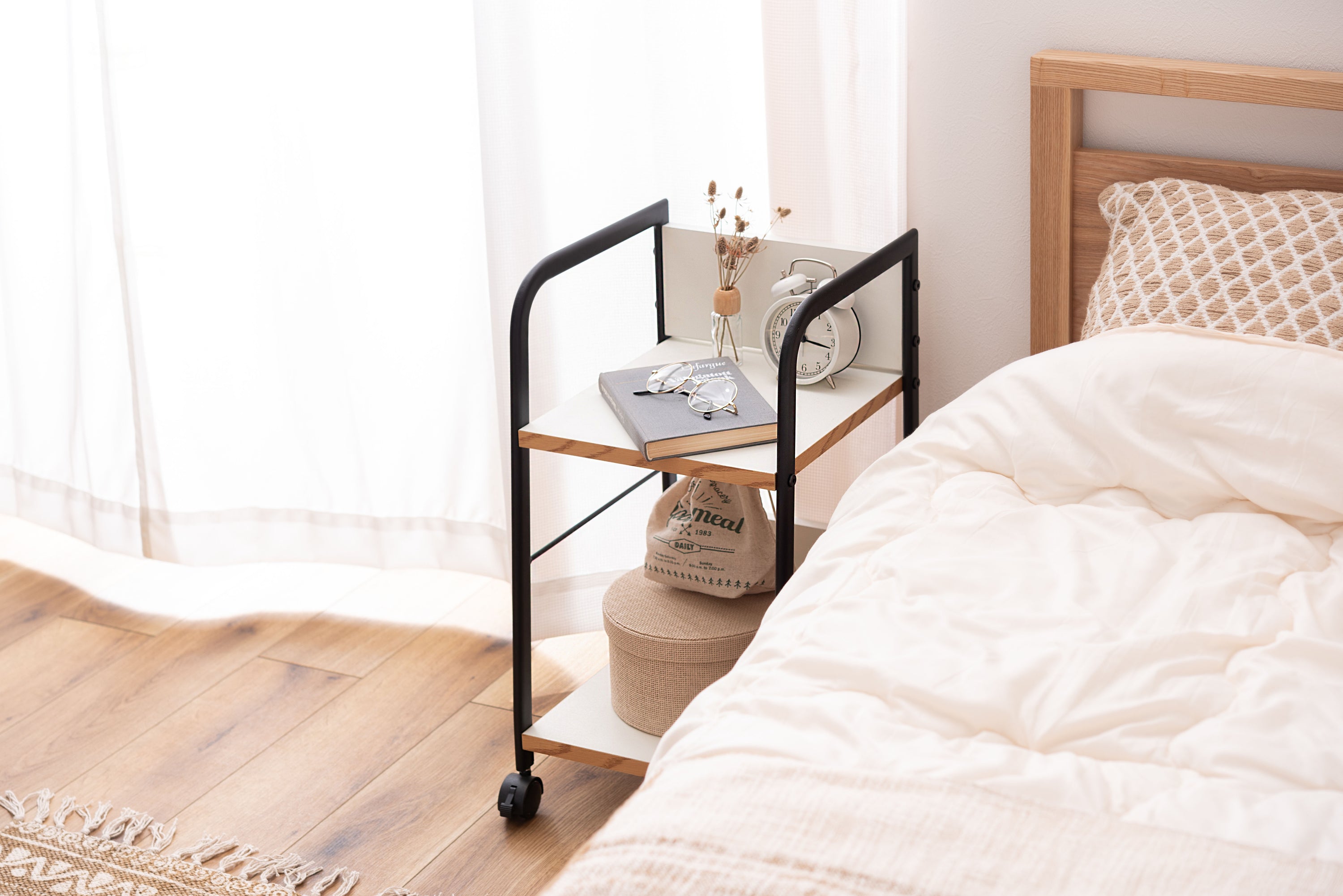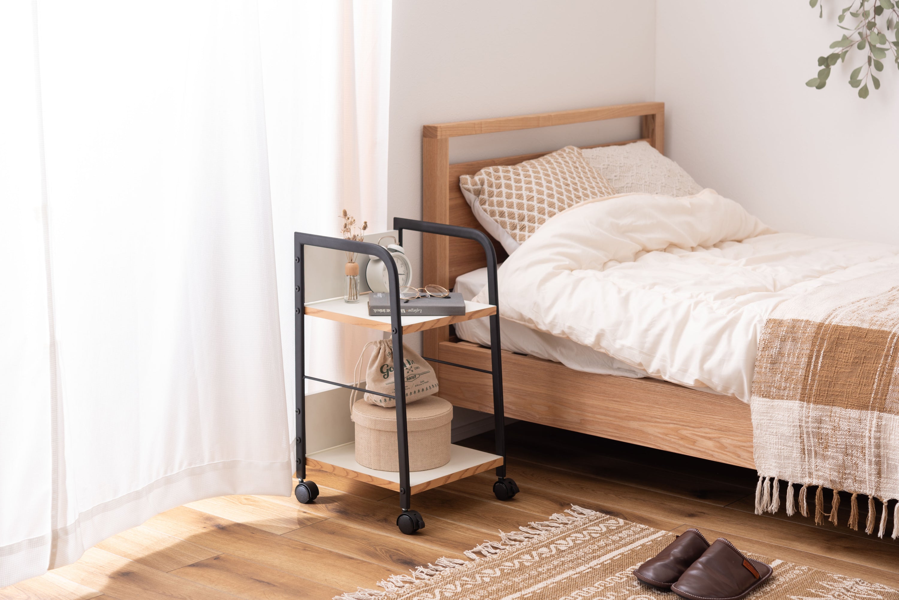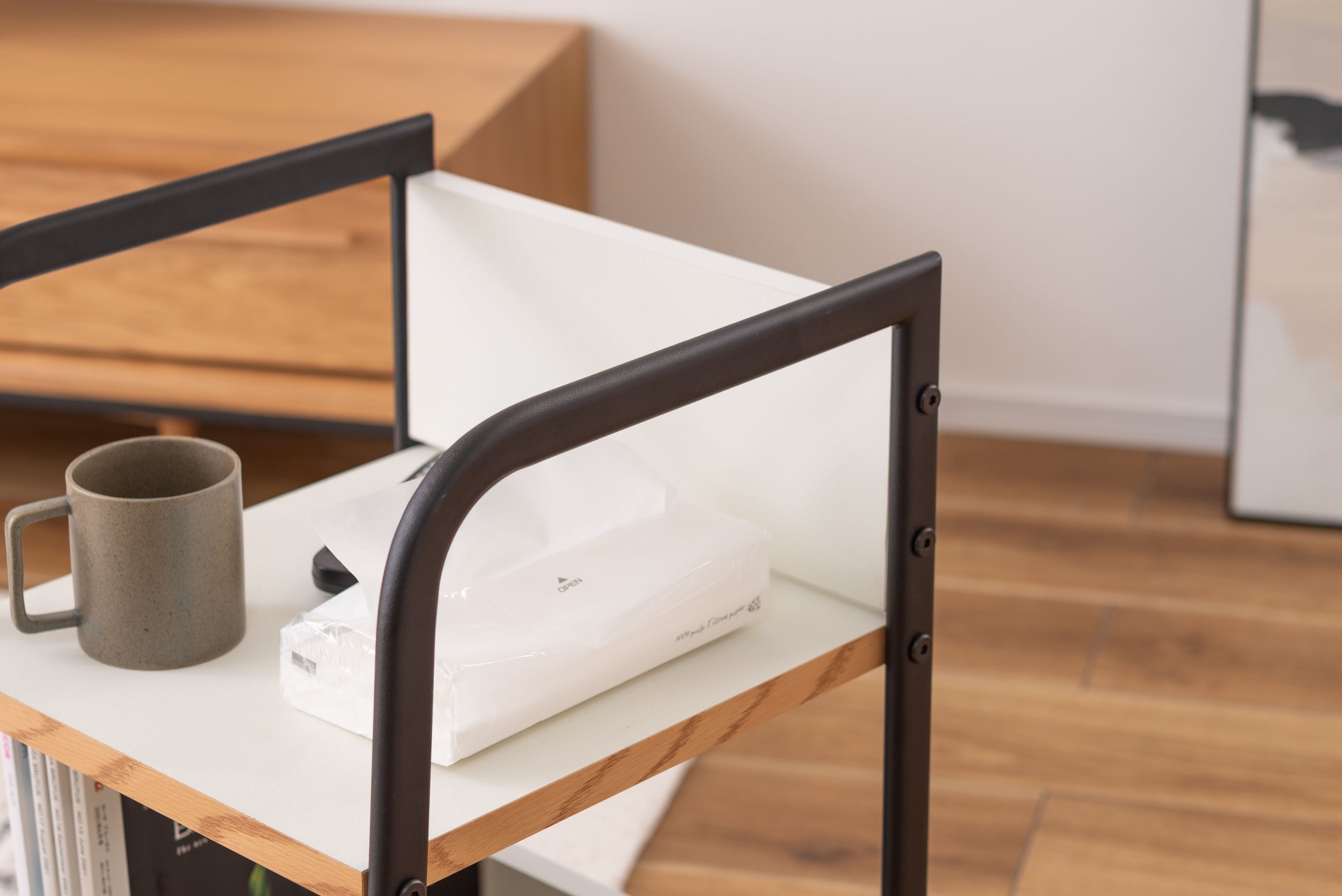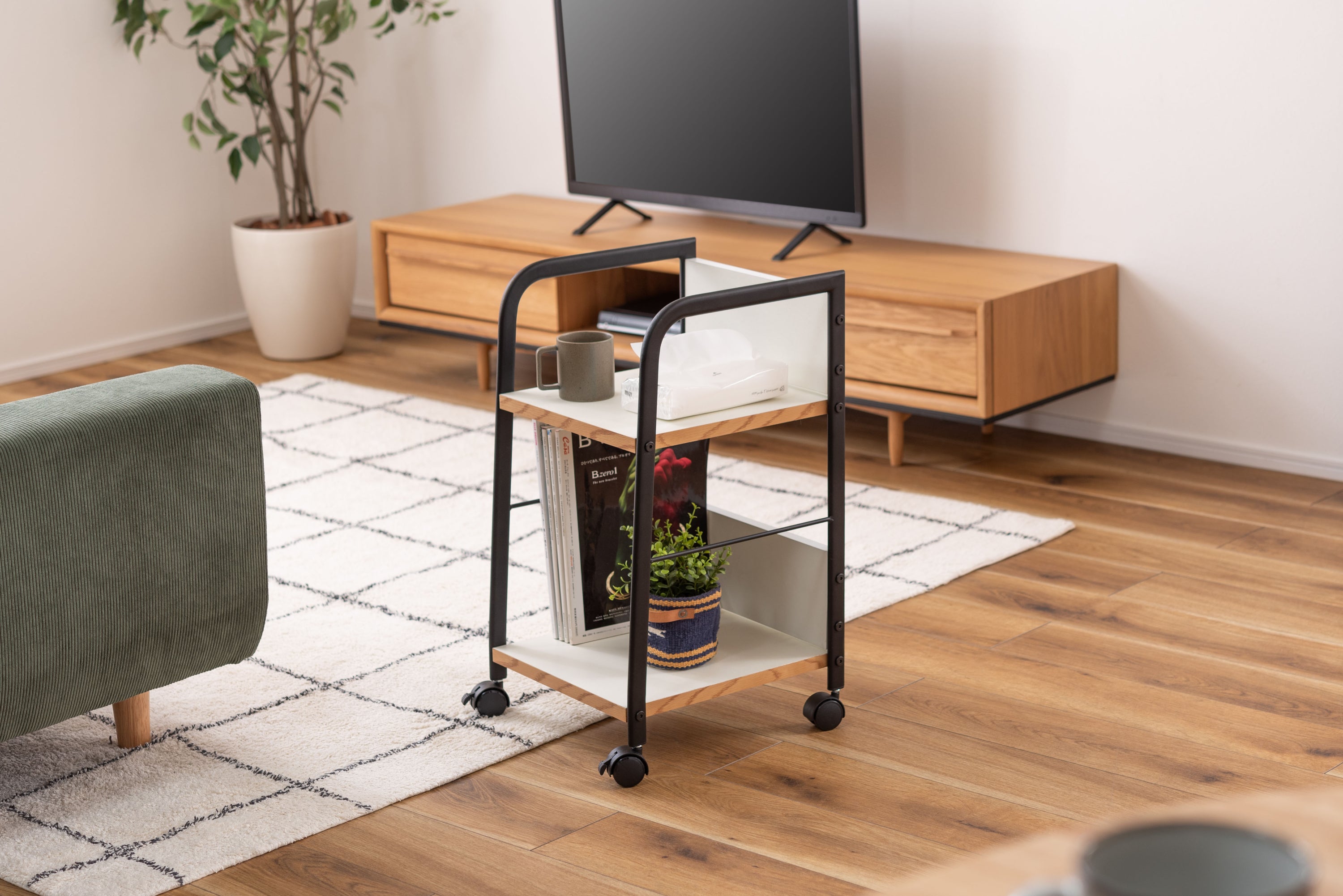 ワークデスクに合わせてデザインされたデスクワゴン。 PVCシートで手入れもしやすく、ちょうどいいサイズ感が魅力。 背板が付いているので物を置いても落ちにくく安心。 仕事道具や勉強用具を一箇所にまとめて収納。 ワークデスクの下に収納できるサイズ感。 オープンタイプなので見やすく必要な時にサッと取り出せる仕様。 ベッド横のサイドテーブルやソファ横のリビングワゴンなど使い方無限大。 キャスター付きで移動も簡単。 ストッパー付きなので場所を固定したい時にも便利。