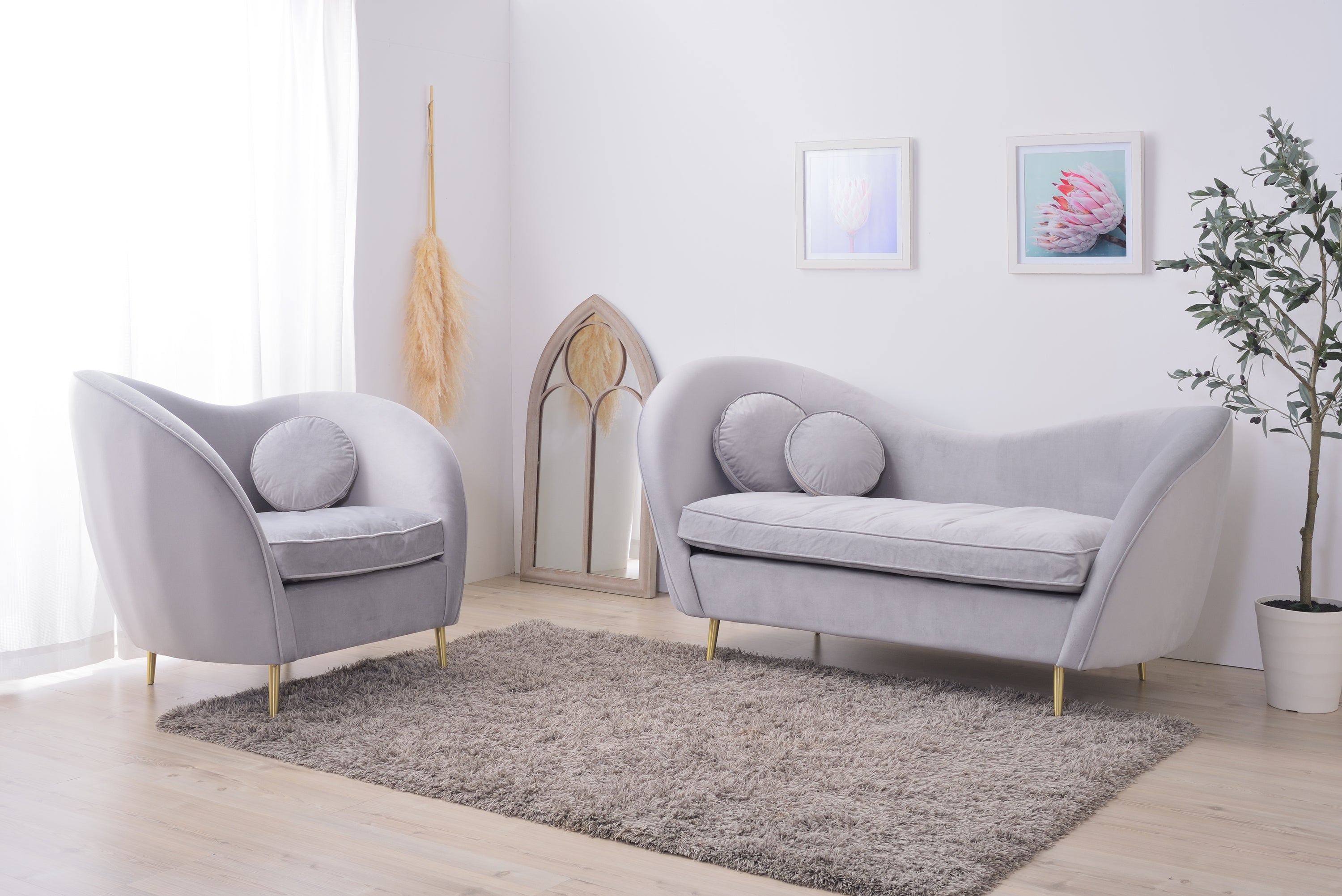背もたれがハートのような形になった、愛らしいデザインのソファ「エステ」 ベロア生地を使用しているので手触りが良く、見る角度によって色のグラデーションが楽しめる表情豊かなソファです。