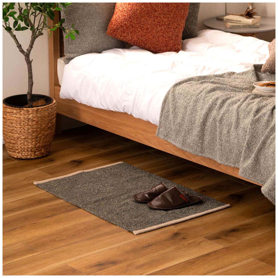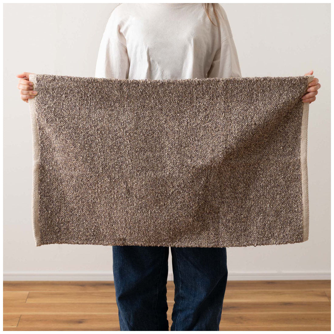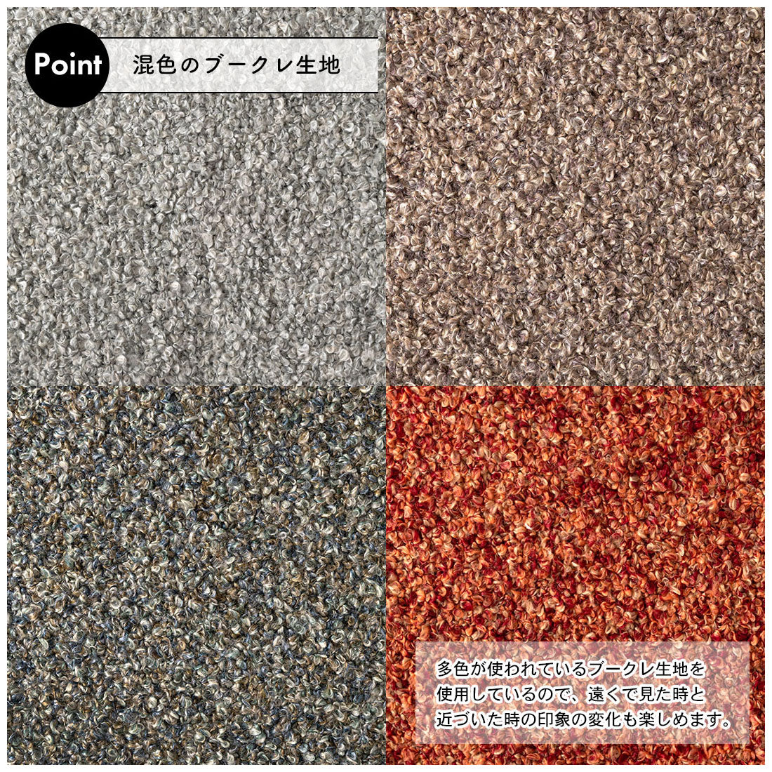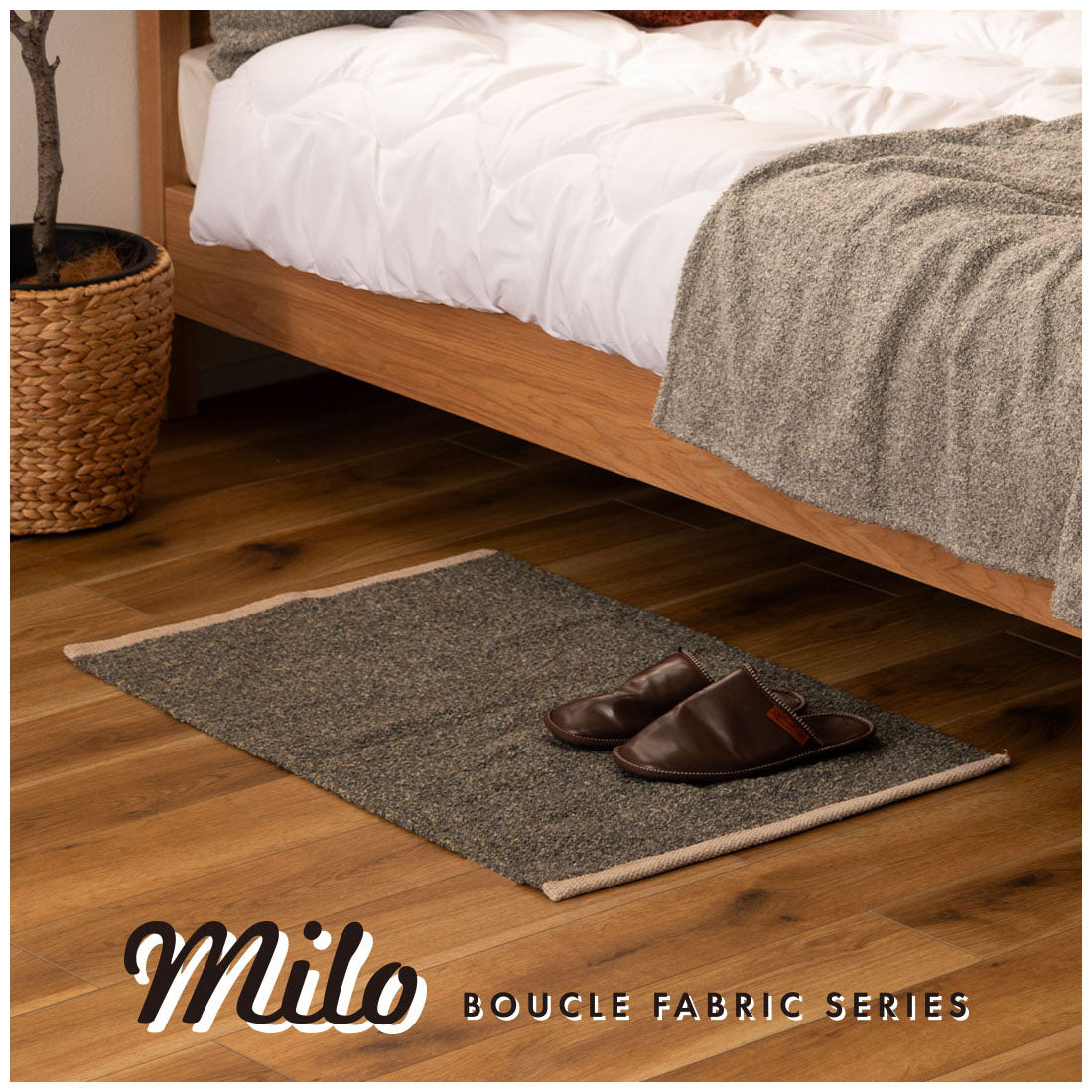 トレンドのブークレ生地を使用したマット。 混色の物を使う事で、絶妙なニュアンスカラーを表現。 マットはベッド横や玄関先などで使いやすいサイズ感のアイテム。 豊富なカラーバリエーション(4色)。きっとしっくり来る色が見つかるはず。 多色が使われているブークレ生地は、遠くで見た時と近づいた時の印象の変化も楽しめる生地。