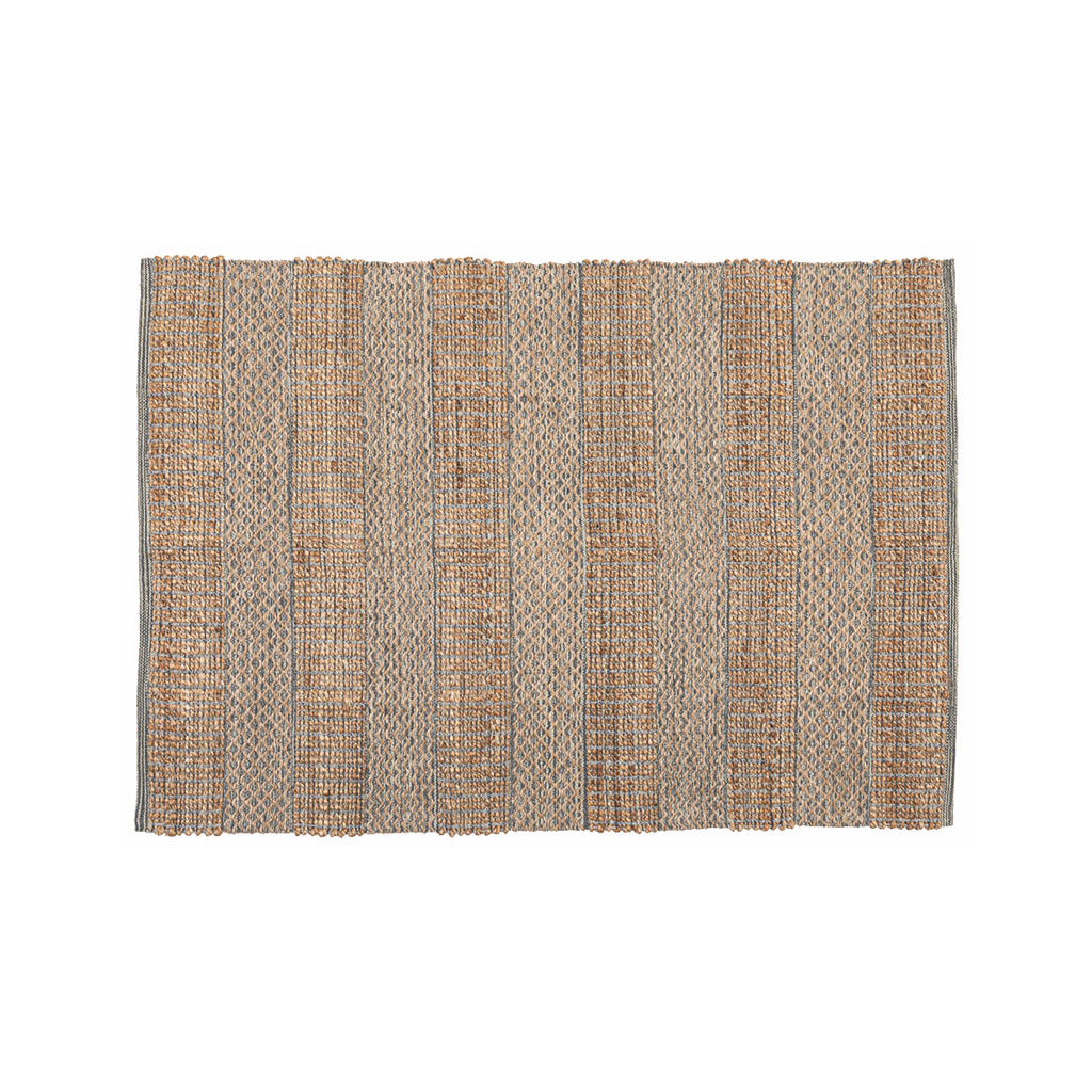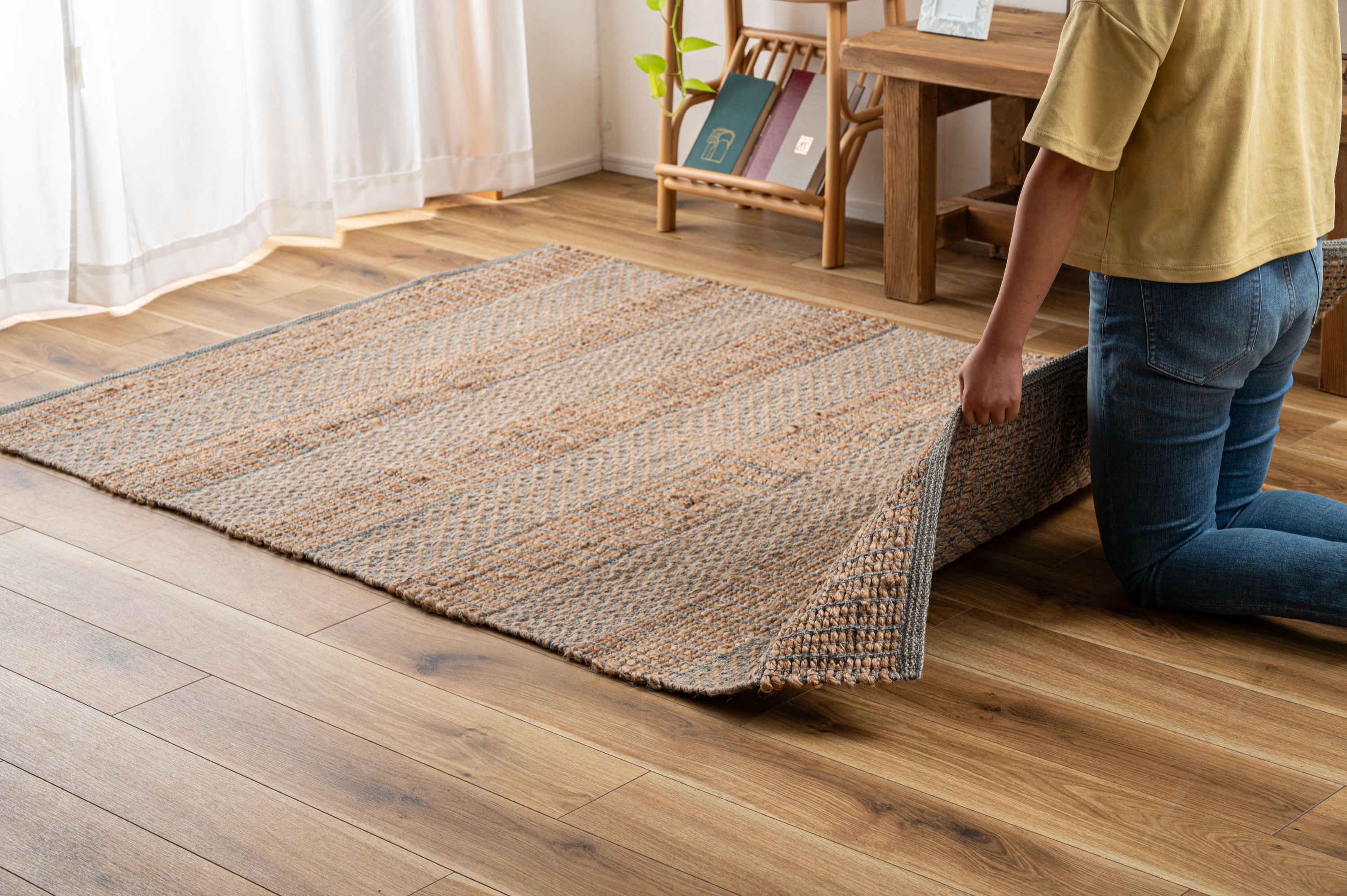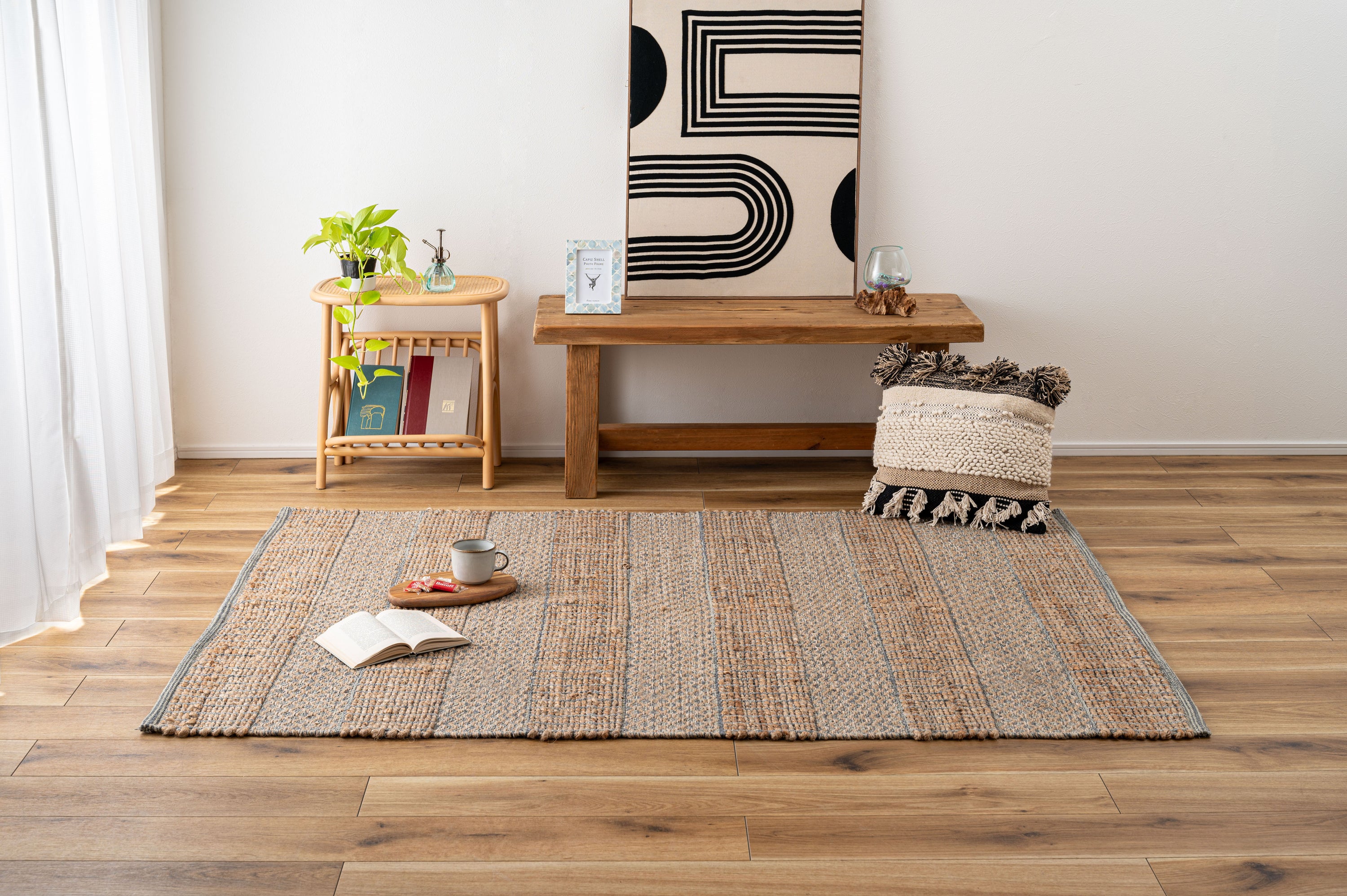 手織りで丁寧に一点ずつ作られた、シンプルなジュートのラグです。天然素材を使用している為、一つ一つ表情が異なる所が魅力的です。異なる二色の糸を組み合わせてデザインされたストライプはカジュアル過ぎず様々なテイストのお部屋を引き立てます。