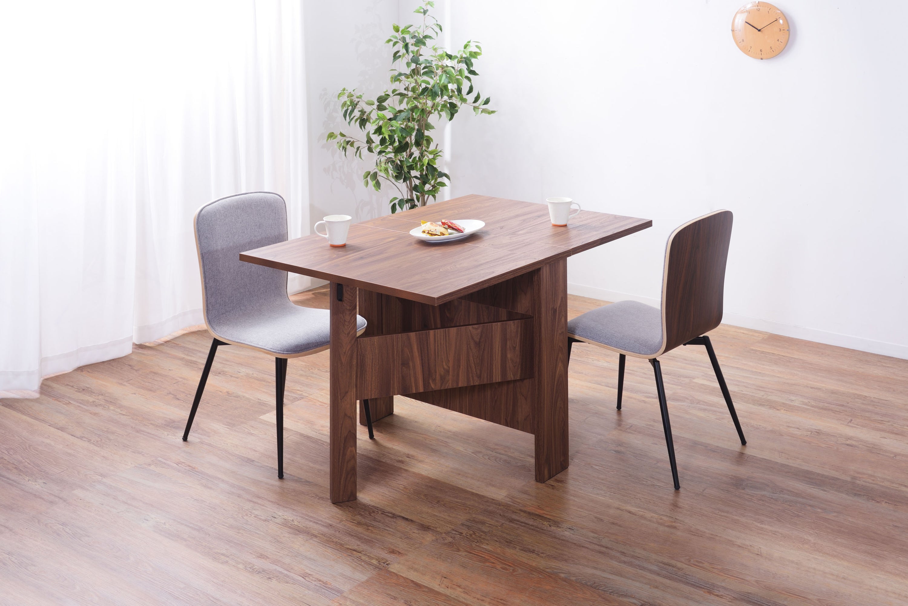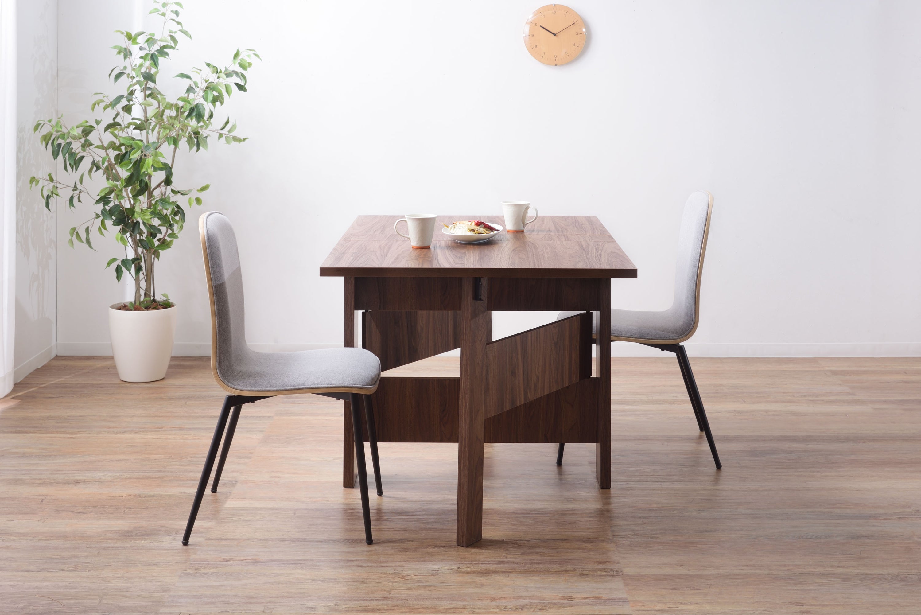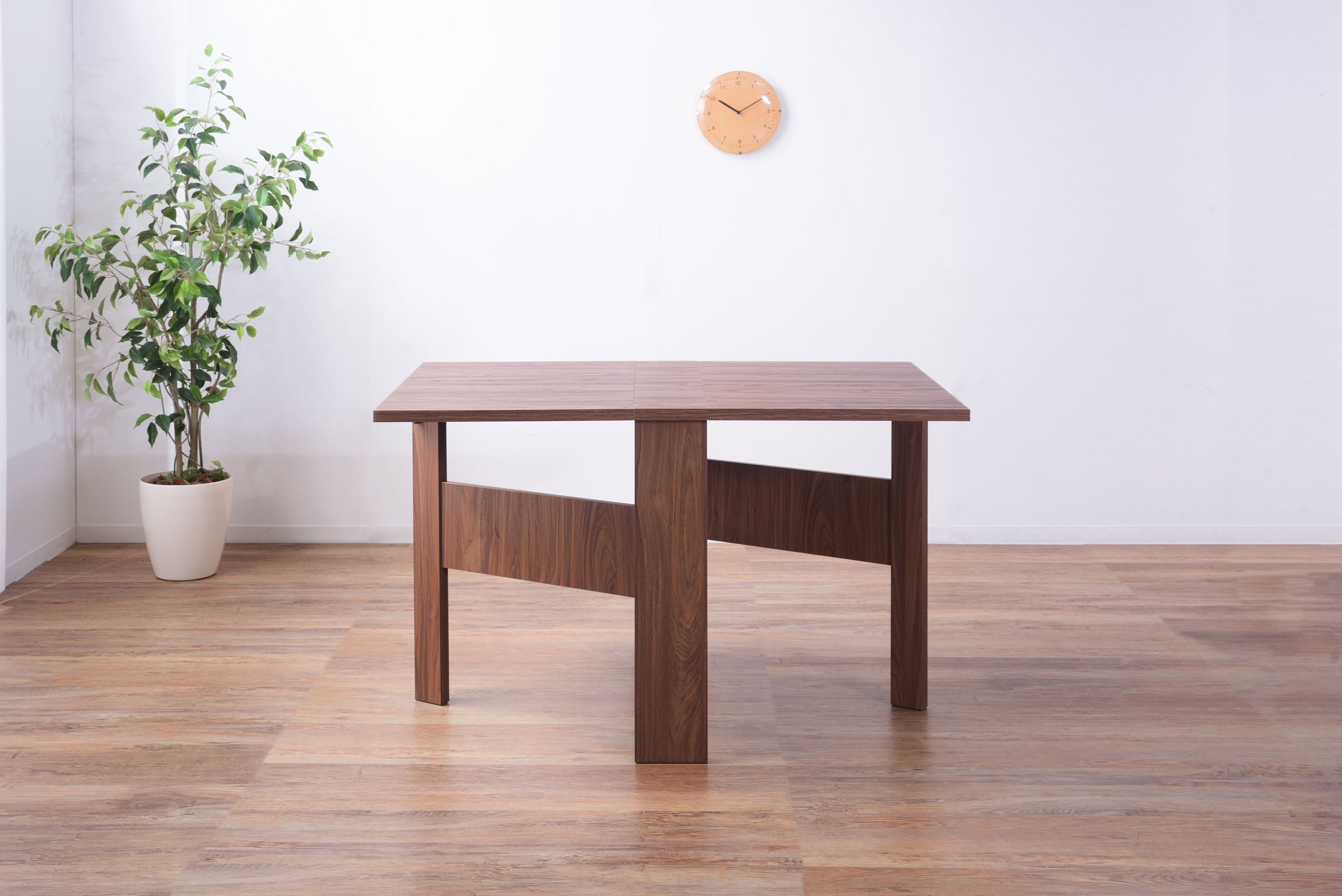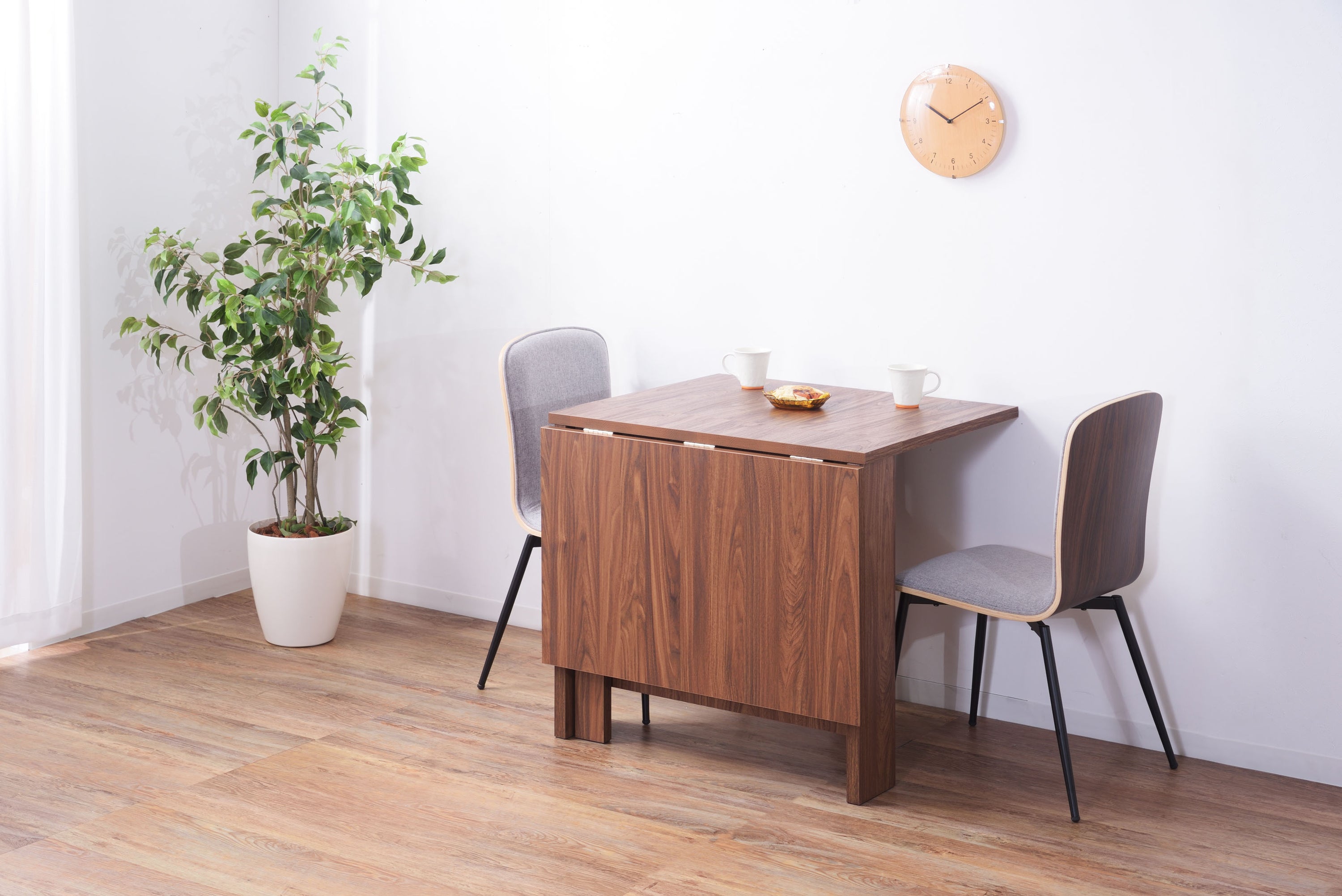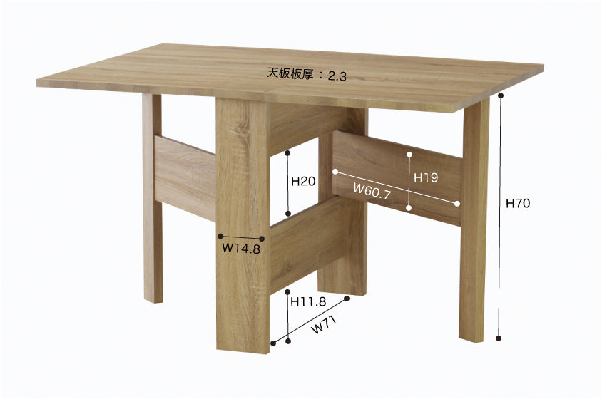 天板を広げたり折りたたんだり、使い分けが可能なダイニングテーブル。 片開き時は2人用テーブルやデスクとして。両開き時は4人用テーブルして使えます。 天板は折りたたんで収納可能。幅約20.5cmととってもコンパクト。 天板を広げたときはは両サイドにあるロックで簡単に固定。使用中に天板が閉じたりガタつく心配もありません。 テーブル本体には木目調の強化プリント紙化粧合板を使用。天然木・無垢材では難しい「統一感」を実現。 強化プリント紙化粧合板は汚れに強くお手入れが簡単なのでいつでも清潔。 弾力のある床キズ防止クッションが脚裏全体に張られているのでフローリングの使用でも安心。 お部屋全体を明るくしたいときにオススメのナチュラルと落ち着いた色合いで使いやすいウォルナットの2色。