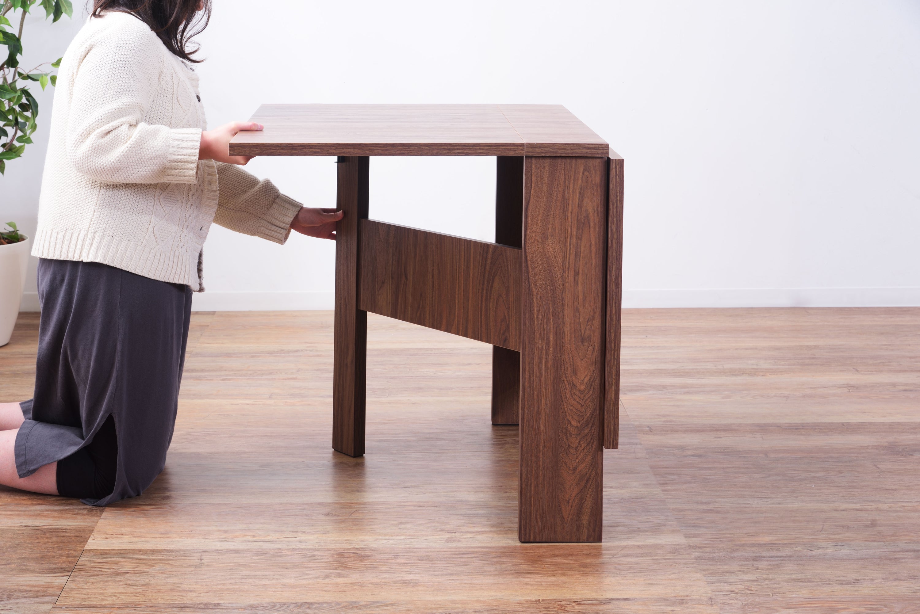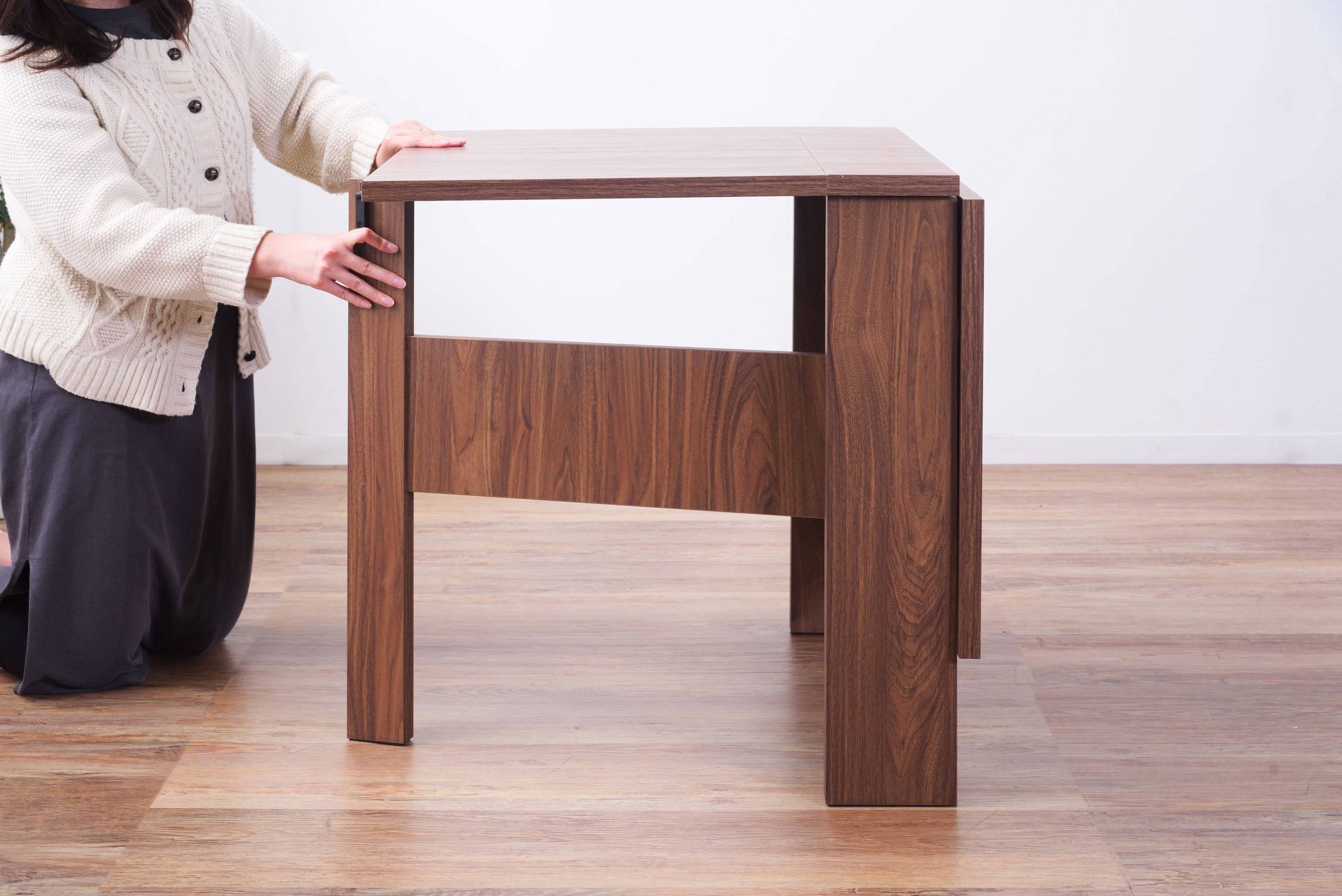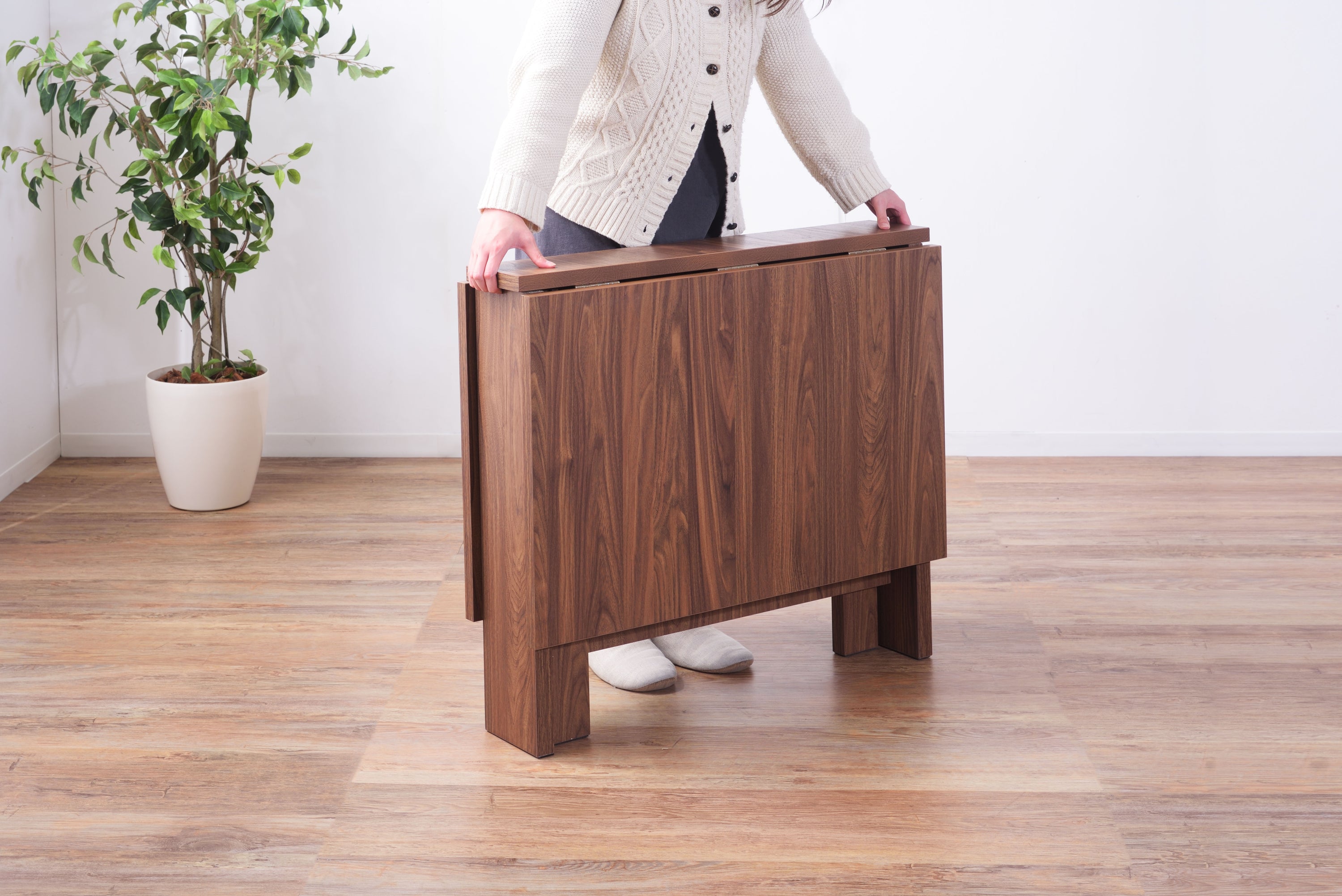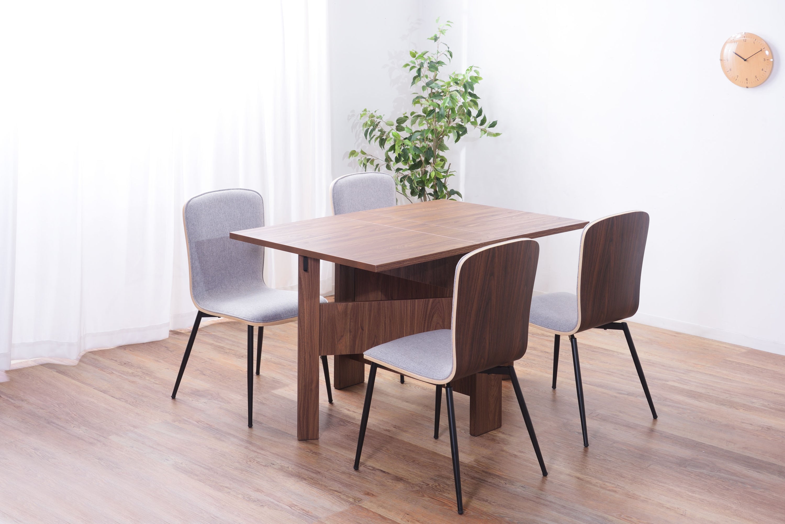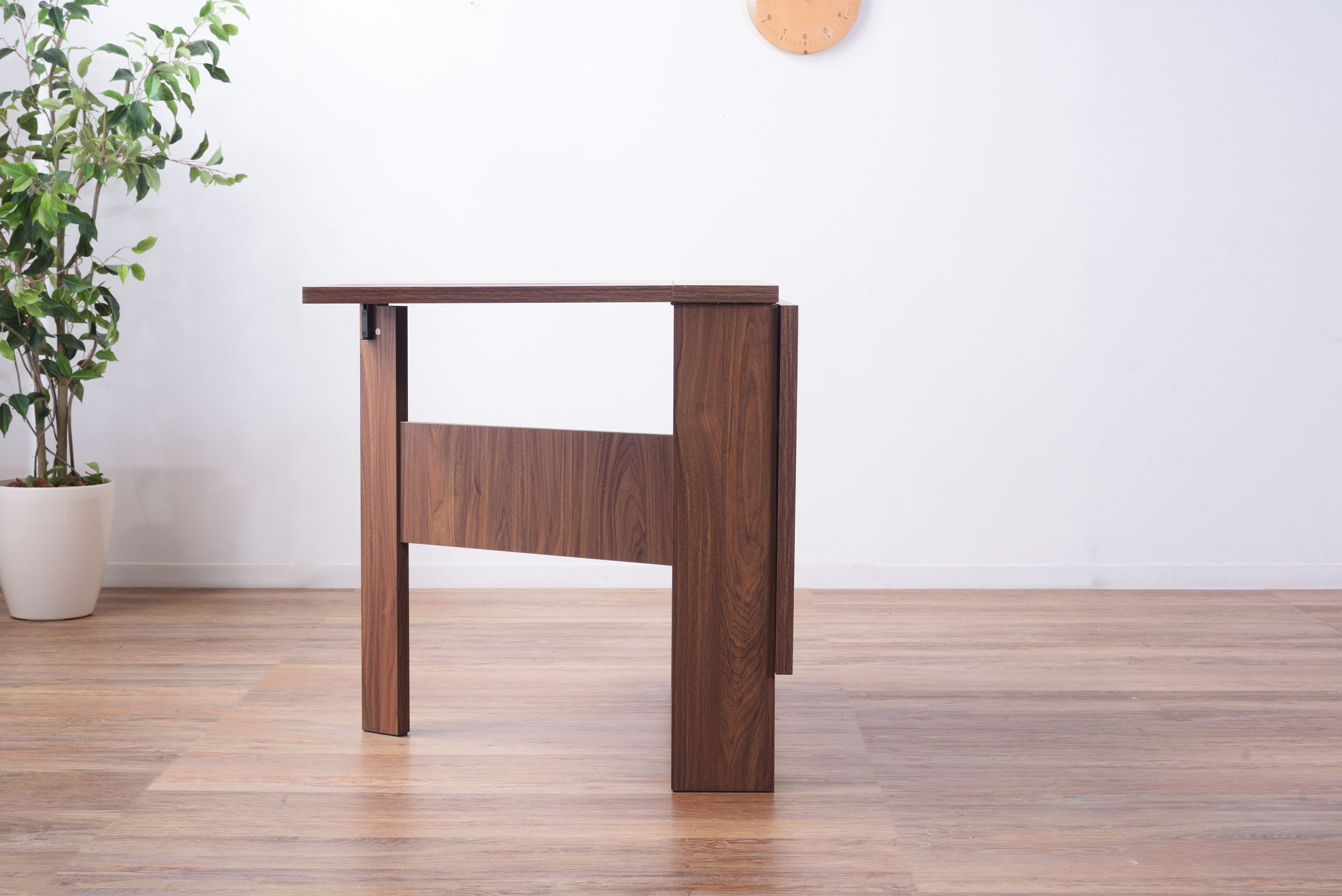 天板を広げたり折りたたんだり、使い分けが可能なダイニングテーブル。 片開き時は2人用テーブルやデスクとして。両開き時は4人用テーブルして使えます。 天板は折りたたんで収納可能。幅約20.5cmととってもコンパクト。 天板を広げたときはは両サイドにあるロックで簡単に固定。使用中に天板が閉じたりガタつく心配もありません。 テーブル本体には木目調の強化プリント紙化粧合板を使用。天然木・無垢材では難しい「統一感」を実現。 強化プリント紙化粧合板は汚れに強くお手入れが簡単なのでいつでも清潔。 弾力のある床キズ防止クッションが脚裏全体に張られているのでフローリングの使用でも安心。 お部屋全体を明るくしたいときにオススメのナチュラルと落ち着いた色合いで使いやすいウォルナットの2色。