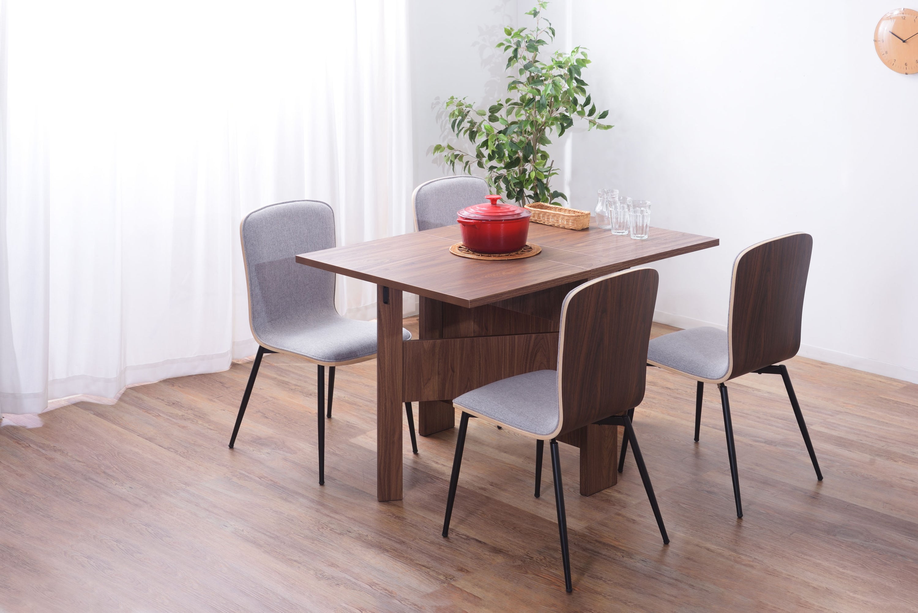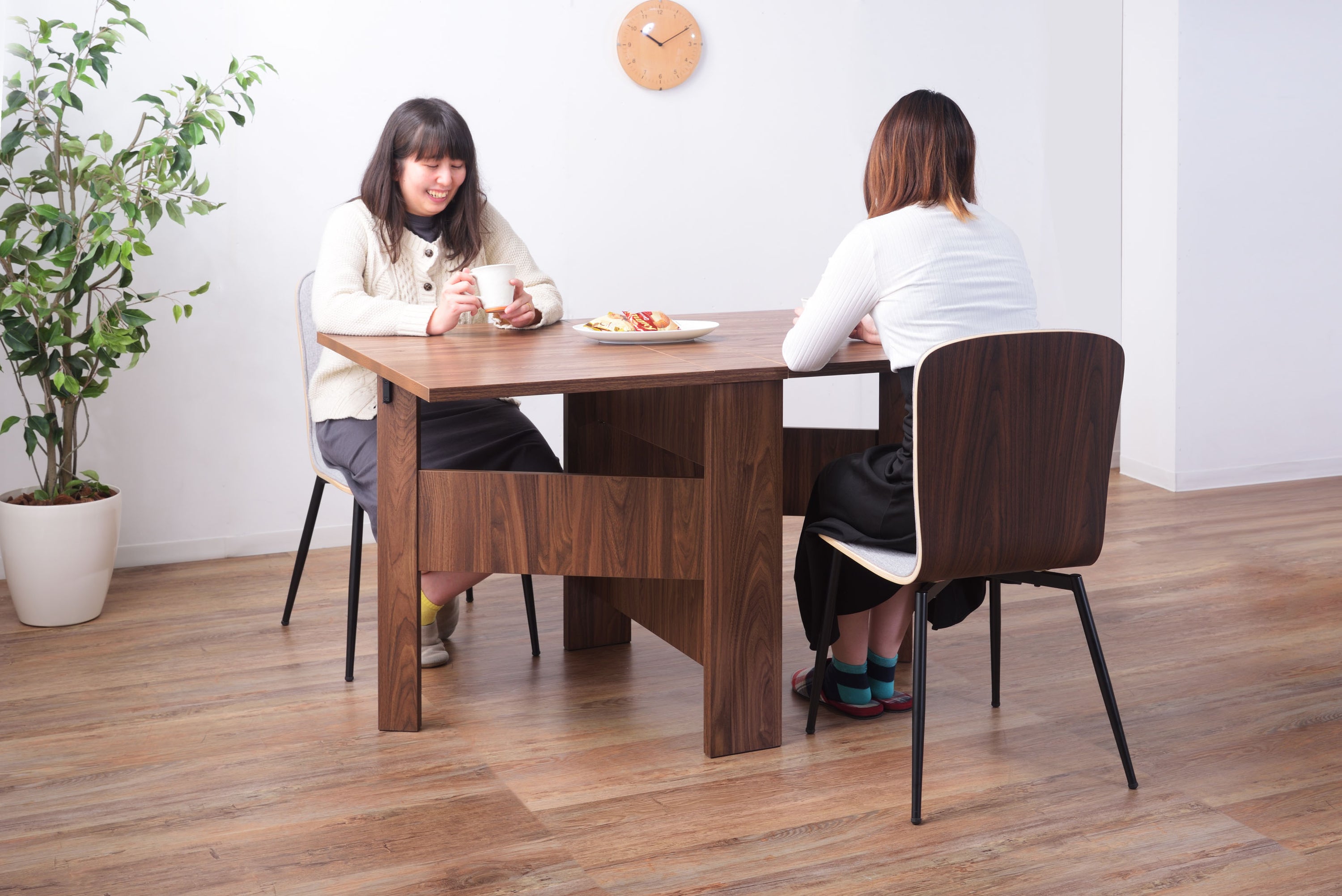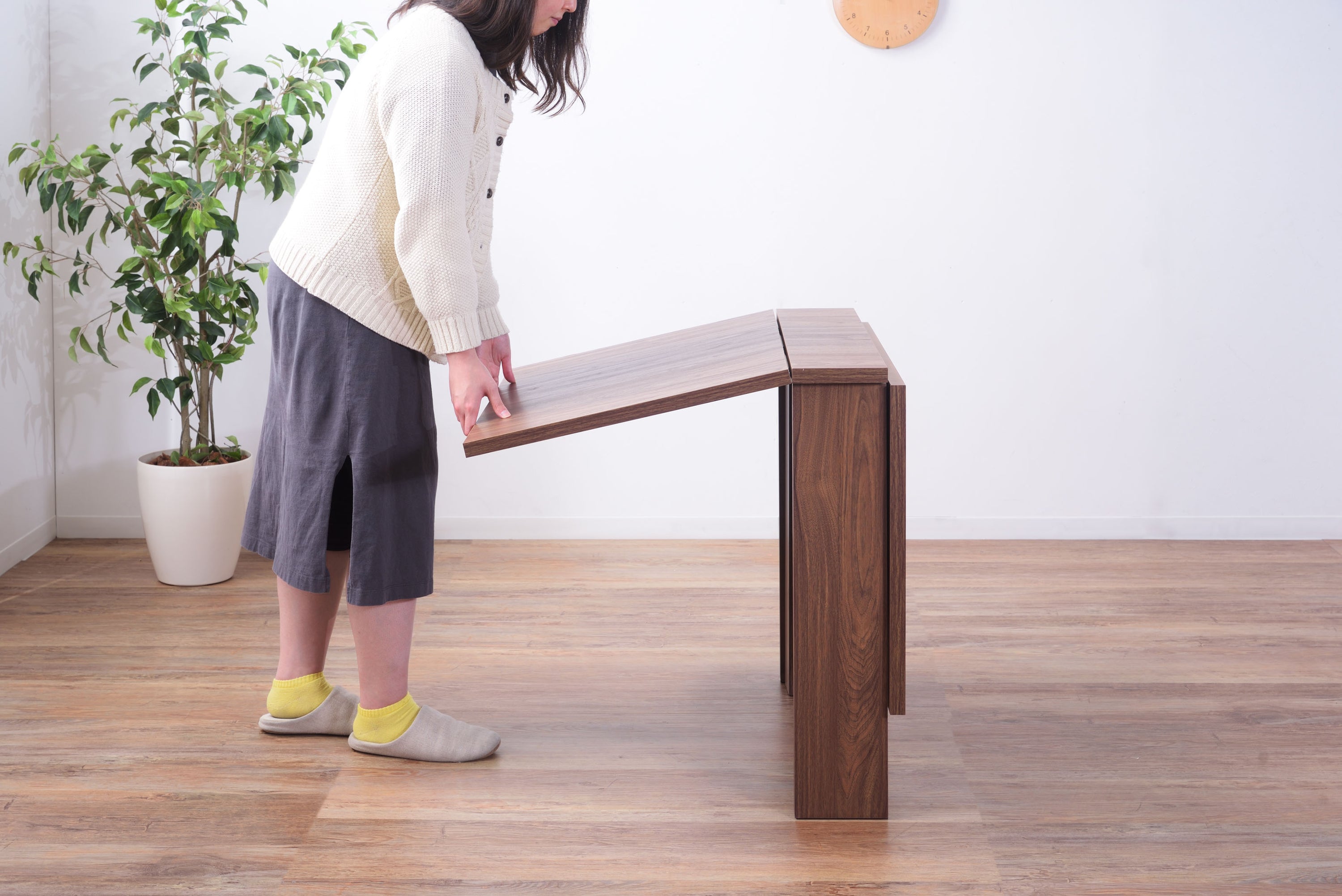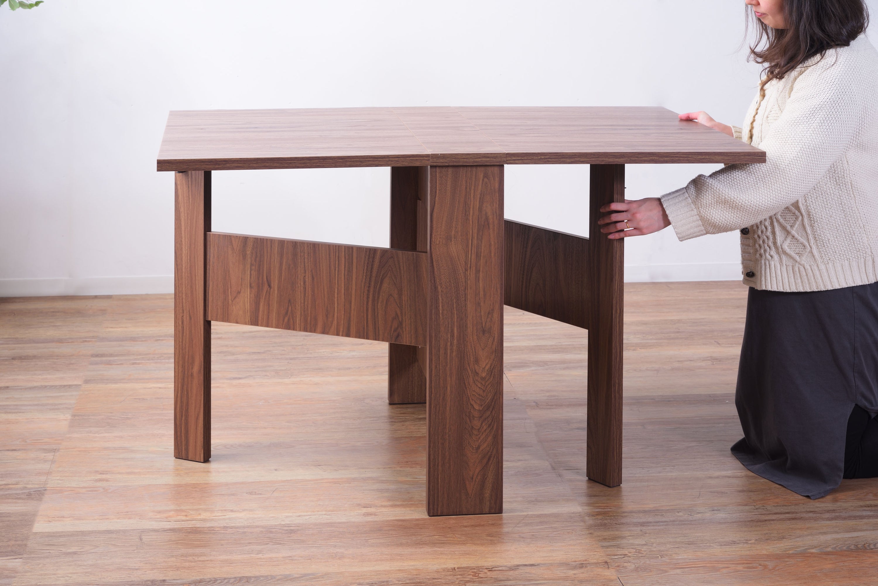 天板を広げたり折りたたんだり、使い分けが可能なダイニングテーブル。 片開き時は2人用テーブルやデスクとして。両開き時は4人用テーブルして使えます。 天板は折りたたんで収納可能。幅約20.5cmととってもコンパクト。 天板を広げたときはは両サイドにあるロックで簡単に固定。使用中に天板が閉じたりガタつく心配もありません。 テーブル本体には木目調の強化プリント紙化粧合板を使用。天然木・無垢材では難しい「統一感」を実現。 強化プリント紙化粧合板は汚れに強くお手入れが簡単なのでいつでも清潔。 弾力のある床キズ防止クッションが脚裏全体に張られているのでフローリングの使用でも安心。 お部屋全体を明るくしたいときにオススメのナチュラルと落ち着いた色合いで使いやすいウォルナットの2色。