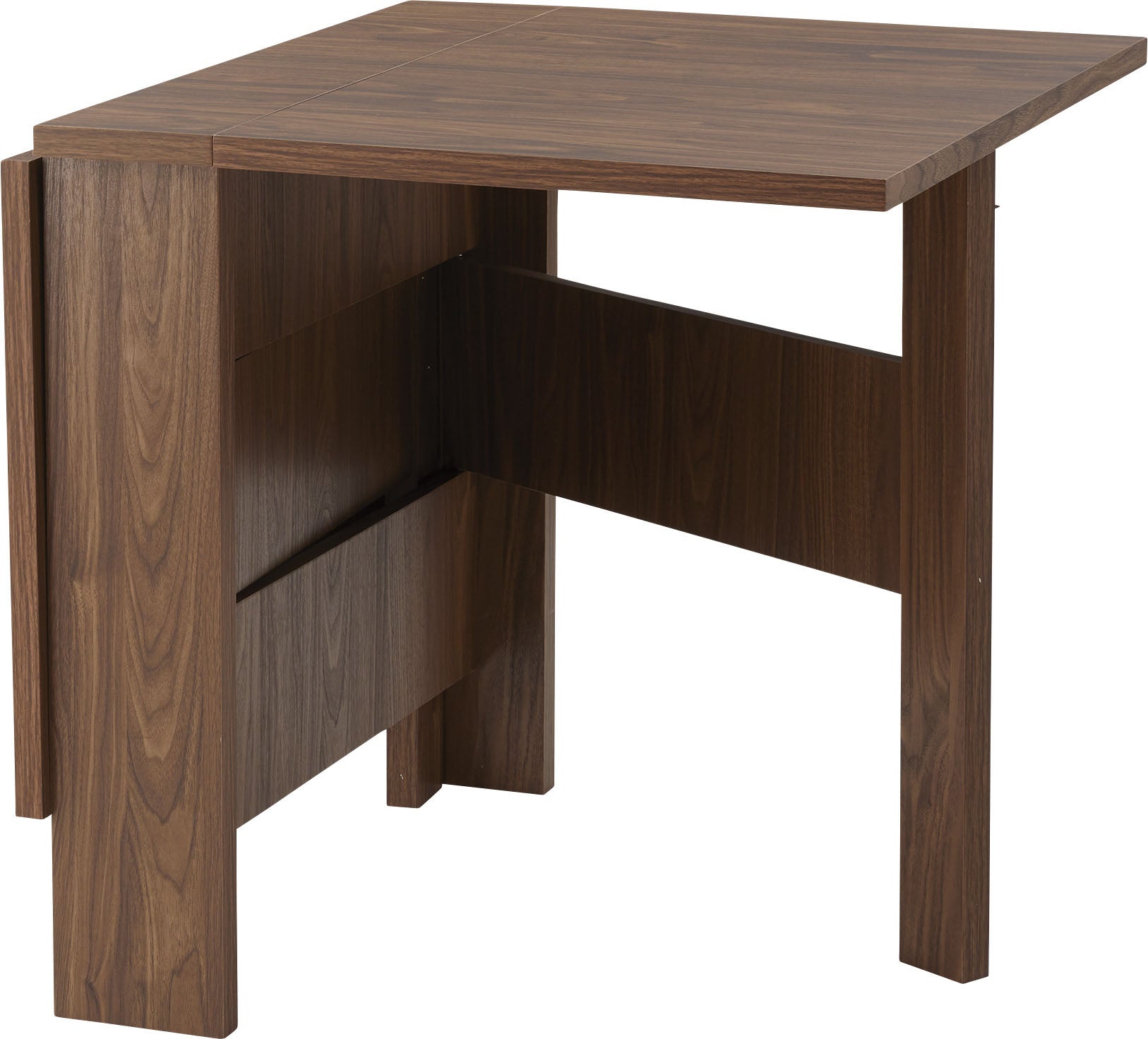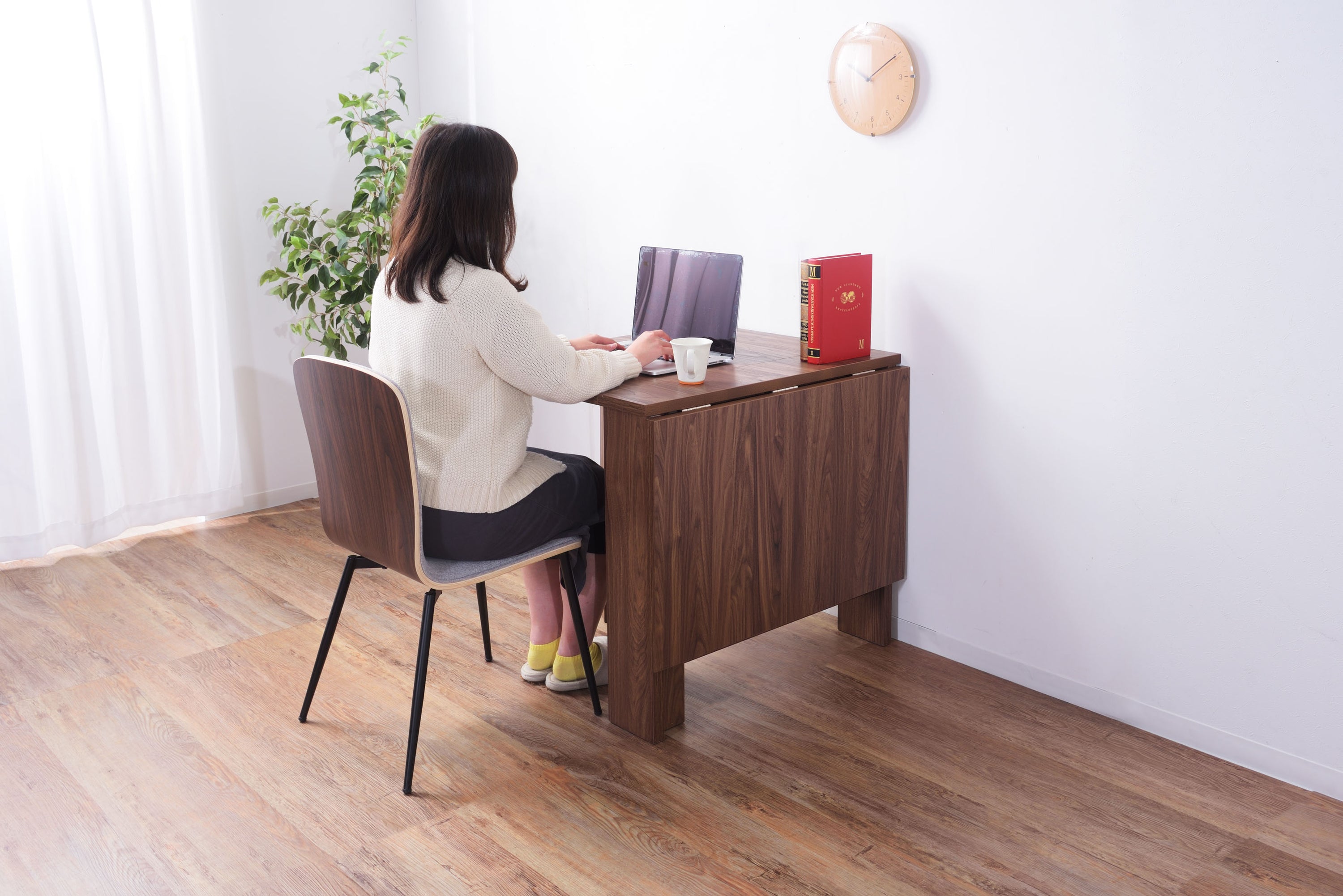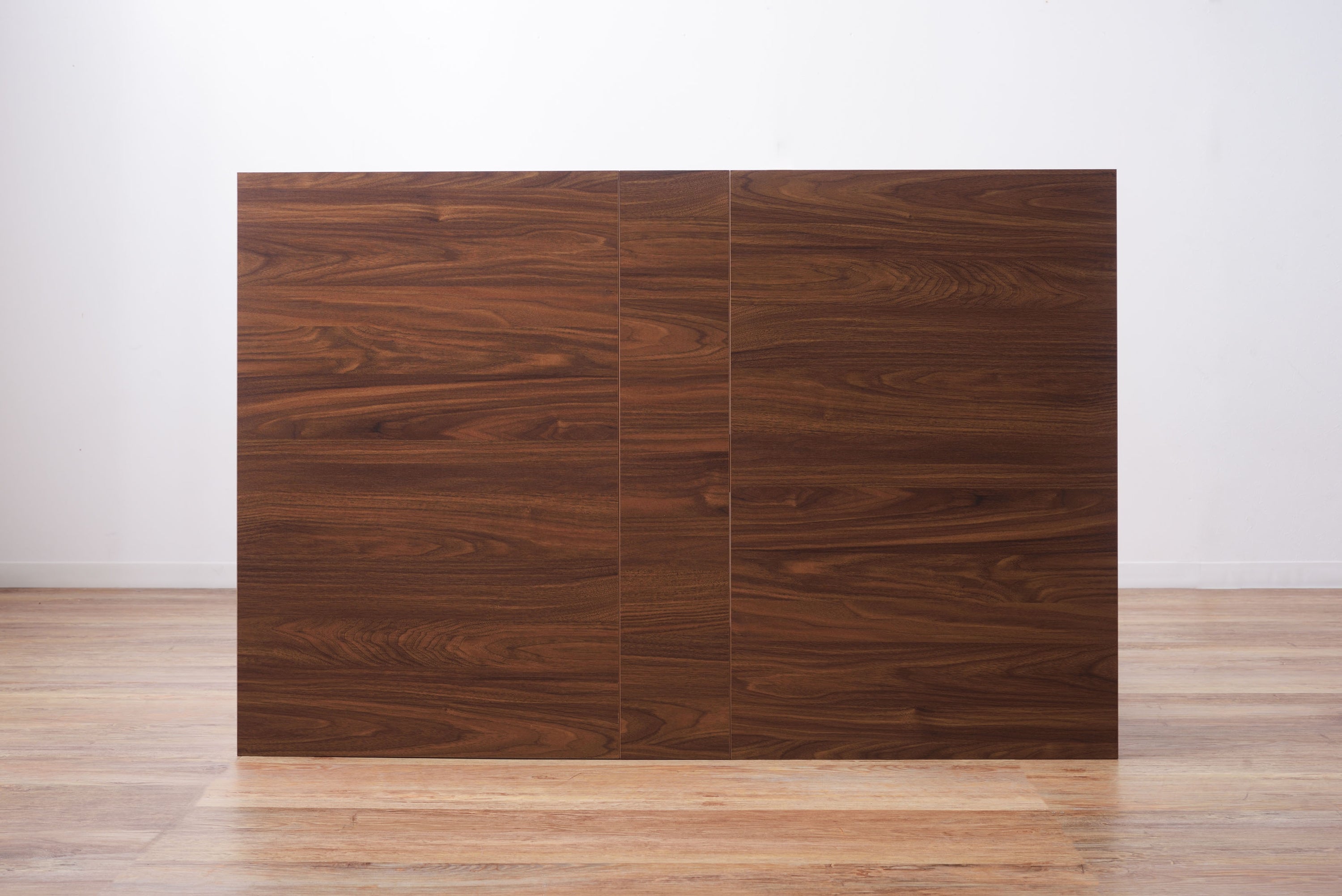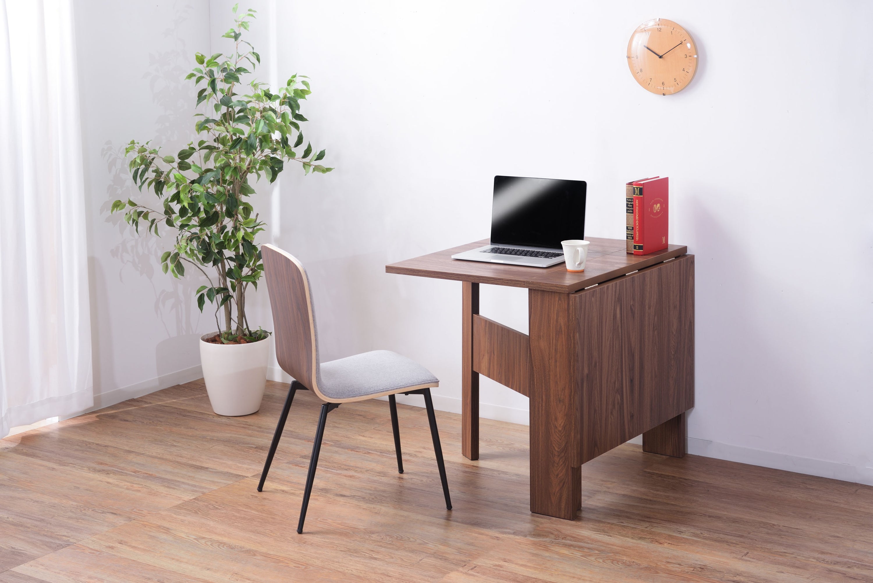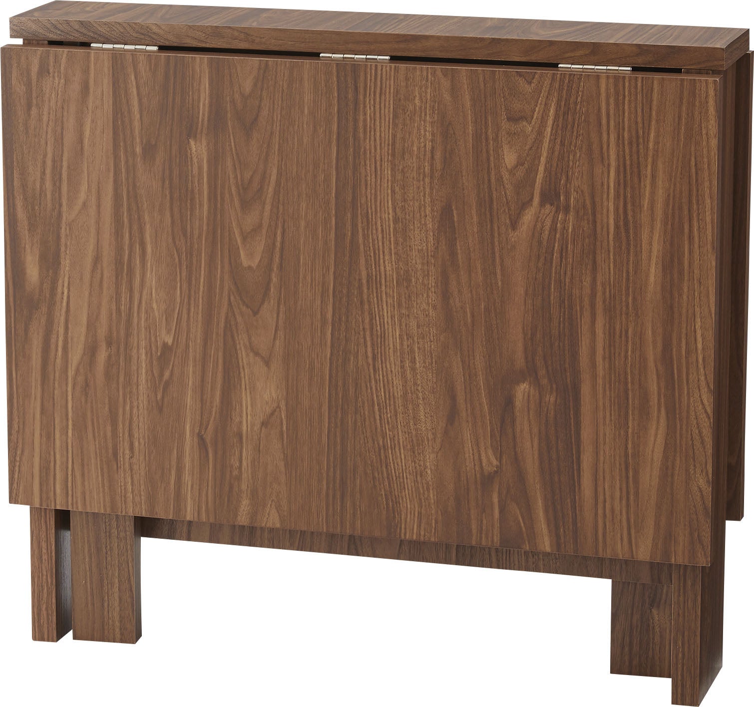 天板を広げたり折りたたんだり、使い分けが可能なダイニングテーブル。 片開き時は2人用テーブルやデスクとして。両開き時は4人用テーブルして使えます。 天板は折りたたんで収納可能。幅約20.5cmととってもコンパクト。 天板を広げたときはは両サイドにあるロックで簡単に固定。使用中に天板が閉じたりガタつく心配もありません。 テーブル本体には木目調の強化プリント紙化粧合板を使用。天然木・無垢材では難しい「統一感」を実現。 強化プリント紙化粧合板は汚れに強くお手入れが簡単なのでいつでも清潔。 弾力のある床キズ防止クッションが脚裏全体に張られているのでフローリングの使用でも安心。 お部屋全体を明るくしたいときにオススメのナチュラルと落ち着いた色合いで使いやすいウォルナットの2色。