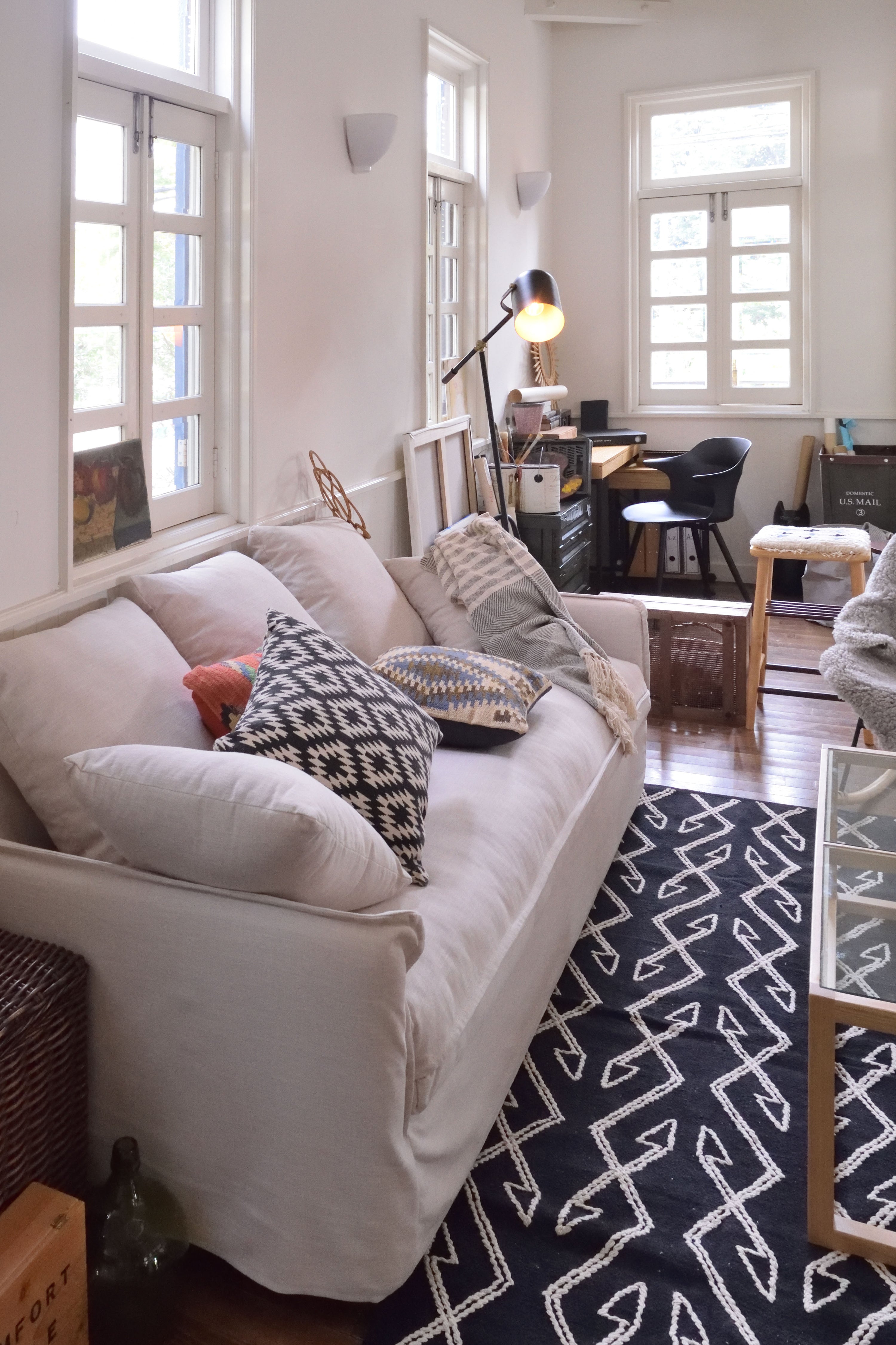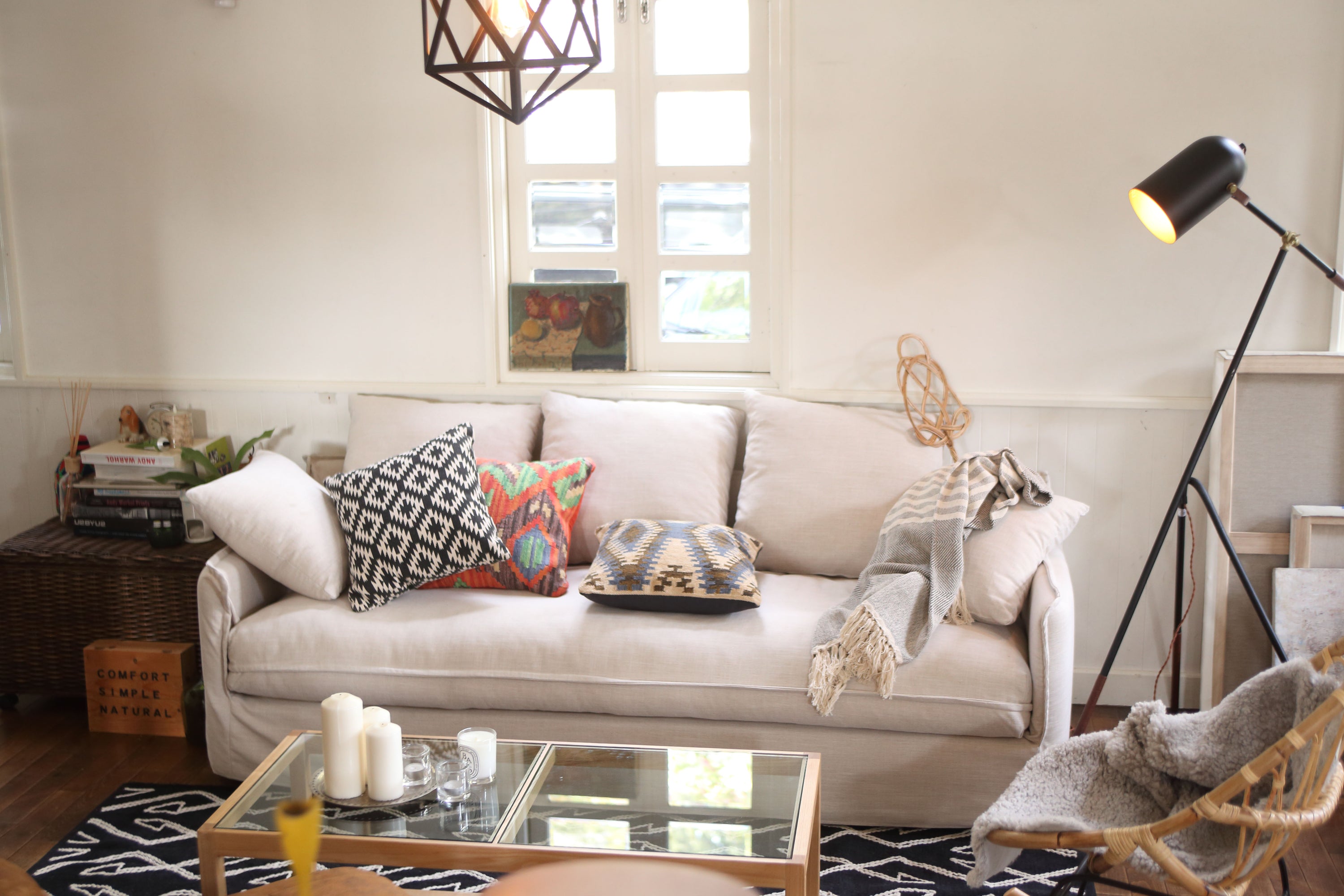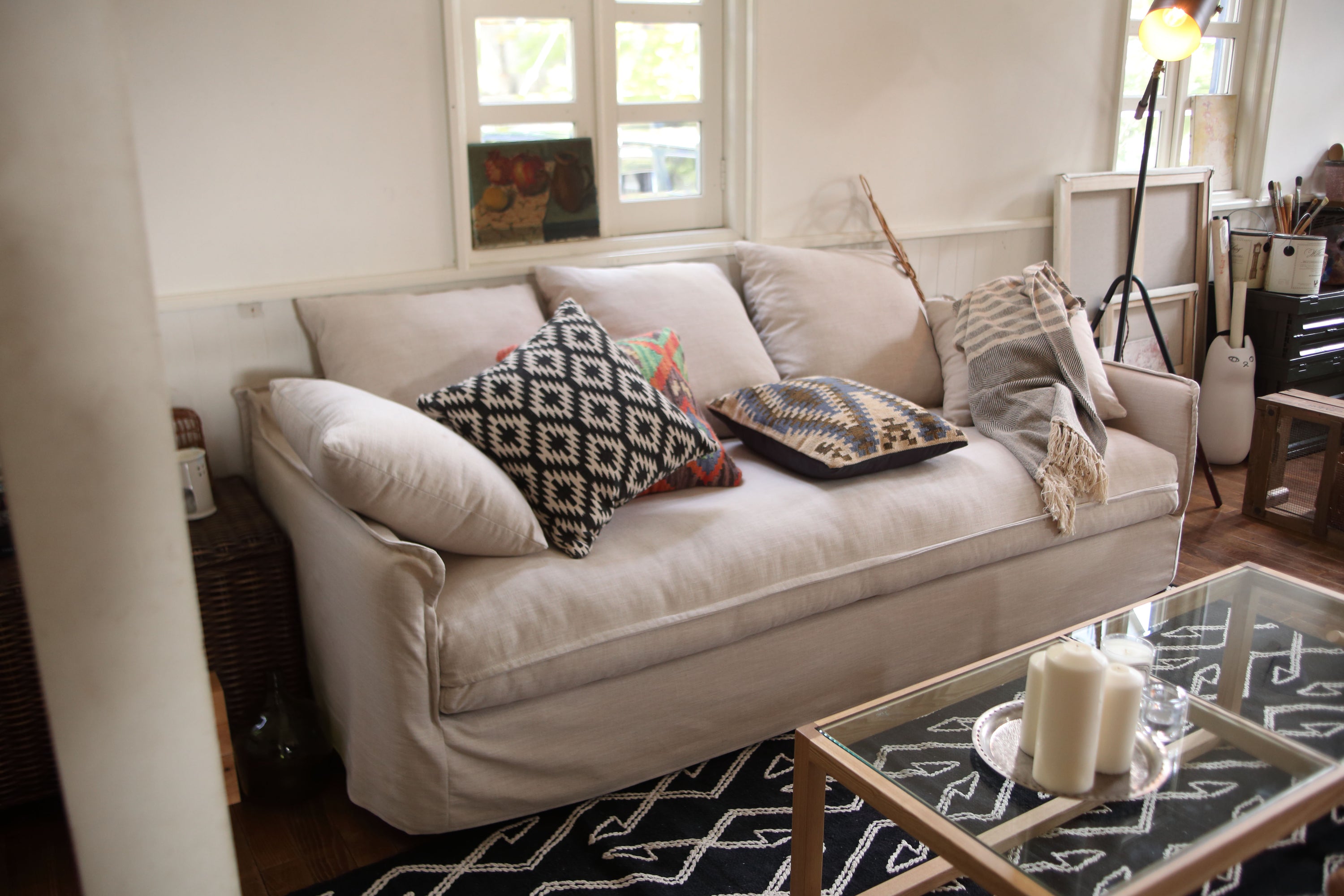 シンプルでベーシックなデザインのソファ。 5つのクッションは置き換えが自由なのでお好みのスタイルでくつろぐことができます。