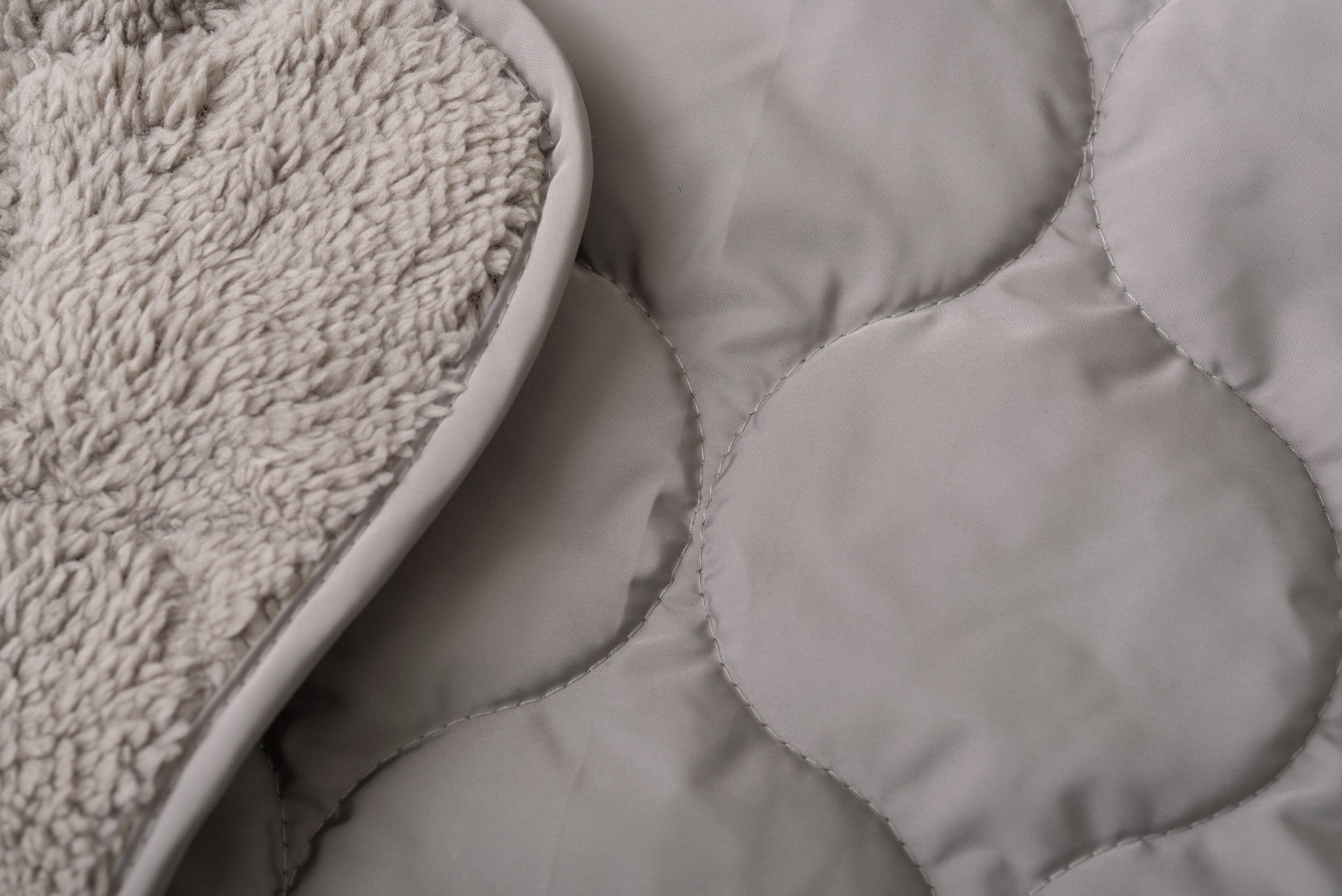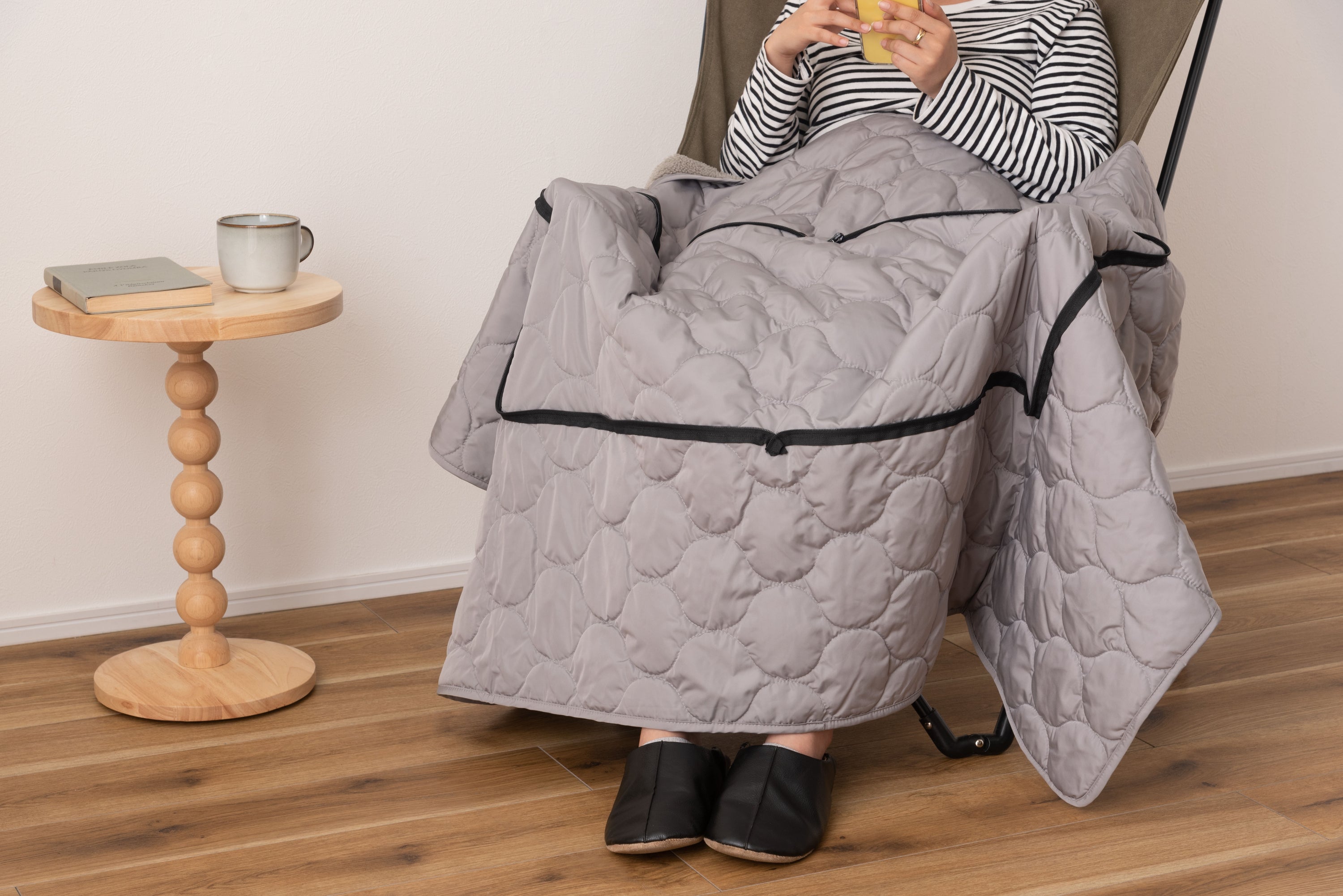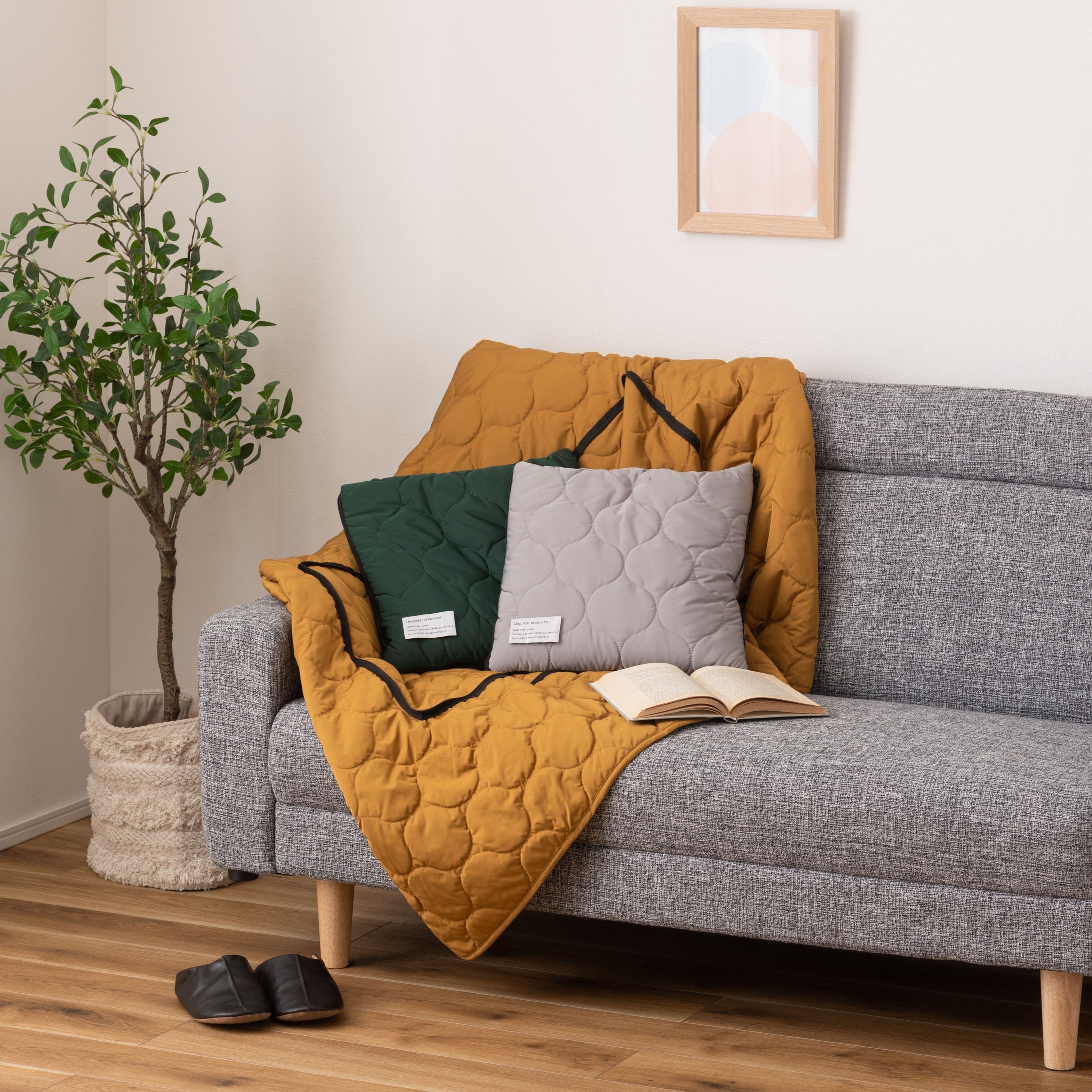 広げるとブランケットに、折りたたんでファスナーを閉じればクッションに。2WAY仕様のクッションブランケット。寒い時期とオフシーズンで使い分けるのもオススメ。アウトドアにもぴったりなデザインで持ち運びもかさばらないので、冬キャンプなどのお供にも。大判サイズなので、身体に掛けて毛布のようにも使えるサイズ。羽織ってもすっぽりと身体を包み込んでくれます。表面はキルティング生地でアウトドアの雰囲気にも合わせやすく、裏面はボア生地で暖かくとっても実用的。