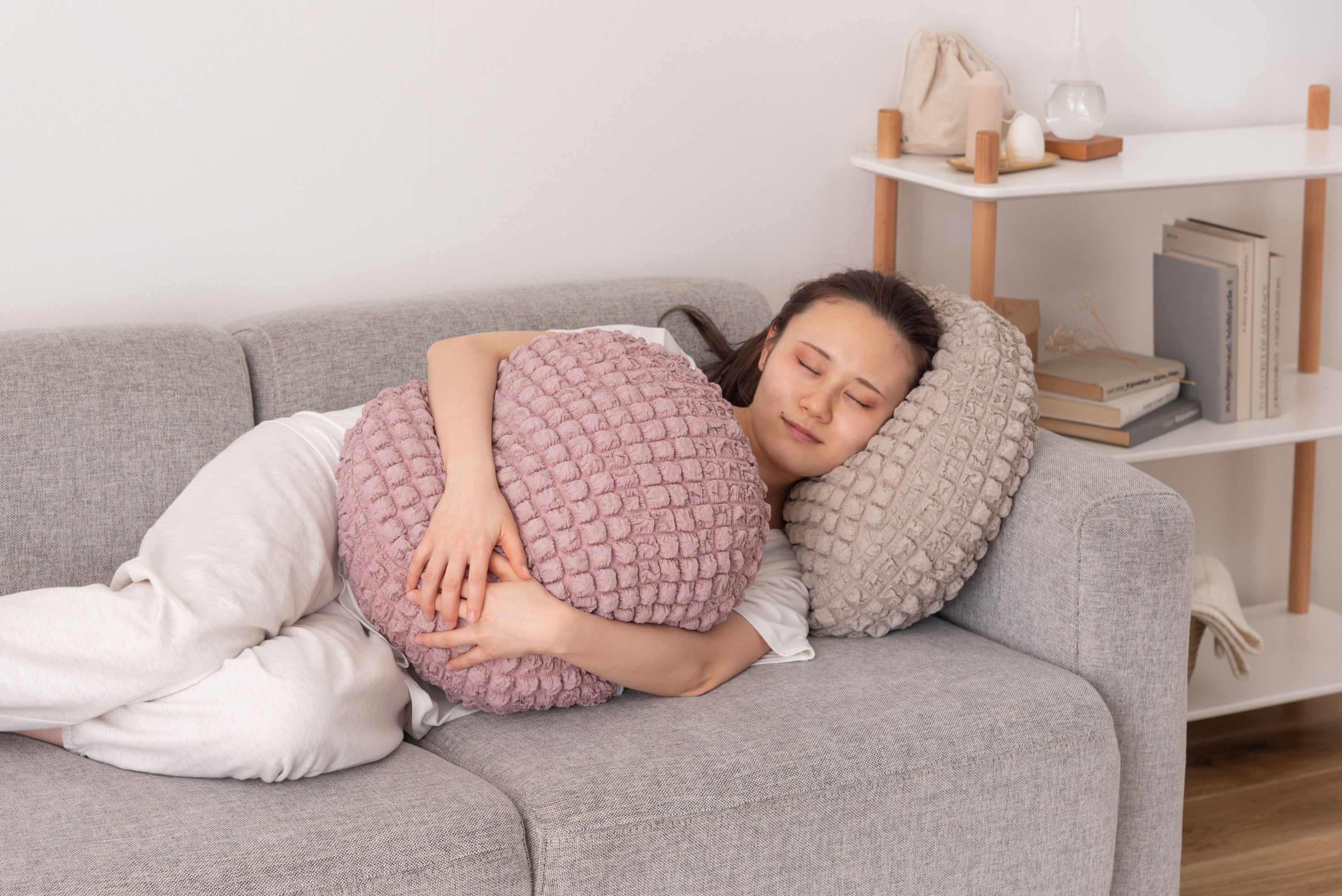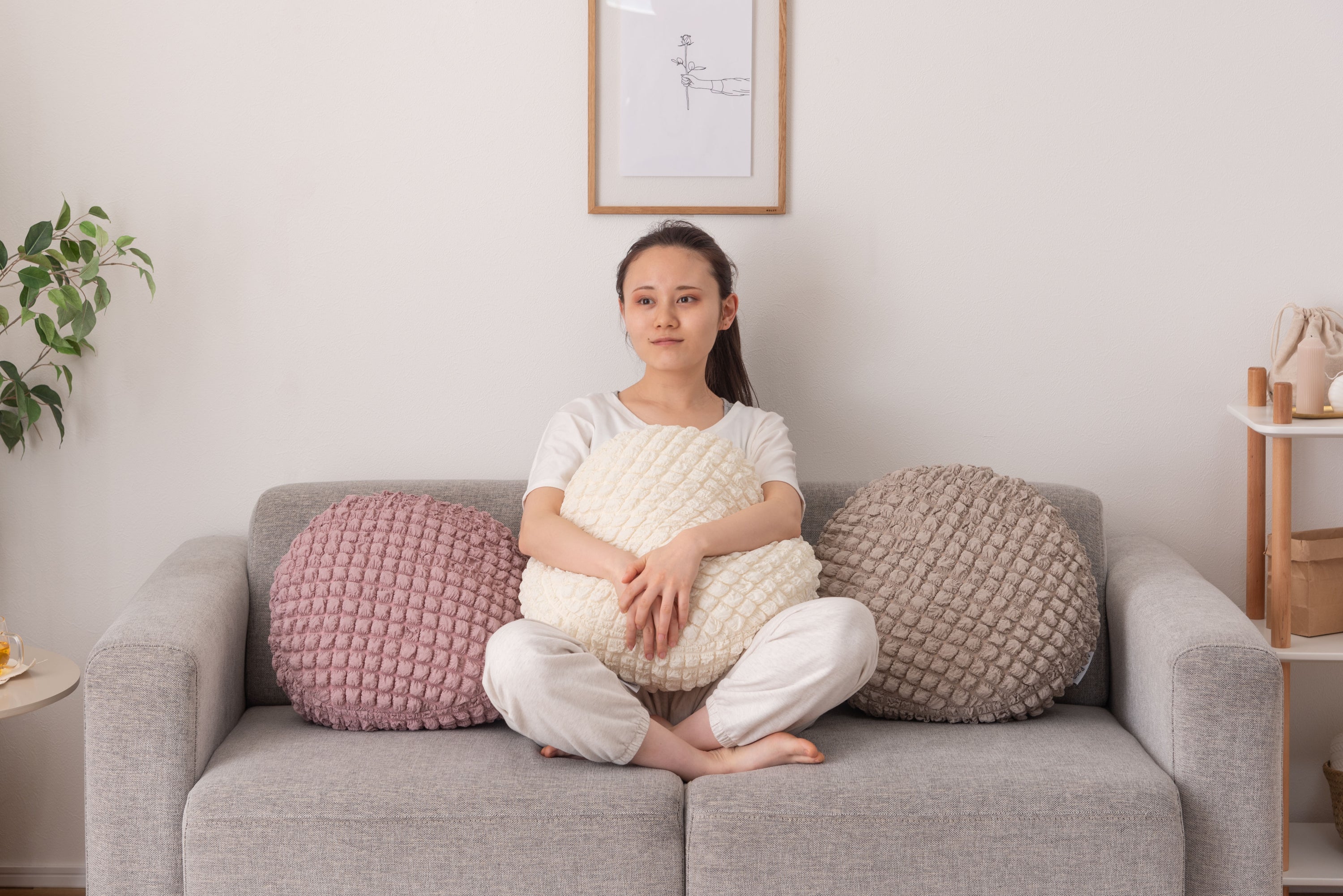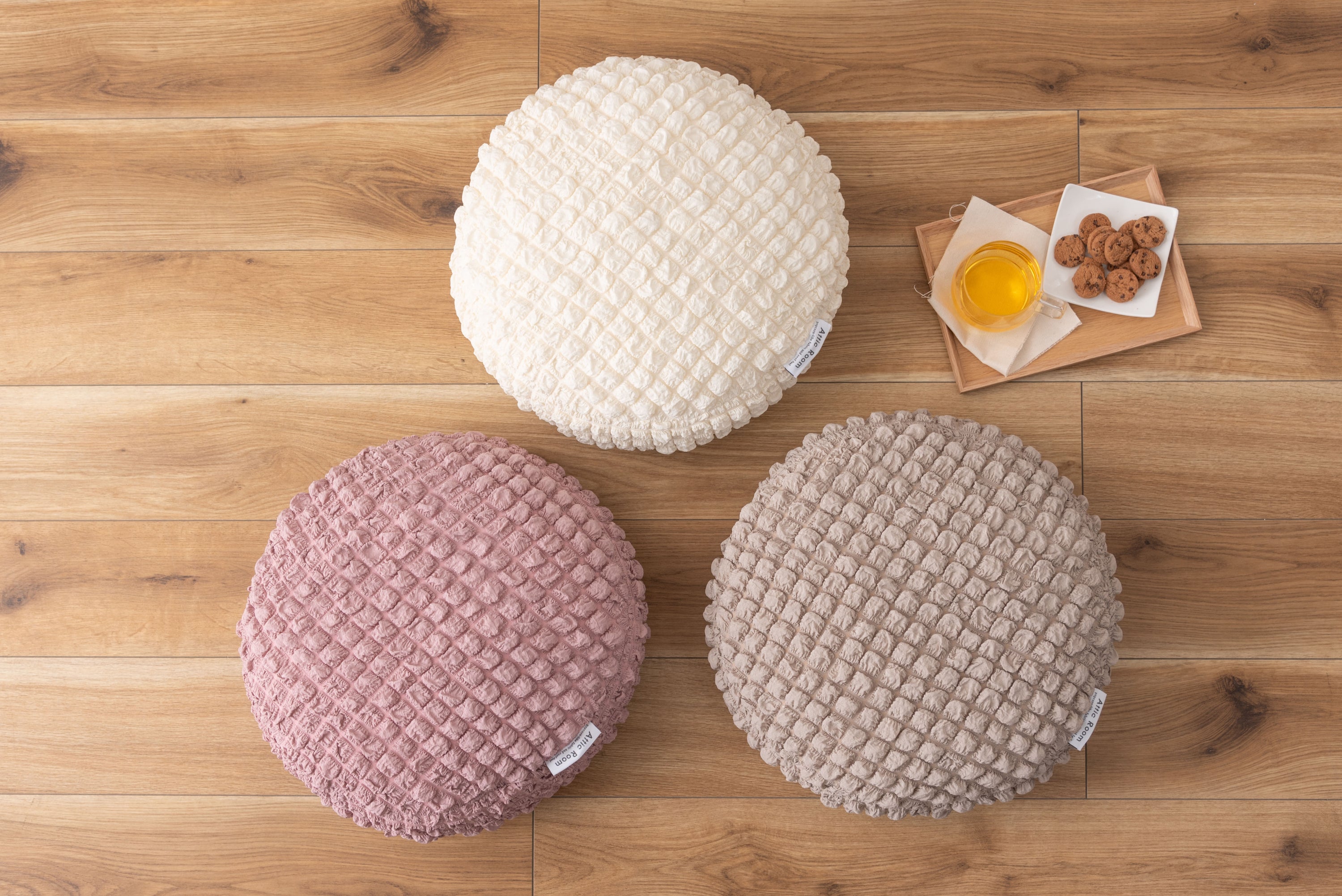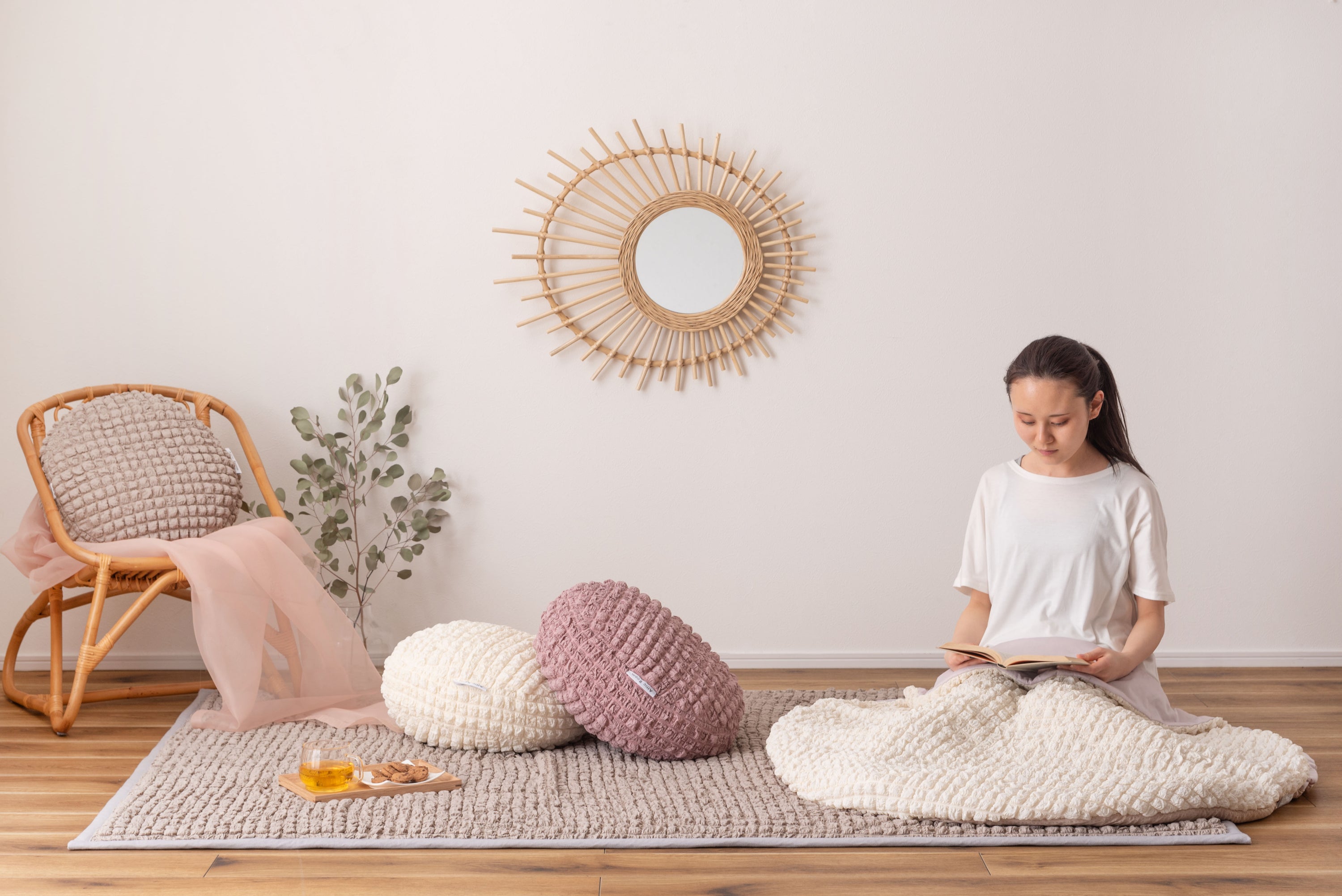 人気のポップコーン生地を使った接触冷感のラウンドクッション。 冷感アイテムにはなかなか無いニュアンスカラー。 インテリアにも合わせやすいデザイン。 もちもち触感が気持ちいいラウンドクッションは置くだけでインテリアに可愛さがプラスされるアイテム。 接触冷感の生地なので、触れるとひんやり気持ちいい。夏の可愛くて心強い相棒。 クッションはもちもちの弾力ある触感。クセになる触り心地。 弾力のあるクッションなので、枕として使うにも最適。 背あてにしたり、膝の上に置いてサポートクッションとしても活躍。 人気のくすみカラーを採用し、インテリアの中で浮いてしまわないデザインに。