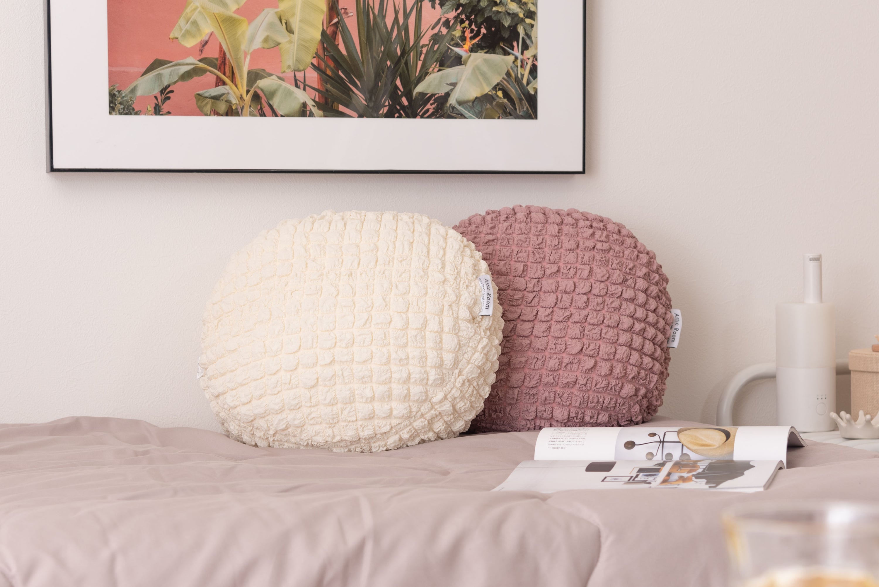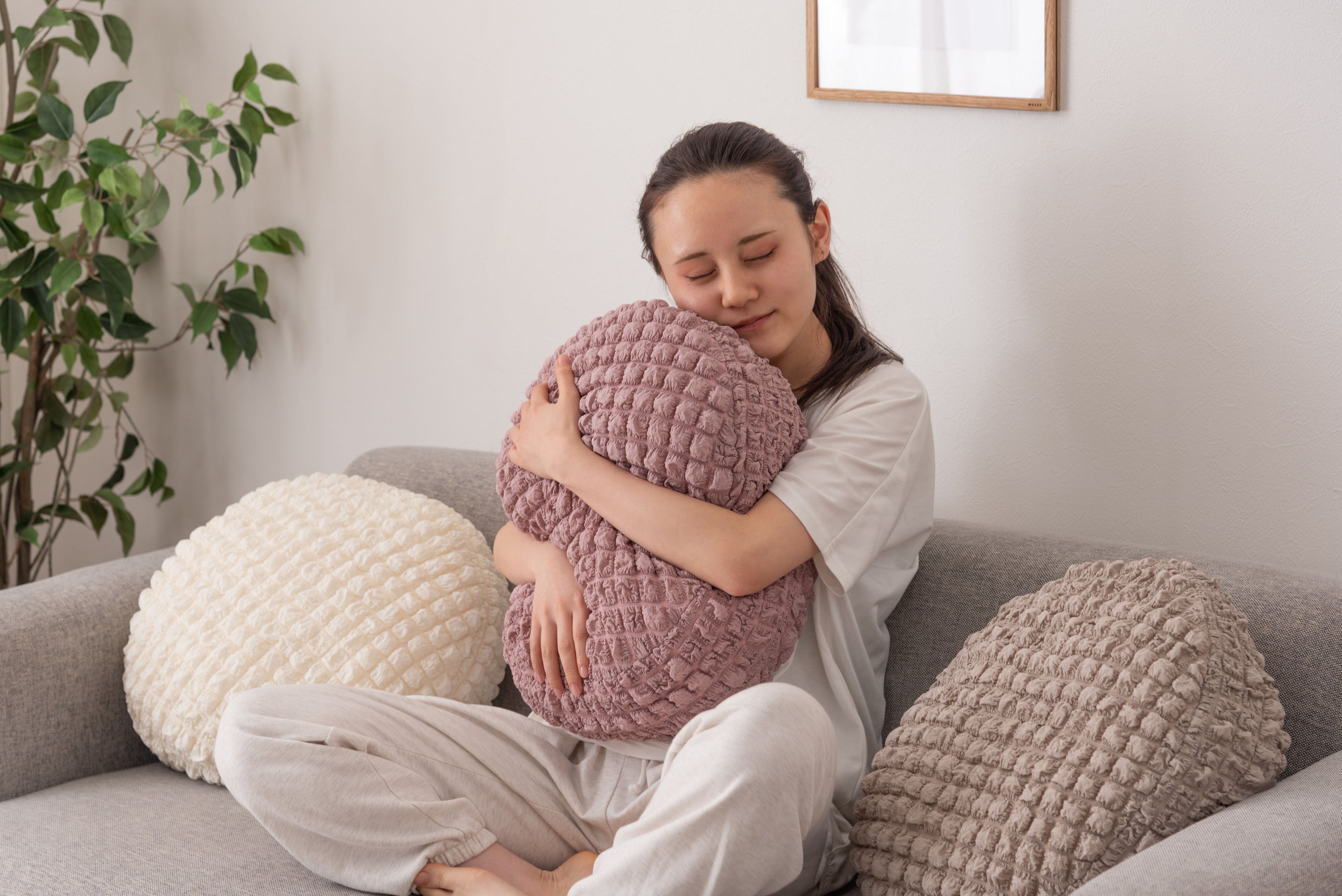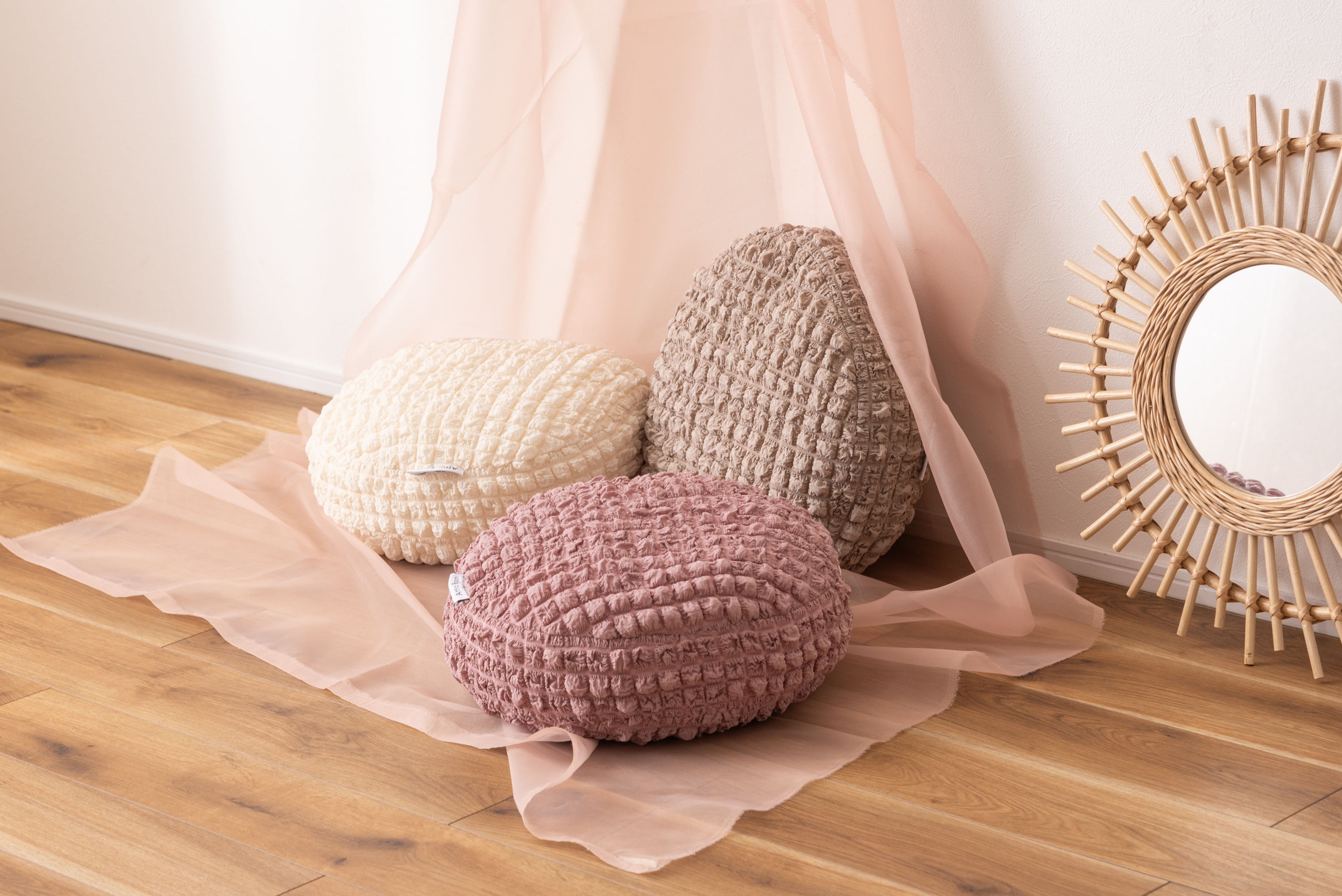人気のポップコーン生地を使った接触冷感のラウンドクッション。 冷感アイテムにはなかなか無いニュアンスカラー。 インテリアにも合わせやすいデザイン。 もちもち触感が気持ちいいラウンドクッションは置くだけでインテリアに可愛さがプラスされるアイテム。 接触冷感の生地なので、触れるとひんやり気持ちいい。夏の可愛くて心強い相棒。 クッションはもちもちの弾力ある触感。クセになる触り心地。 弾力のあるクッションなので、枕として使うにも最適。 背あてにしたり、膝の上に置いてサポートクッションとしても活躍。 人気のくすみカラーを採用し、インテリアの中で浮いてしまわないデザインに。