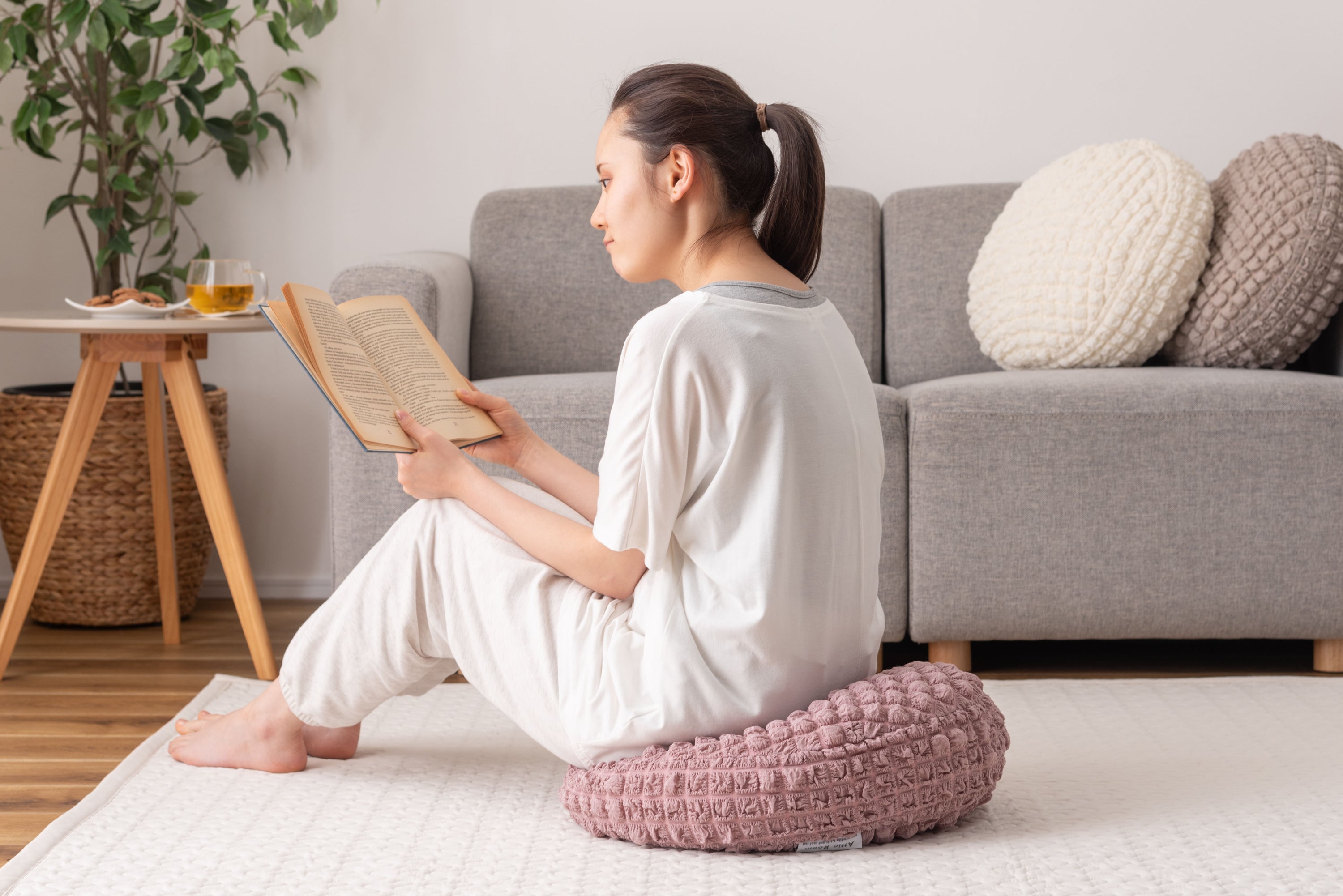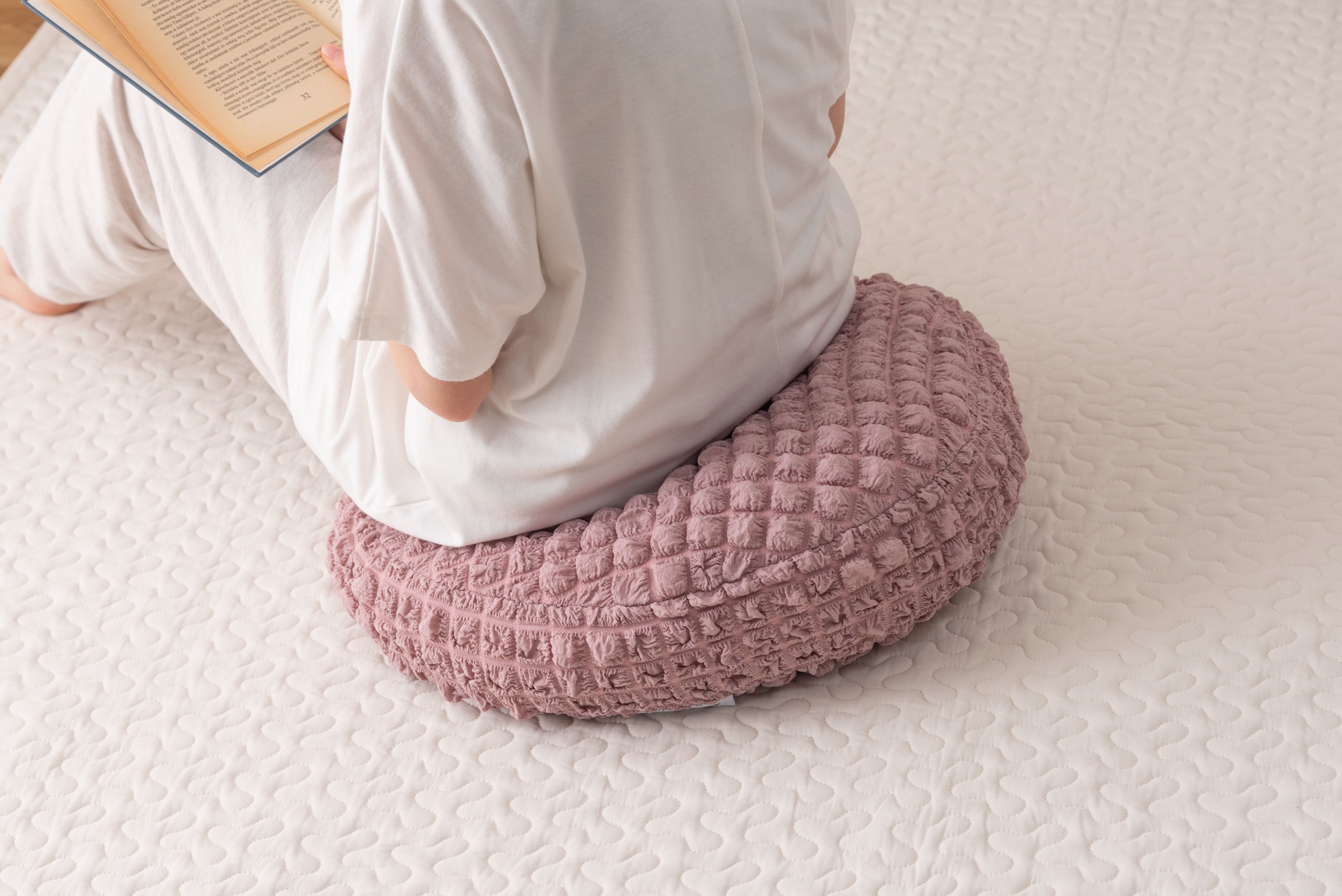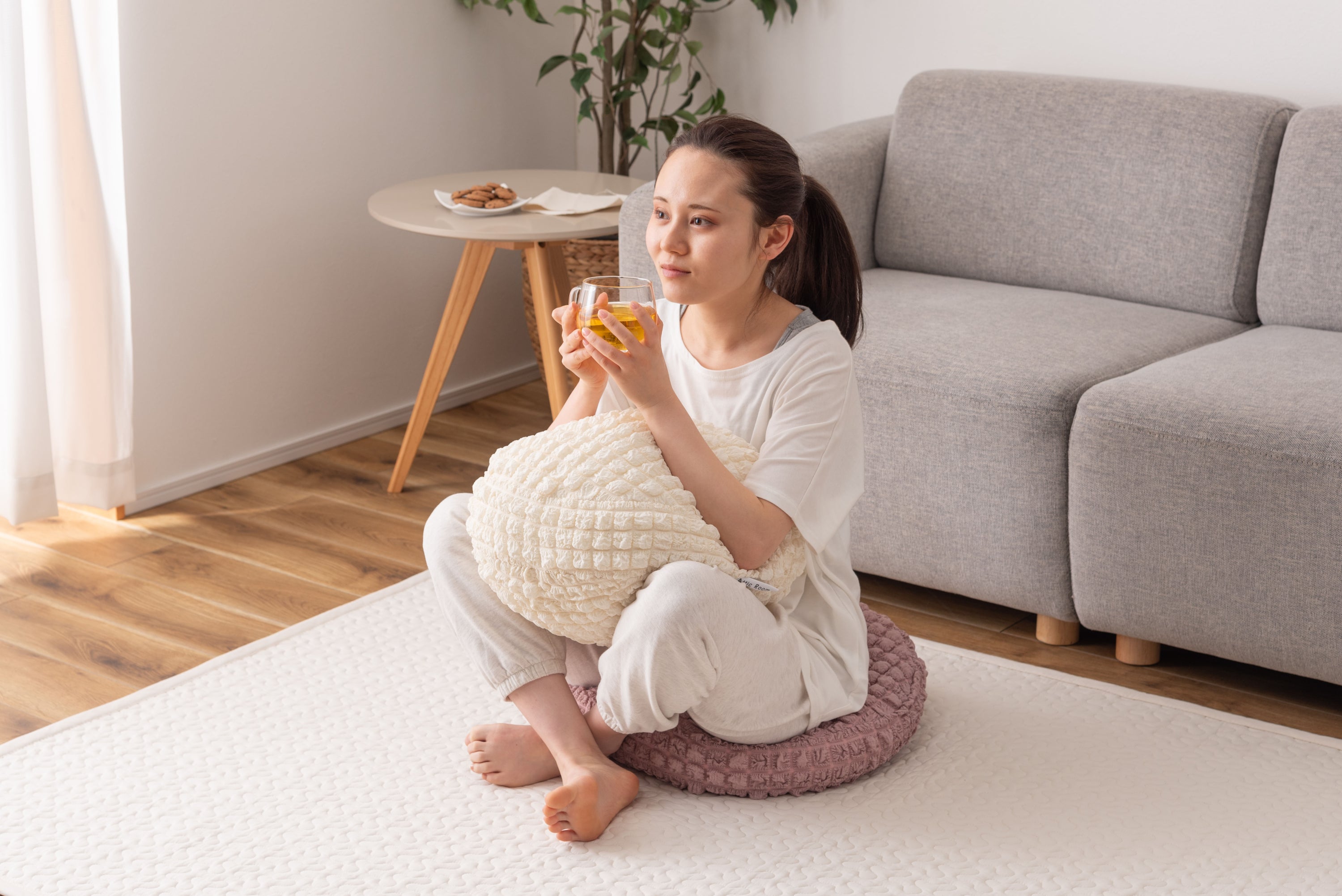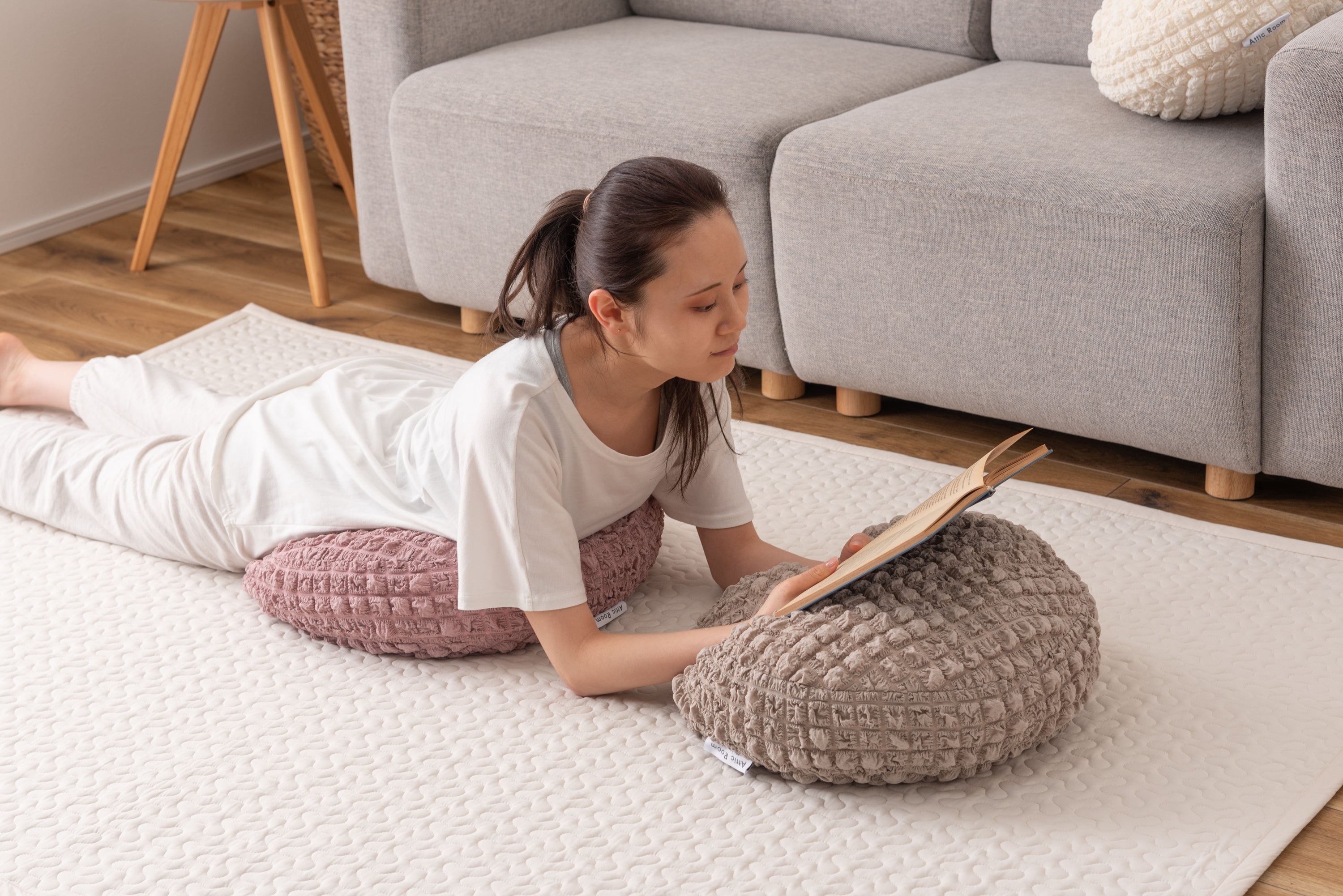 人気のポップコーン生地を使った接触冷感のラウンドクッション。 冷感アイテムにはなかなか無いニュアンスカラー。 インテリアにも合わせやすいデザイン。 もちもち触感が気持ちいいラウンドクッションは置くだけでインテリアに可愛さがプラスされるアイテム。 接触冷感の生地なので、触れるとひんやり気持ちいい。夏の可愛くて心強い相棒。 クッションはもちもちの弾力ある触感。クセになる触り心地。 弾力のあるクッションなので、枕として使うにも最適。 背あてにしたり、膝の上に置いてサポートクッションとしても活躍。 人気のくすみカラーを採用し、インテリアの中で浮いてしまわないデザインに。