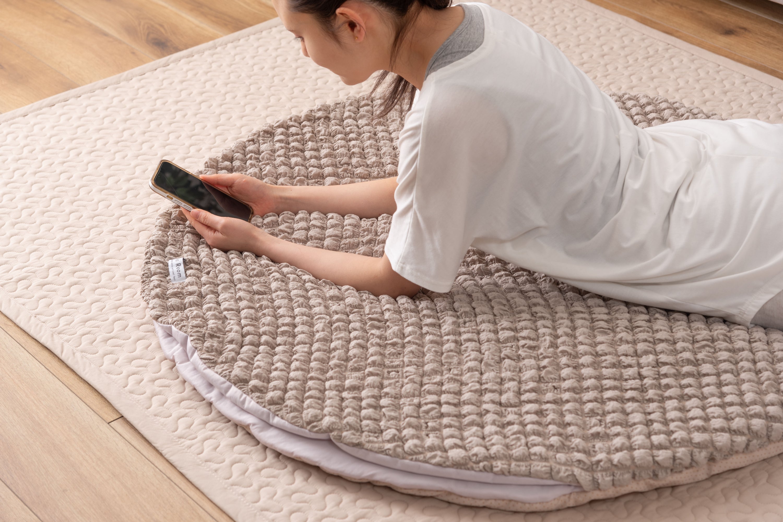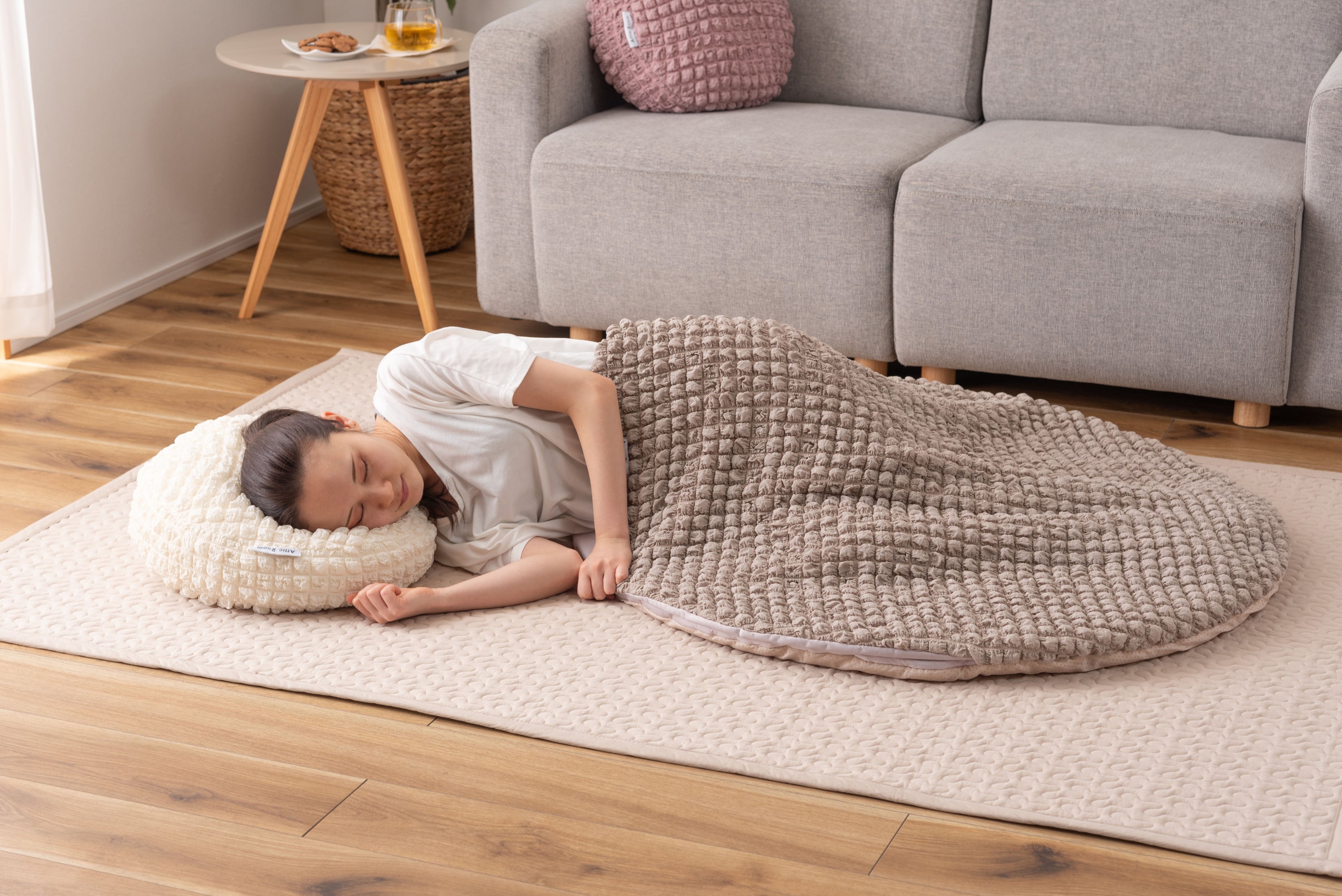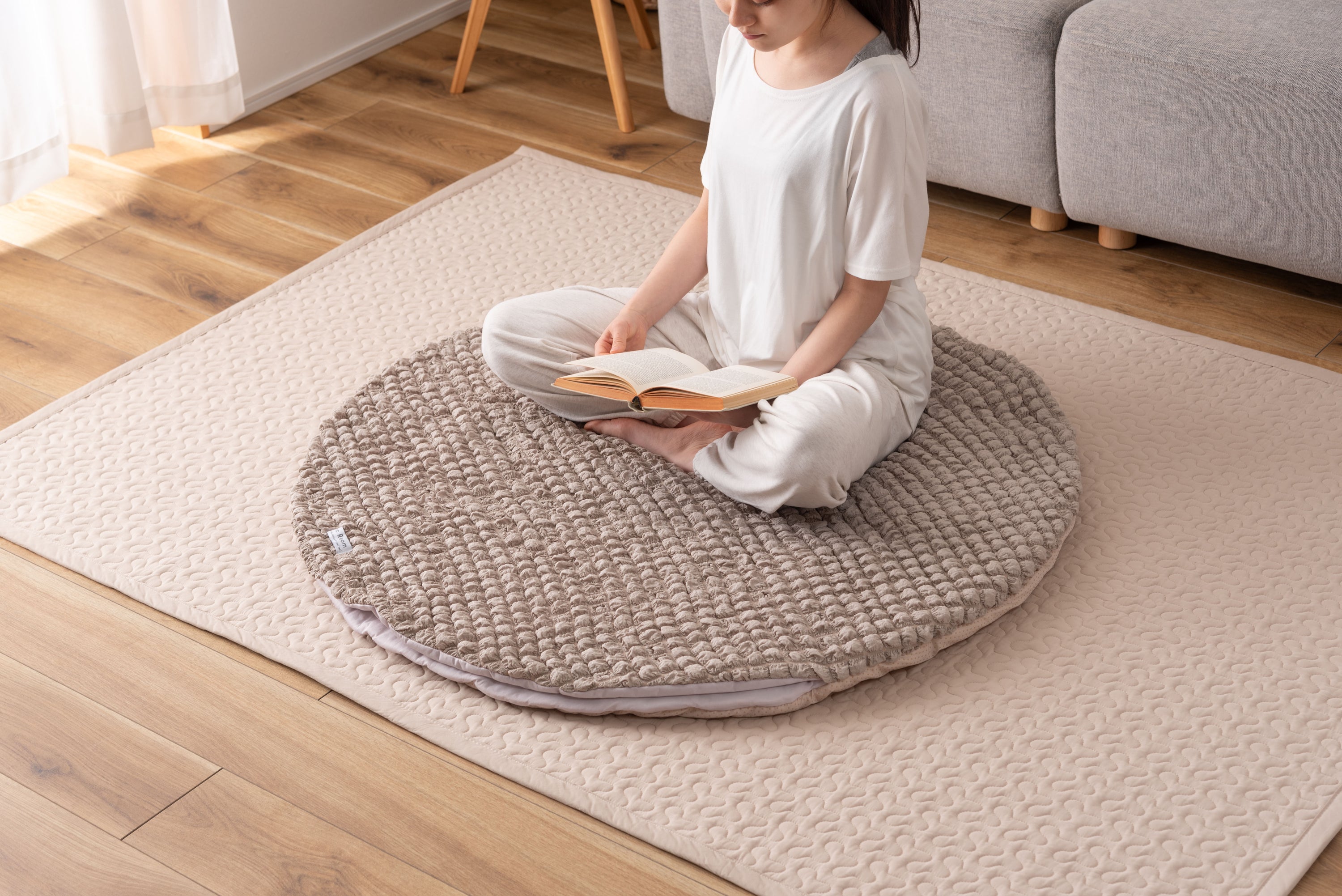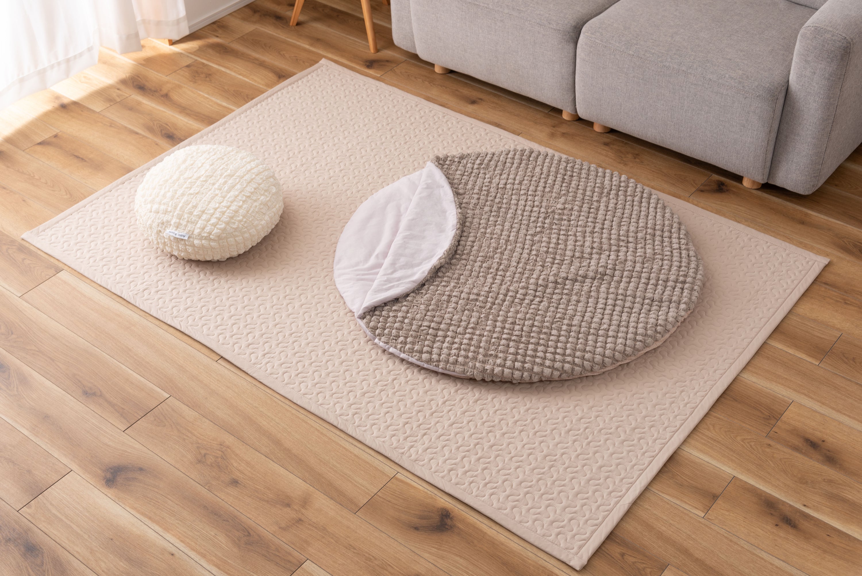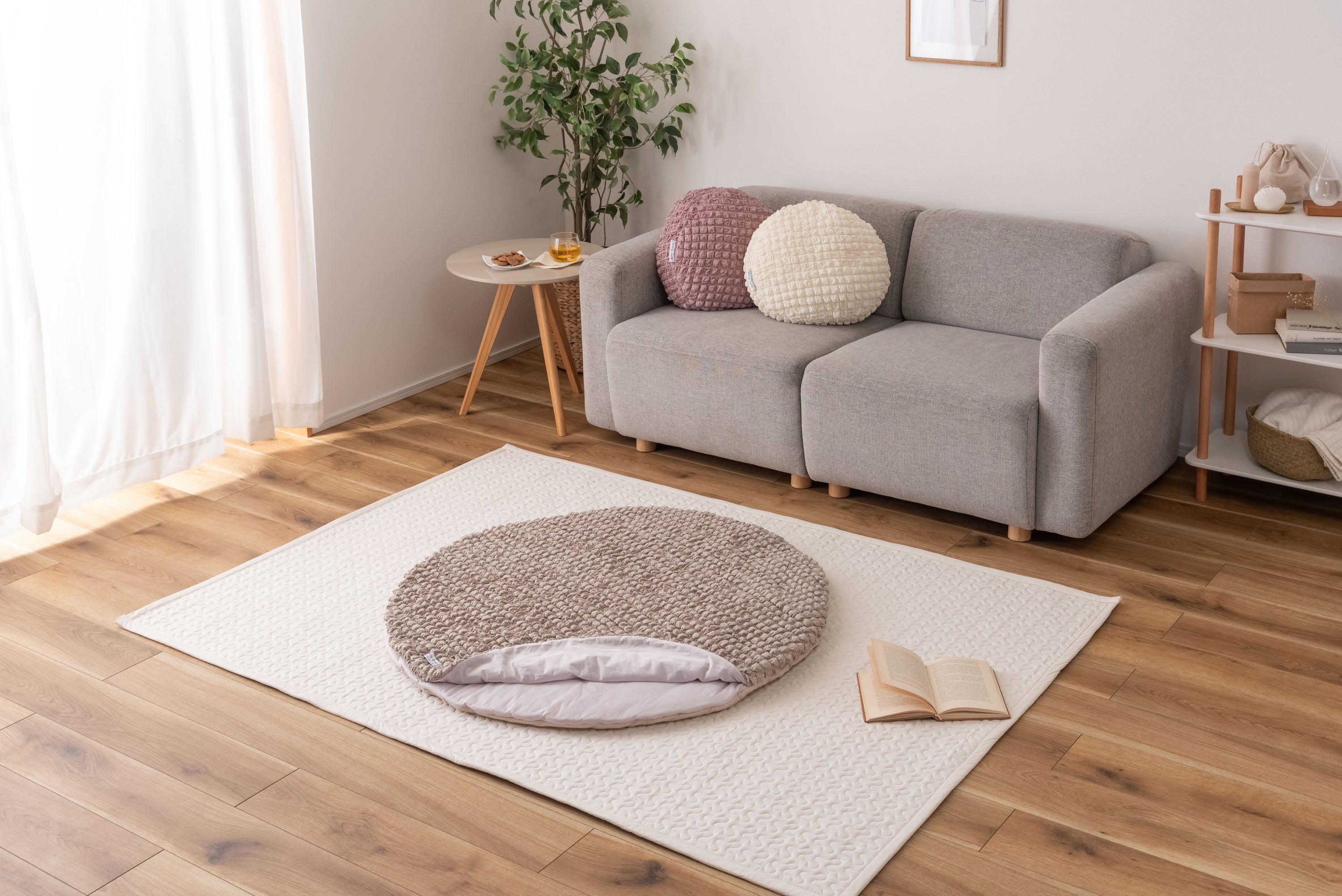 人気のポップコーン生地を使った接触冷感のラウンドサンドクッション。 冷感アイテムにはなかなか無いニュアンスカラー。 インテリアにも合わせやすいデザイン。 中に入れる形状になっているサンドクッションは、表生地・中生地ともに接触冷感仕様。 夏の室内をひんやり快適に過ごす事が出来るアイテム。 底部分はクッション性があるので、お昼寝タイムにも活躍。 中に入って使うだけでなく、上に乗ってフロアクッションの様な使い方をするのもオススメ。 底面はクッション性のあるウレタンを使用。 表面のポップコーン生地、中面の生地のどちらも接触冷感仕様。 裏面には滑り止めが施されているので、フローリングの上などで使う際はズレにくく快適。 人気のくすみカラーを採用。