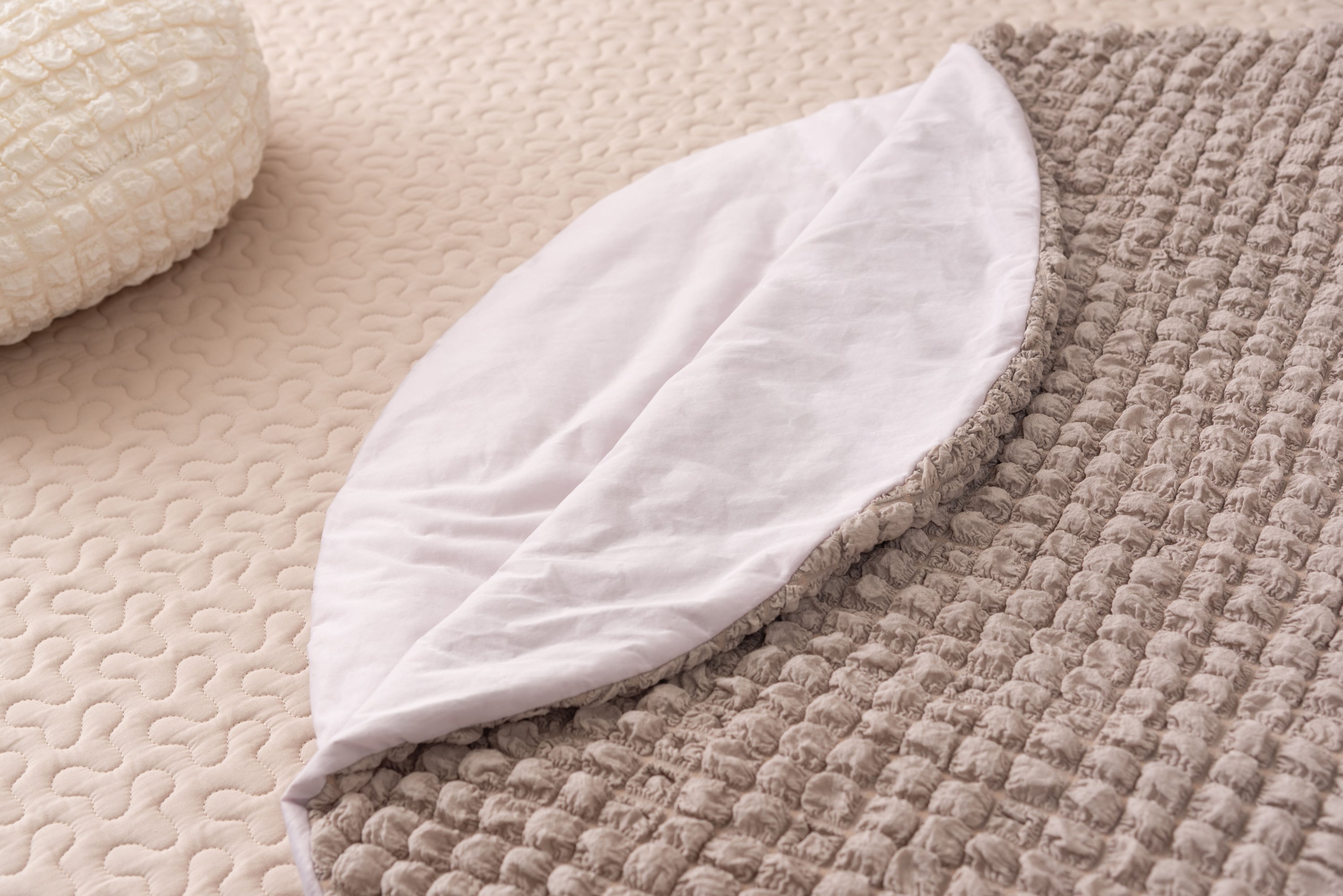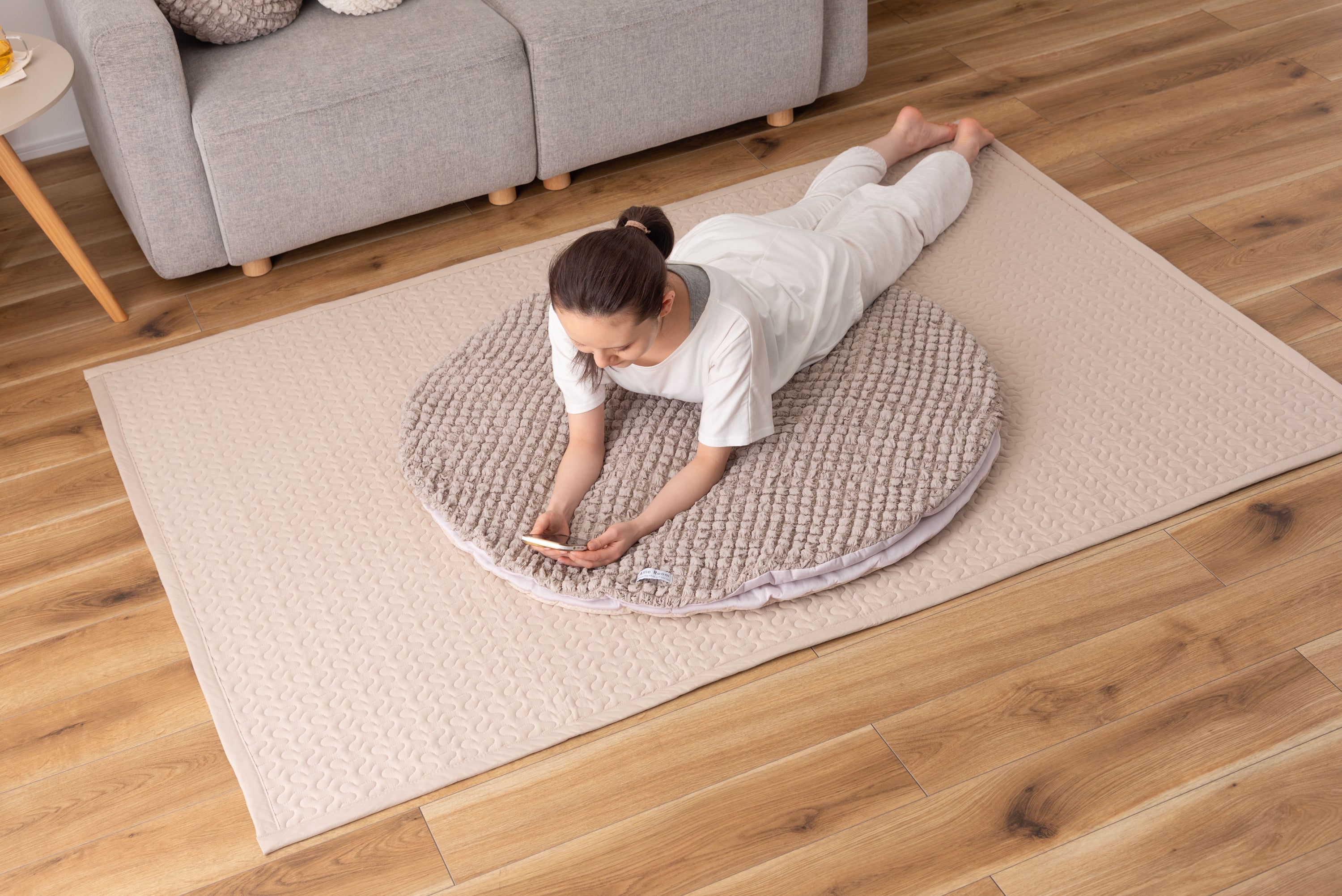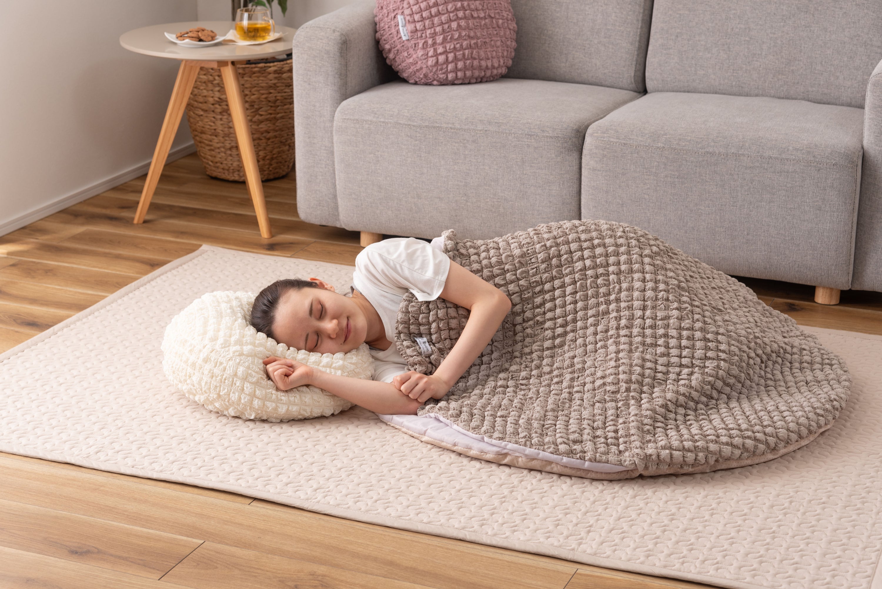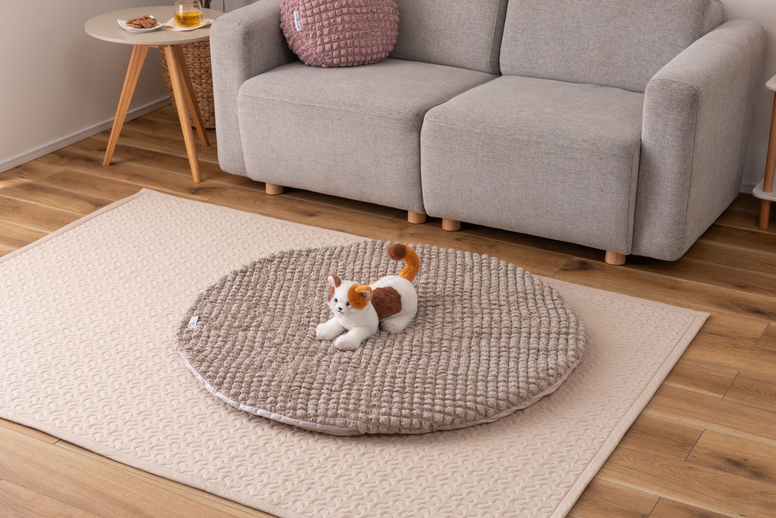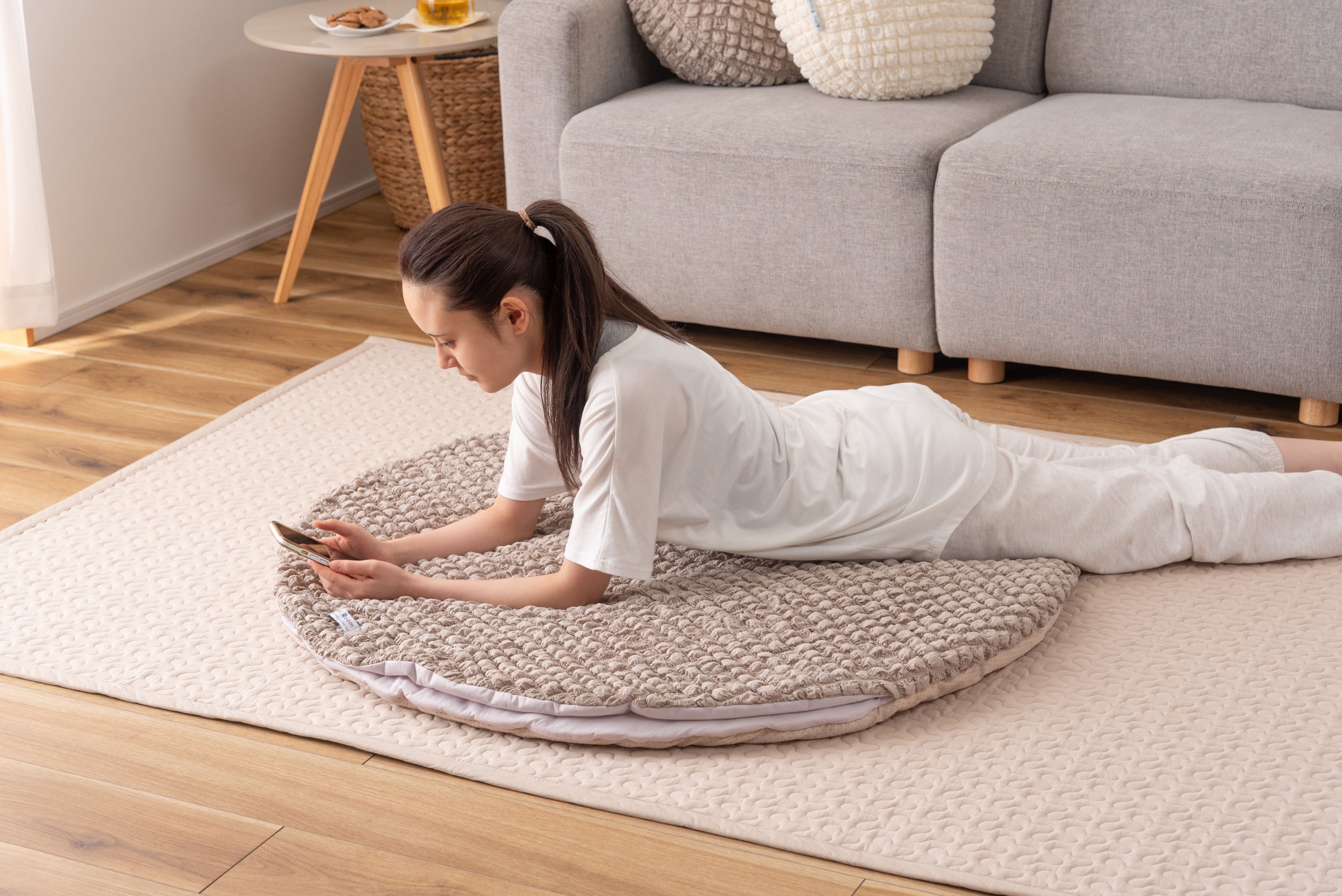 人気のポップコーン生地を使った接触冷感のラウンドサンドクッション。 冷感アイテムにはなかなか無いニュアンスカラー。 インテリアにも合わせやすいデザイン。 中に入れる形状になっているサンドクッションは、表生地・中生地ともに接触冷感仕様。 夏の室内をひんやり快適に過ごす事が出来るアイテム。 底部分はクッション性があるので、お昼寝タイムにも活躍。 中に入って使うだけでなく、上に乗ってフロアクッションの様な使い方をするのもオススメ。 底面はクッション性のあるウレタンを使用。 表面のポップコーン生地、中面の生地のどちらも接触冷感仕様。 裏面には滑り止めが施されているので、フローリングの上などで使う際はズレにくく快適。 人気のくすみカラーを採用。