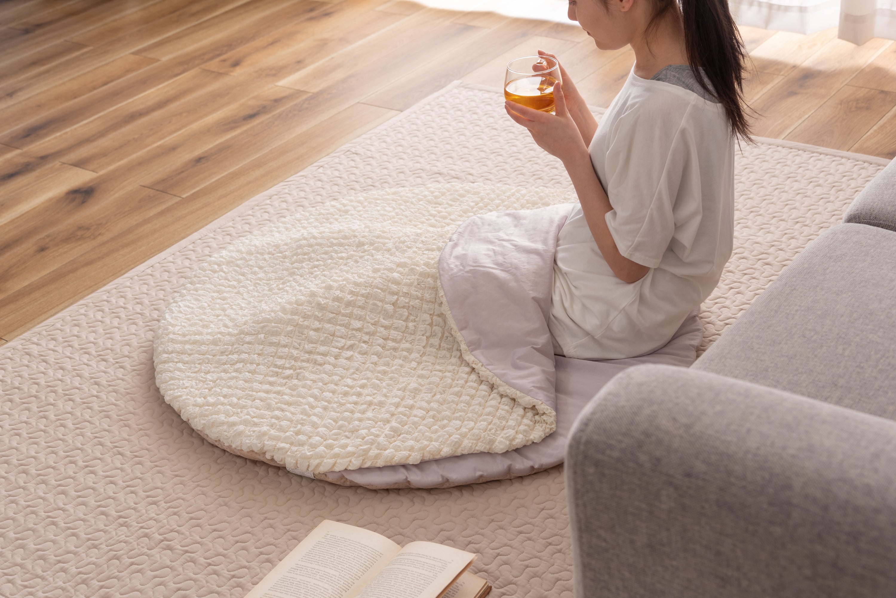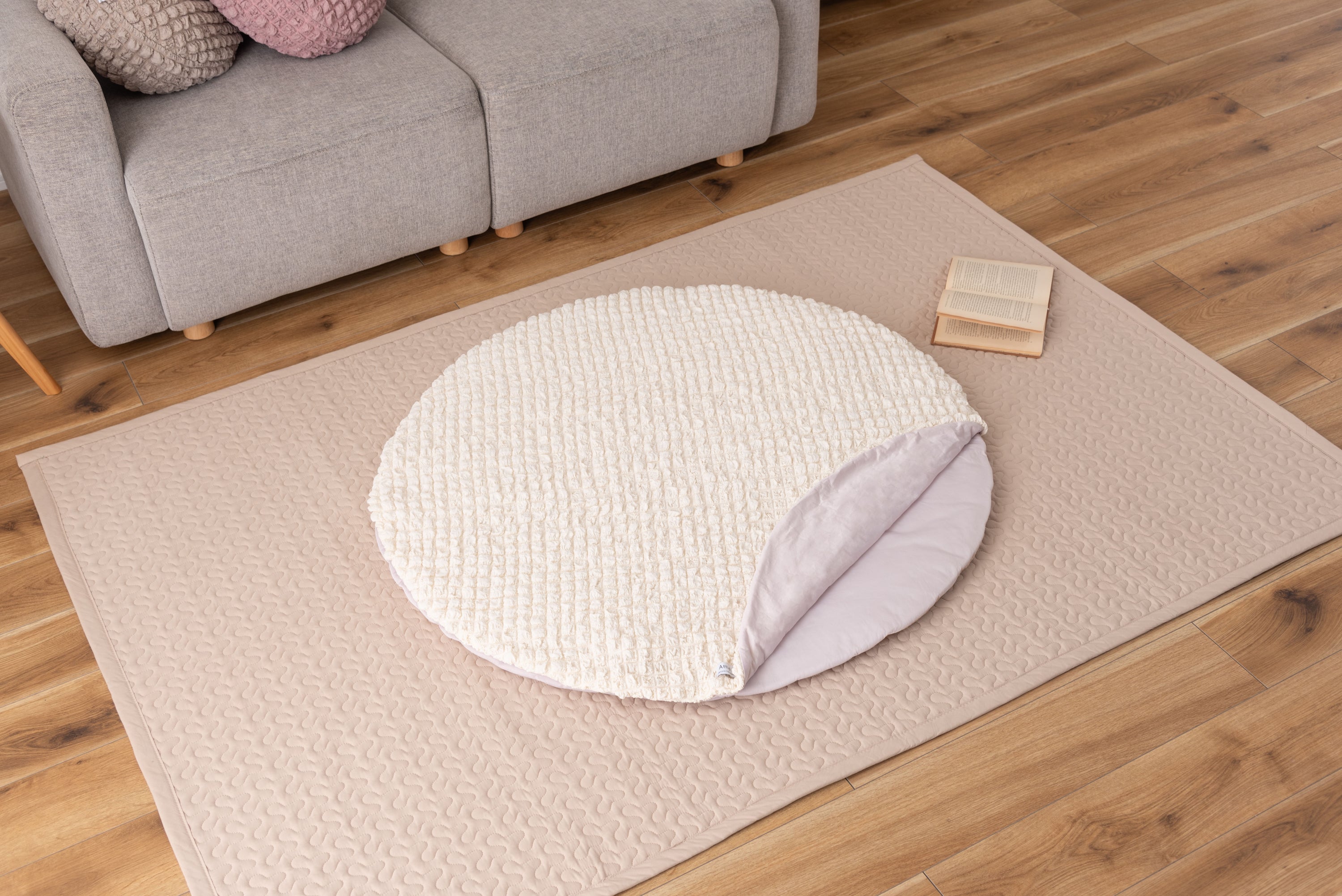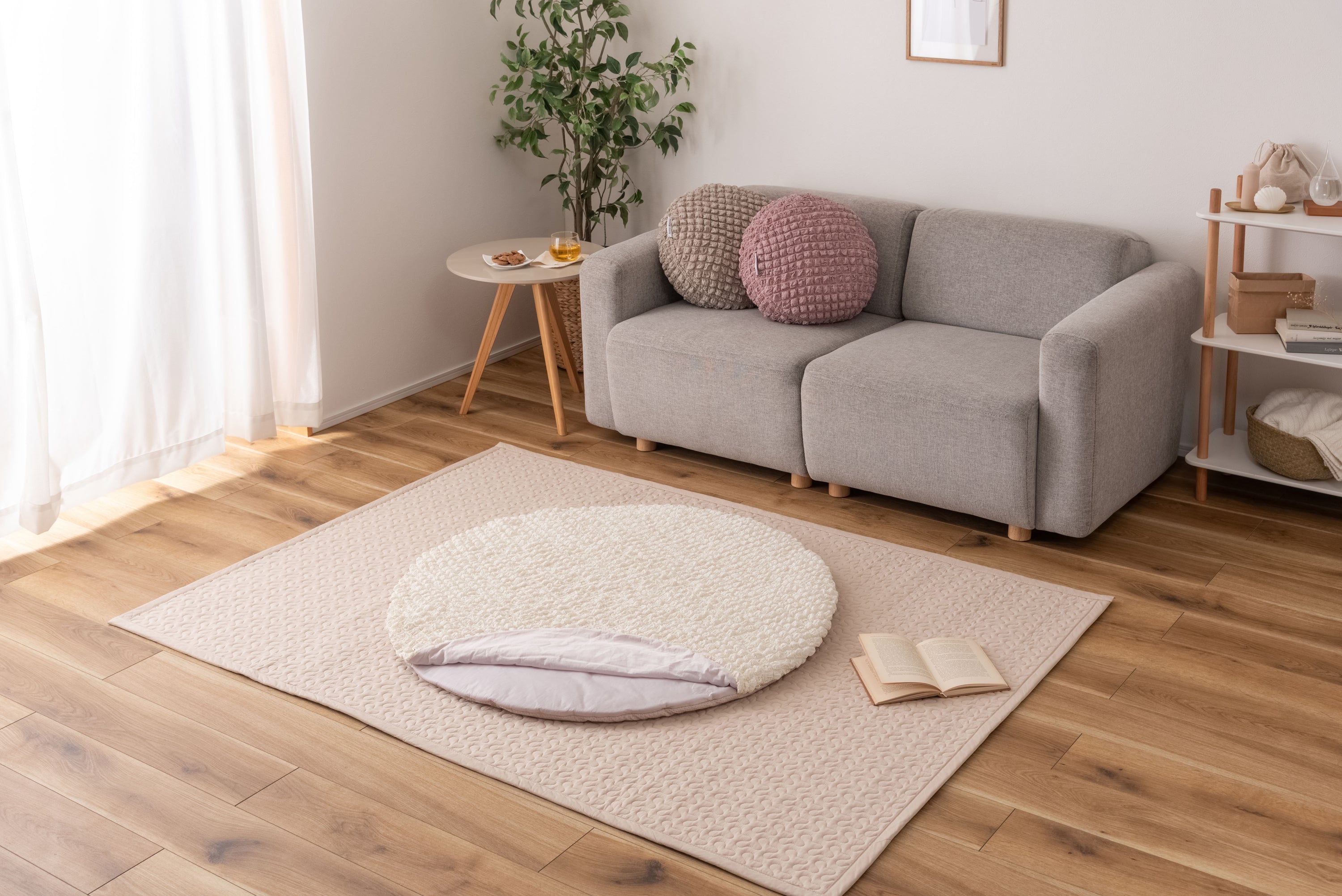 人気のポップコーン生地を使った接触冷感のラウンドサンドクッション。 冷感アイテムにはなかなか無いニュアンスカラー。 インテリアにも合わせやすいデザイン。 中に入れる形状になっているサンドクッションは、表生地・中生地ともに接触冷感仕様。 夏の室内をひんやり快適に過ごす事が出来るアイテム。 底部分はクッション性があるので、お昼寝タイムにも活躍。 中に入って使うだけでなく、上に乗ってフロアクッションの様な使い方をするのもオススメ。 底面はクッション性のあるウレタンを使用。 表面のポップコーン生地、中面の生地のどちらも接触冷感仕様。 裏面には滑り止めが施されているので、フローリングの上などで使う際はズレにくく快適。 人気のくすみカラーを採用。