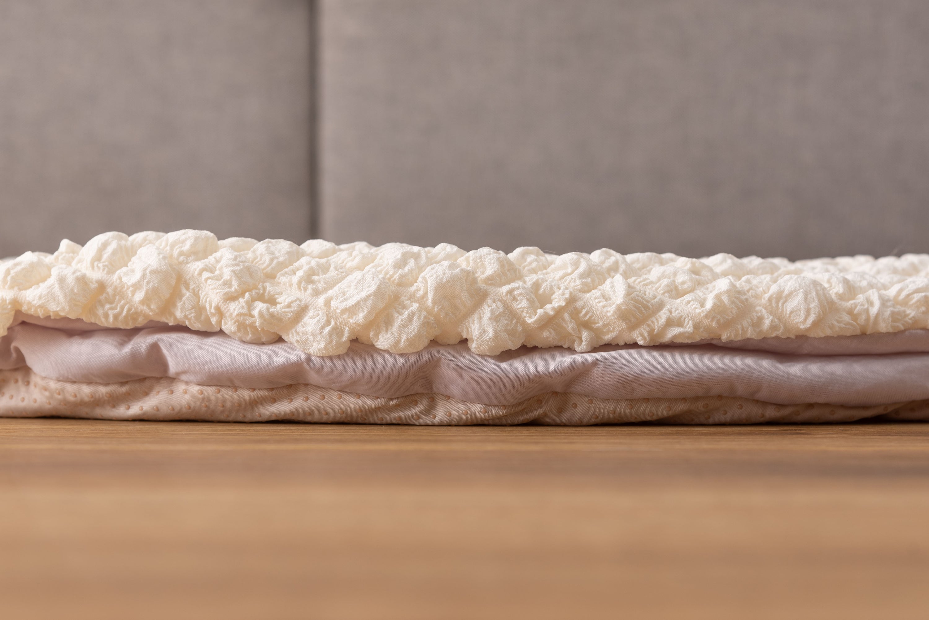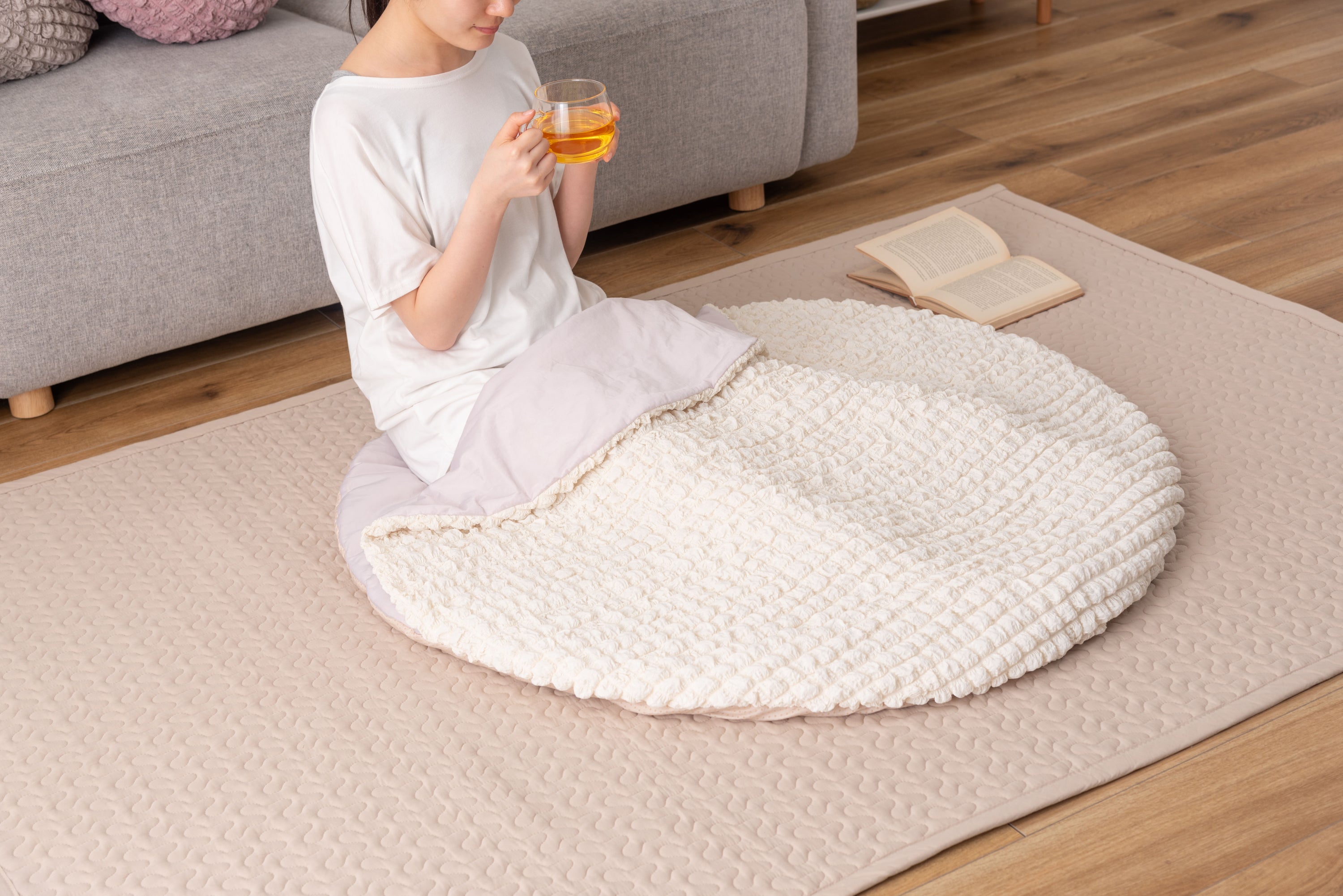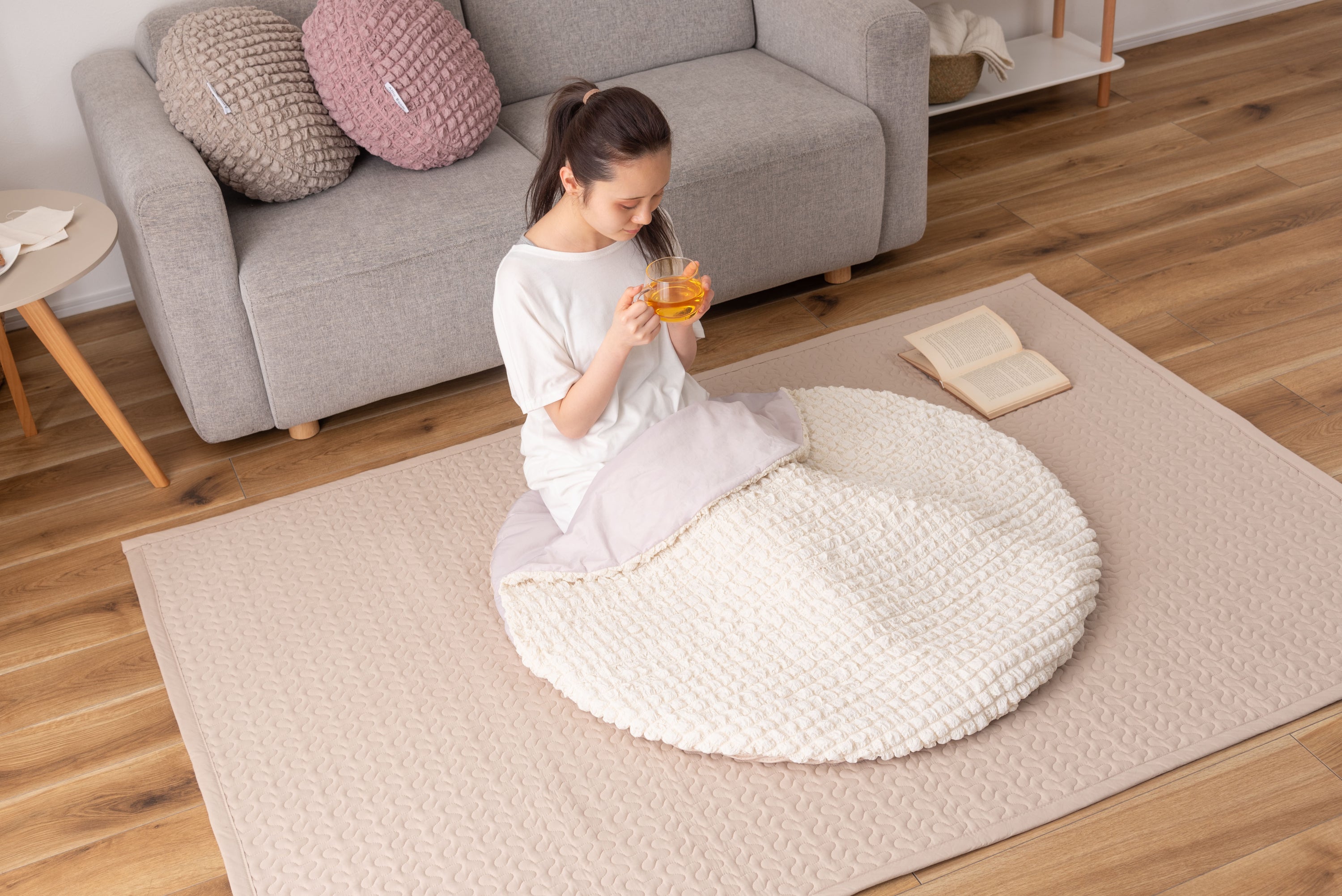 人気のポップコーン生地を使った接触冷感のラウンドサンドクッション。 冷感アイテムにはなかなか無いニュアンスカラー。 インテリアにも合わせやすいデザイン。 中に入れる形状になっているサンドクッションは、表生地・中生地ともに接触冷感仕様。 夏の室内をひんやり快適に過ごす事が出来るアイテム。 底部分はクッション性があるので、お昼寝タイムにも活躍。 中に入って使うだけでなく、上に乗ってフロアクッションの様な使い方をするのもオススメ。 底面はクッション性のあるウレタンを使用。 表面のポップコーン生地、中面の生地のどちらも接触冷感仕様。 裏面には滑り止めが施されているので、フローリングの上などで使う際はズレにくく快適。 人気のくすみカラーを採用。