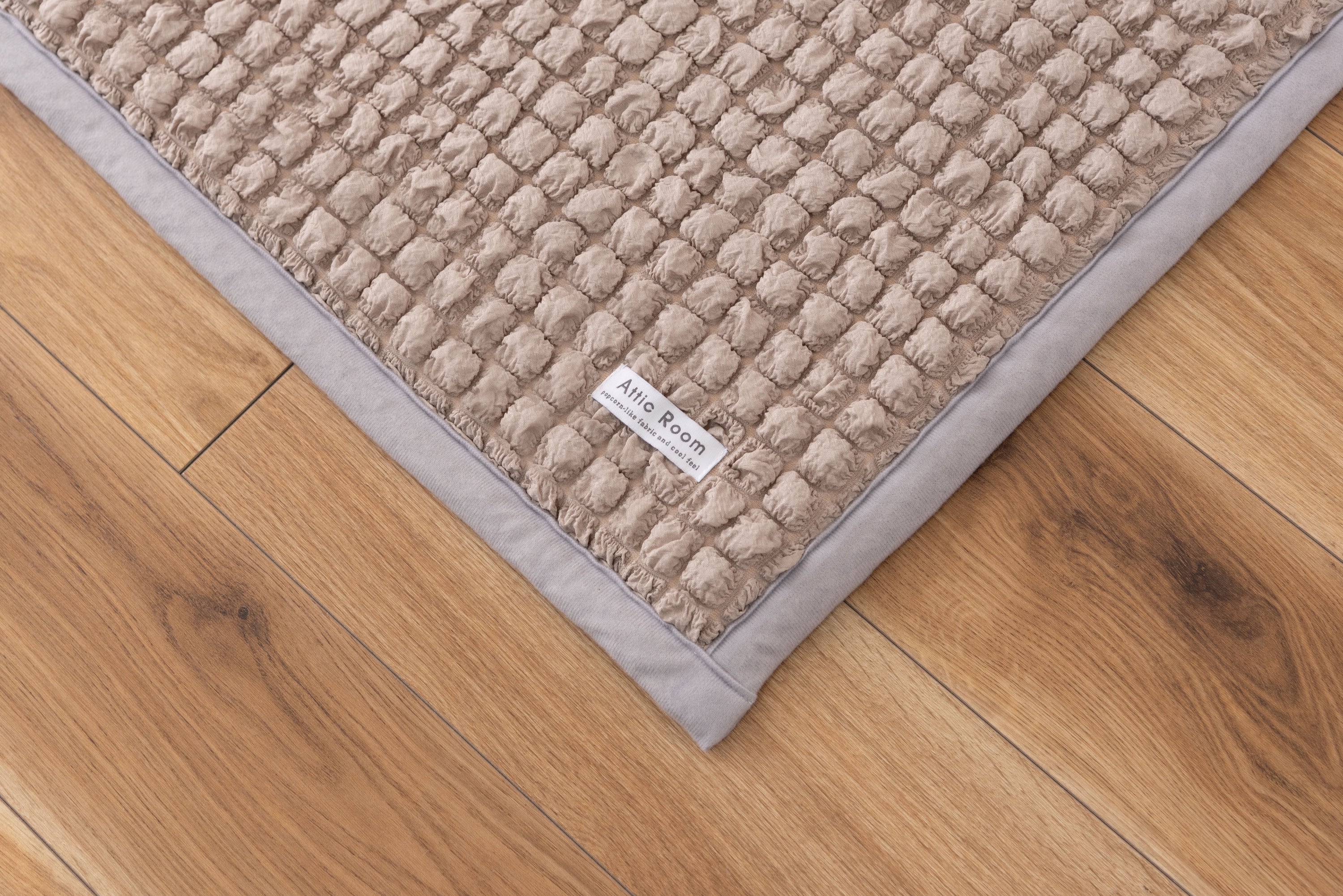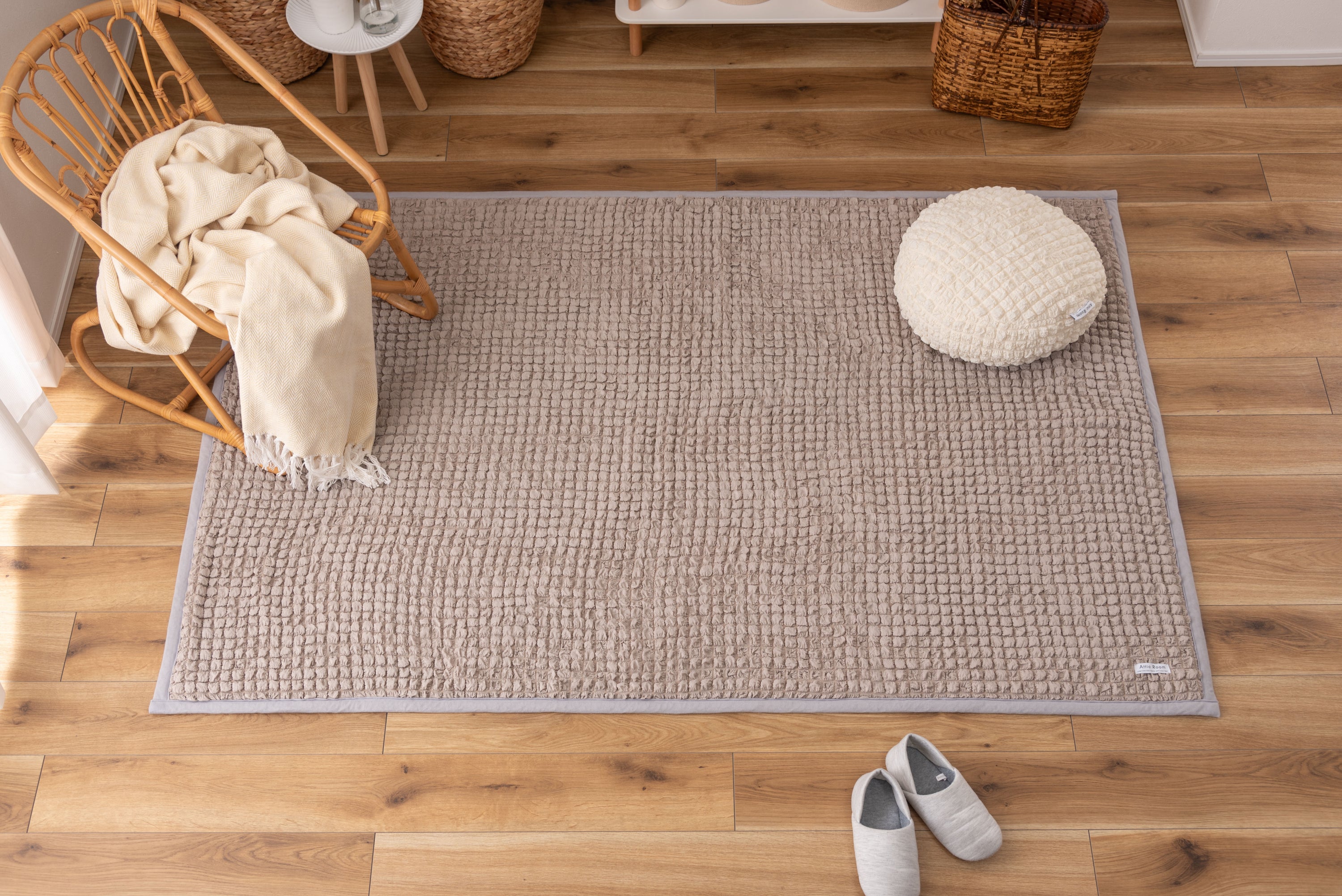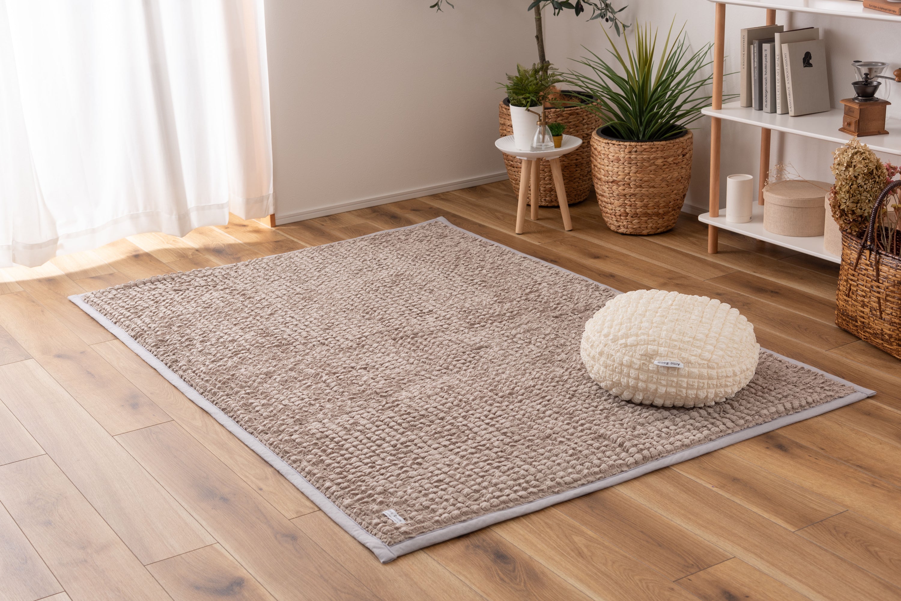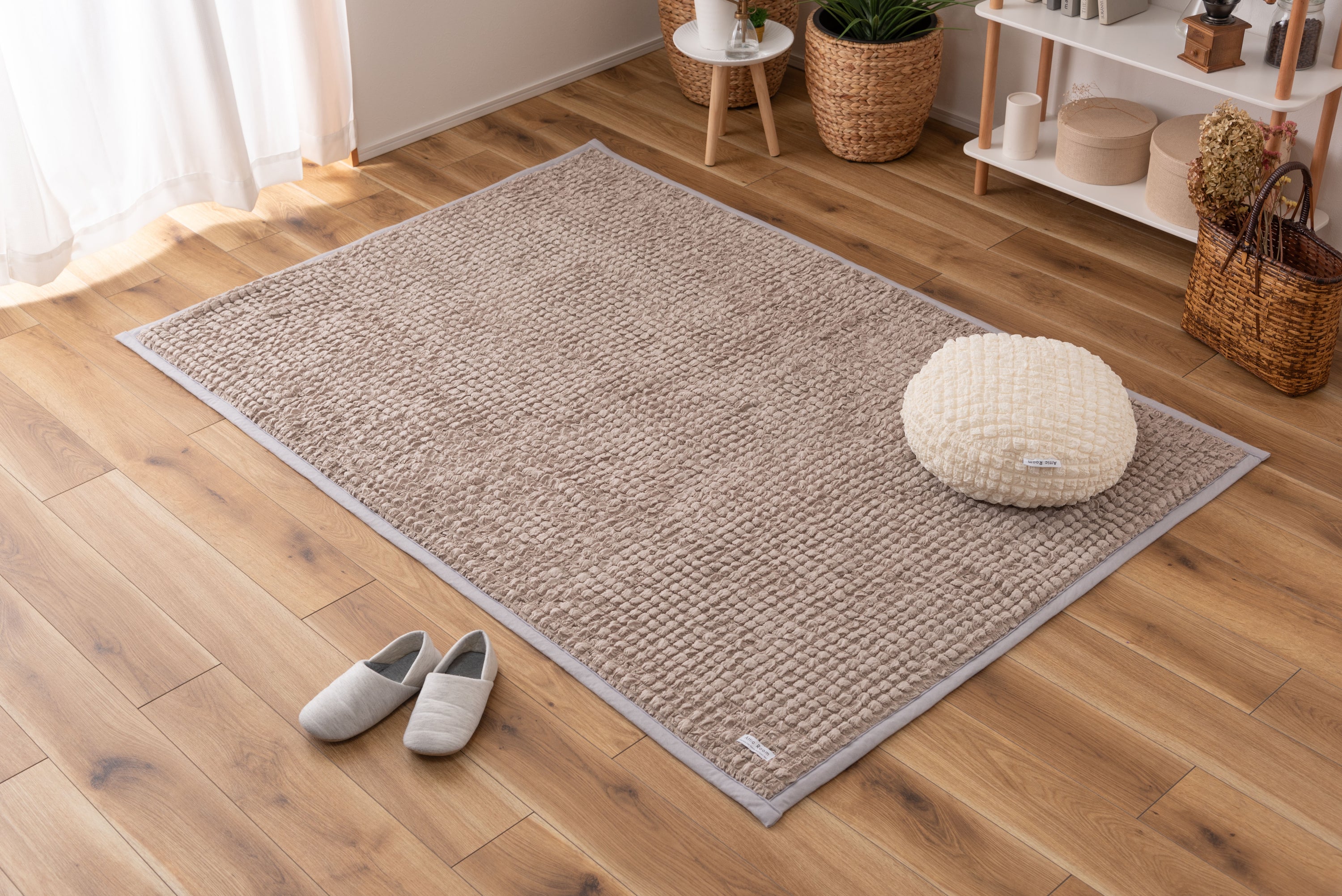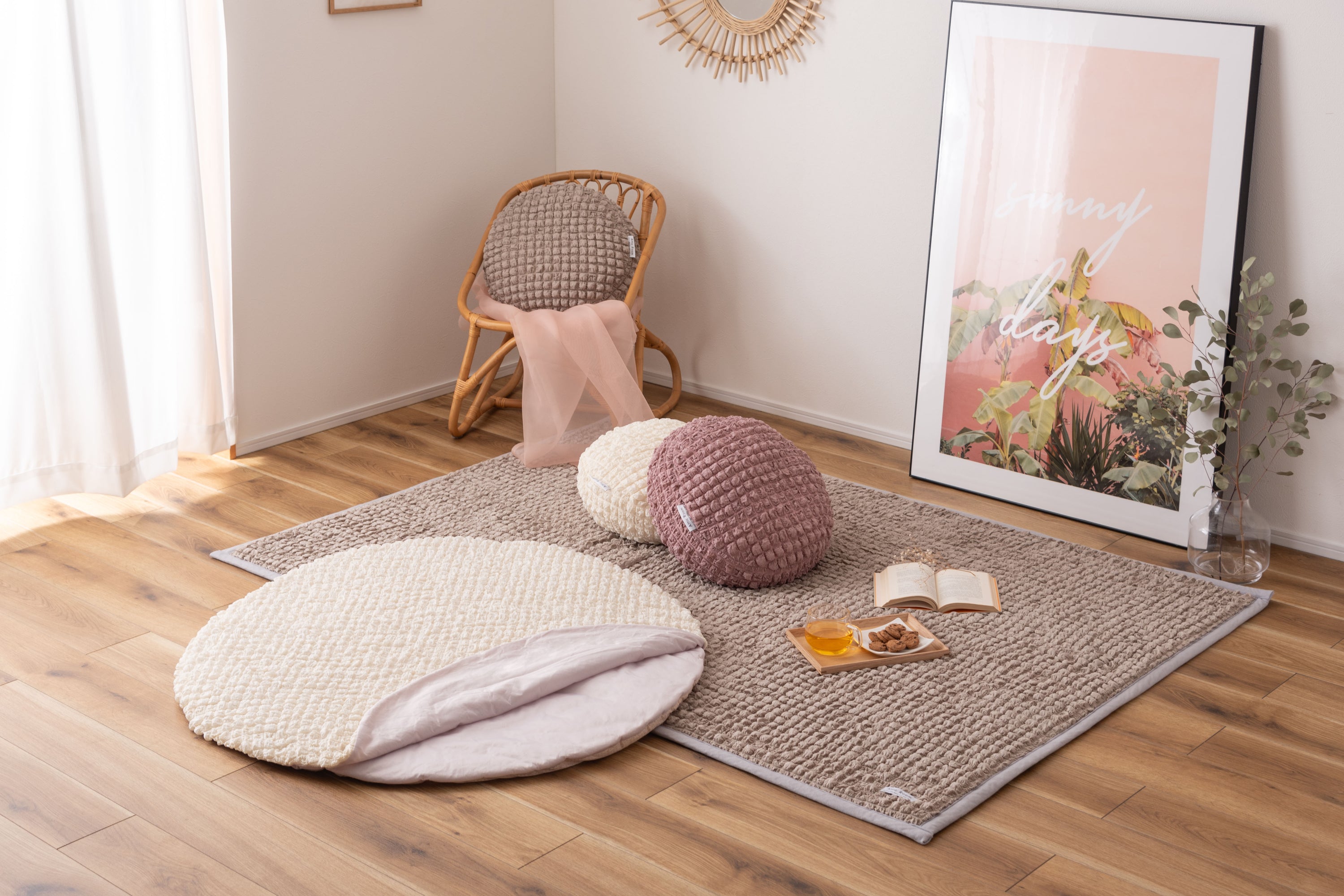 人気のポップコーン生地を使った接触冷感のポップコーンラグ。 冷感アイテムにはなかなか無いニュアンスカラー。 インテリアにも合わせやすいデザイン。 程よいクッション性のあるラグマット。 ふんわりひんやり触感の使い心地の良いラグ。 お部屋の主役になってくれる可愛い見た目もポイント。 ポップコーン生地が接触冷感になった、夏のお部屋をひんやり快適に過ごせるアイテム。 ウレタンを使用し程よいクッション性があるので、ふんわり気持ちよく使う事が出来ます。 扱いやすい軽量設計で、干したり収納したりがラクラク。 裏面は滑り止め付きで、お子様がいるご家庭でも安心して使用出来ます。 人気のくすみカラーを採用。