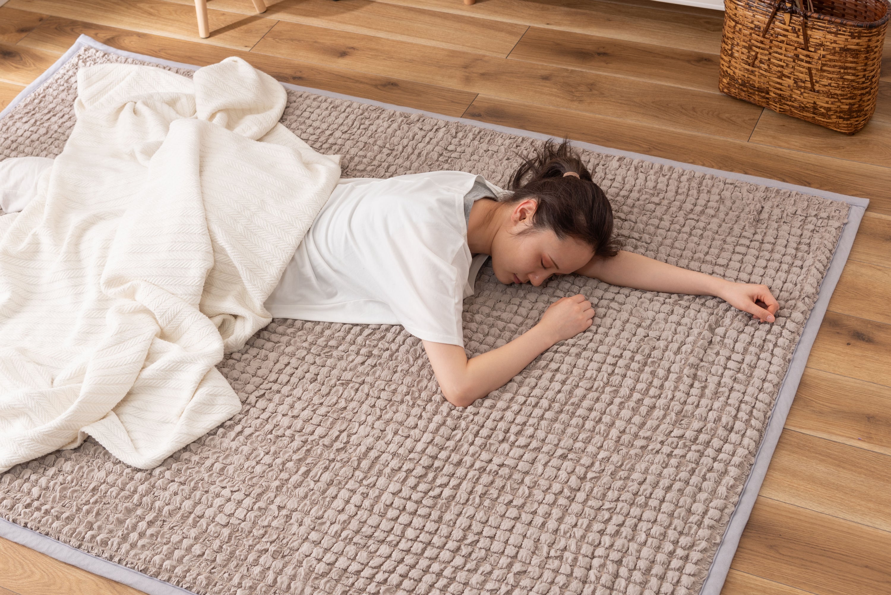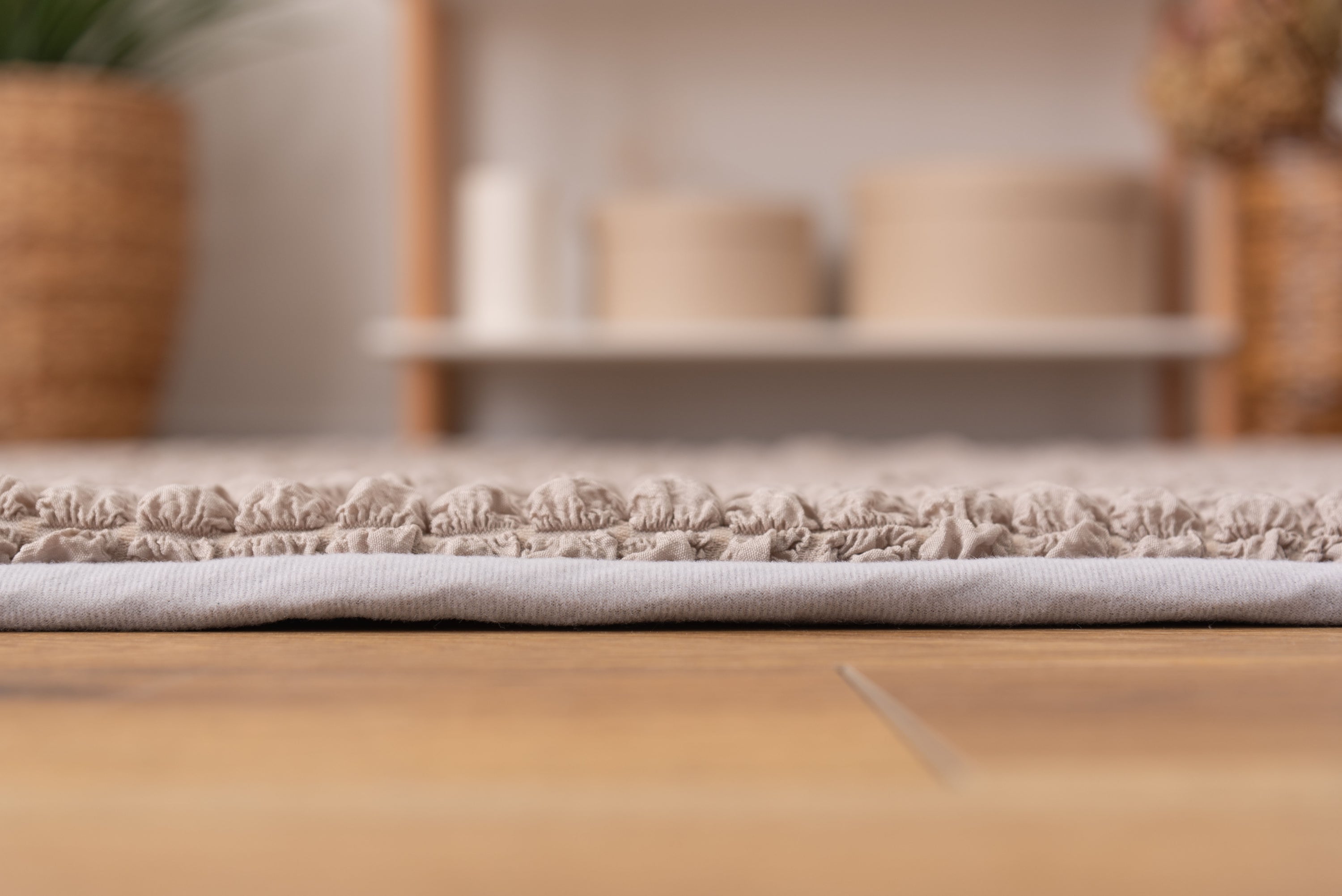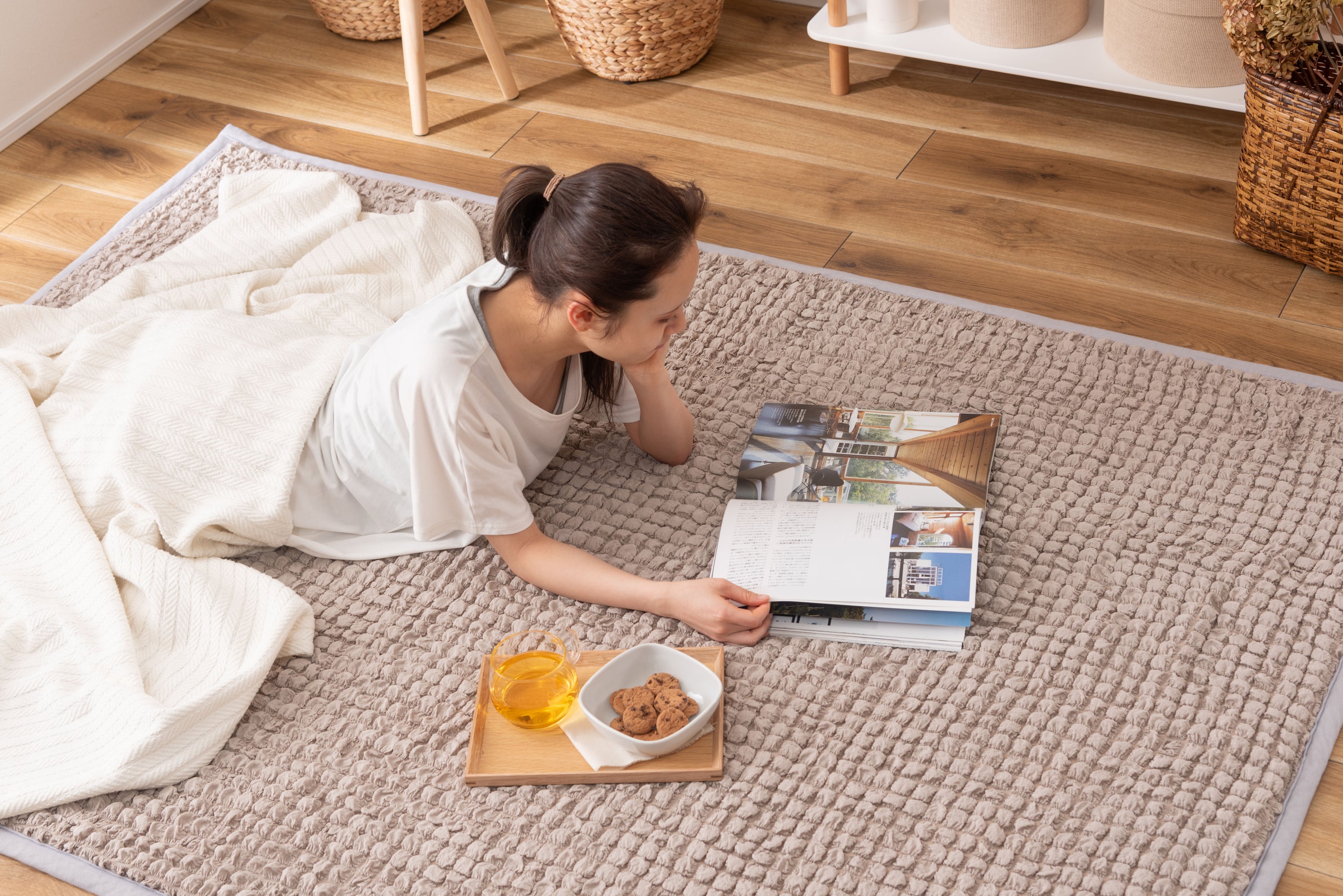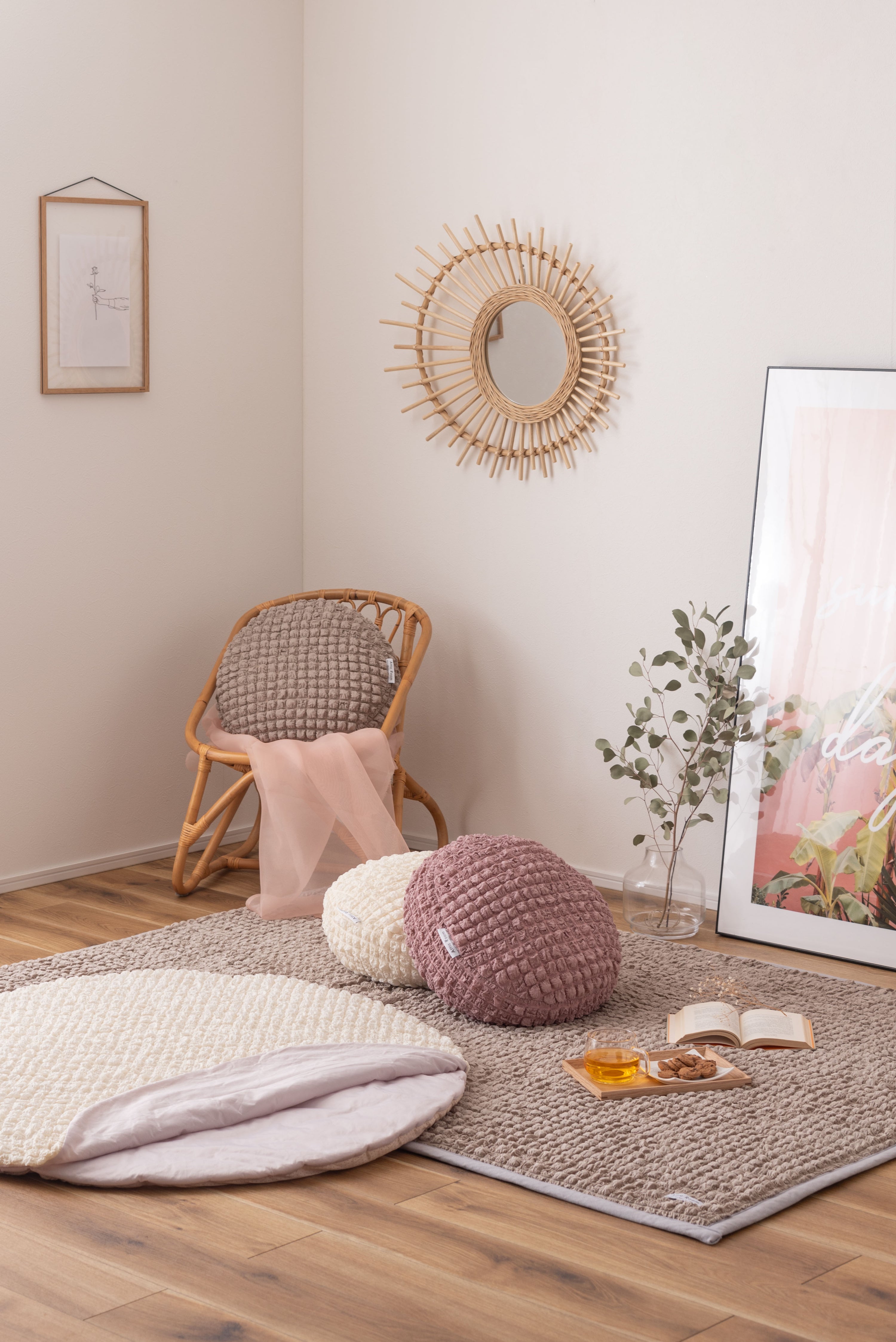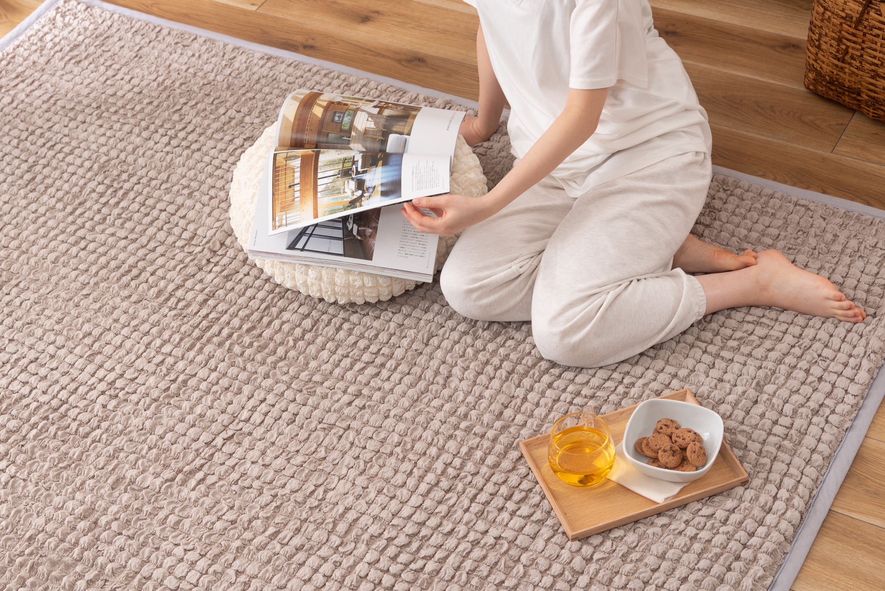 人気のポップコーン生地を使った接触冷感のポップコーンラグ。 冷感アイテムにはなかなか無いニュアンスカラー。 インテリアにも合わせやすいデザイン。 程よいクッション性のあるラグマット。 ふんわりひんやり触感の使い心地の良いラグ。 お部屋の主役になってくれる可愛い見た目もポイント。 ポップコーン生地が接触冷感になった、夏のお部屋をひんやり快適に過ごせるアイテム。 ウレタンを使用し程よいクッション性があるので、ふんわり気持ちよく使う事が出来ます。 扱いやすい軽量設計で、干したり収納したりがラクラク。 裏面は滑り止め付きで、お子様がいるご家庭でも安心して使用出来ます。 人気のくすみカラーを採用。