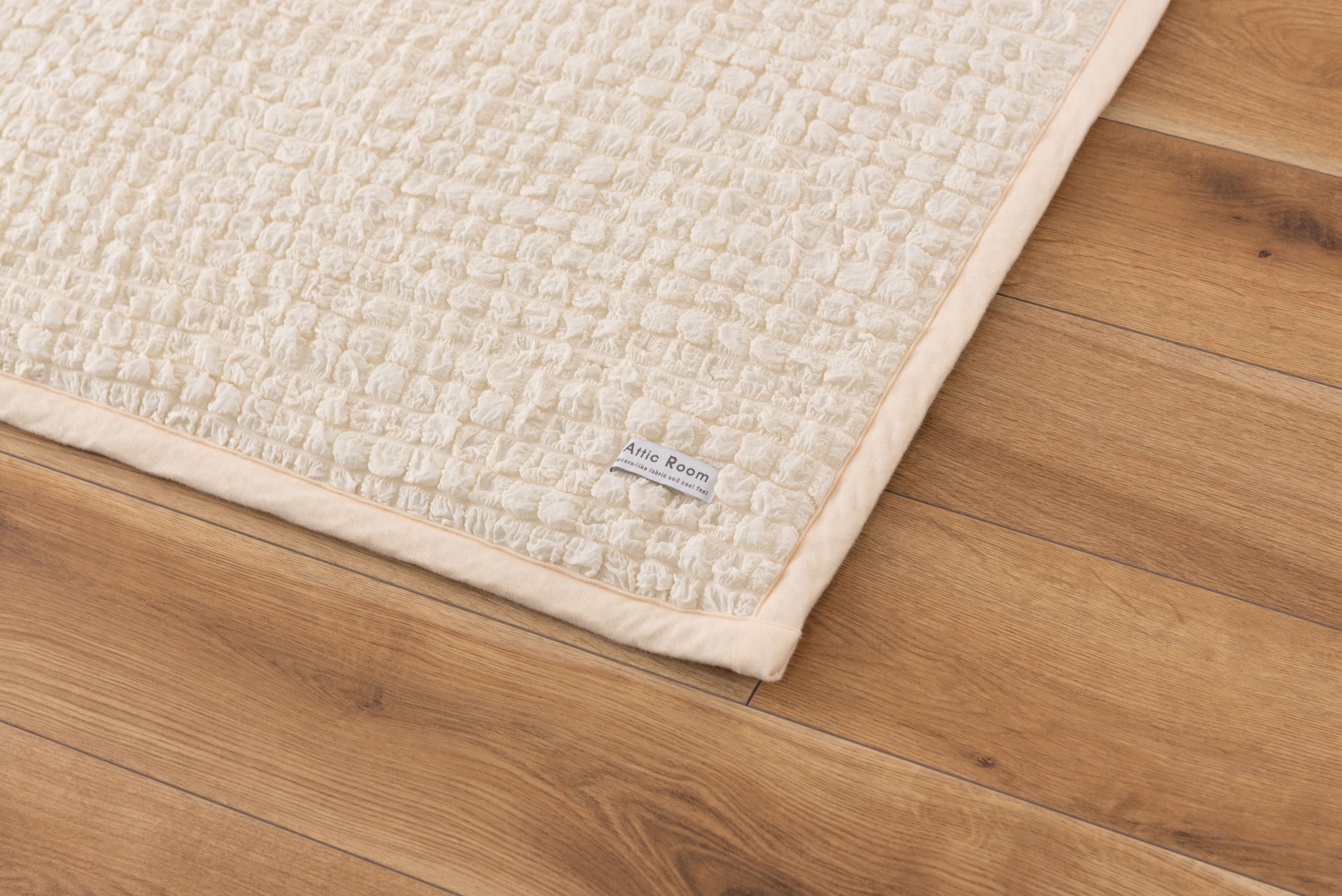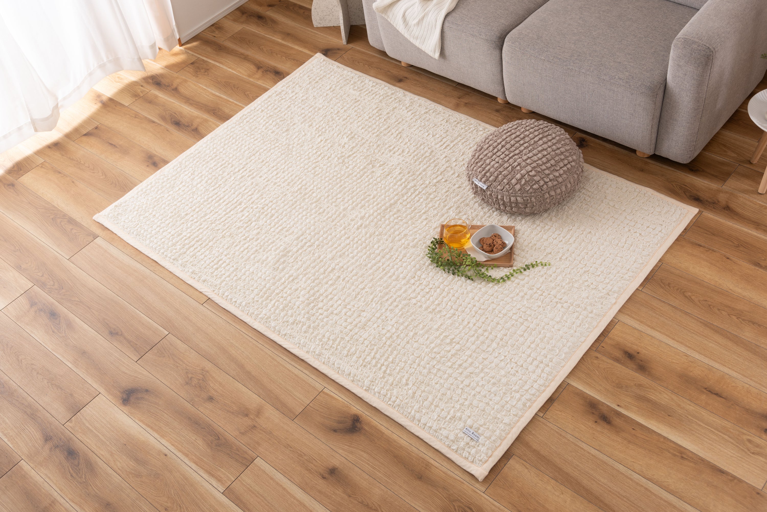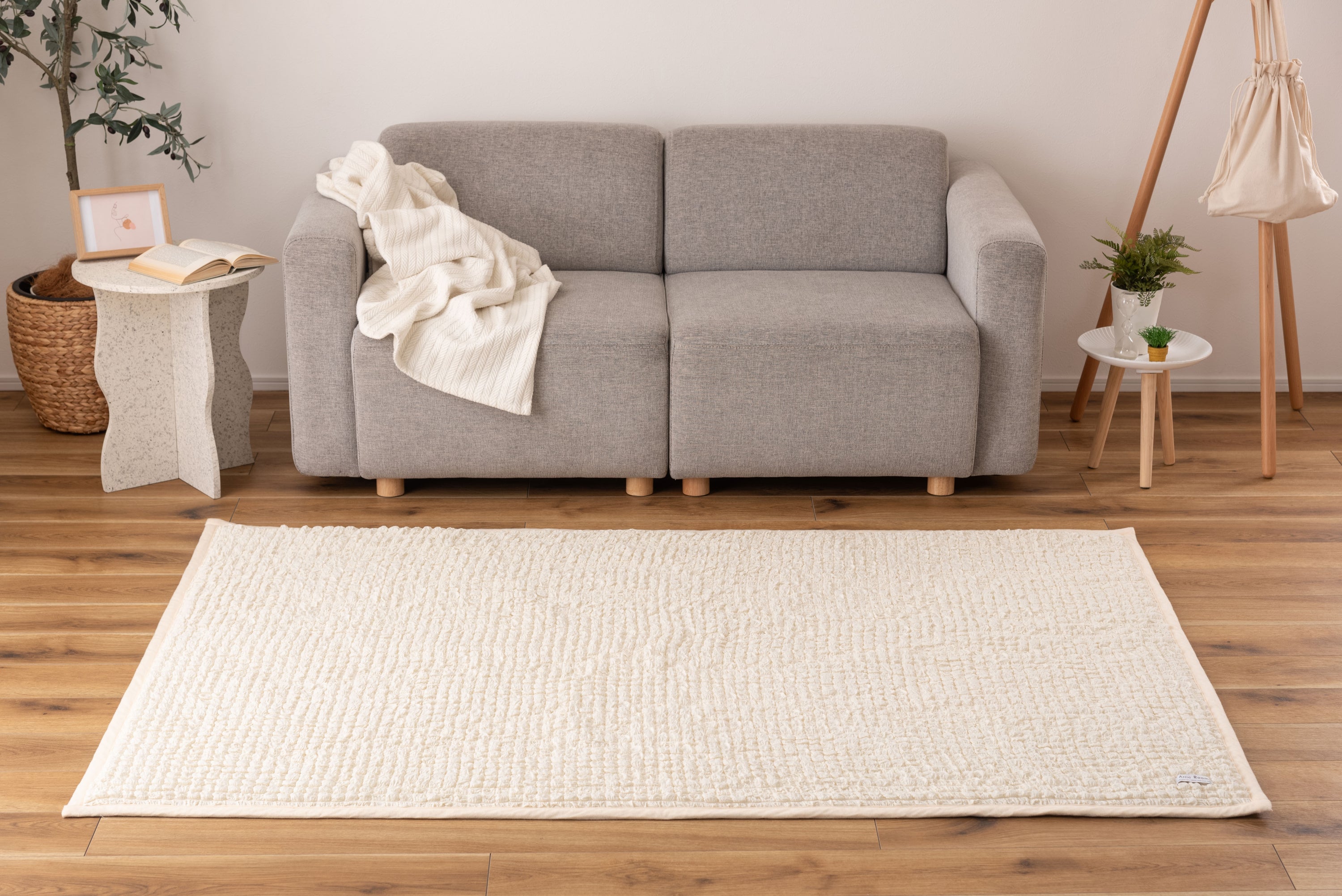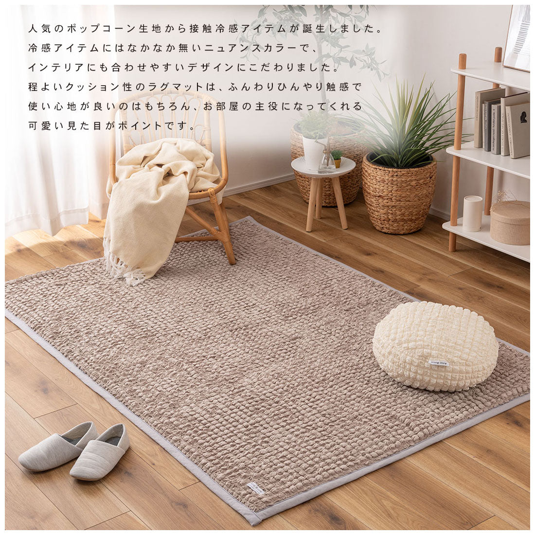 人気のポップコーン生地を使った接触冷感のポップコーンラグ。 冷感アイテムにはなかなか無いニュアンスカラー。 インテリアにも合わせやすいデザイン。 程よいクッション性のあるラグマット。 ふんわりひんやり触感の使い心地の良いラグ。 お部屋の主役になってくれる可愛い見た目もポイント。 ポップコーン生地が接触冷感になった、夏のお部屋をひんやり快適に過ごせるアイテム。 ウレタンを使用し程よいクッション性があるので、ふんわり気持ちよく使う事が出来ます。 扱いやすい軽量設計で、干したり収納したりがラクラク。 裏面は滑り止め付きで、お子様がいるご家庭でも安心して使用出来ます。 人気のくすみカラーを採用。