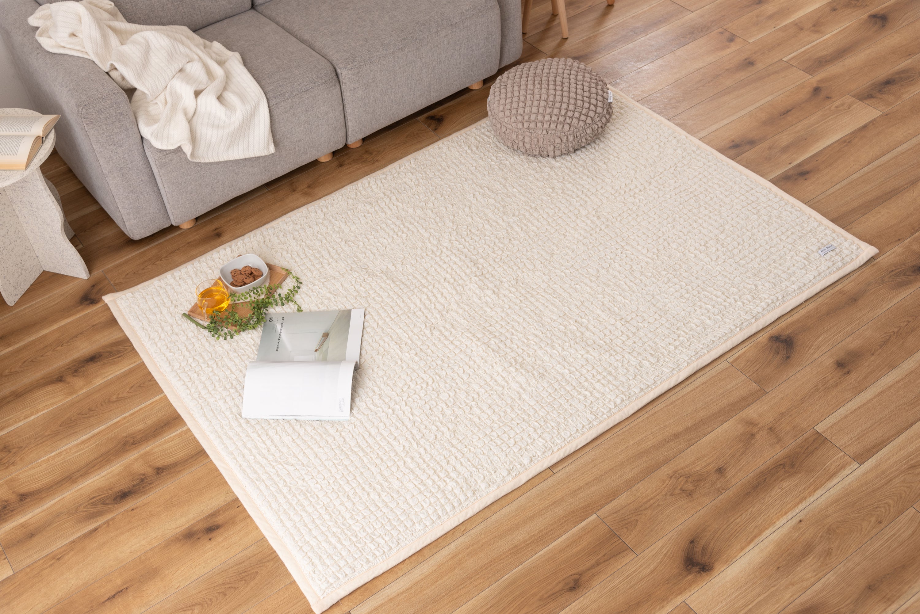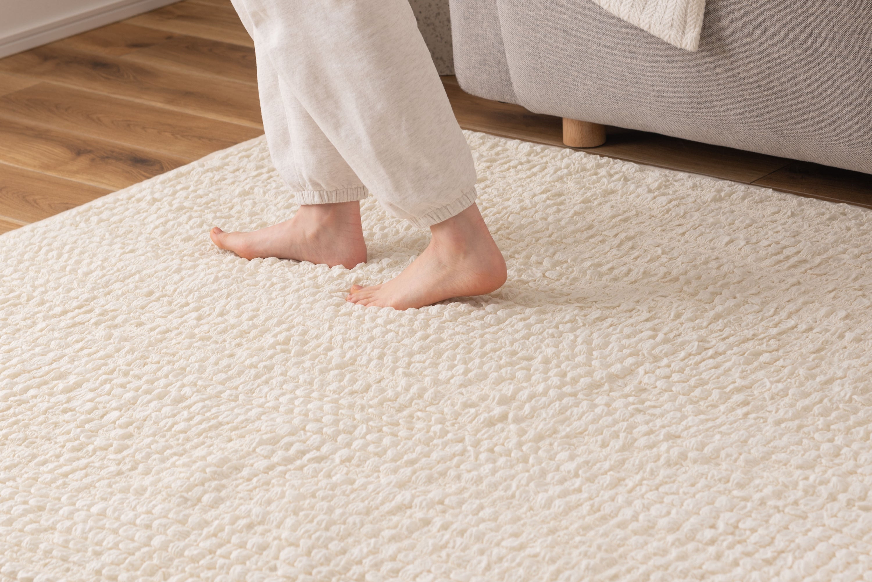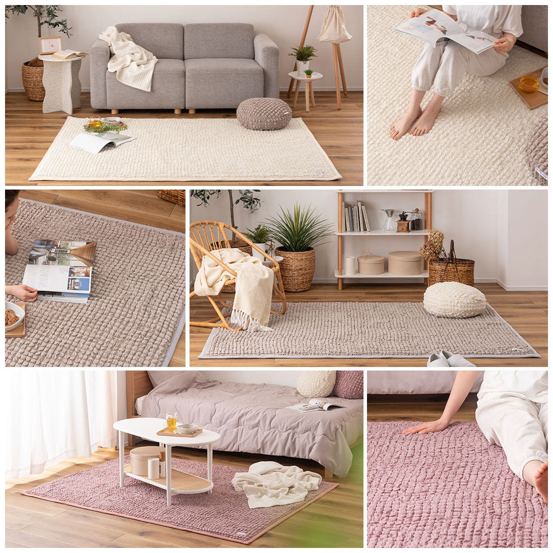 人気のポップコーン生地を使った接触冷感のポップコーンラグ。 冷感アイテムにはなかなか無いニュアンスカラー。 インテリアにも合わせやすいデザイン。 程よいクッション性のあるラグマット。 ふんわりひんやり触感の使い心地の良いラグ。 お部屋の主役になってくれる可愛い見た目もポイント。 ポップコーン生地が接触冷感になった、夏のお部屋をひんやり快適に過ごせるアイテム。 ウレタンを使用し程よいクッション性があるので、ふんわり気持ちよく使う事が出来ます。 扱いやすい軽量設計で、干したり収納したりがラクラク。 裏面は滑り止め付きで、お子様がいるご家庭でも安心して使用出来ます。 人気のくすみカラーを採用。