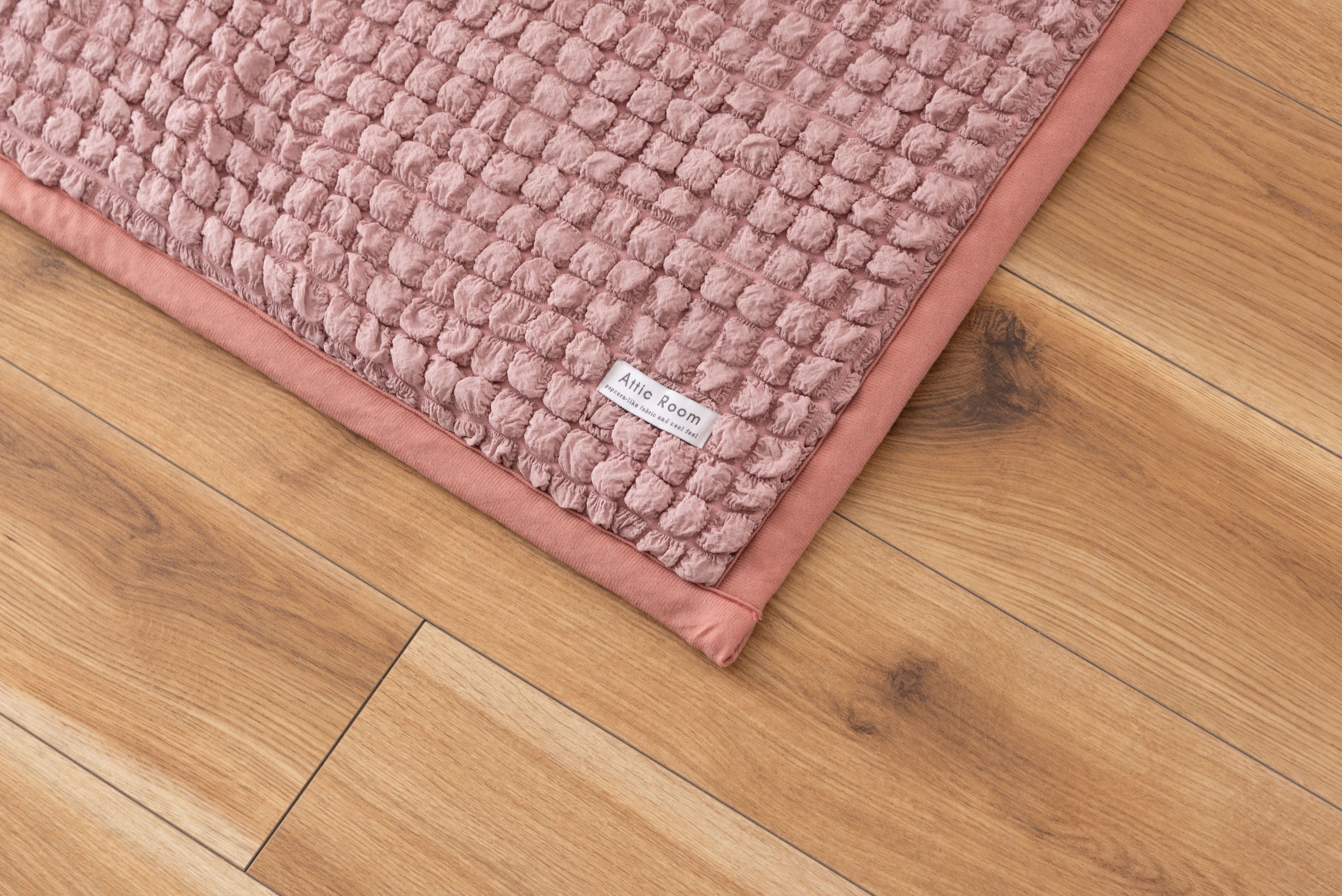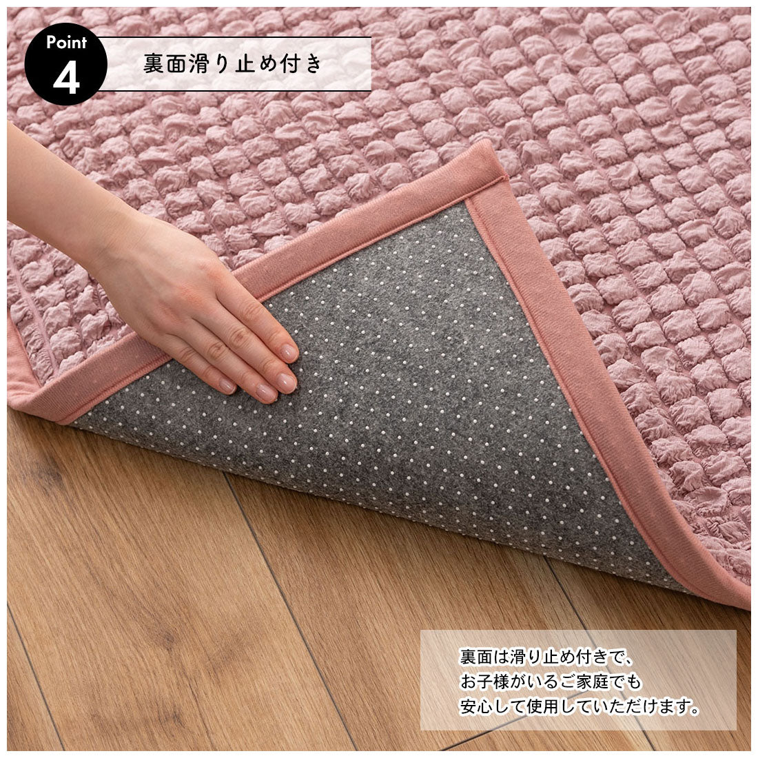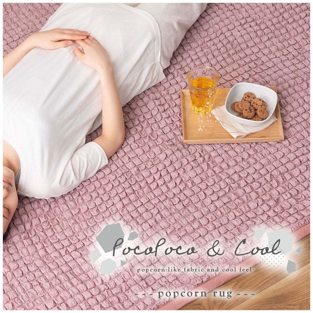 人気のポップコーン生地を使った接触冷感のポップコーンラグ。 冷感アイテムにはなかなか無いニュアンスカラー。 インテリアにも合わせやすいデザイン。 程よいクッション性のあるラグマット。 ふんわりひんやり触感の使い心地の良いラグ。 お部屋の主役になってくれる可愛い見た目もポイント。 ポップコーン生地が接触冷感になった、夏のお部屋をひんやり快適に過ごせるアイテム。 ウレタンを使用し程よいクッション性があるので、ふんわり気持ちよく使う事が出来ます。 扱いやすい軽量設計で、干したり収納したりがラクラク。 裏面は滑り止め付きで、お子様がいるご家庭でも安心して使用出来ます。 人気のくすみカラーを採用。