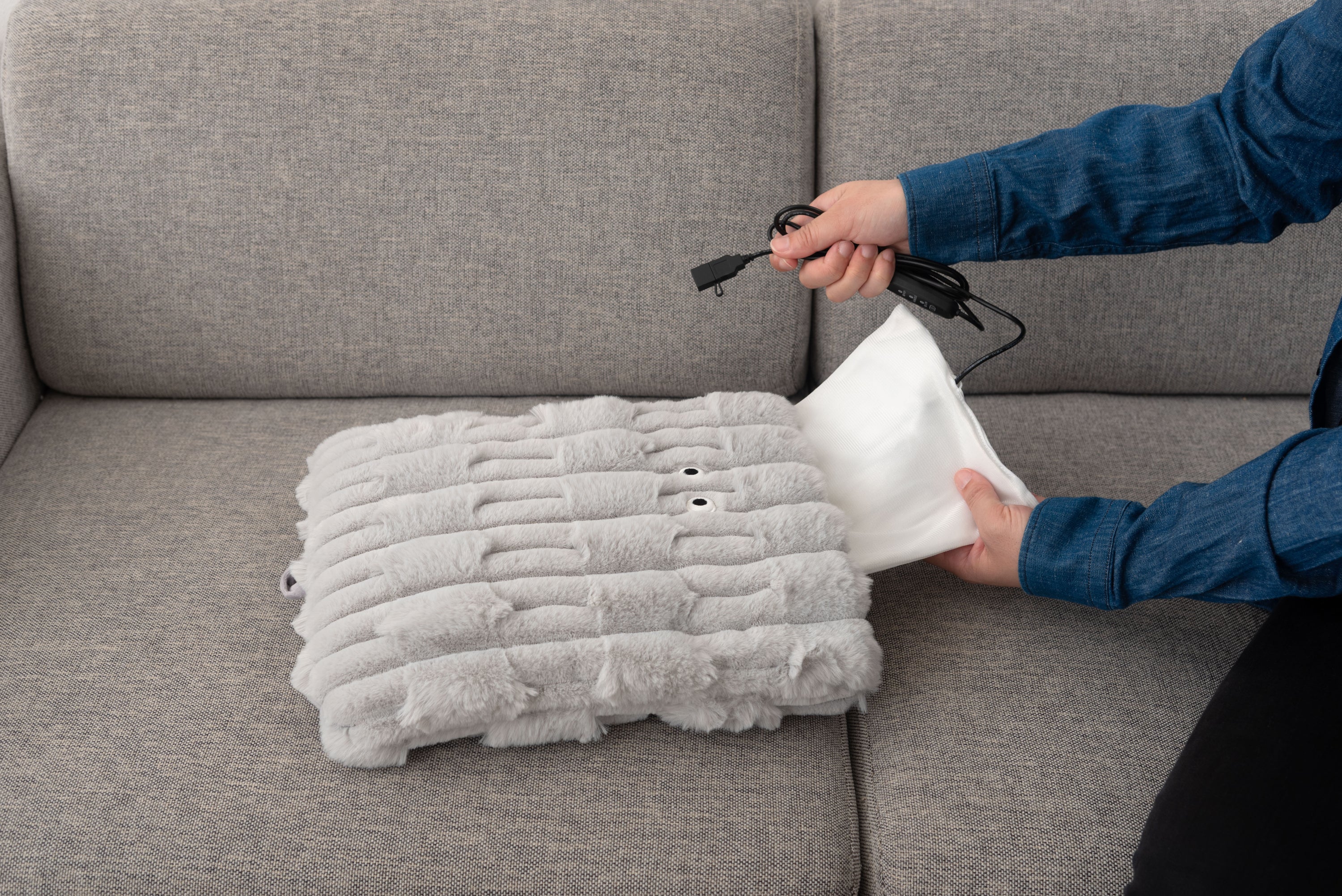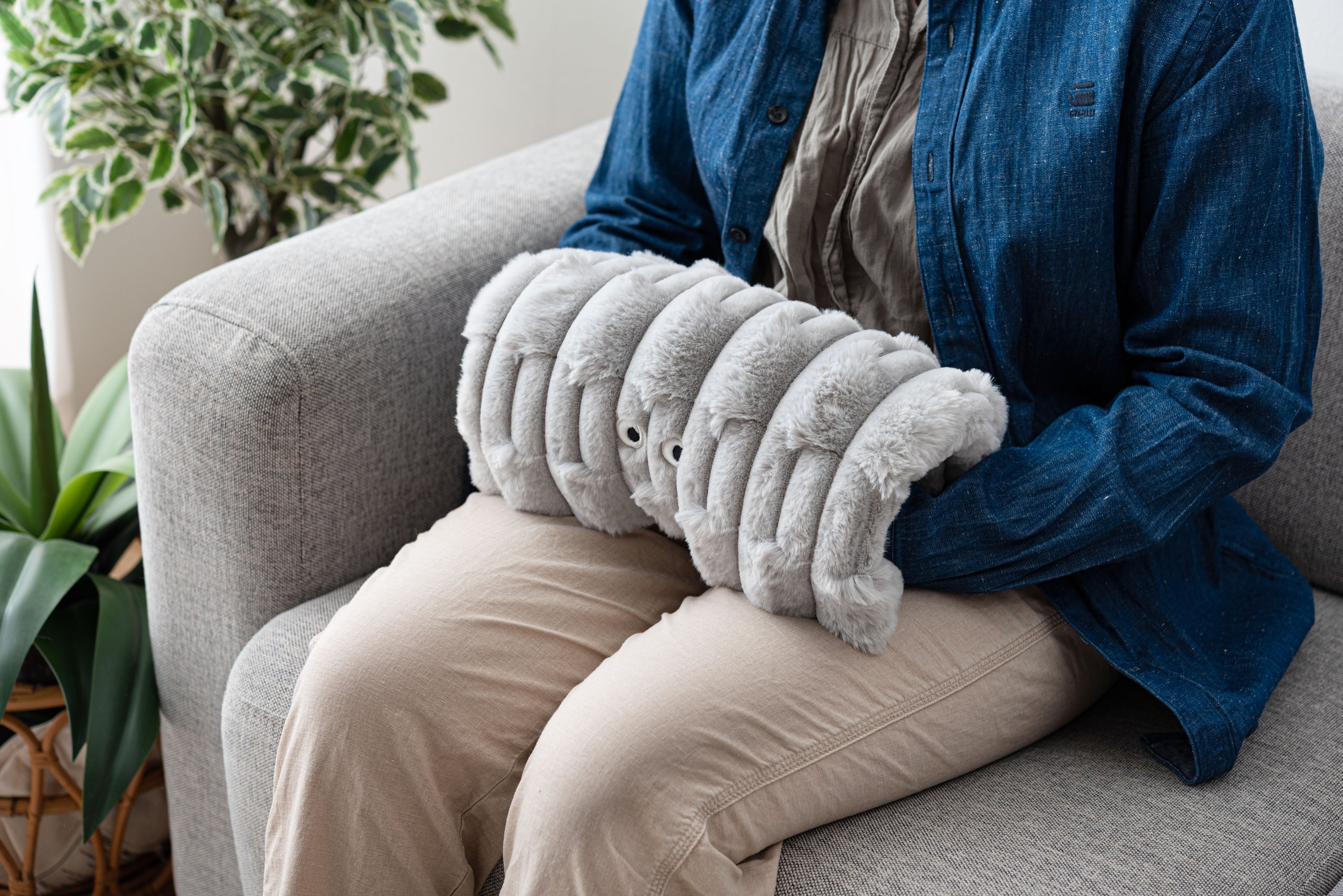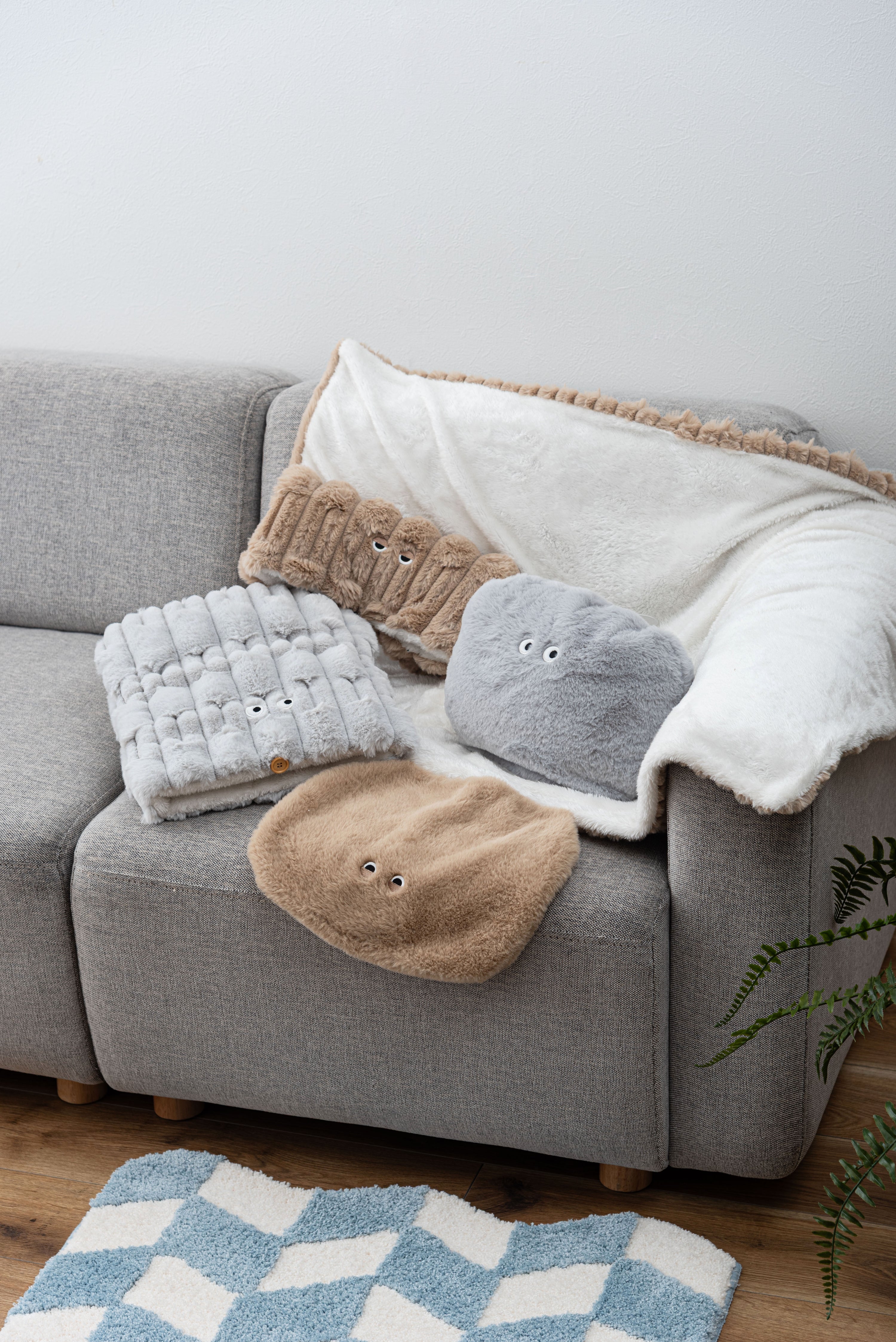 ポコポコ素材とつぶらな瞳が魅力的。モダンなあったかグッズ。触り心地の良いポコポコと模様の入ったファブリックを使用したUSBブランケット&USBフットウォーマー。モバイルバッテリーやUSB電源に接続するだけで、収納されているヒーターが温まります。モバイルバッテリーを収納できるポケットを設計し、場所を気にせずどこでも使える仕様に。USBブランケットは目のついた丸い箇所が収納ポケットとなって。おり、膝上に収まるサイズ感のクッションに変身します。USBフットウォーマーは、シートクッションとして、アームウォーマーとしても使用できる3ウェイに仕上げました。ヒーターは取り出しが可能で、カバーを丸洗いすることができます。ヒーターは3段階の調整が可能。椅子に敷いてシートクッションとして。丸めてアームウォーマーとして