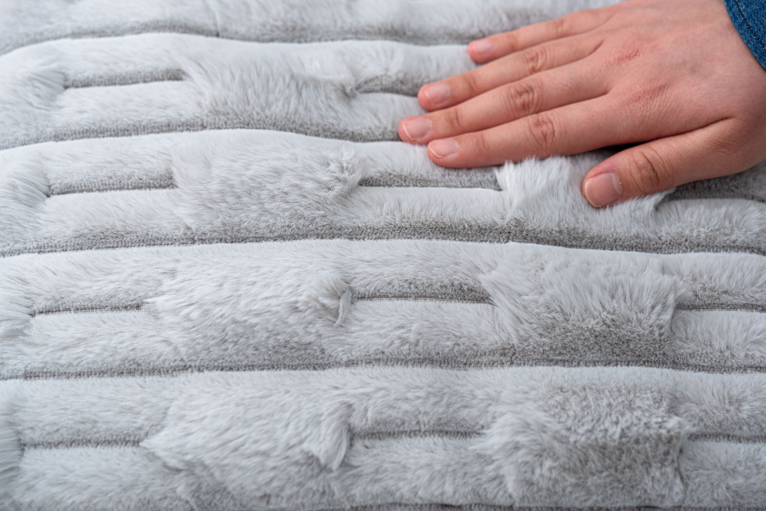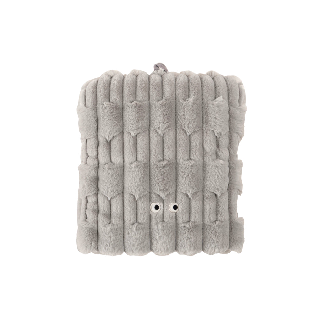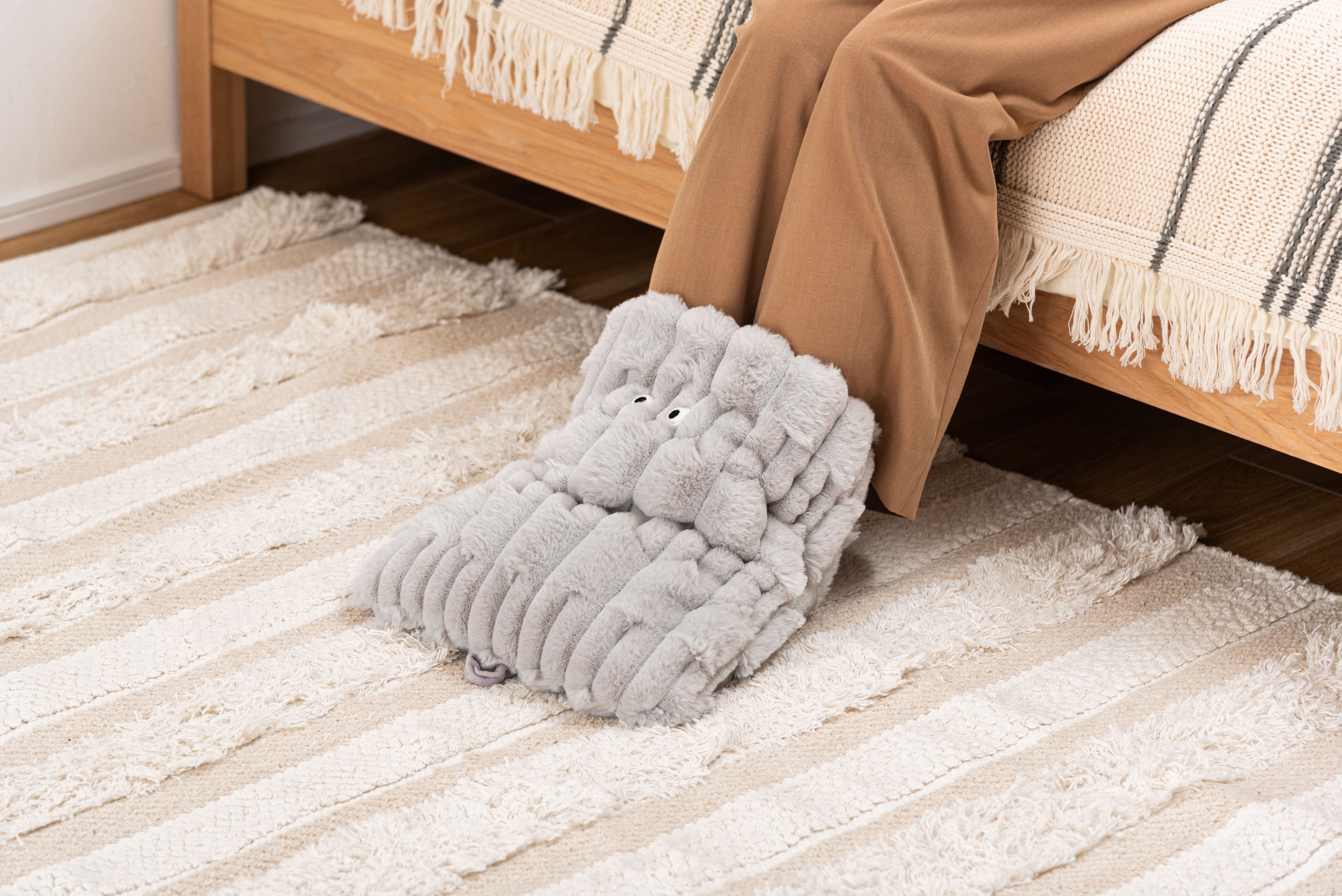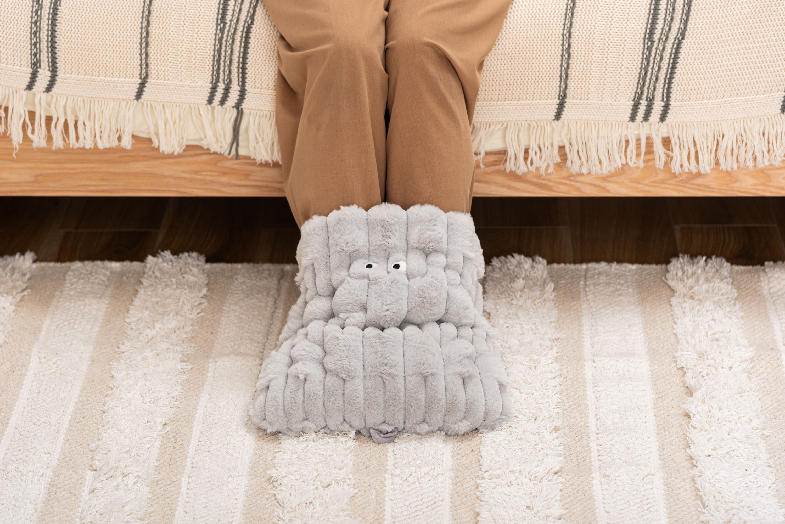 ポコポコ素材とつぶらな瞳が魅力的。モダンなあったかグッズ。触り心地の良いポコポコと模様の入ったファブリックを使用したUSBブランケット&USBフットウォーマー。モバイルバッテリーやUSB電源に接続するだけで、収納されているヒーターが温まります。モバイルバッテリーを収納できるポケットを設計し、場所を気にせずどこでも使える仕様に。USBブランケットは目のついた丸い箇所が収納ポケットとなって。おり、膝上に収まるサイズ感のクッションに変身します。USBフットウォーマーは、シートクッションとして、アームウォーマーとしても使用できる3ウェイに仕上げました。ヒーターは取り出しが可能で、カバーを丸洗いすることができます。ヒーターは3段階の調整が可能。椅子に敷いてシートクッションとして。丸めてアームウォーマーとして