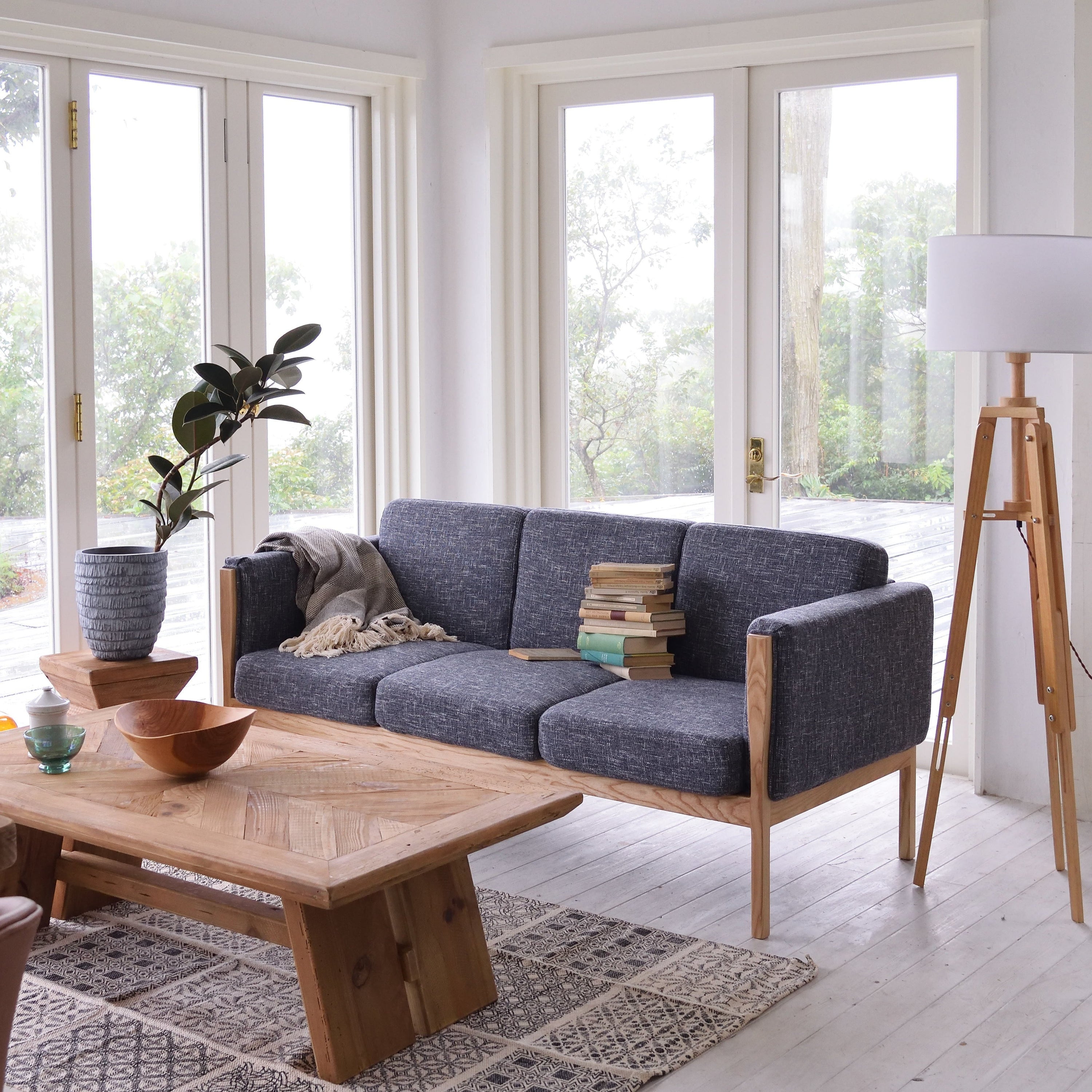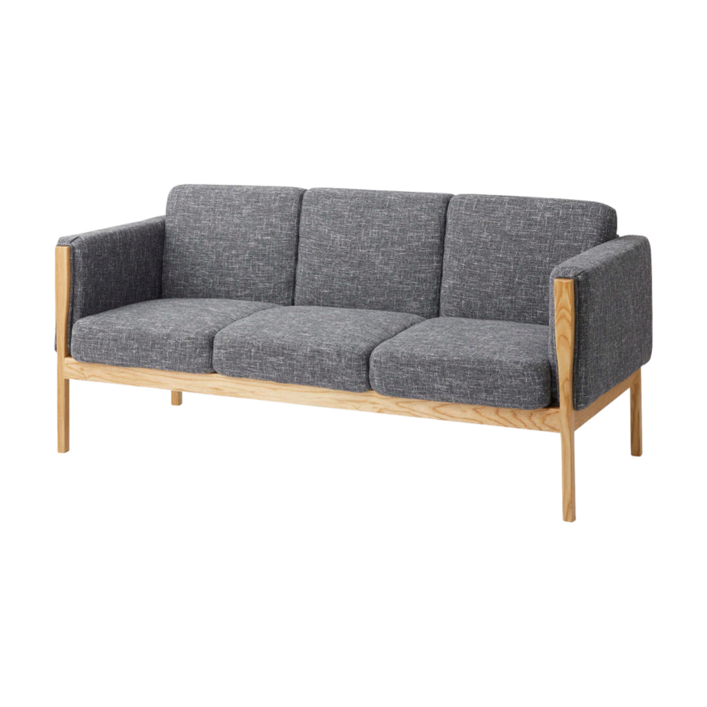 直線的なラインで無駄のないシンプルなデザインが印象的なソファ。アームに施された天然木の飾りが美しく温かみを感じさせます。全体的にカッチリと直線が活きたデザインなので、オフィスの来客用ソファとしても使えるデザイン。床から座面下フレームまでの空間が23cmと広々。お掃除ロボットも楽に入れる空間なのでソファ下のお手入れも簡単です。座面フレームにはウィービングベルトを採用しているので、沈み込みすぎず適度に弾力のある快適な座り心地。