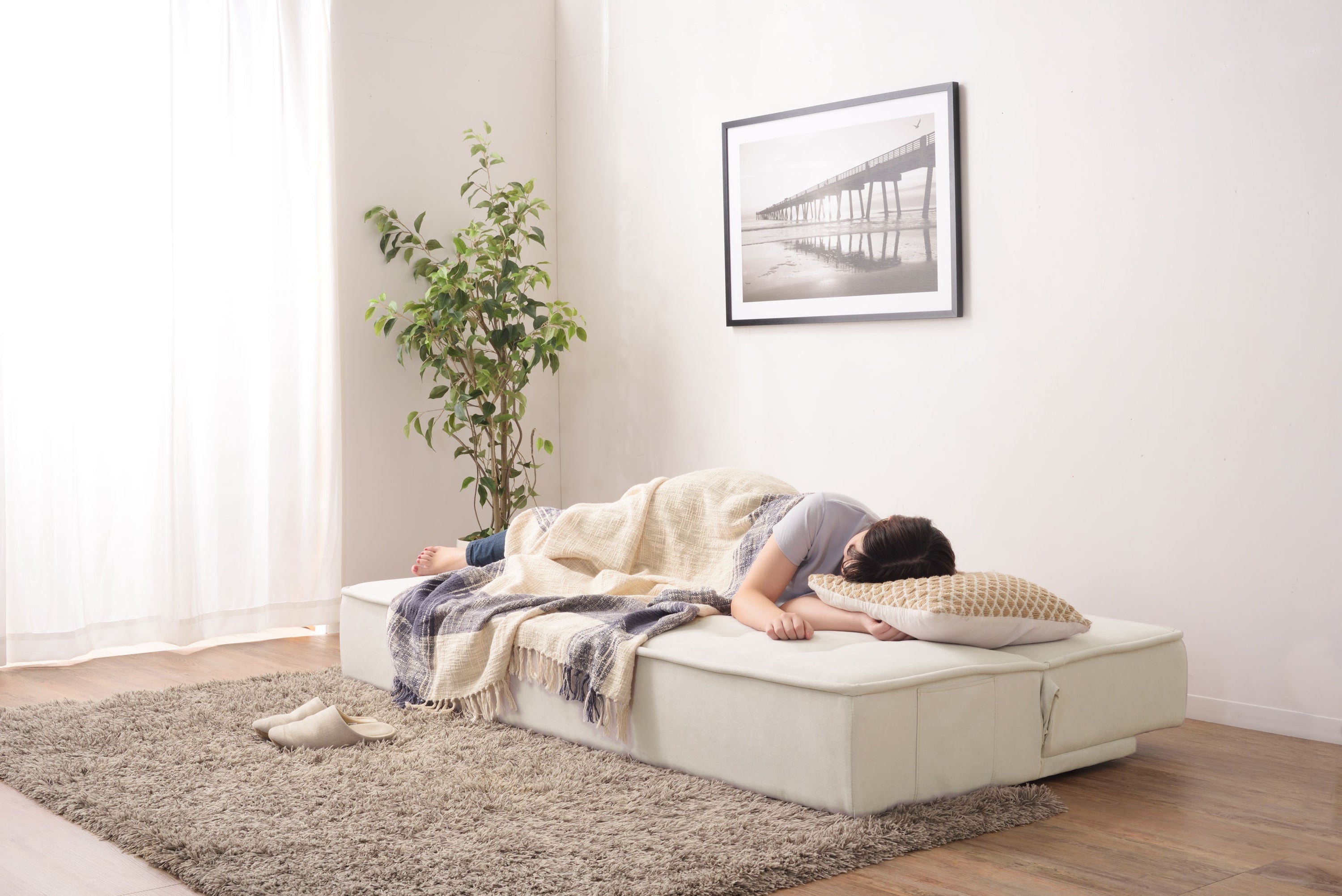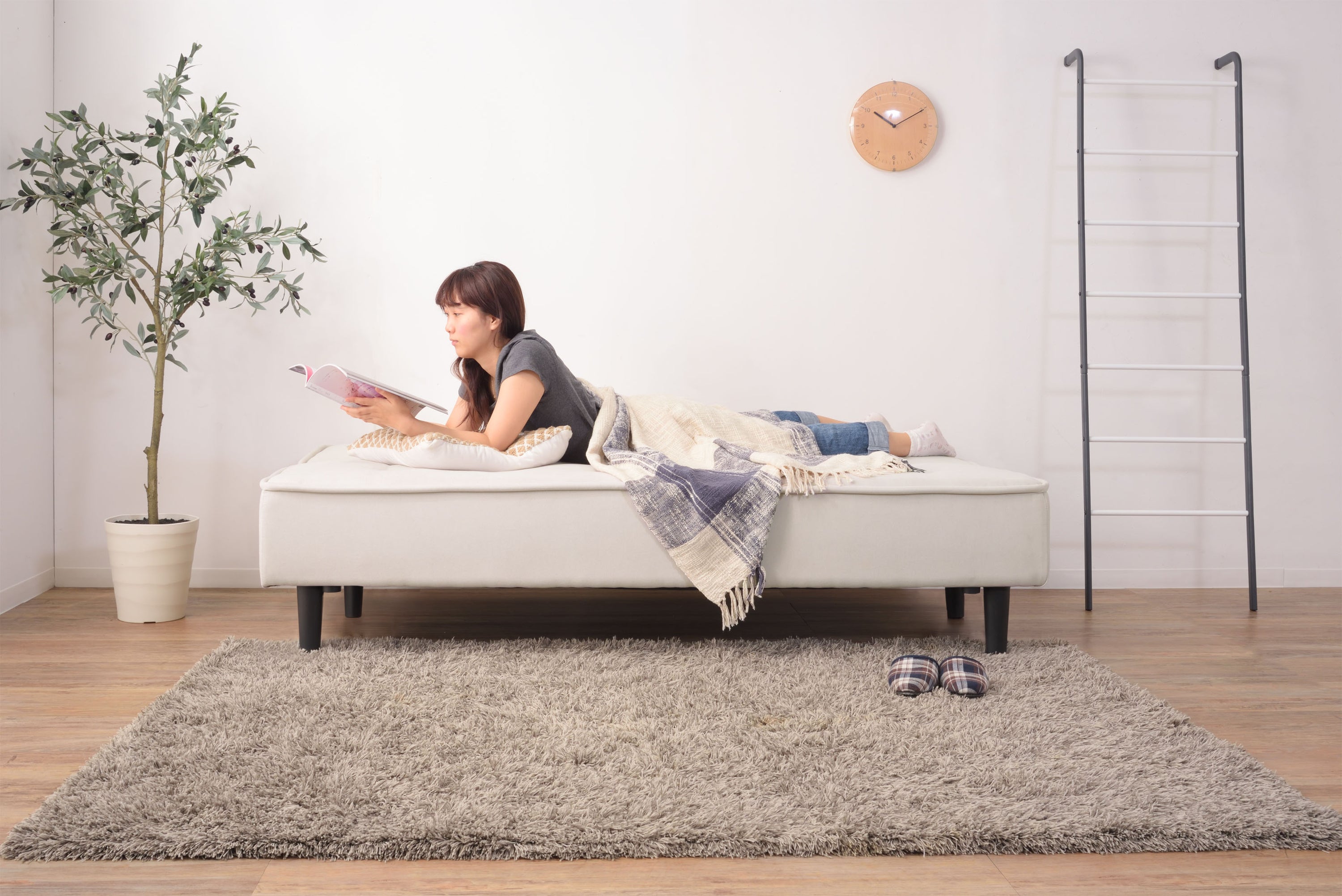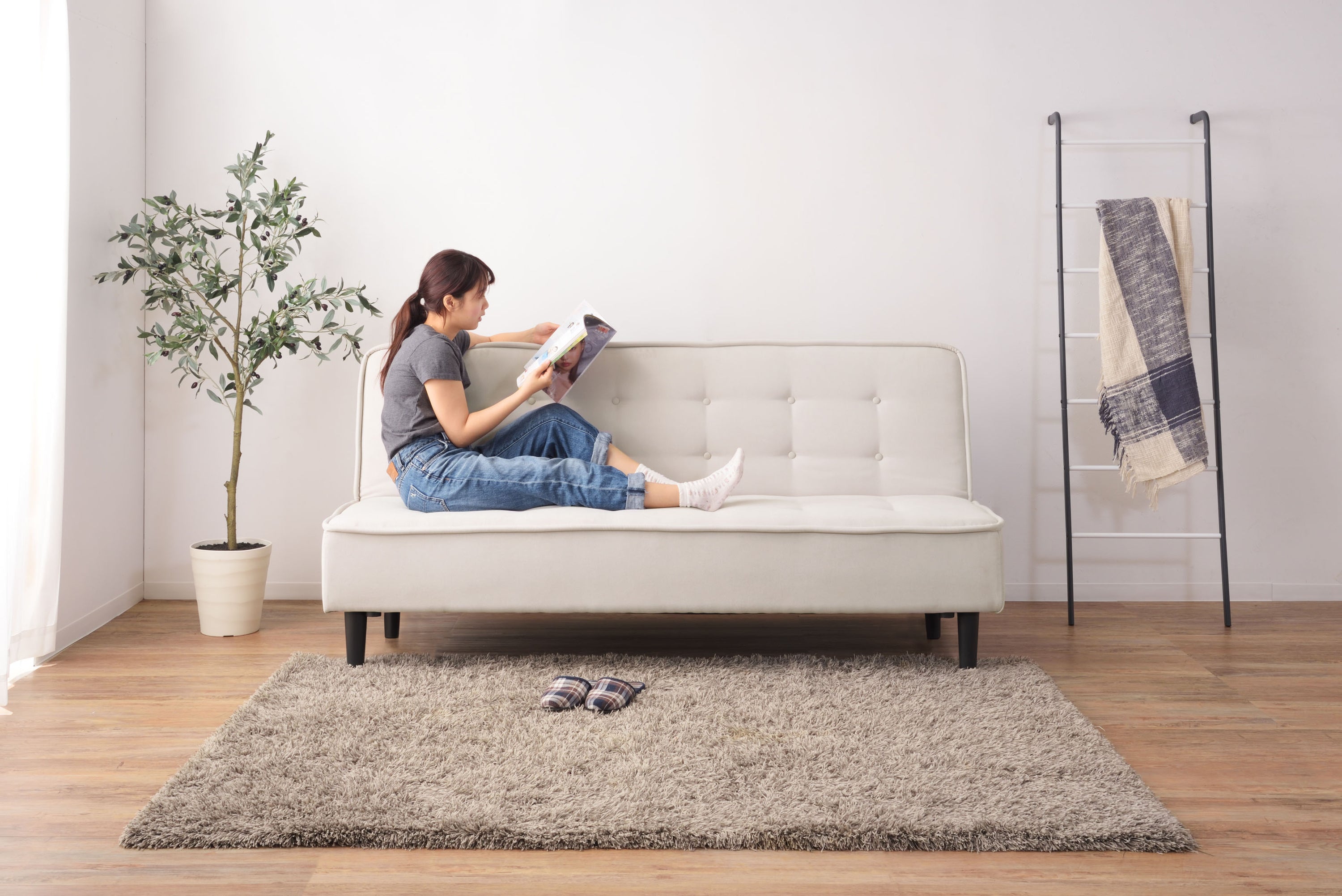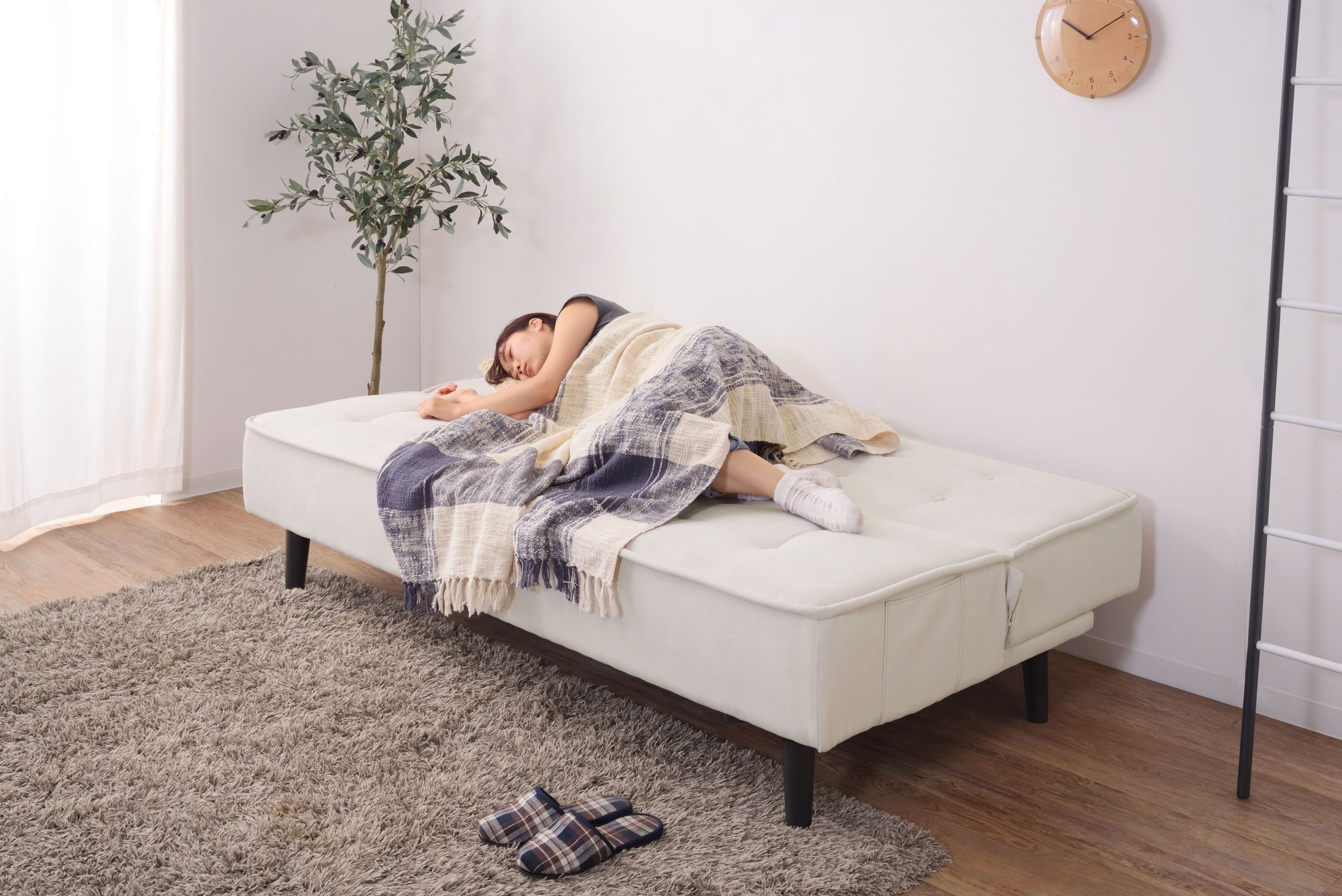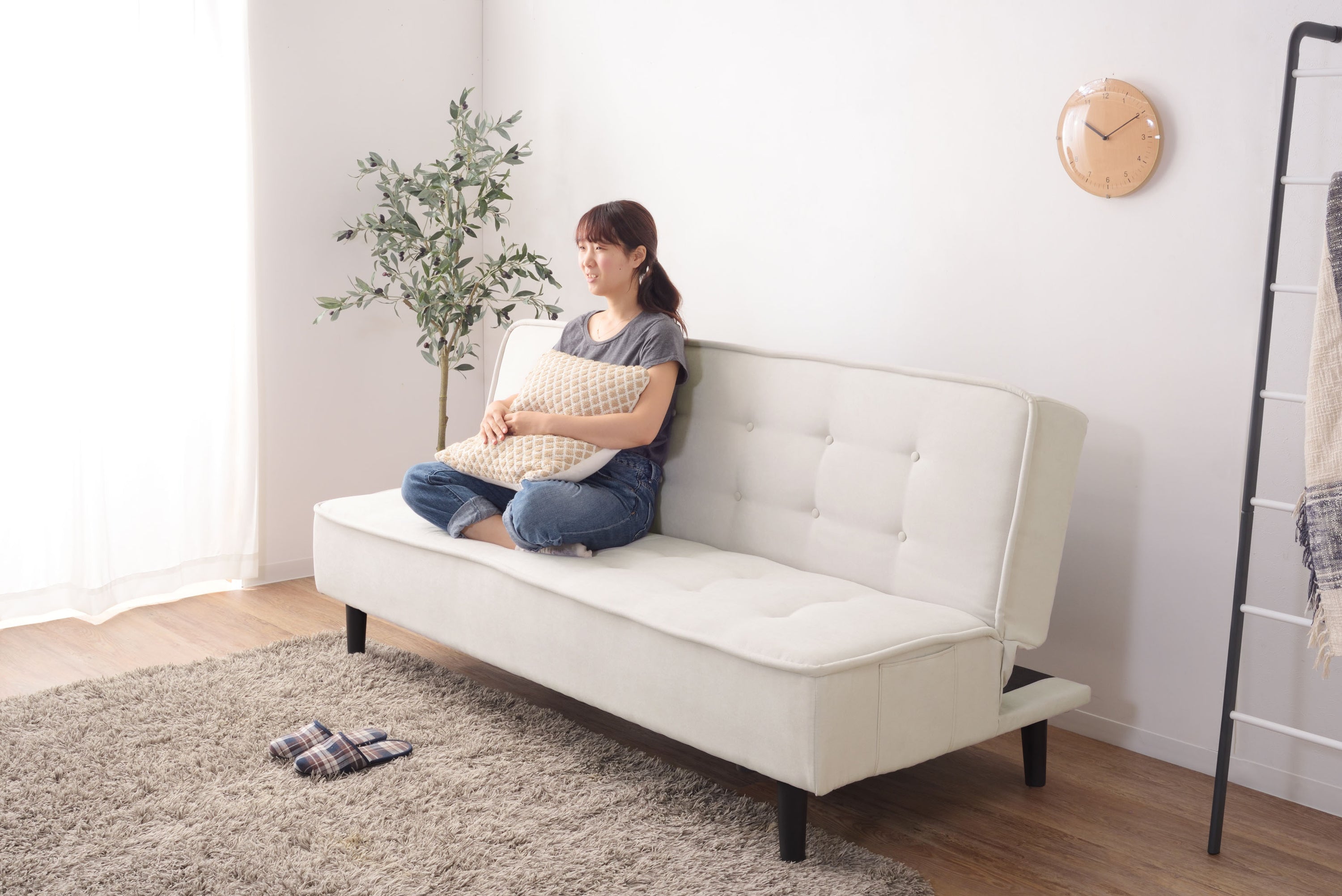 背もたれを倒すとベッドへ早変わりするソファベッドは、限られたスペースにソファもベッドも置きたい方にピッタリ。 さらりと手触りのよいファブリックは、1年中快適に過ごすことができます。