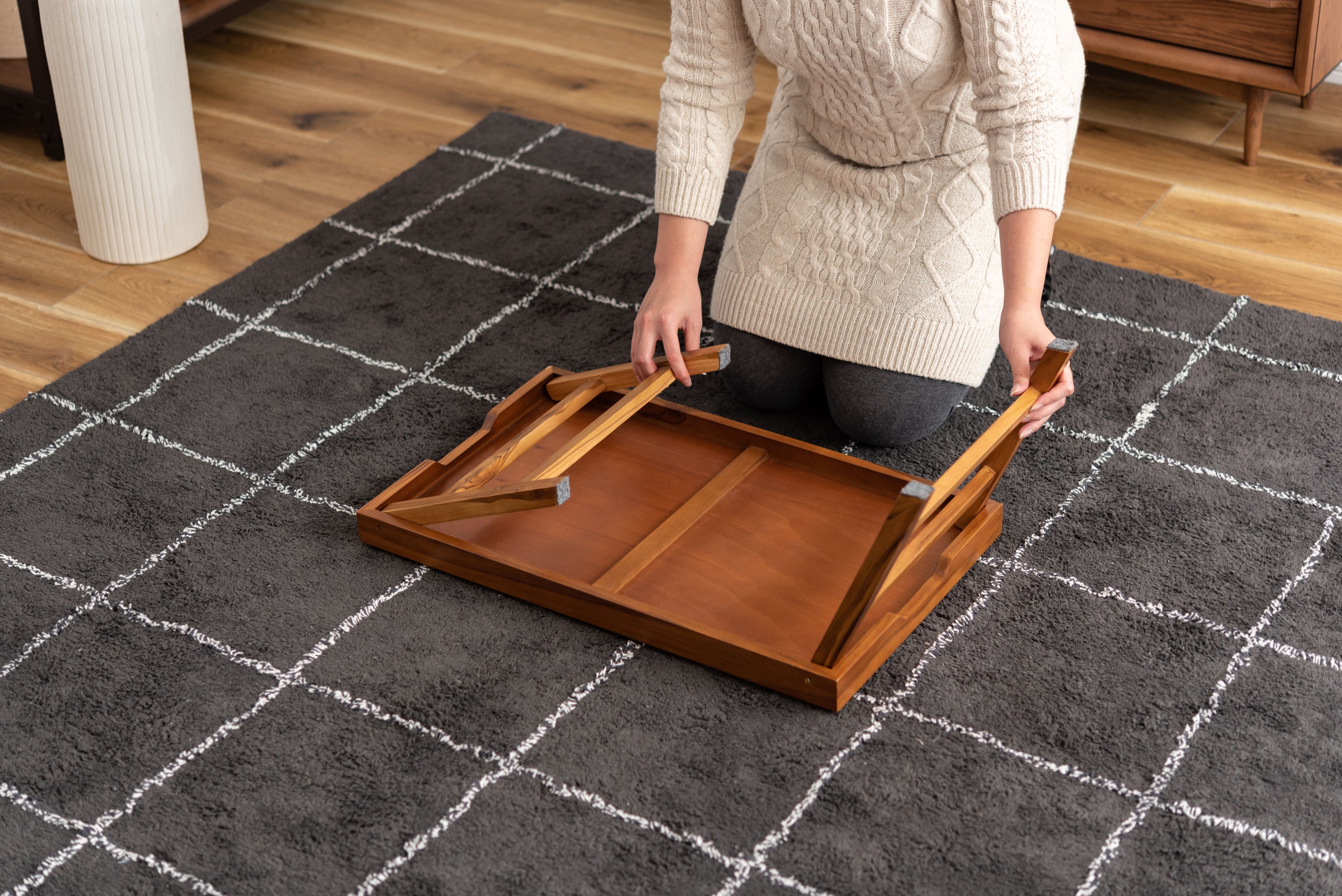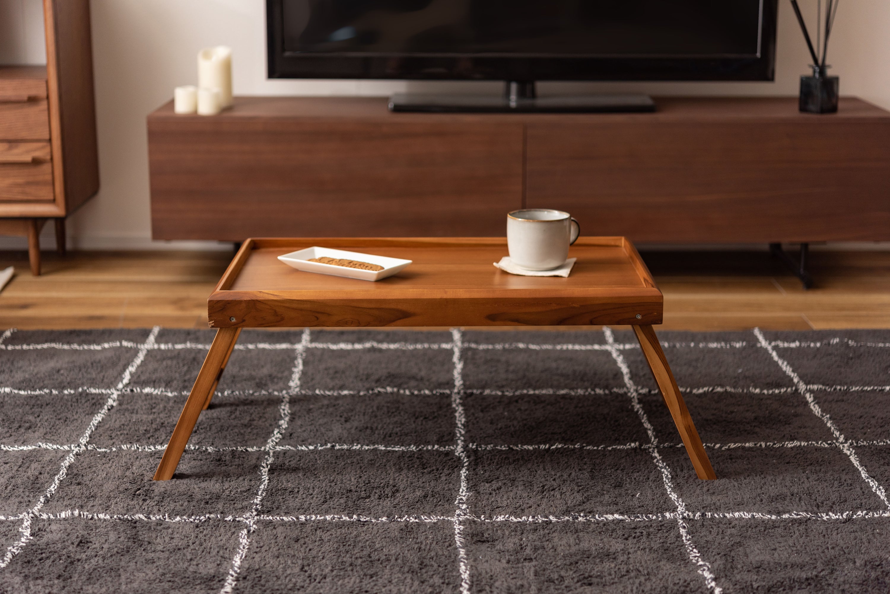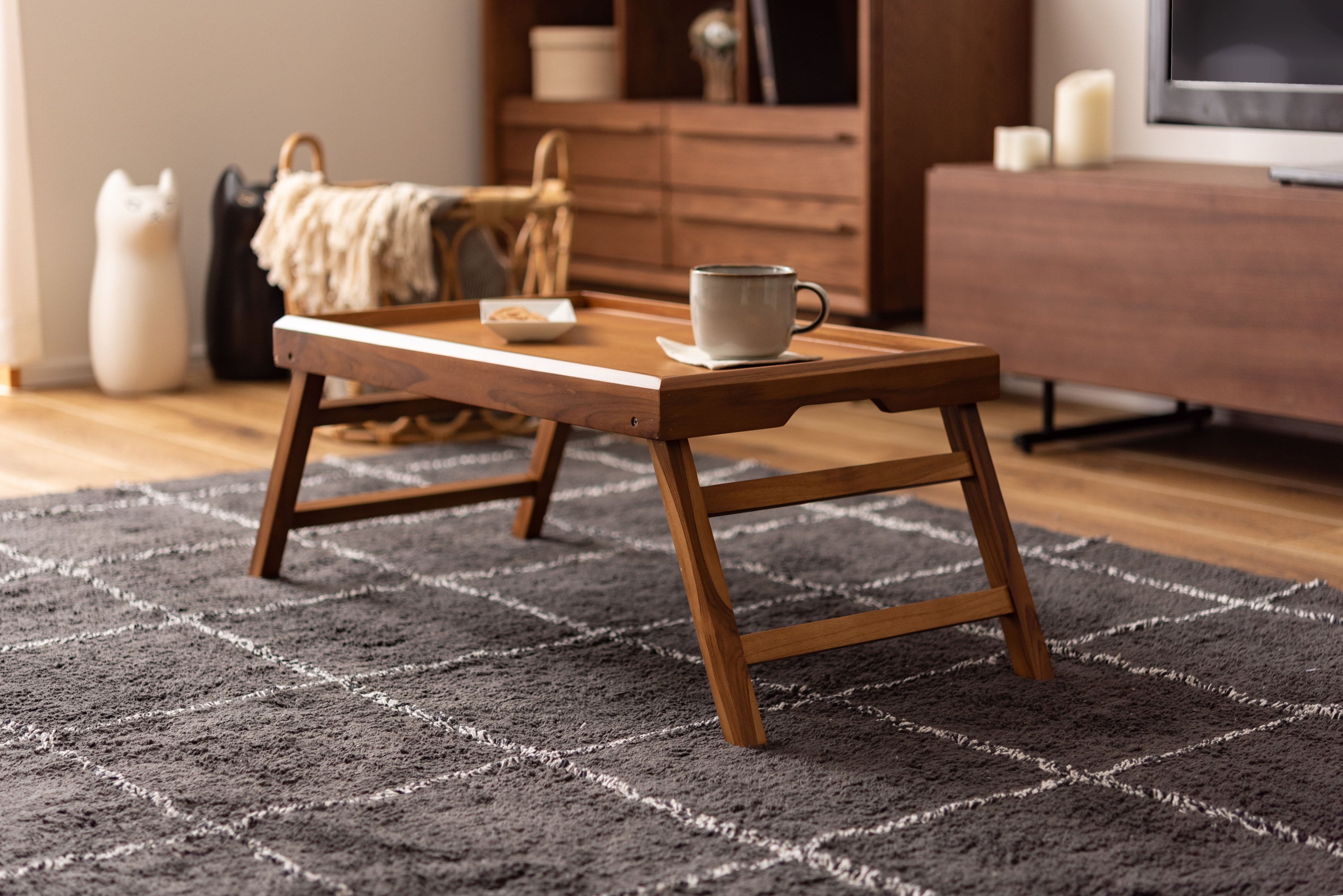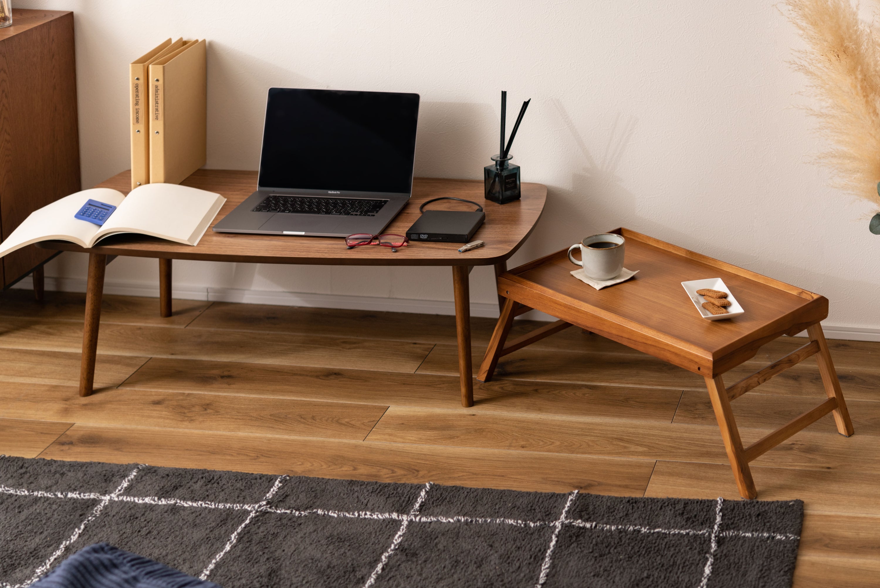 脚が折りたためるローテーブル。様々なシーンに合わせて活躍する、多目的なテーブル。脚を折りたためばコンパクトサイズに。持ち運びや収納に便利です。フロアテーブルやサイドテーブル、ベッドの上でのテーブルとして等、あらゆる用途で使えるテーブル。脚裏にフェルトが付いているので、床への傷防止になり安心。完成品の状態でお届け。届いてすぐに使えます。