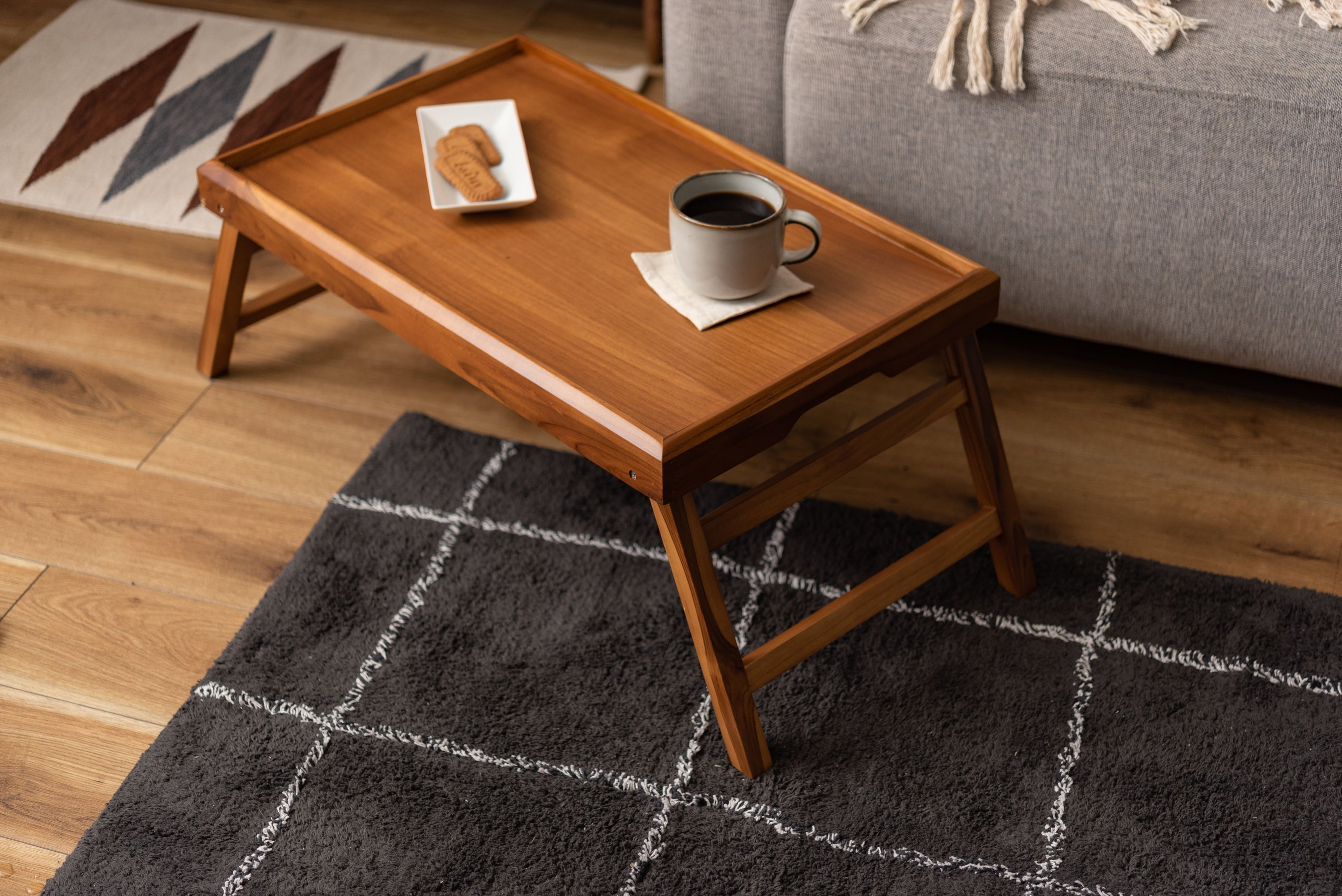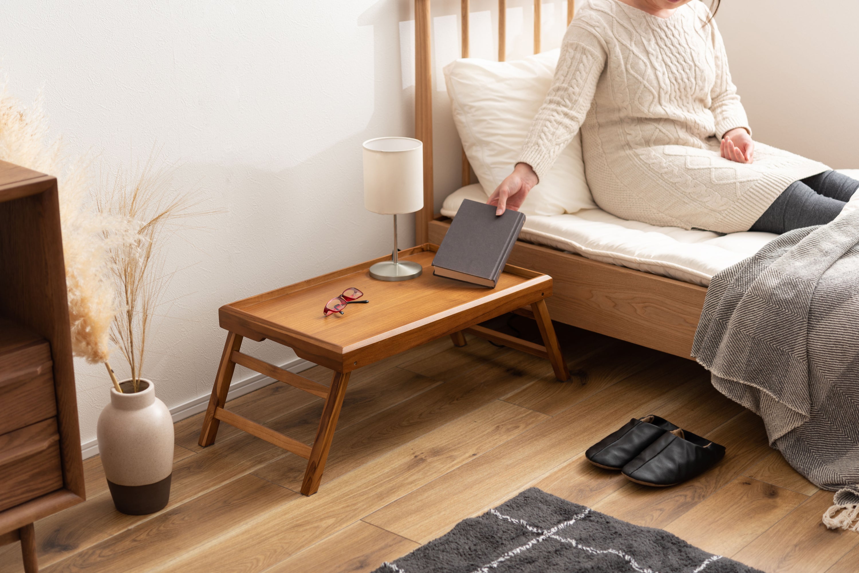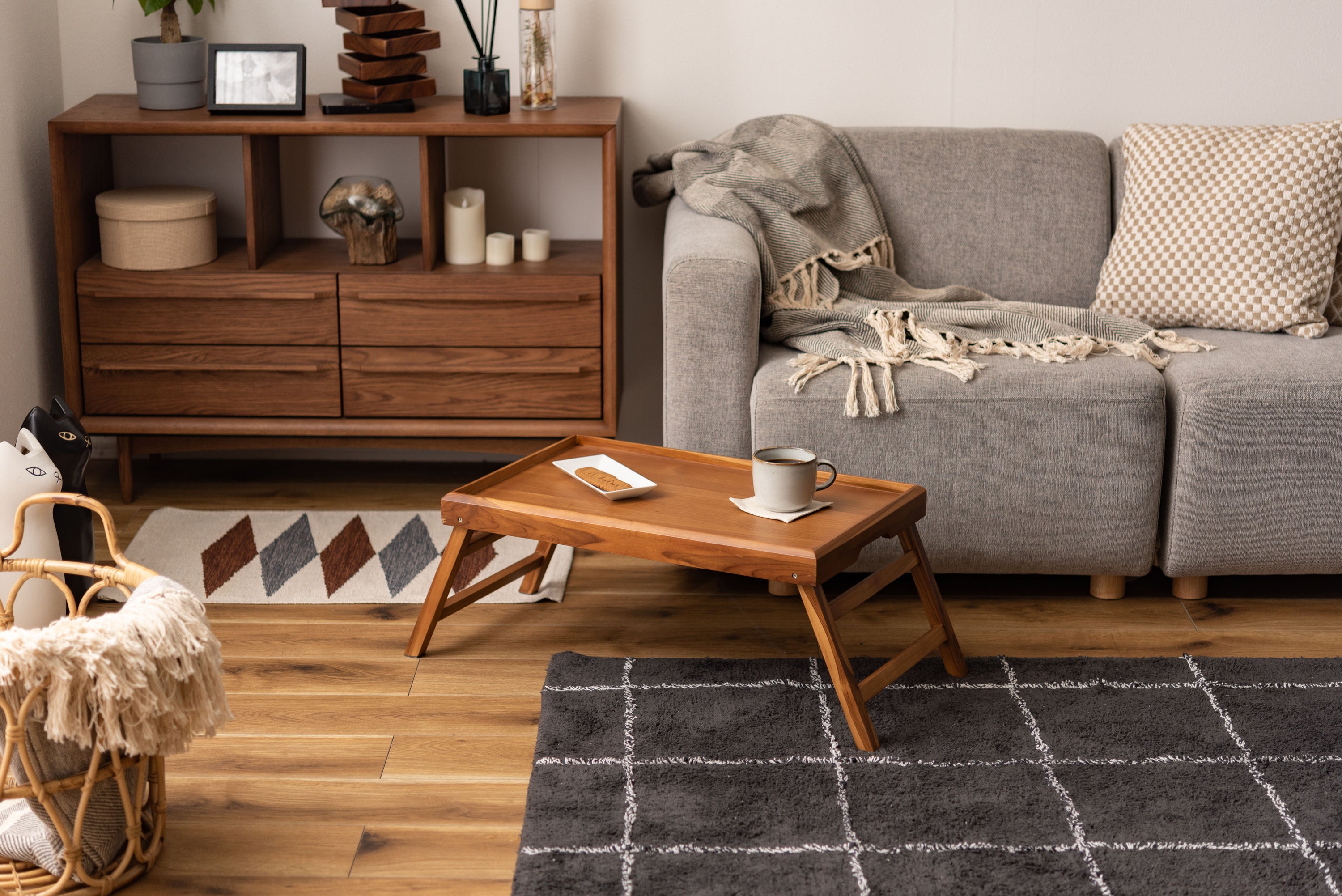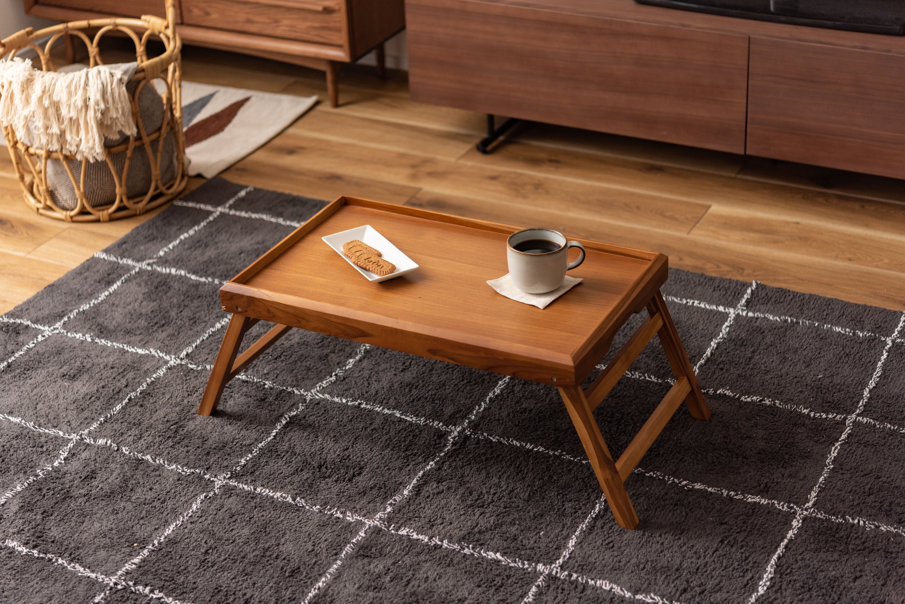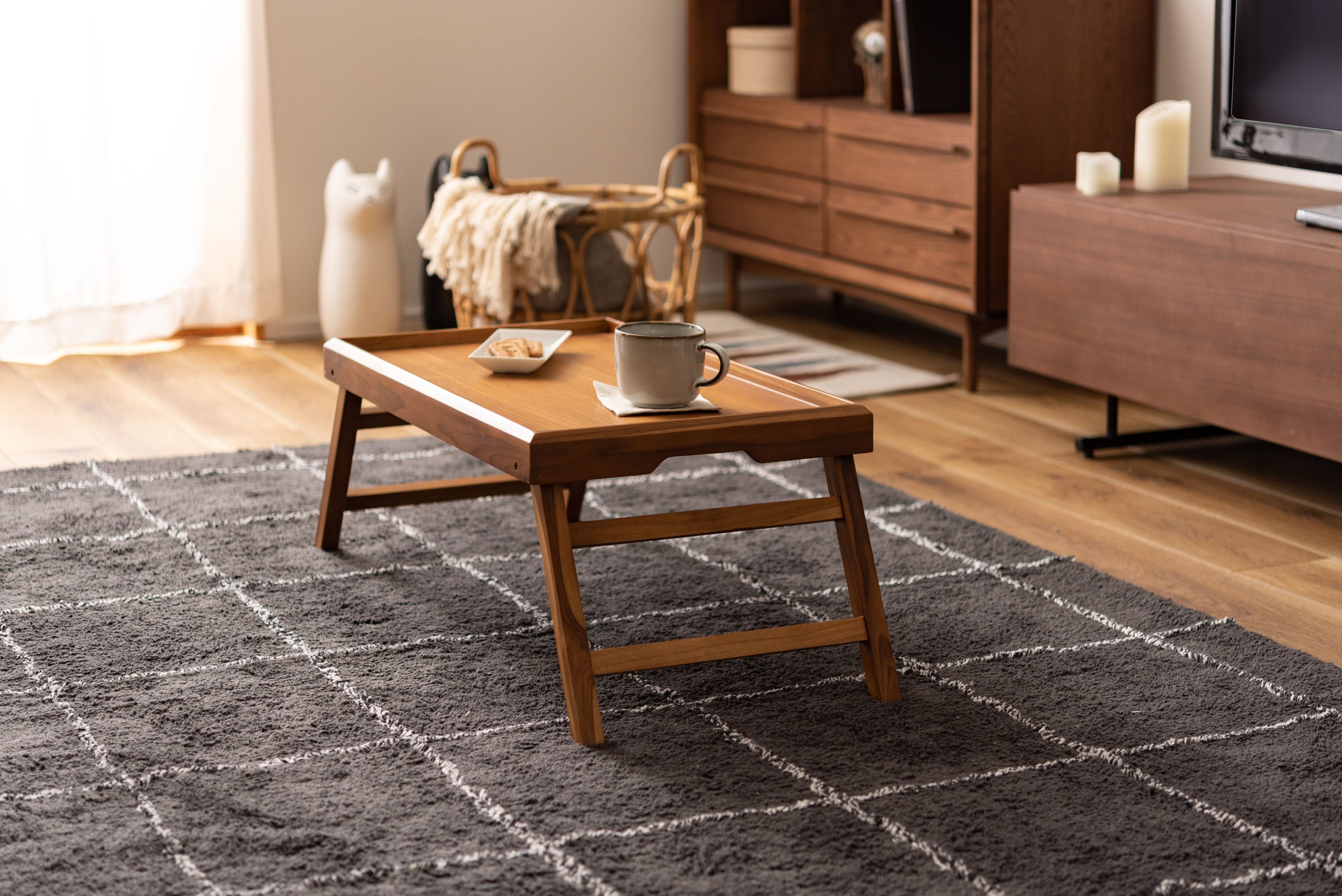 脚が折りたためるローテーブル。様々なシーンに合わせて活躍する、多目的なテーブル。脚を折りたためばコンパクトサイズに。持ち運びや収納に便利です。フロアテーブルやサイドテーブル、ベッドの上でのテーブルとして等、あらゆる用途で使えるテーブル。脚裏にフェルトが付いているので、床への傷防止になり安心。完成品の状態でお届け。届いてすぐに使えます。