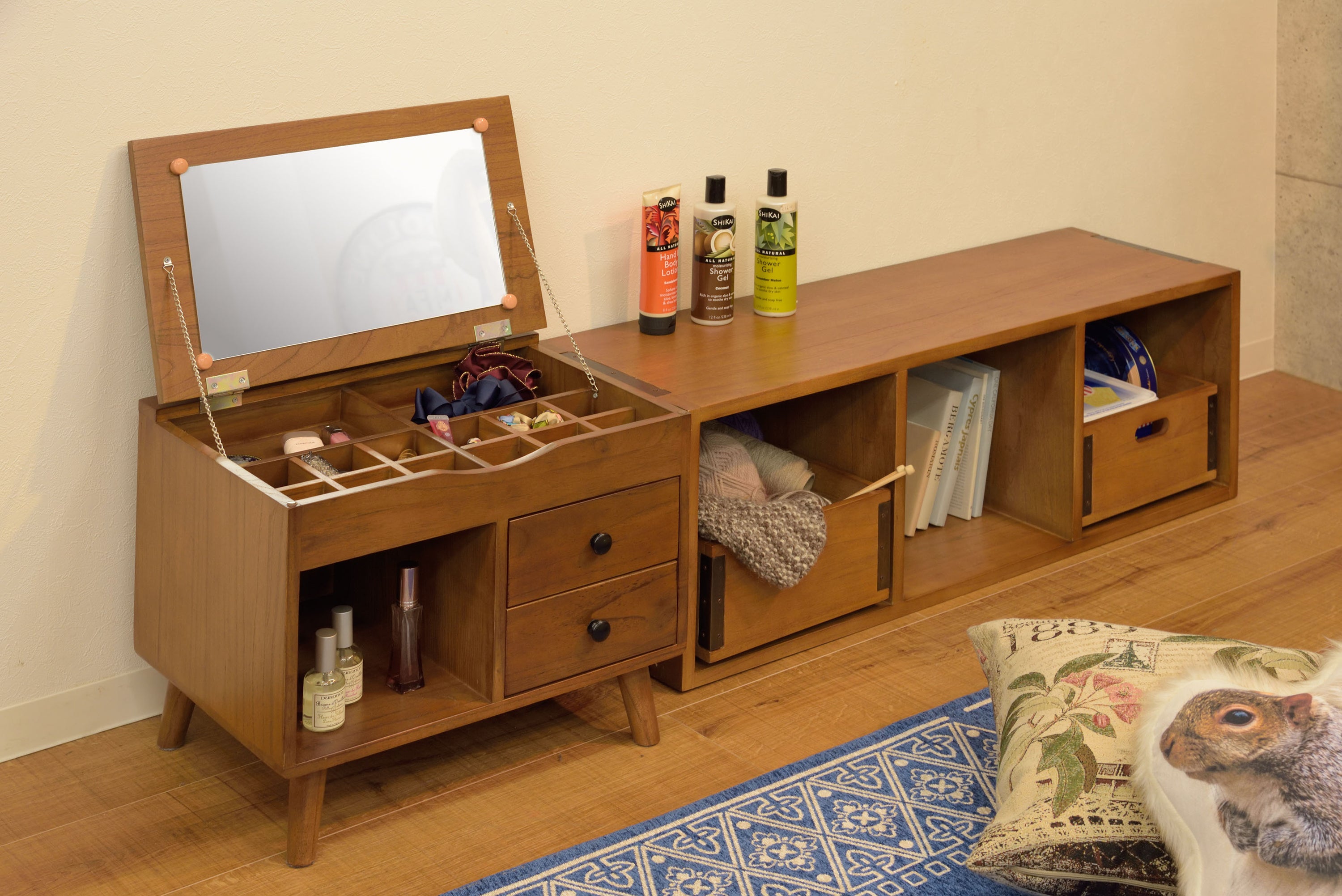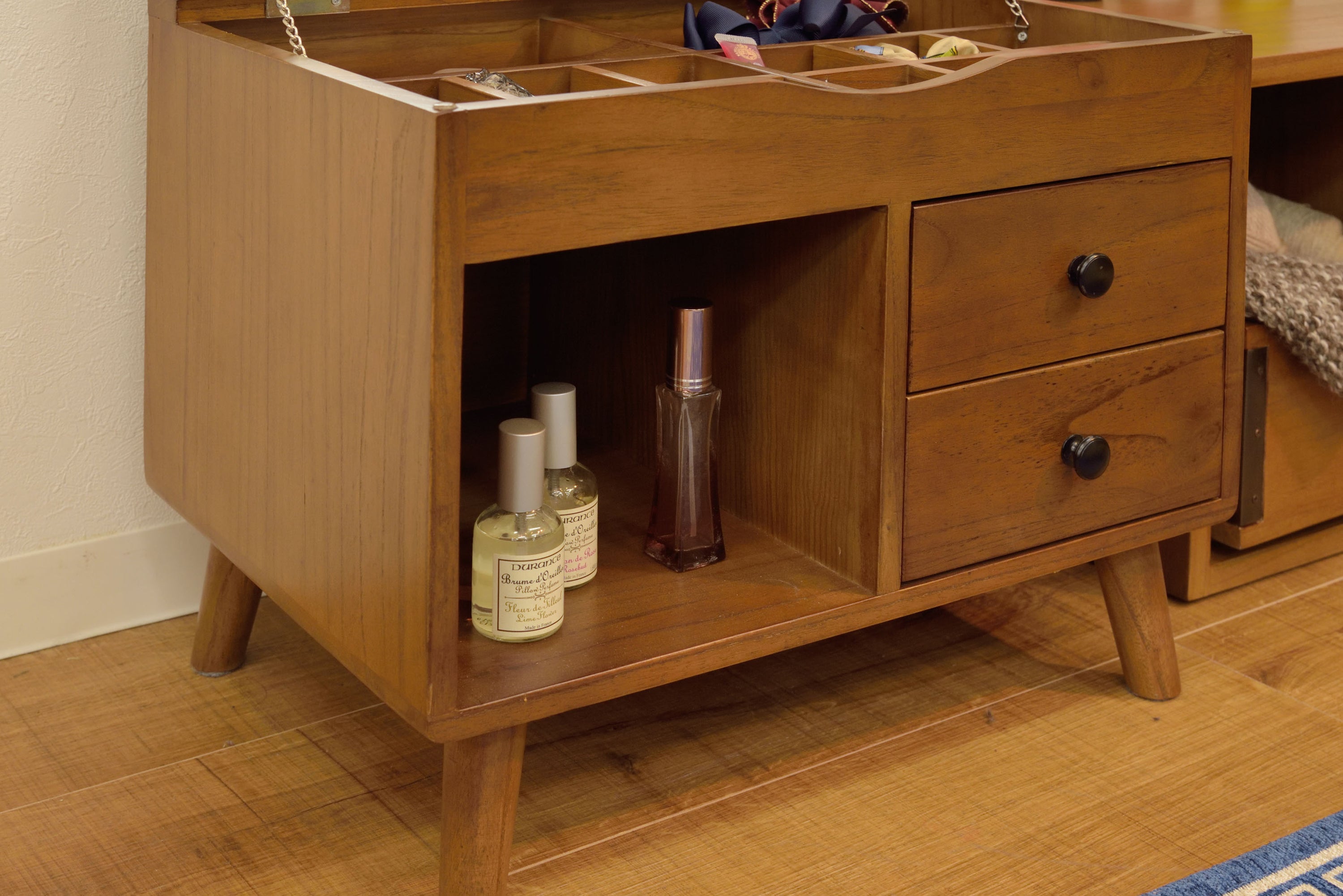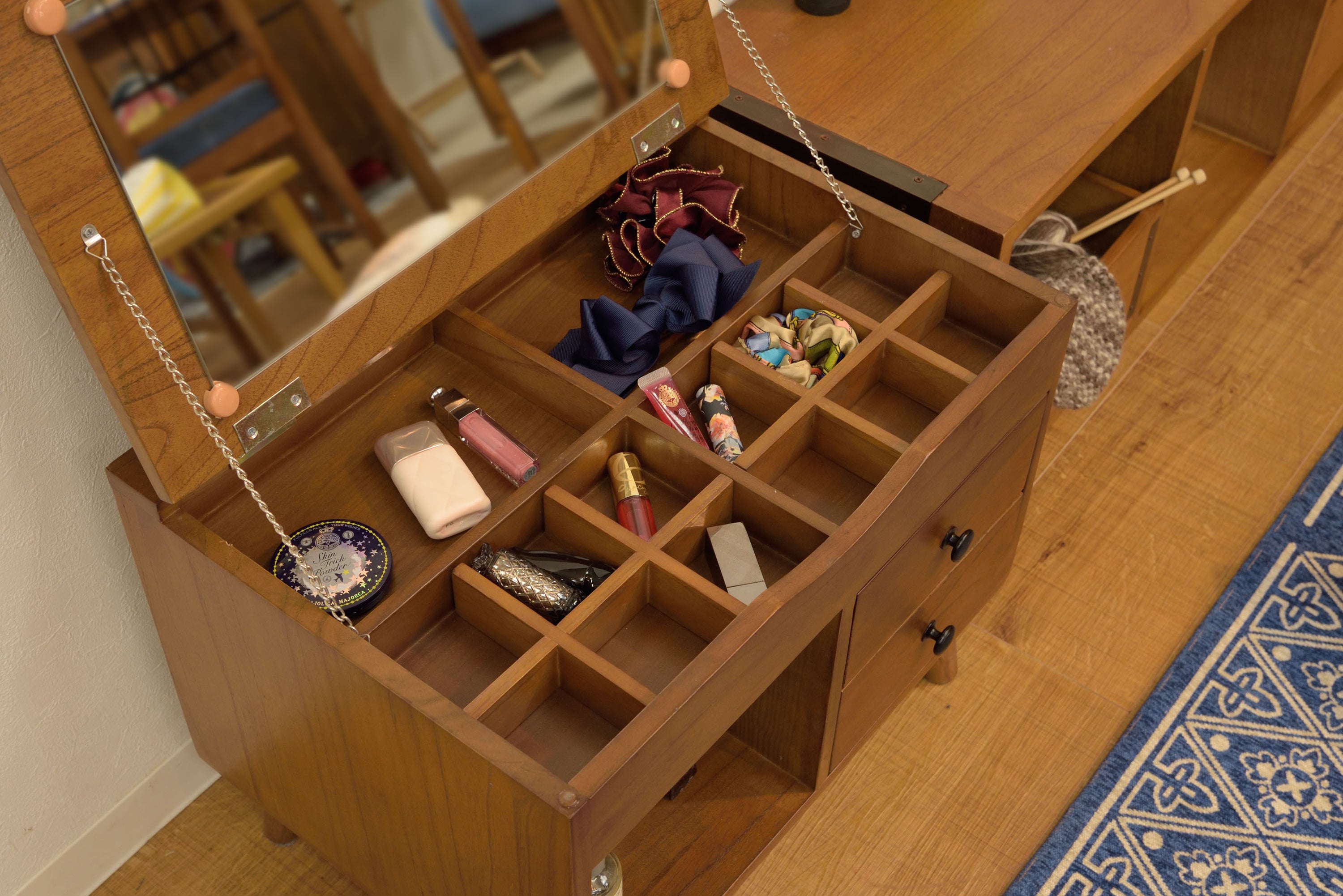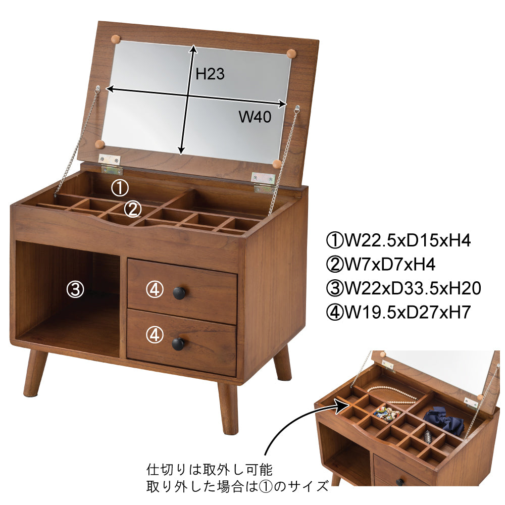 大きな鏡付きのコンパクトドレッサー。仕切り部分は取外し可能です。