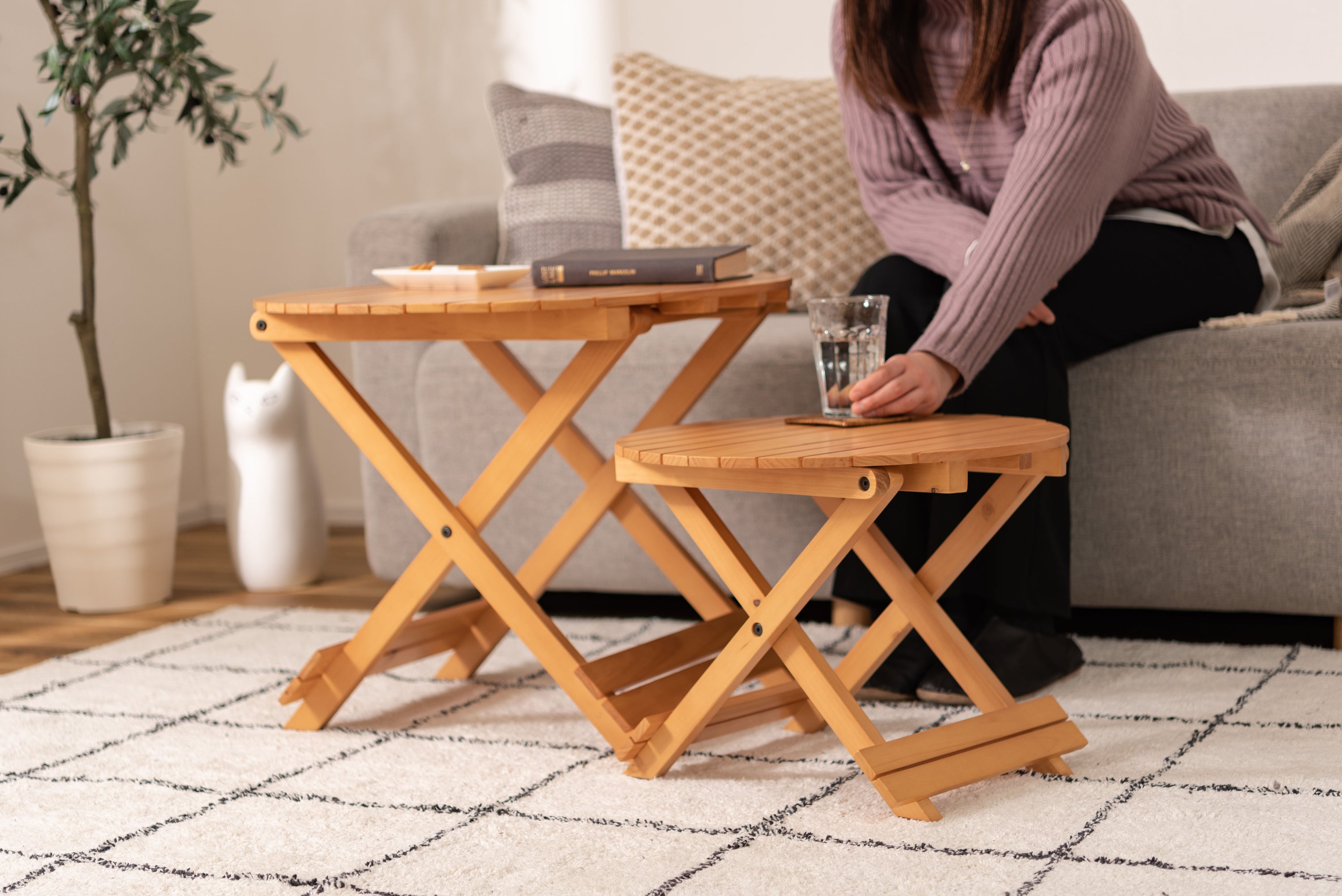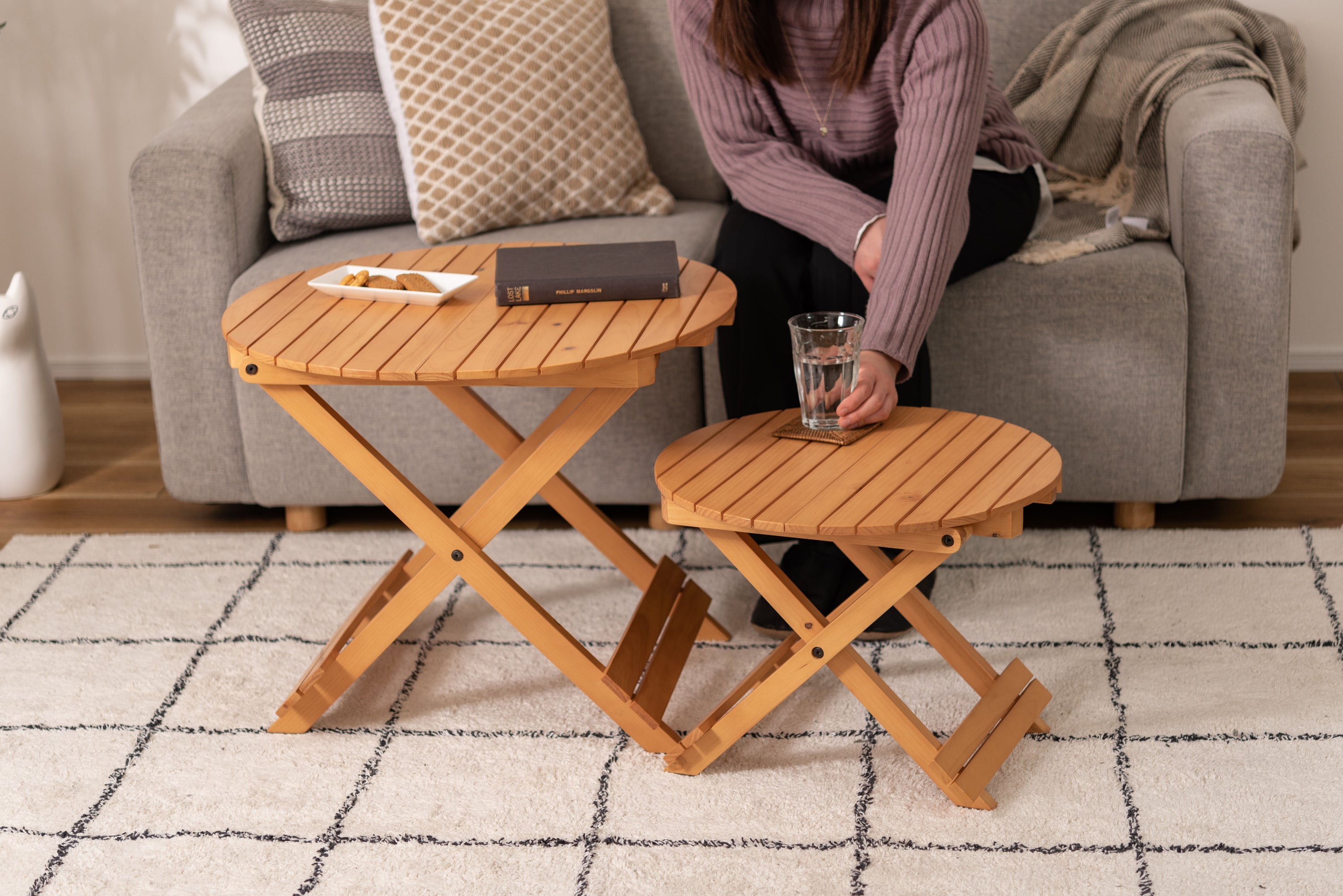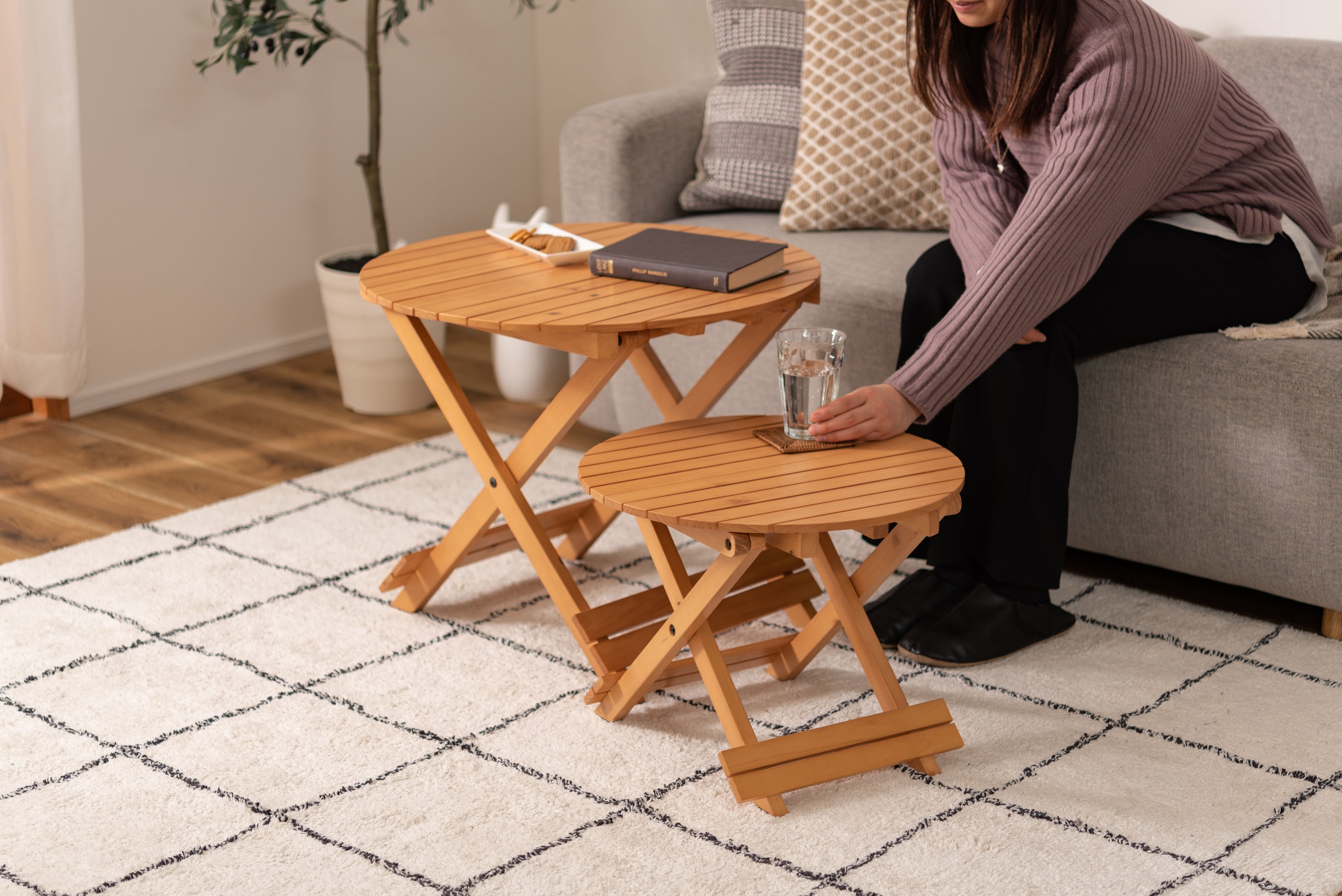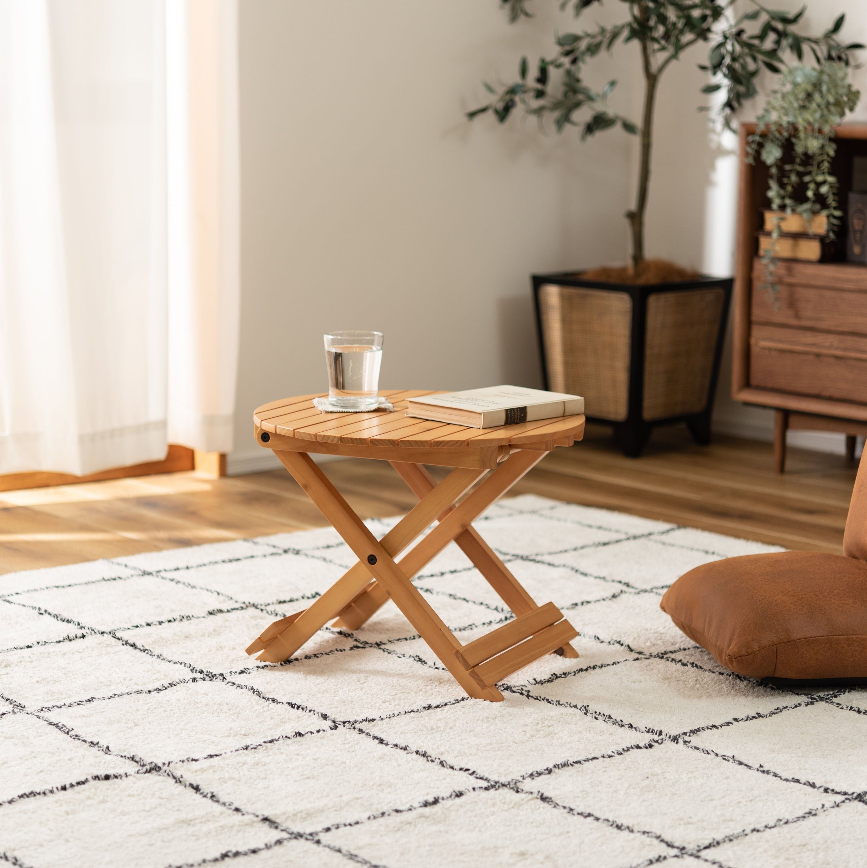 工具不要で簡単組み立て、ワンタッチで折りたためる便利なラウンドテーブル。折りたたみ時の“持ち手”で移動もしやすく、様々なシーンで大活躍。コンパクトでちょうどいいサイズ。大・小を組み合わせてネストテーブルとしても使えます。折りたたみ時の厚さは、Sサイズで5cm、Lサイズで6cmと薄型に。ベッド下やクローゼットなどの隙間に収納が可能。脚裏にはフェルトが付いているので床への傷防止にもなり安心です。